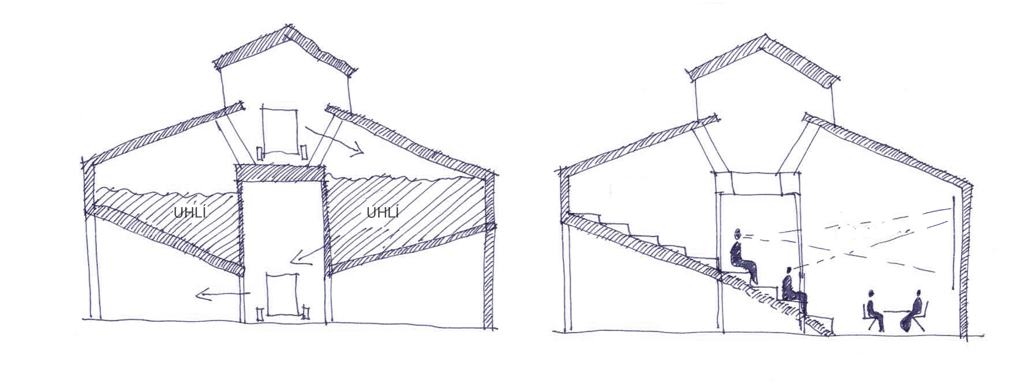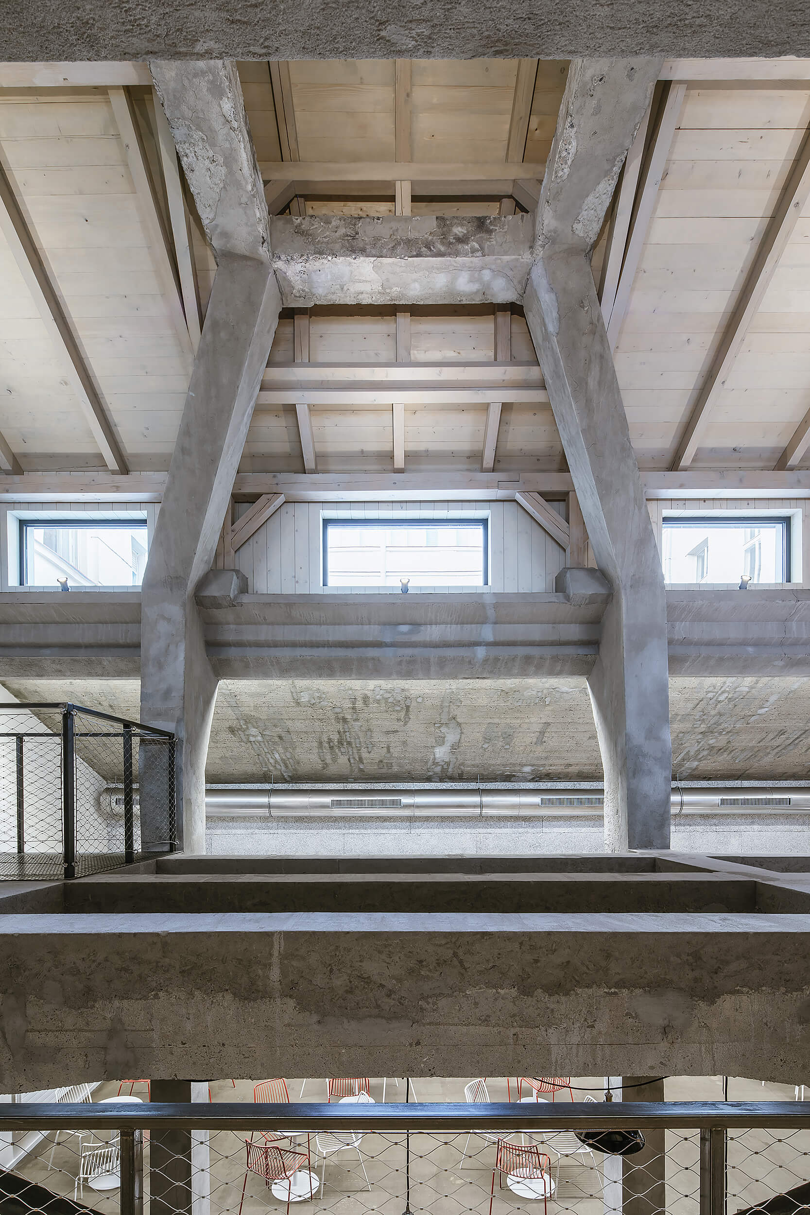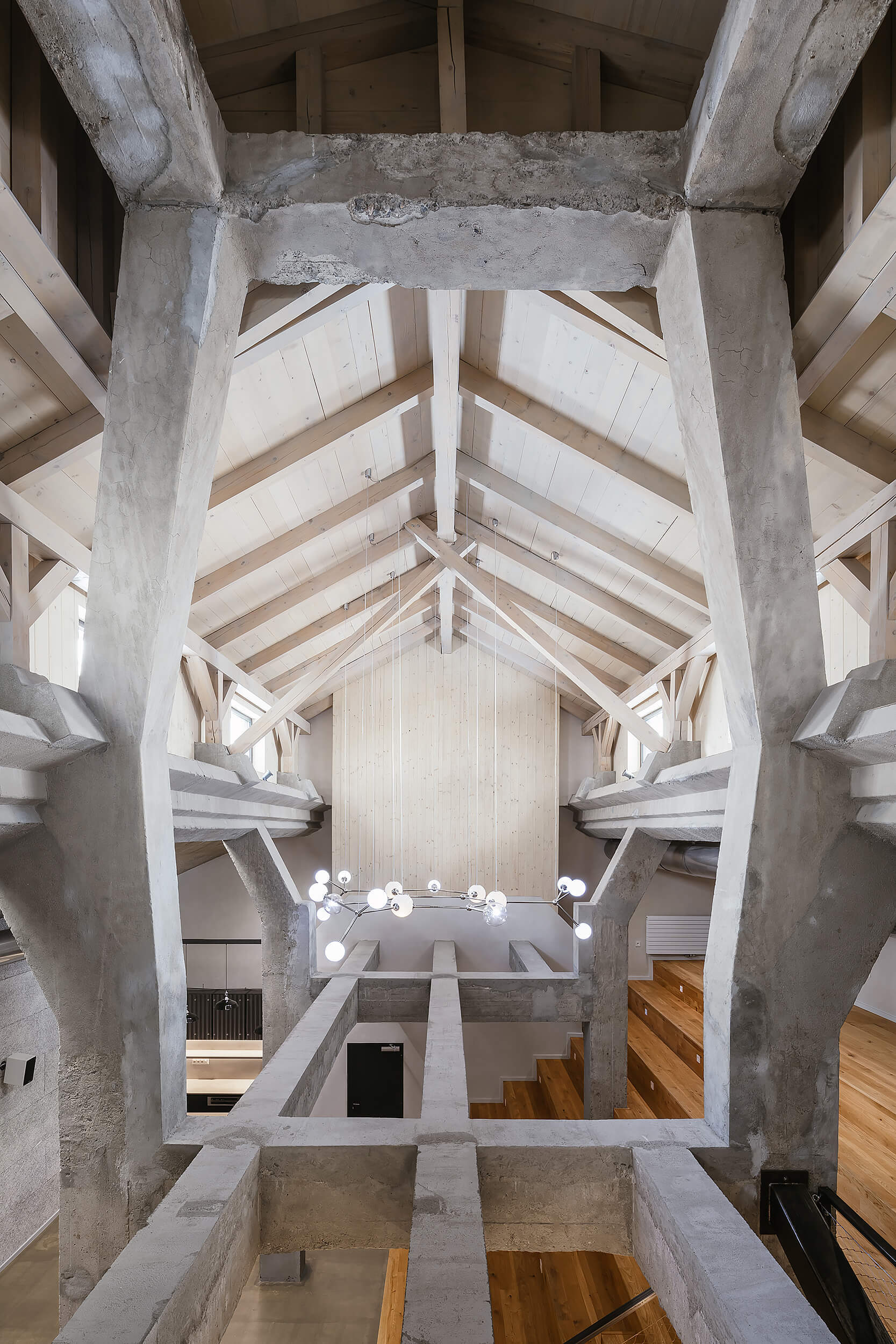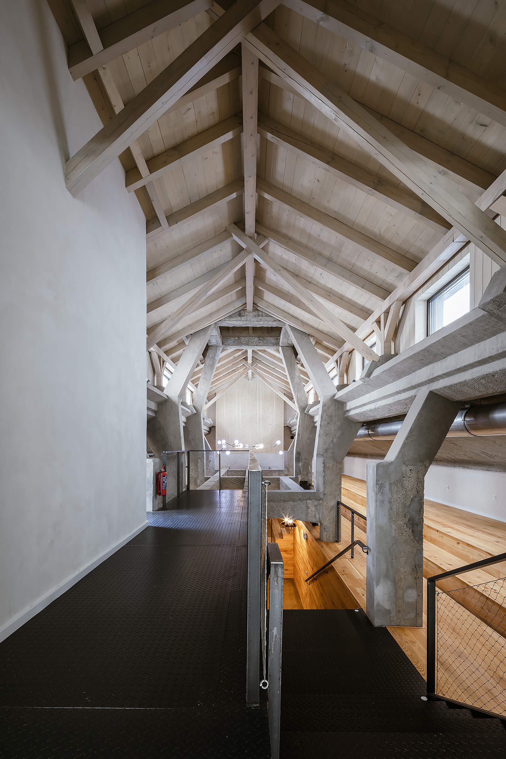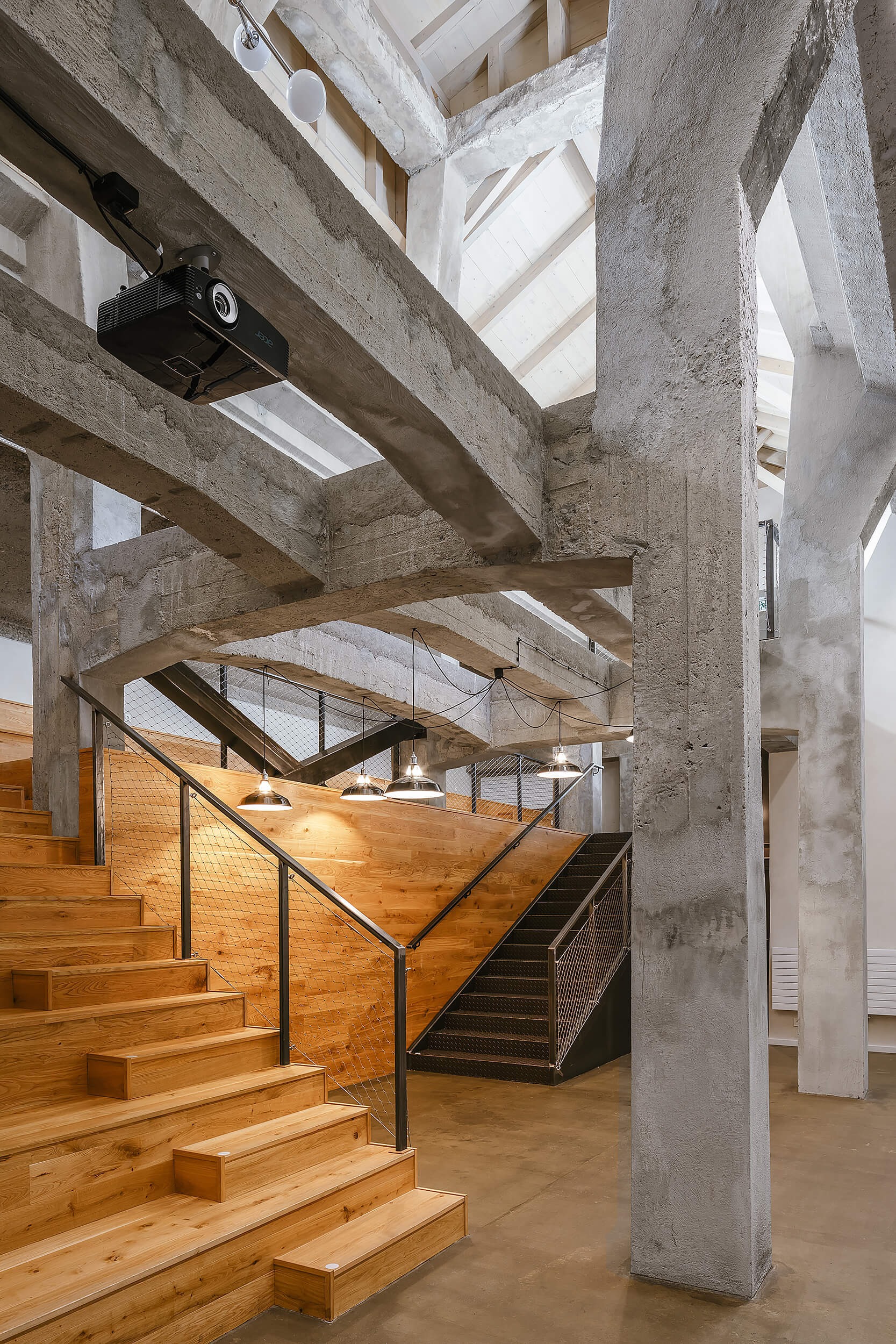 “Když nás do něj poprvé přivedl investor, nezdálo se, že by se prostor dal smysluplně využít. Chyběly rovné části podlah a větší prostor. Pohled do řezu s dvěma naklopenými plochami nás přivedl na myšlenku využít jednu stranu jako skloněné auditorium. Rozhodli jsme se zachovat maximum z betonové konstrukce, která je krásná ve své původní účelovosti,“ vysvetľujú architekti.