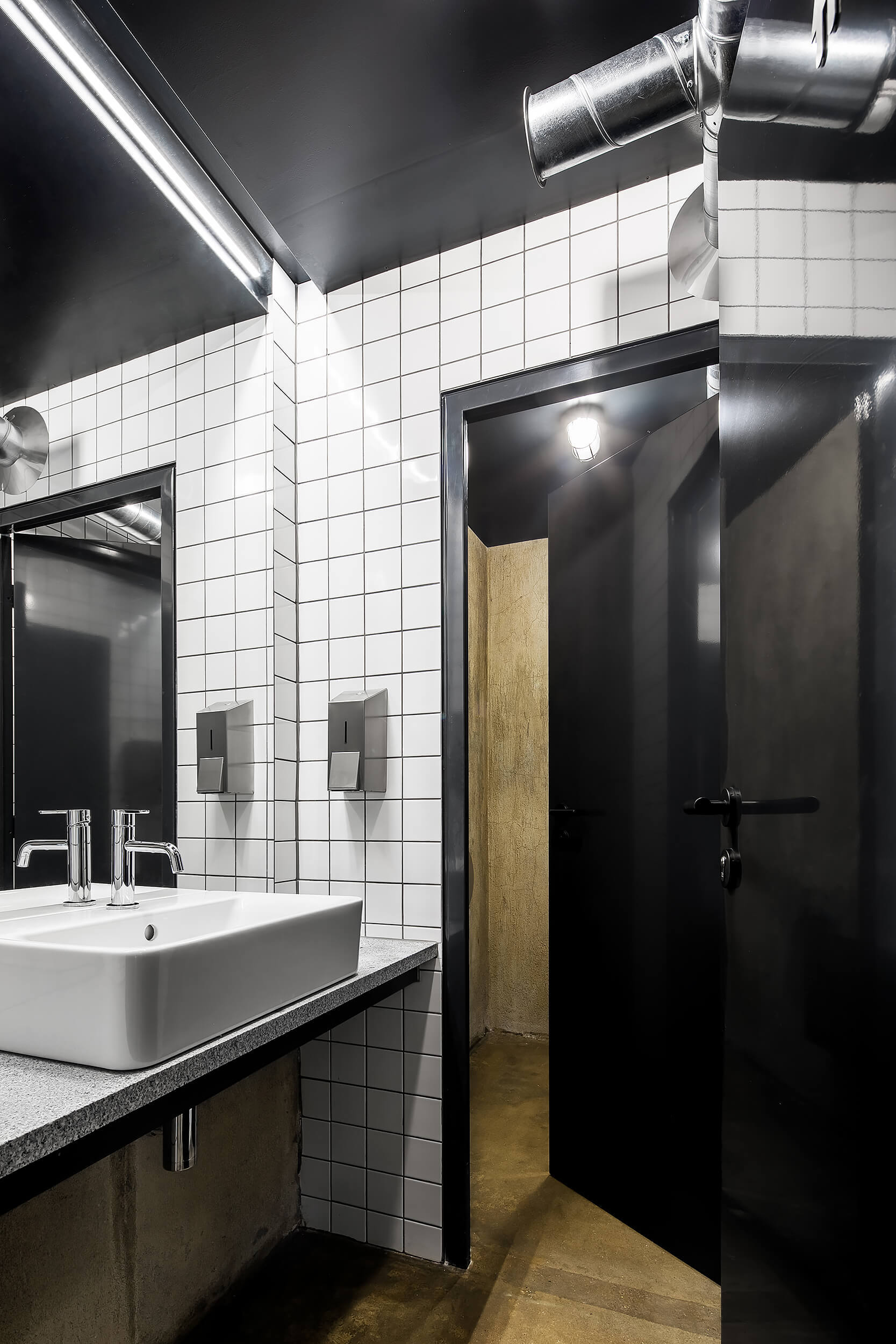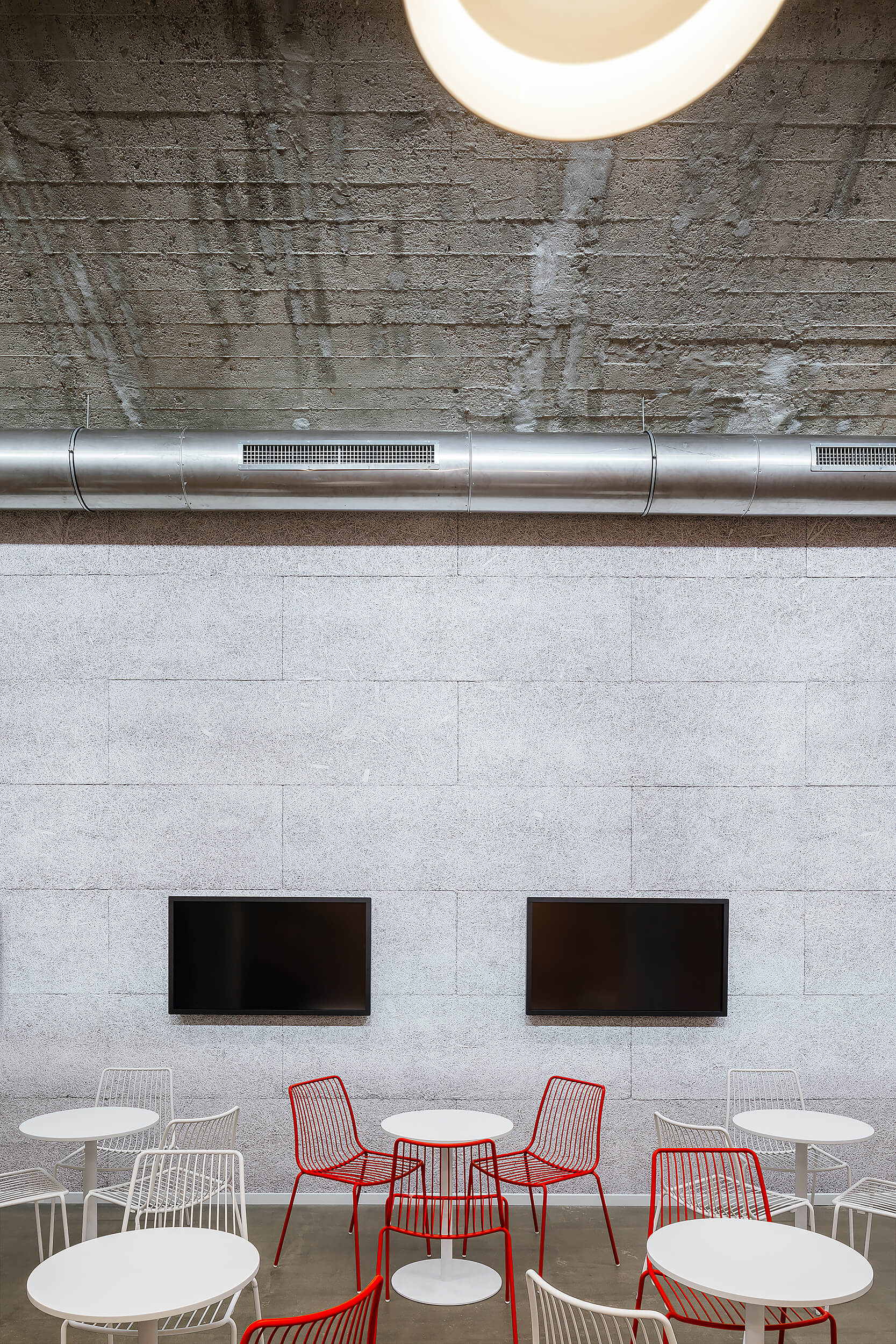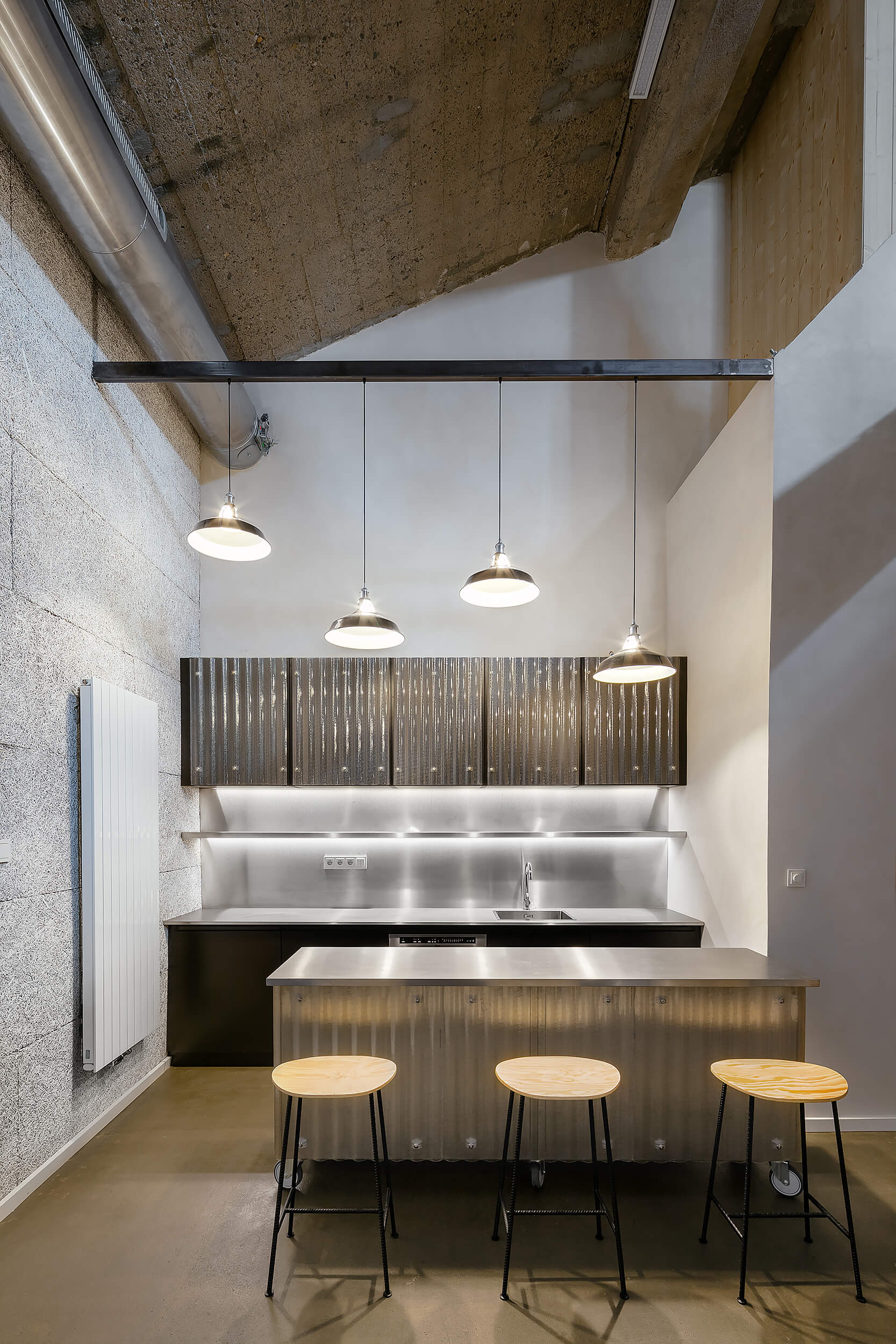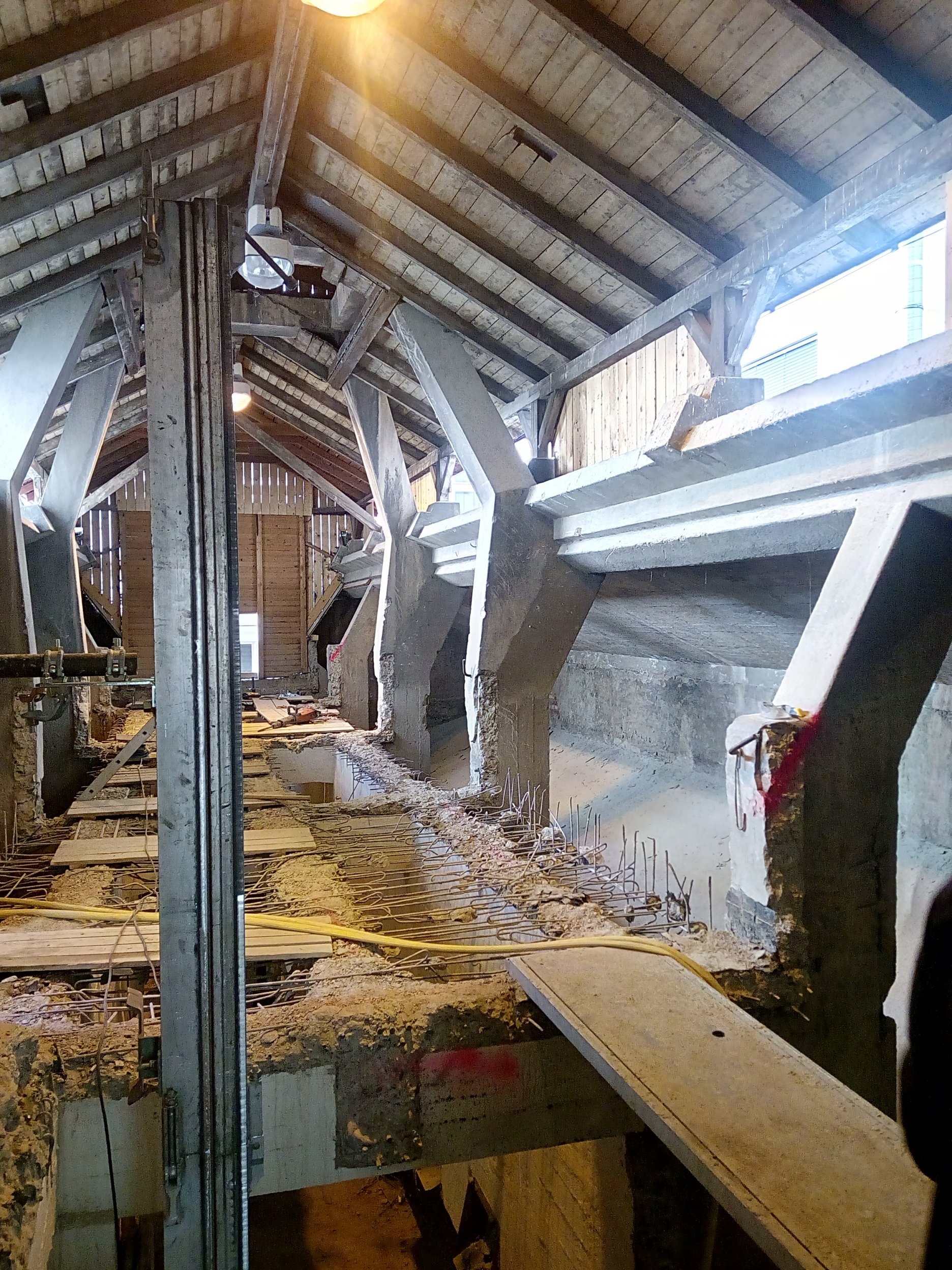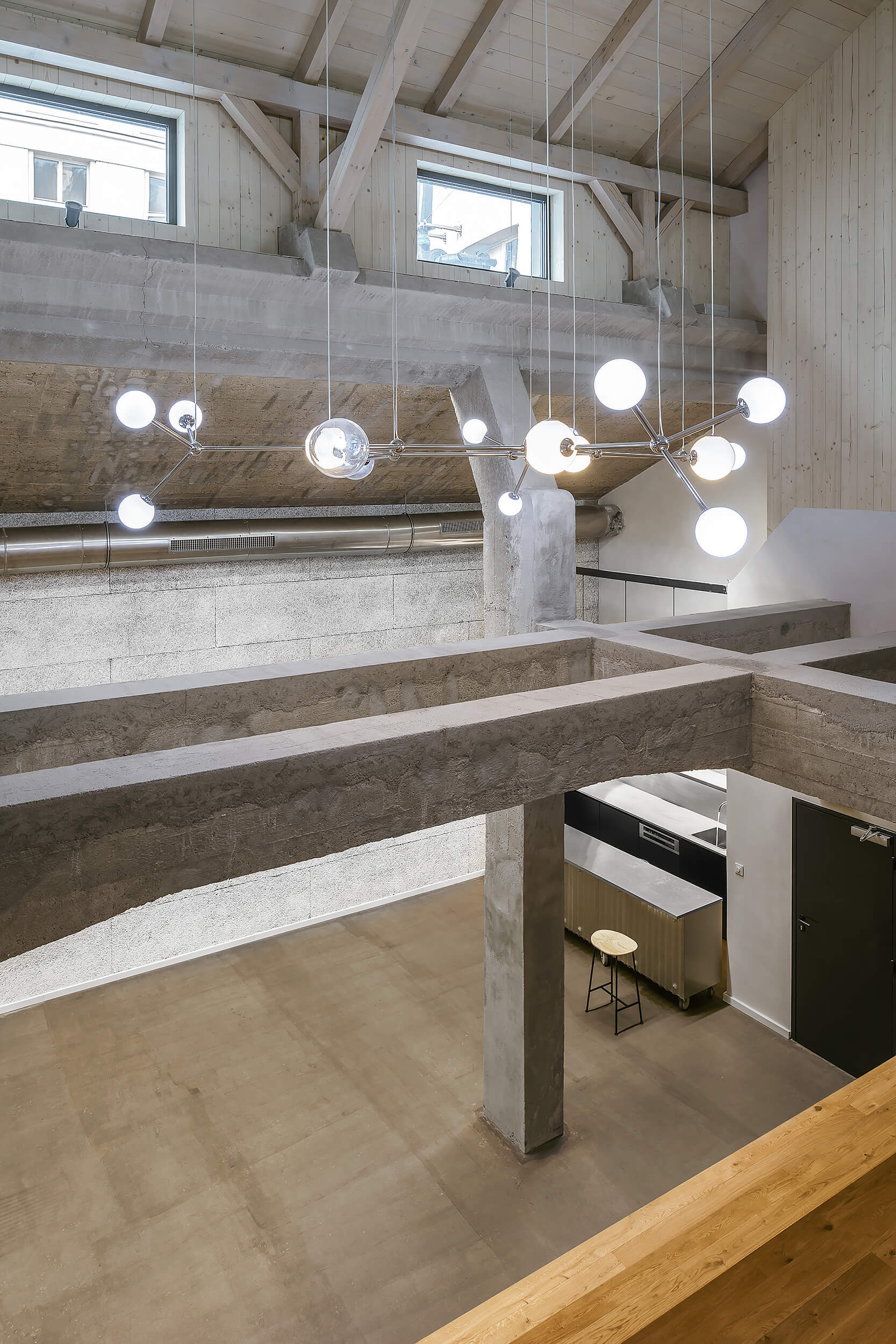“Když nás do něj poprvé přivedl investor, nezdálo se, že by se prostor dal smysluplně využít. Chyběly rovné části podlah a větší prostor. Pohled do řezu s dvěma naklopenými plochami nás přivedl na myšlenku využít jednu stranu jako skloněné auditorium. Rozhodli jsme se zachovat maximum z betonové konstrukce, která je krásná ve své původní účelovosti,“ vysvetľujú architekti.