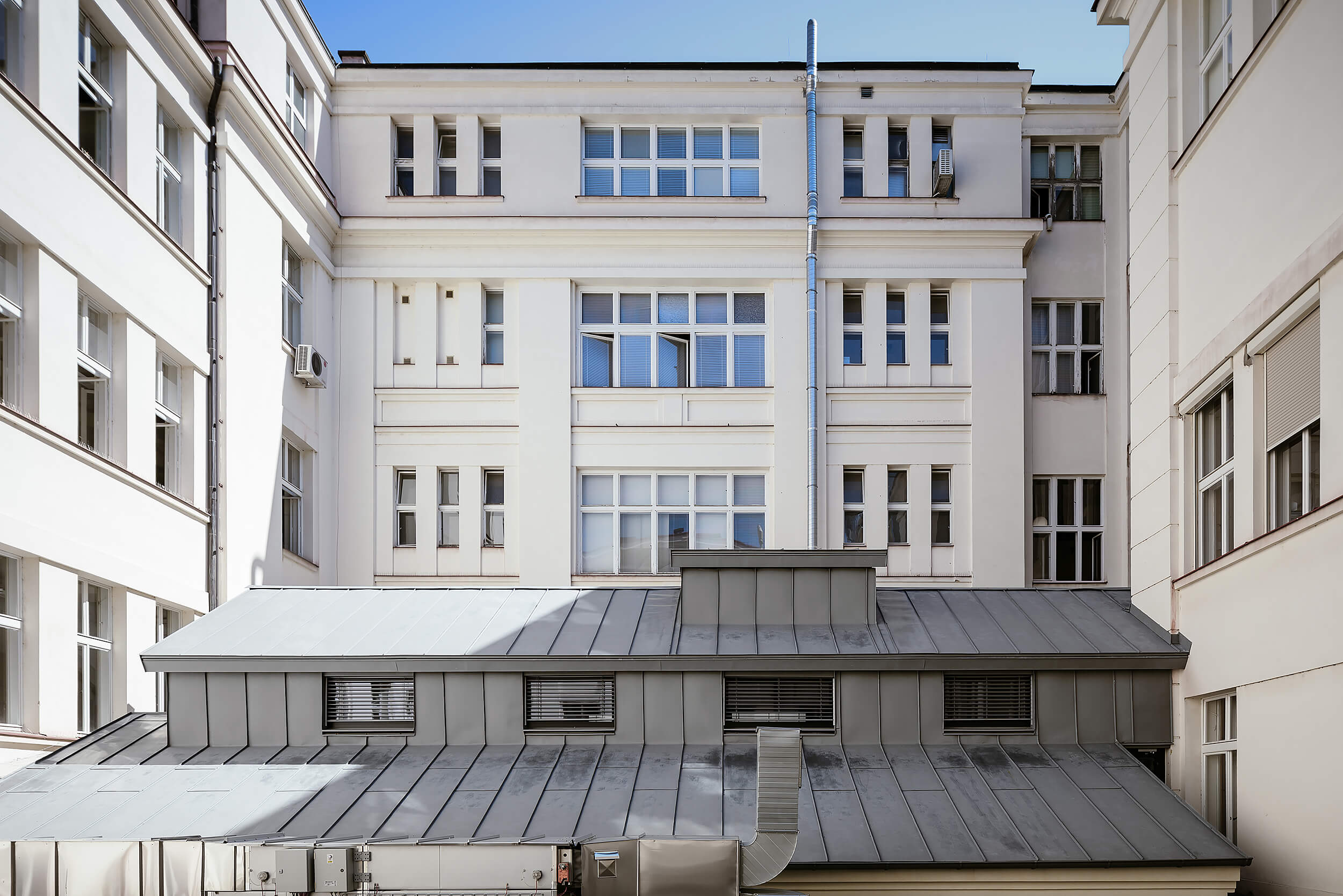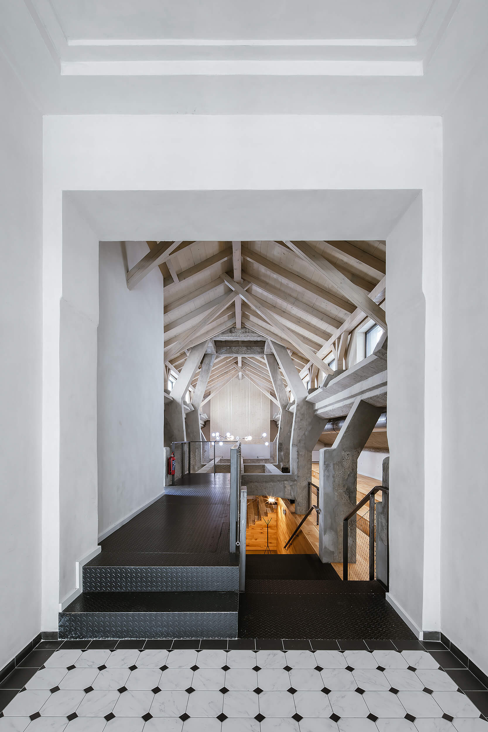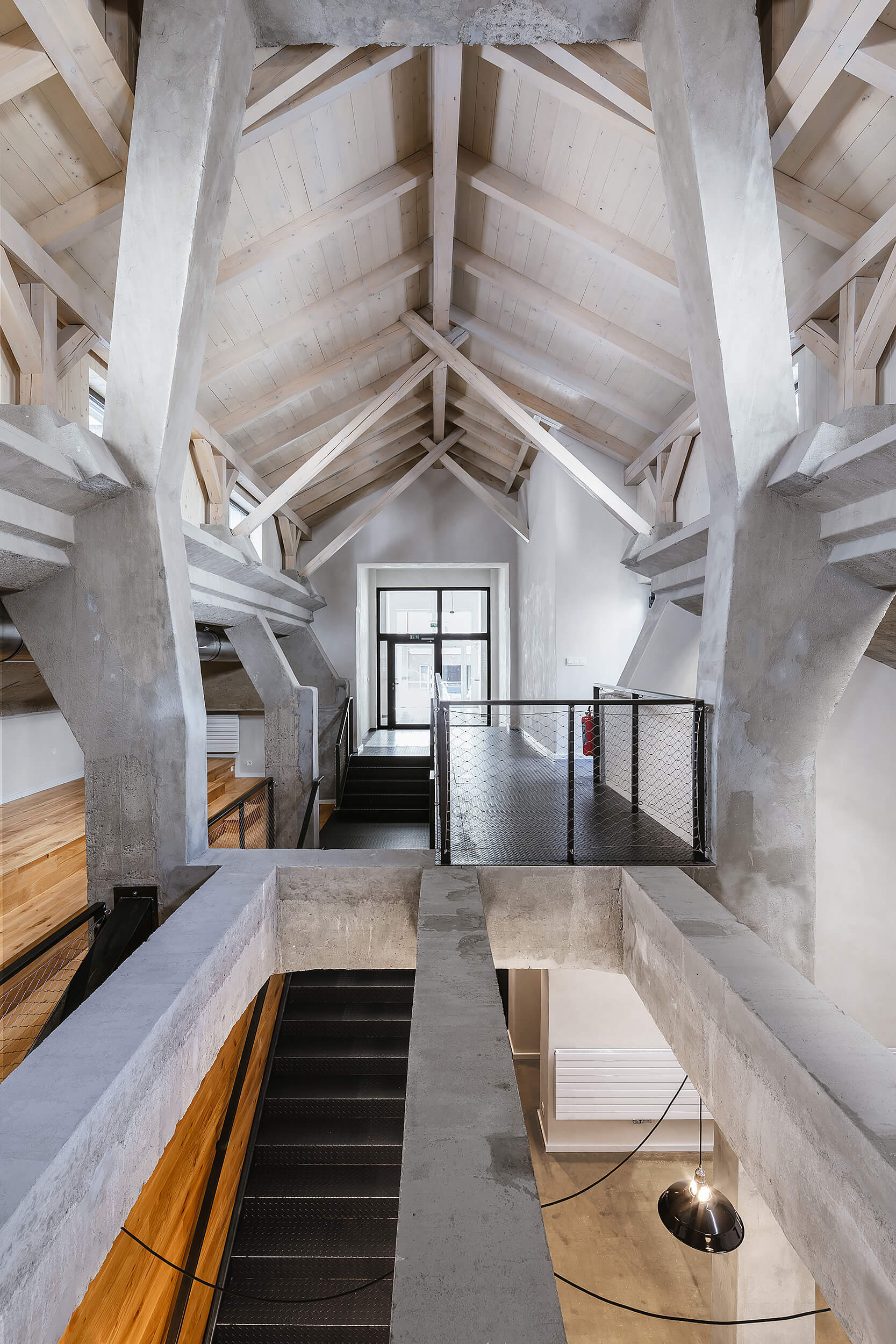 Hľadanie nového potenciálu v nevyužitých častiach školského areálu. Autori nechávajú vyniknúť pôvodnú veľkorysosť priestoru a eleganciu betónového skeletu. Nová, ľahká vostavba reaguje na požiadavku po flexibilnom využití interiéru.