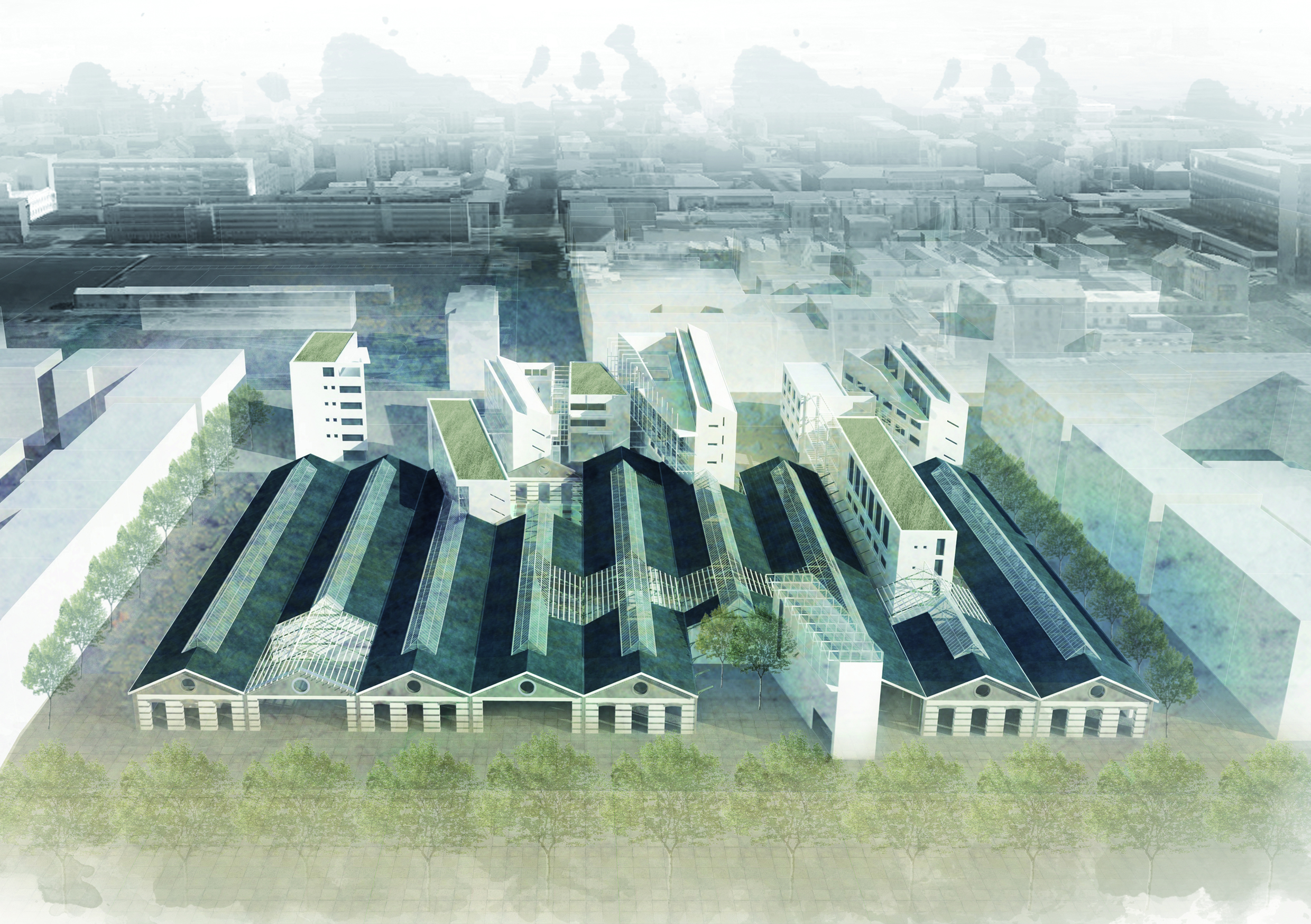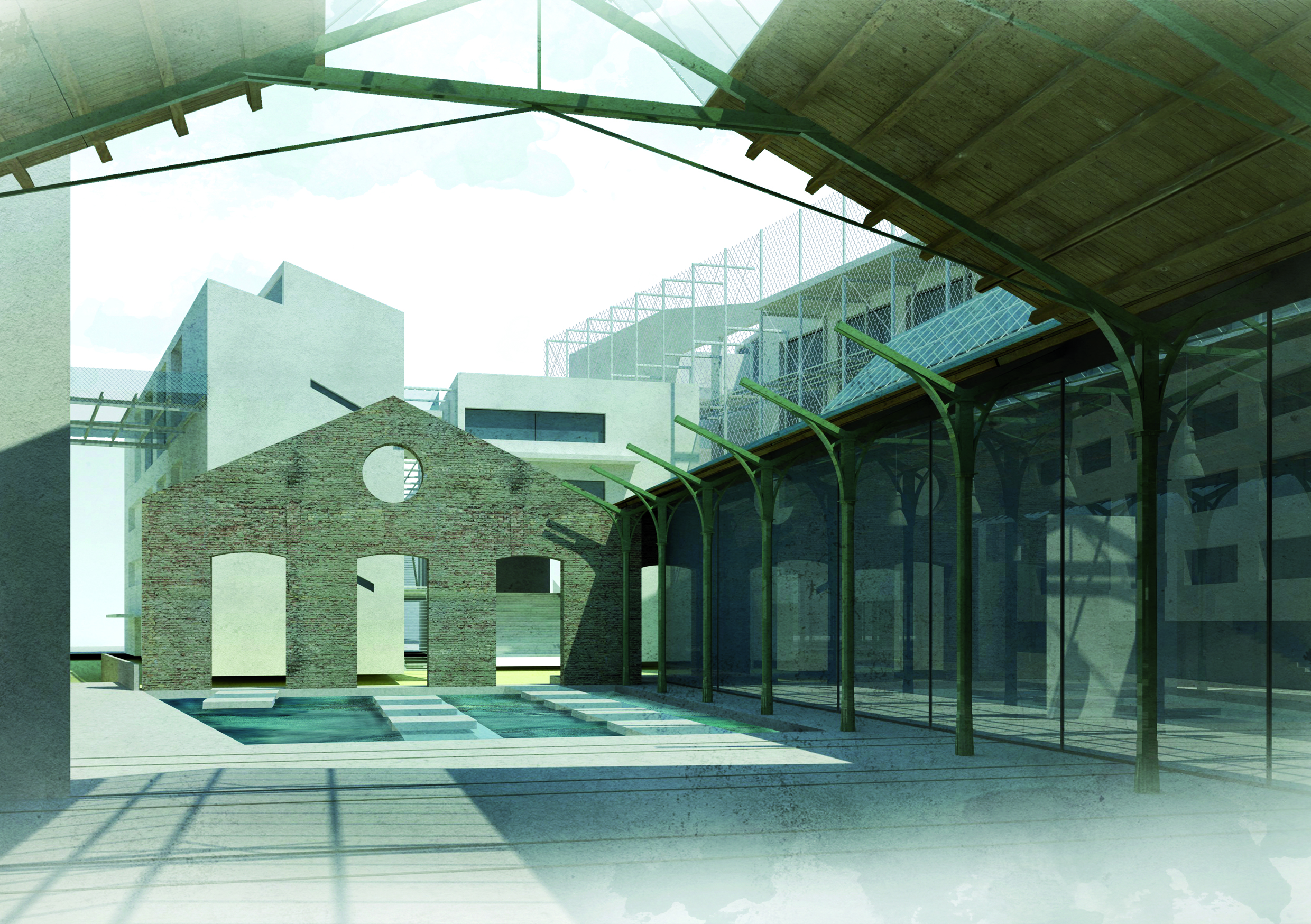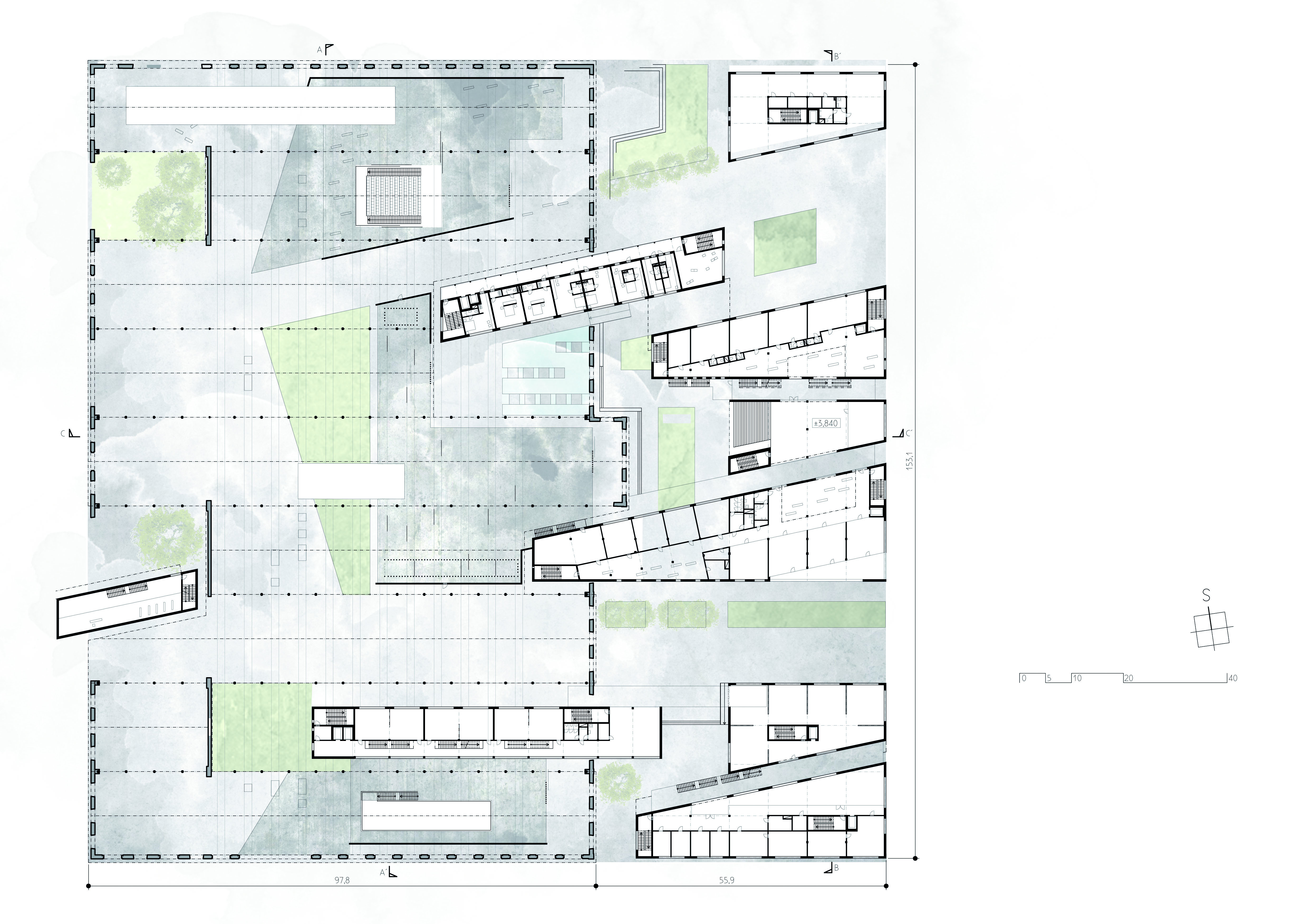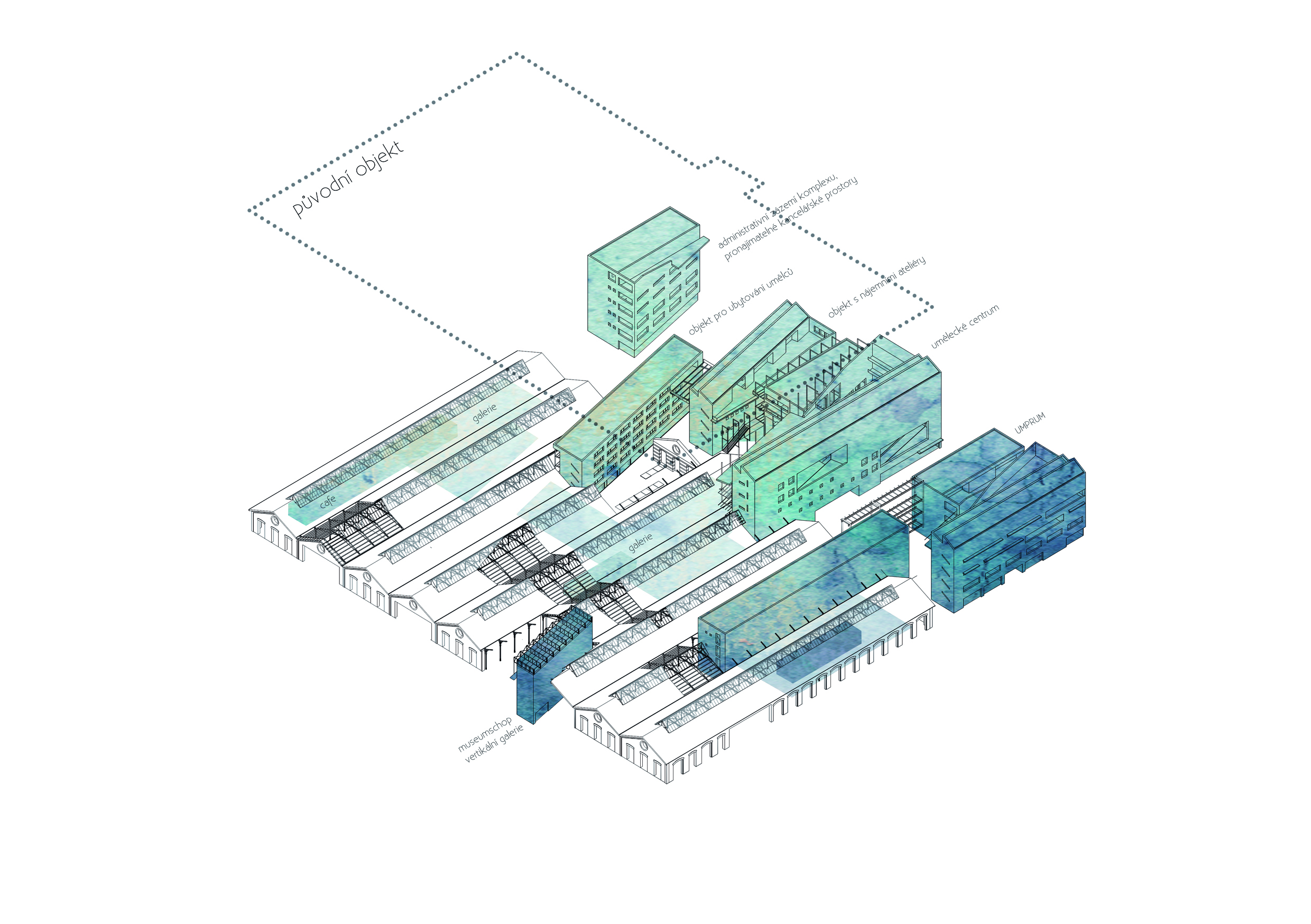 Tyto nové objekty různých tvarů postupně vrůstají do staré haly, která v místech kolize ustupuje, a mezi halou a novými objekty se vytváří různorodá poloveřejná místa s intimním charakterem jako protipól k veřejnému prostoru v západní části haly. Tyto prostory jsou z důvodu maximální prostupnosti územím propojeny a vytváří meandr vinoucí se ze severu k jihu mezi historickým objektem a současnou zástavbou.