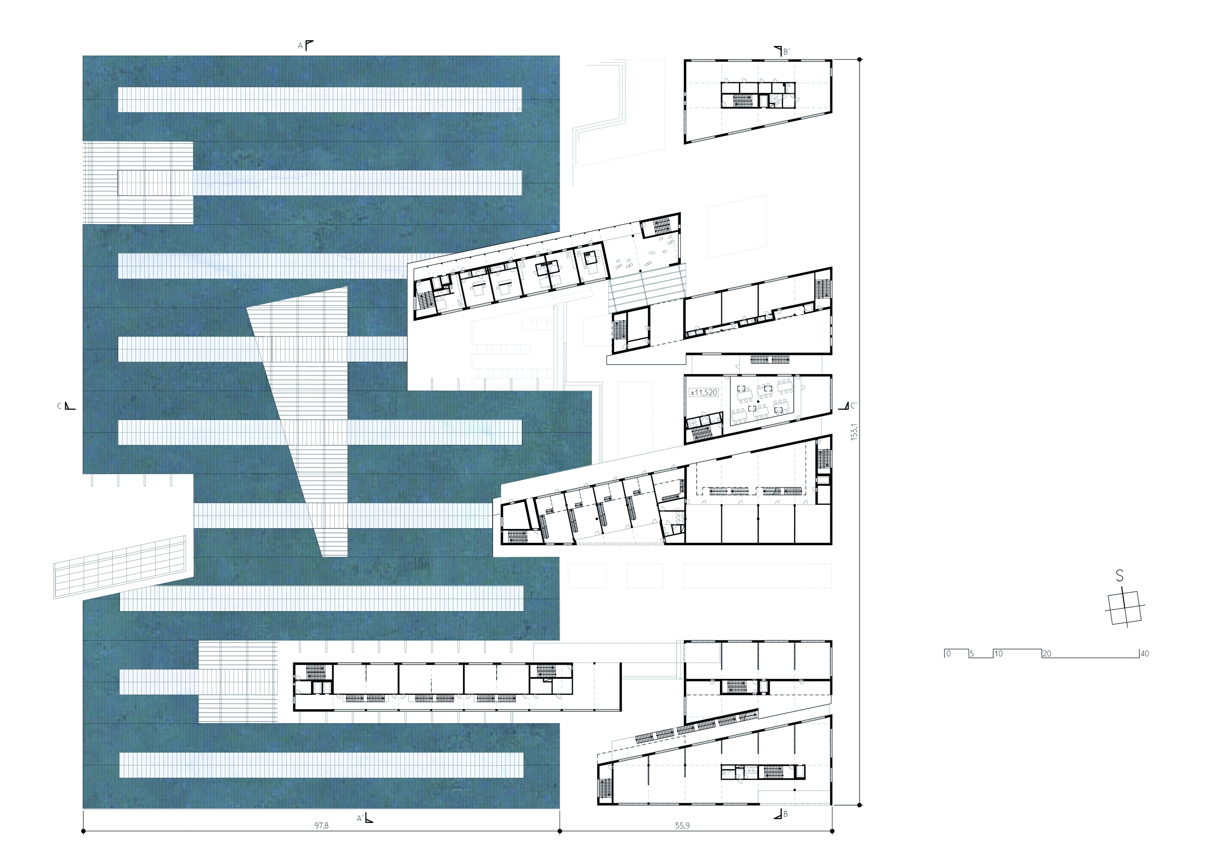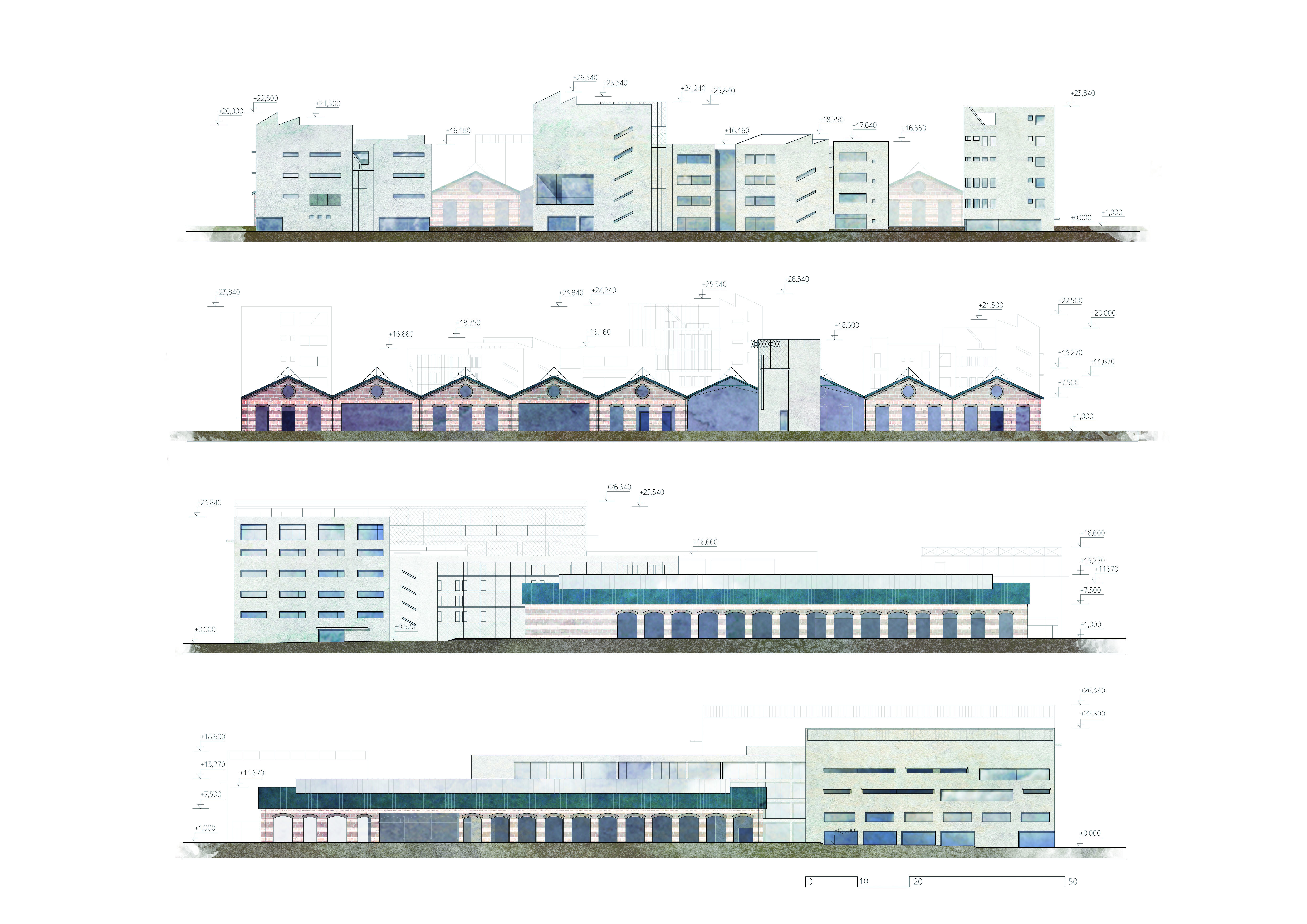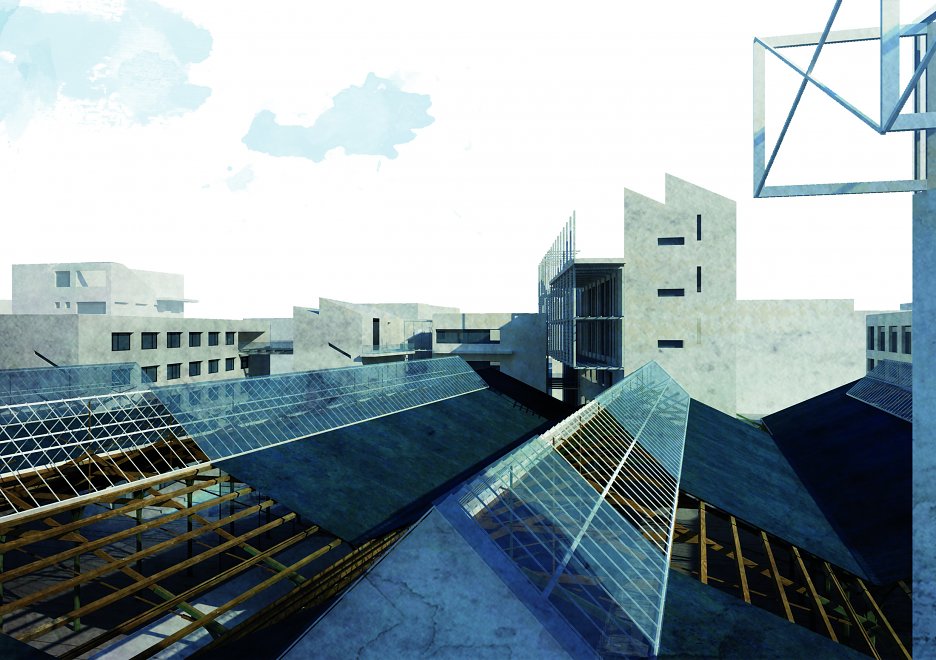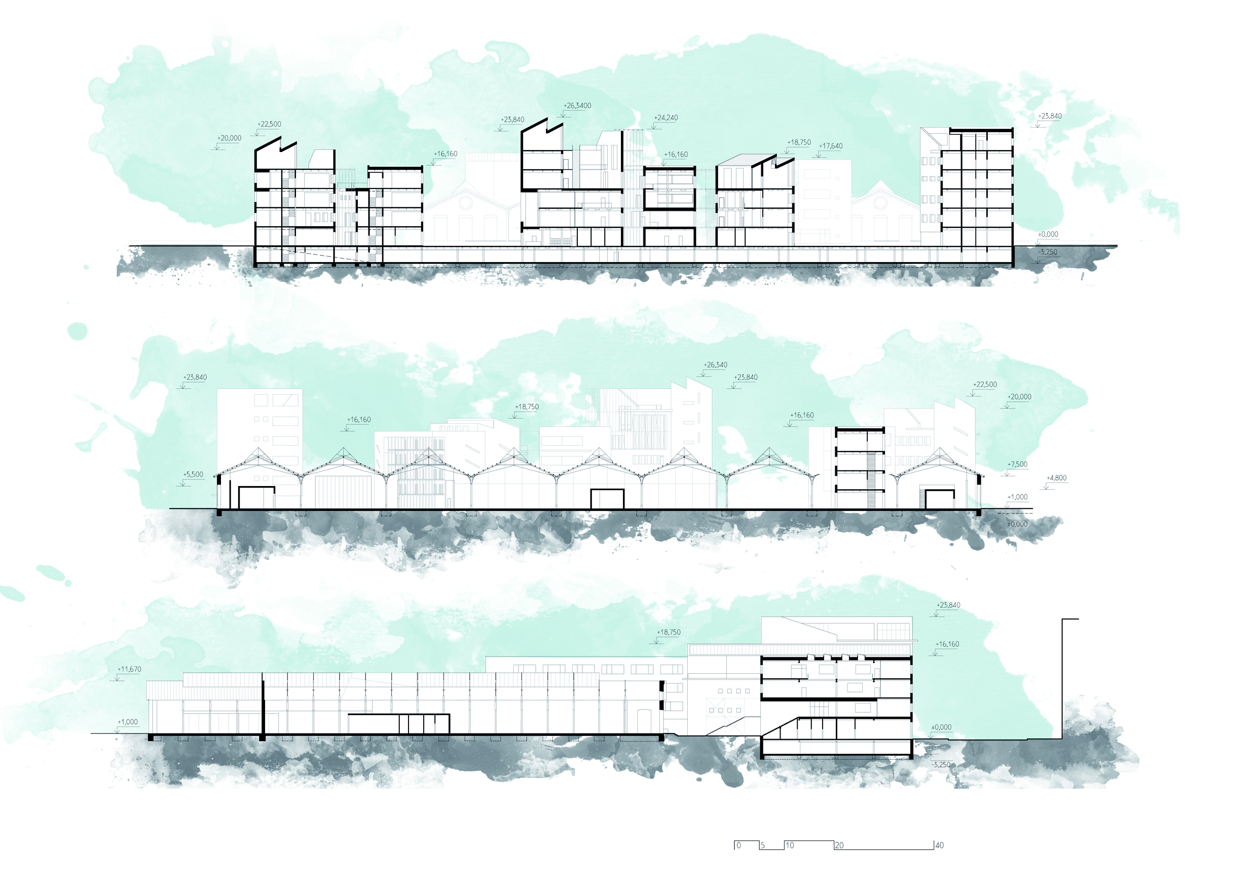 Tyto nové objekty různých tvarů postupně vrůstají do staré haly, která v místech kolize ustupuje, a mezi halou a novými objekty se vytváří různorodá poloveřejná místa s intimním charakterem jako protipól k veřejnému prostoru v západní části haly. Tyto prostory jsou z důvodu maximální prostupnosti územím propojeny a vytváří meandr vinoucí se ze severu k jihu mezi historickým objektem a současnou zástavbou.