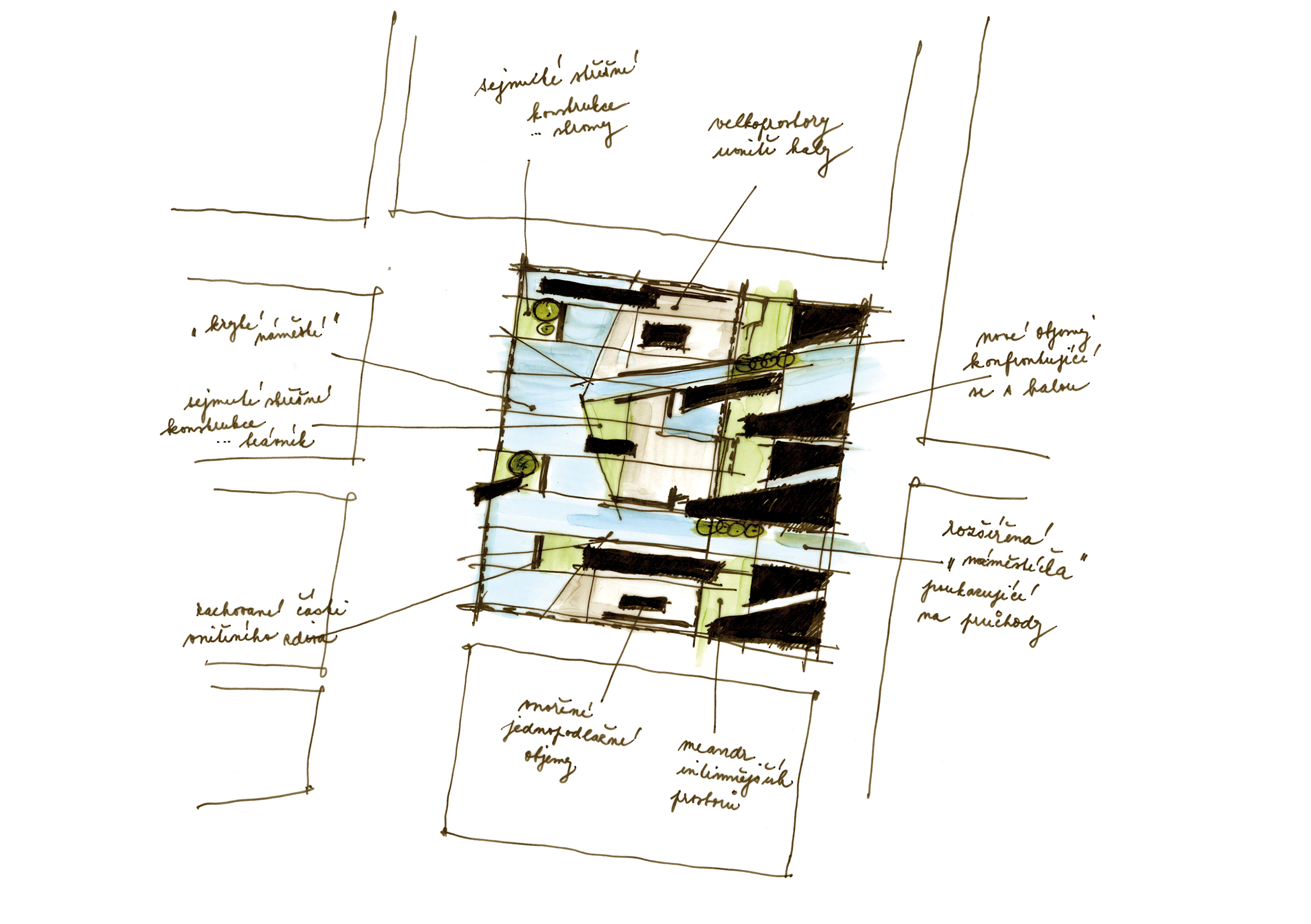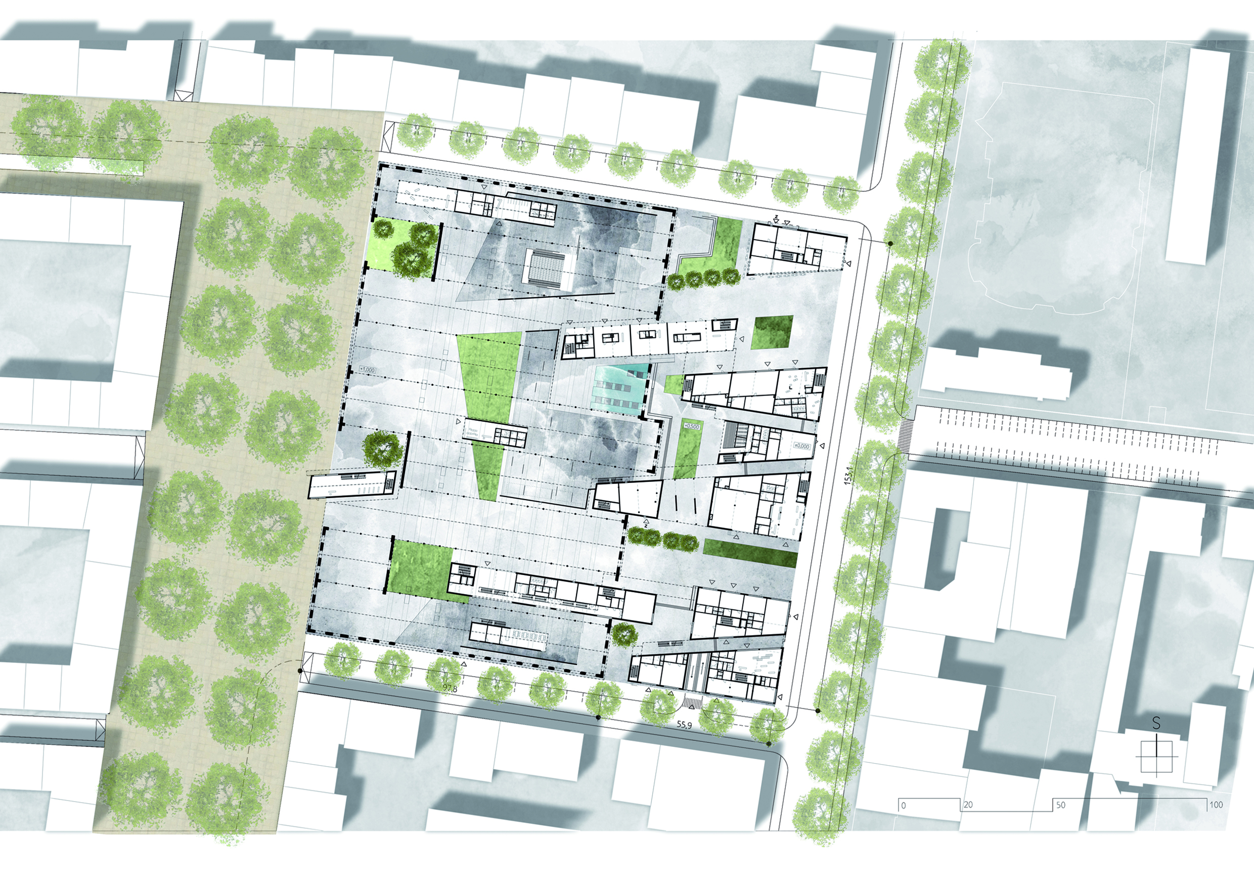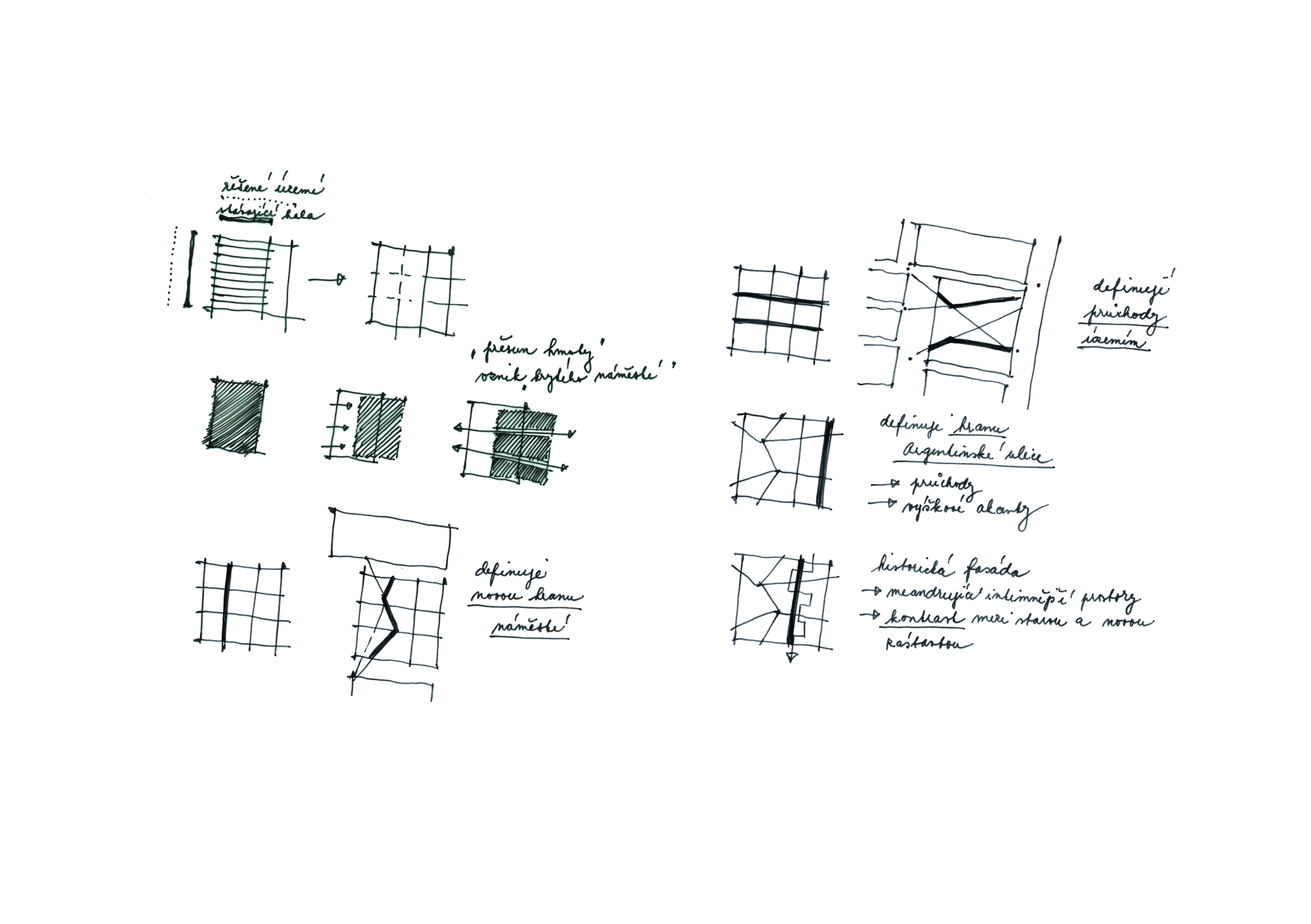 Přesné hranice zastavěných a nezastavěných ploch vycházejí z analýzy navazujících ulic, pěších propojení a uličních čar. Vzniklé nepravidelné hranice jsou v rámci haly „vyplněny“ prostory galerie a korespondují s tvary nově navržené zástavby, která do haly prorůstá.