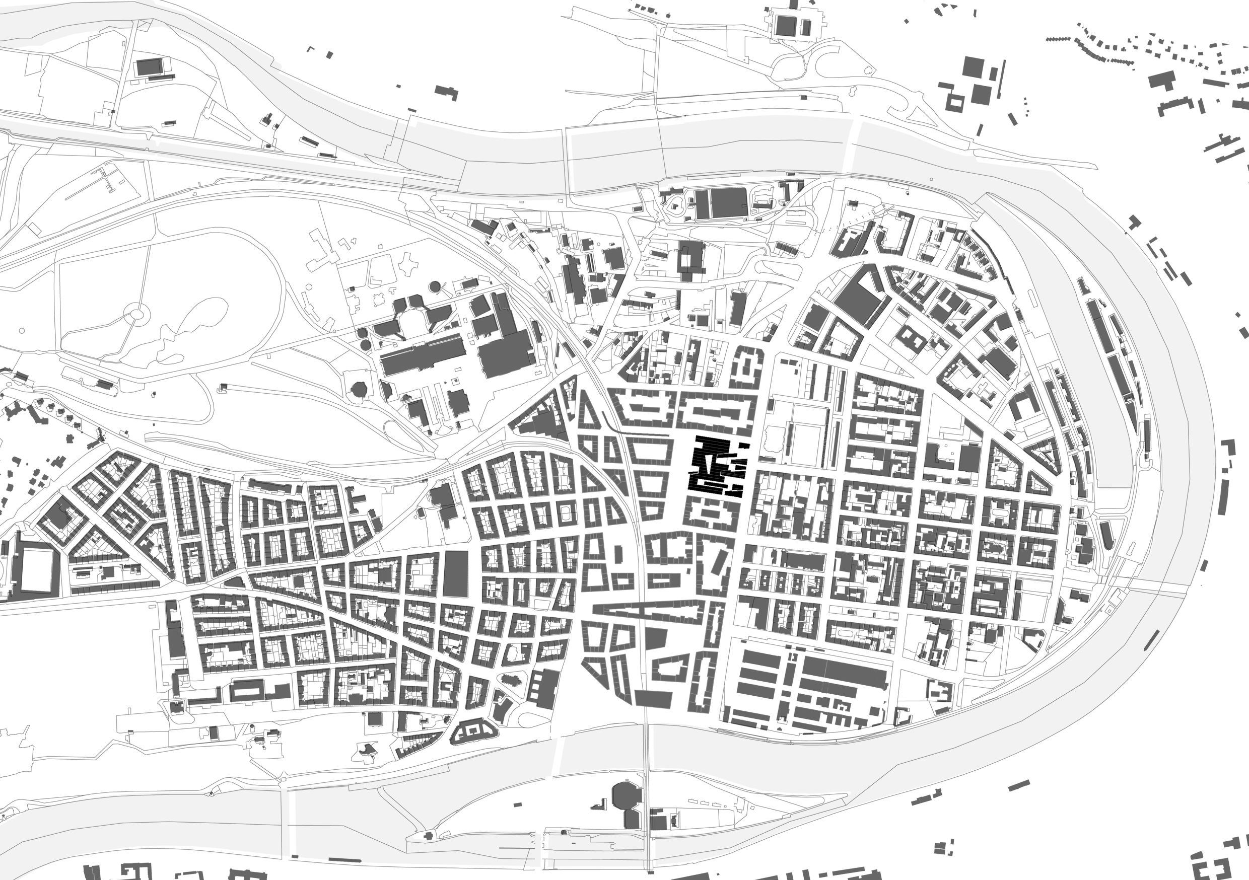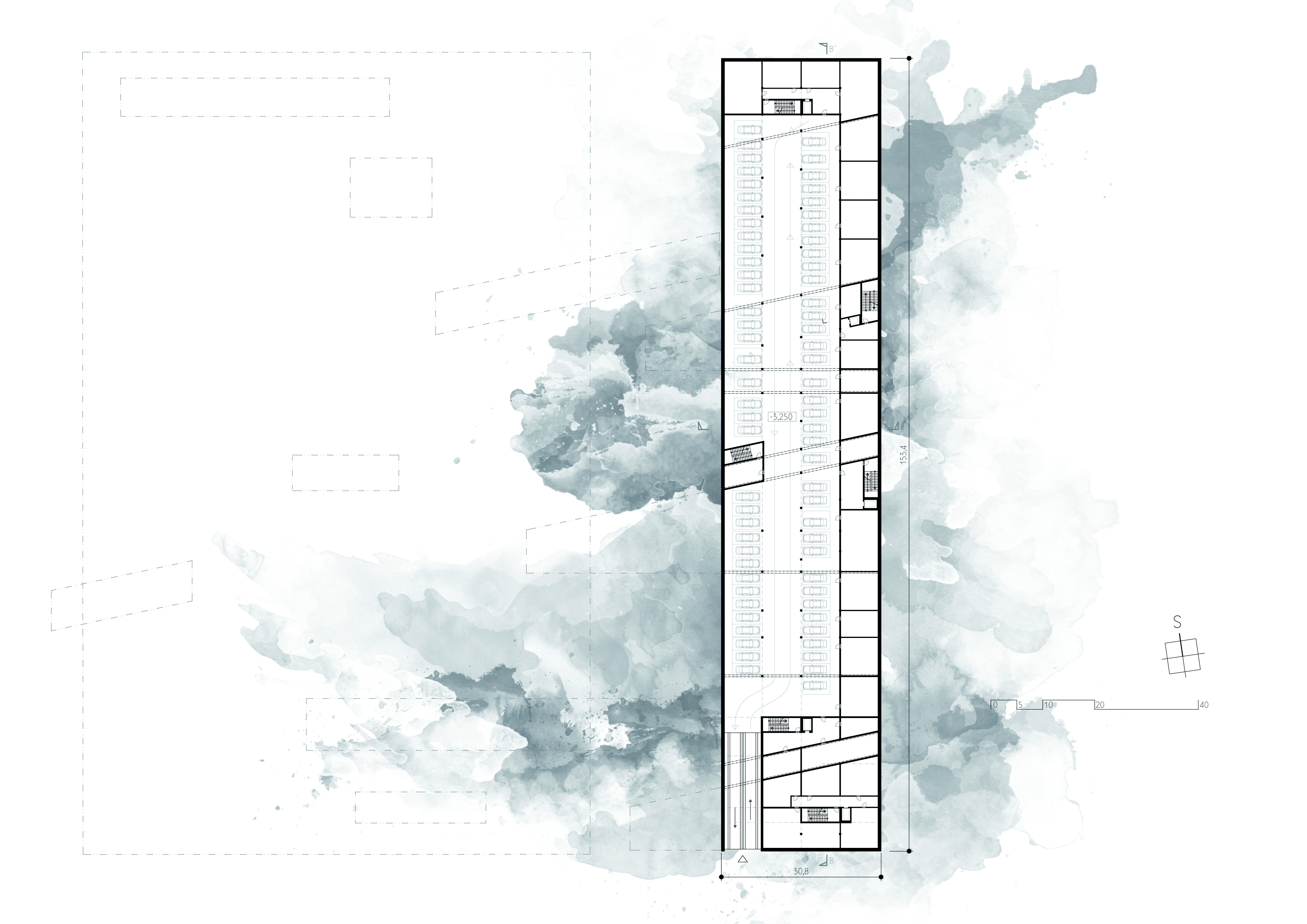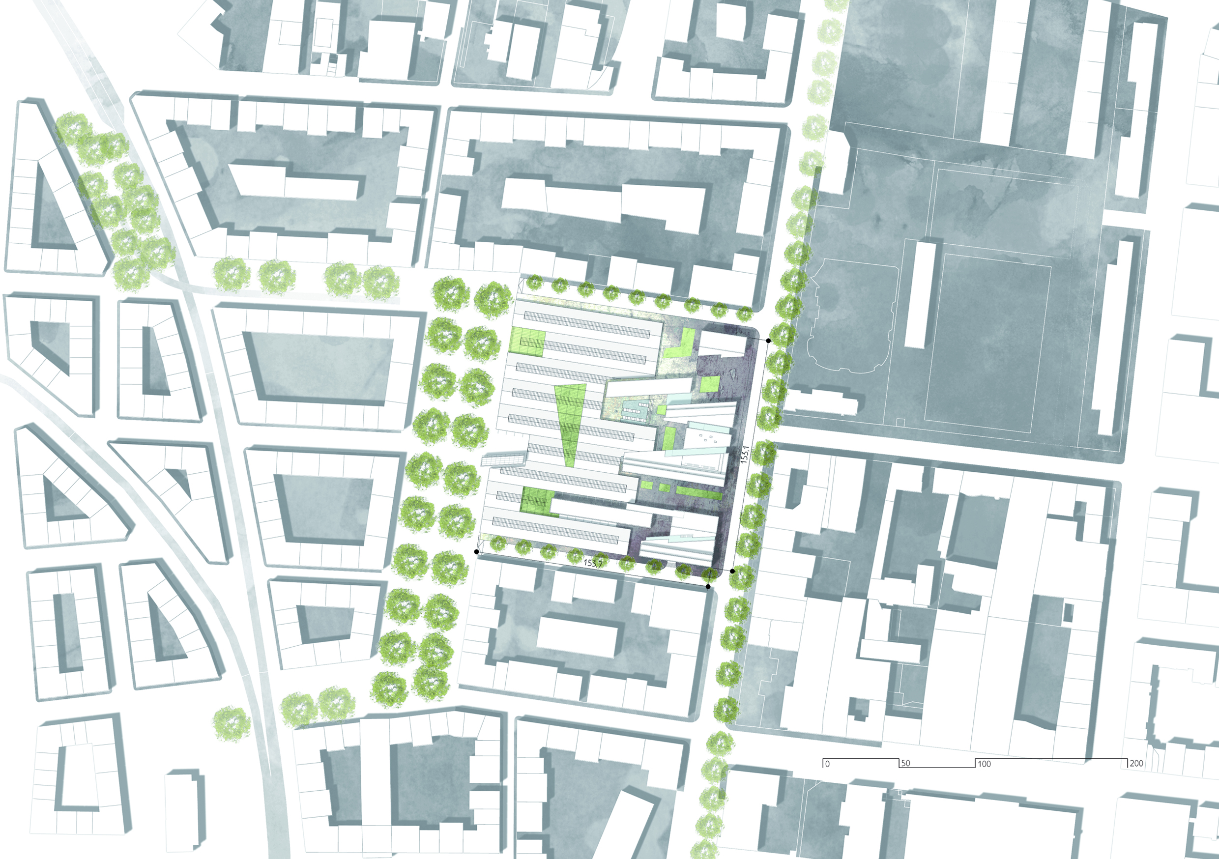 Přesné hranice zastavěných a nezastavěných ploch vycházejí z analýzy navazujících ulic, pěších propojení a uličních čar. Vzniklé nepravidelné hranice jsou v rámci haly „vyplněny“ prostory galerie a korespondují s tvary nově navržené zástavby, která do haly prorůstá.