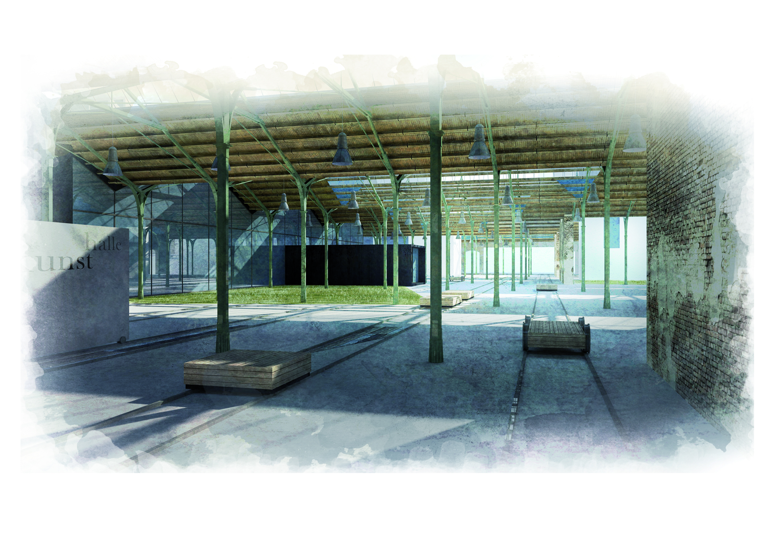 Velkorysý prostor uvnitř haly vybízí k zachování tohoto prostoru jako celku. Část haly přiléhající k náměstí je proto krytým exteriérovým prostorem, rozšiřuje veřejný prostor náměstí a nabízí odlišné kvality a ochranu před povětrnostními vlivy. Do východní části haly jsou vnořeny objemy galerie (kunsthalle), které těží z atmosféry historického objektu.