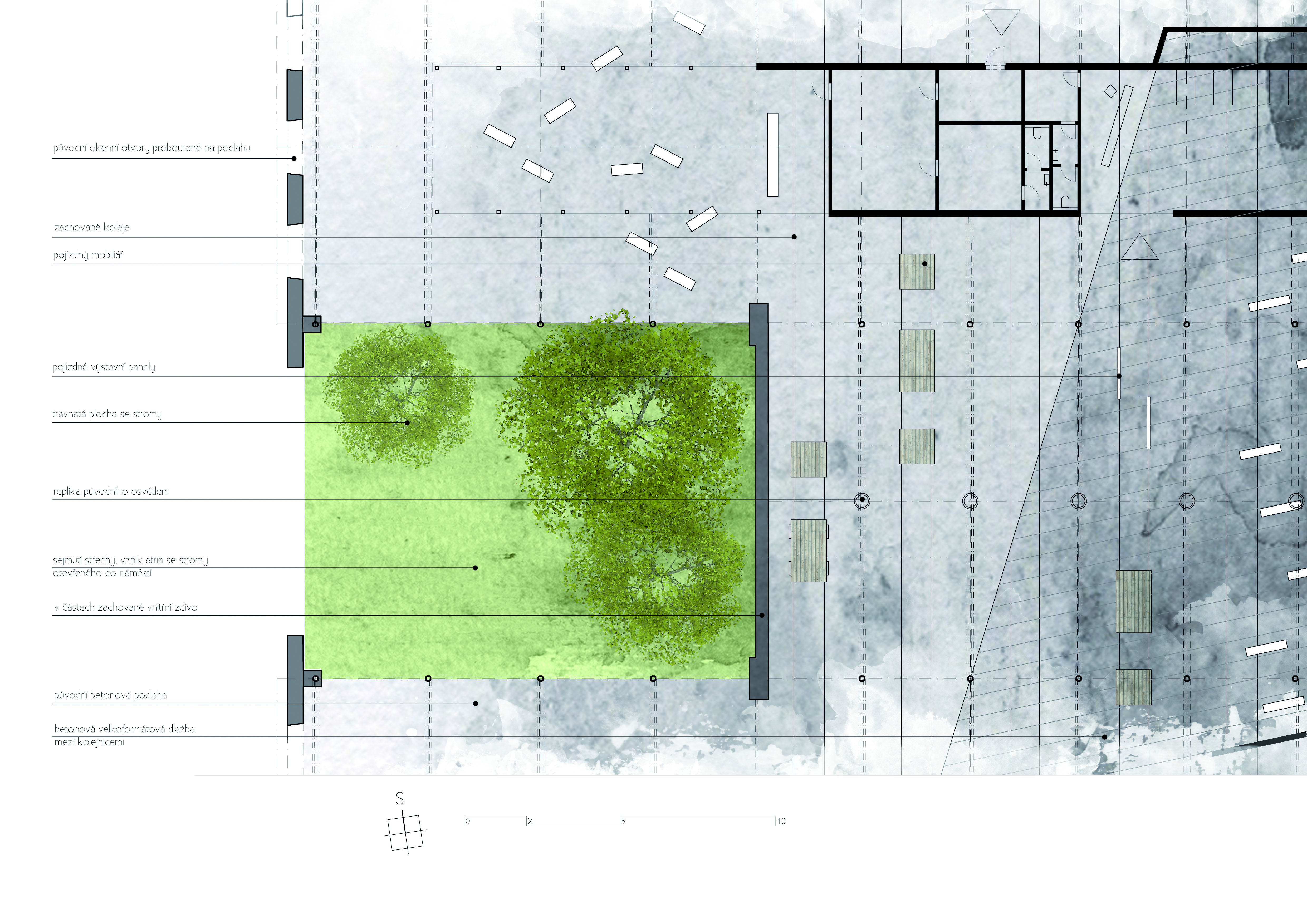 Samotná hala je dále členěna pomocí členění střechy. Konstrukce střechy je na určitých místech odstraněna úplně tak, aby byl umožněn nekonfliktní vztah ve styku staré a nové konstrukce, popřípadě vytvořen prostor pro vzrostlou zeleň. V některých případech je ze střechy odstraněna pouze krytina, aby byl umožněn přístup většímu množství světla a vláhy pro nízkou zeleň.