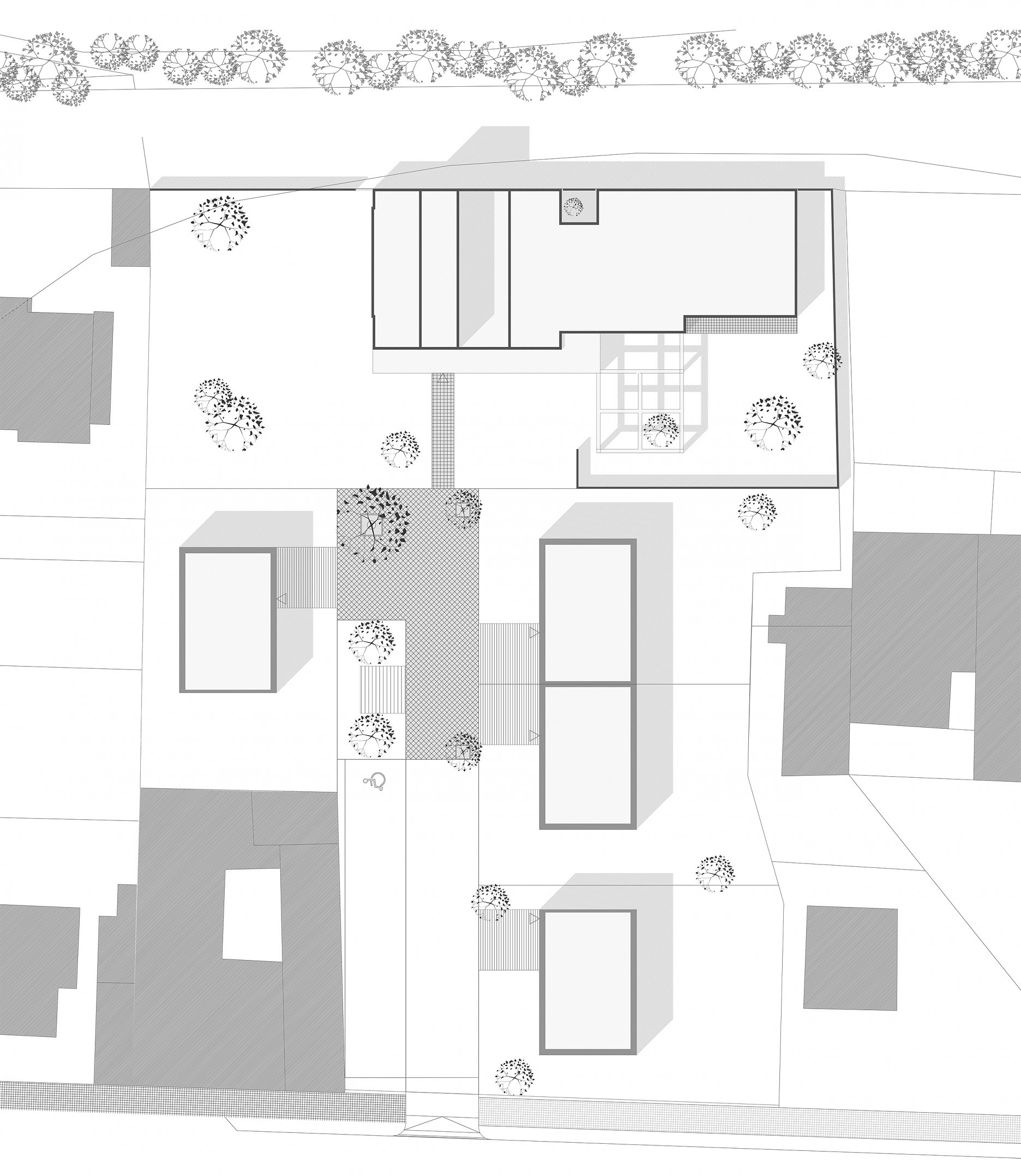 Situovanie stavby na hranici parcely uvoľňuje priestor záhrady, pričom hlavný vstup je pokračovaním osi príjazdovej komunikácie.