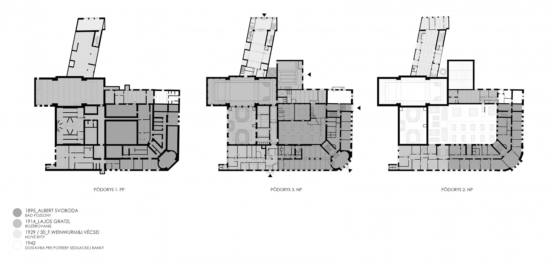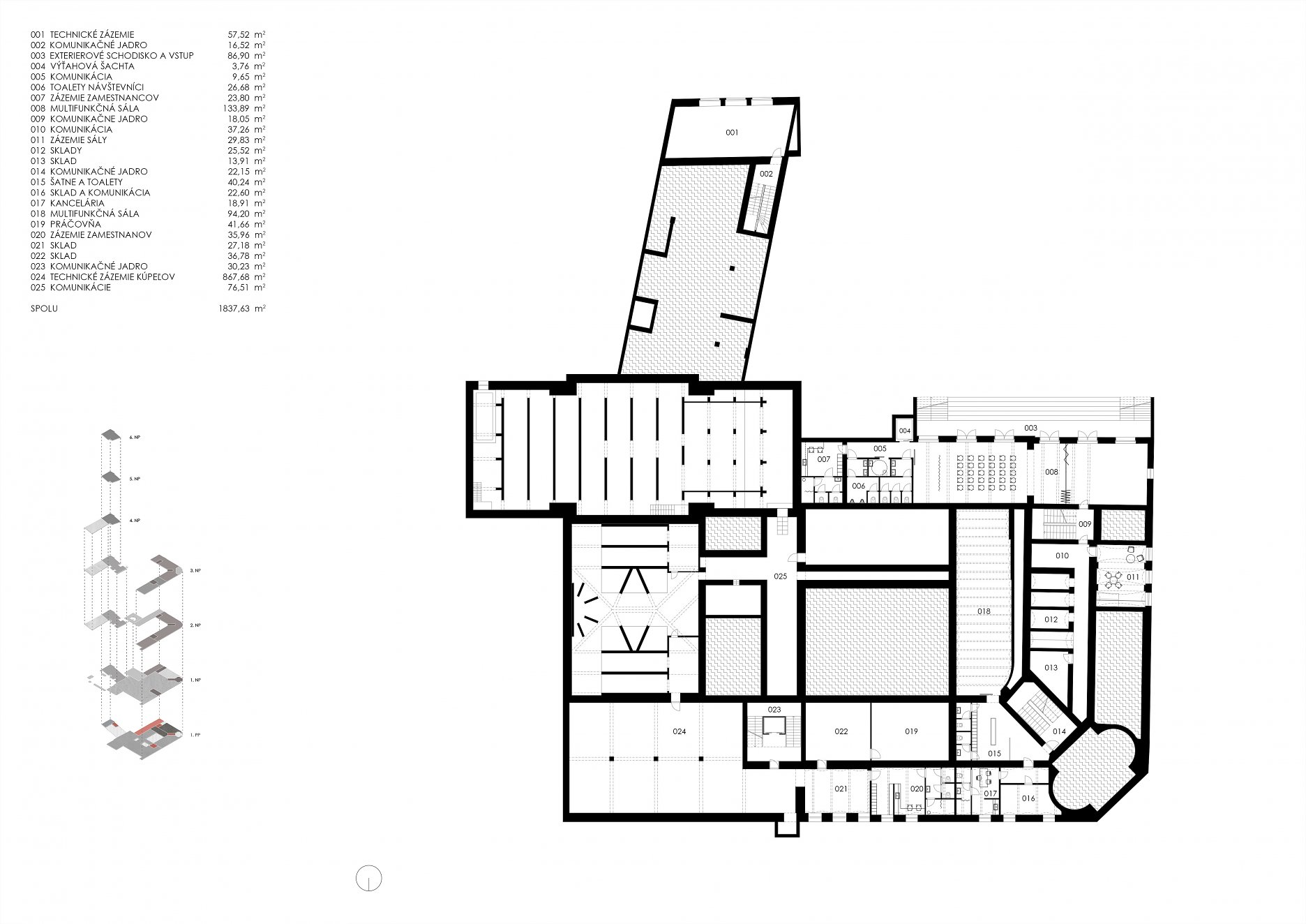 Funkcionalistická budova od Weinwurma slúži ako vstup pre galériu, situovanú na vyšších podlažiach tejto budovy, a taktiež na ďalších troch podlažiach susedného objektu nad prielukou (kúpaliskom). Hlavnú funkciu na 1. NP od nábrežia dopĺňa bistro a prechod do pôvodnej kotolne kúpeľov. Tu sa nachádza čajovňa s priamou náväznosťou na prieluku. Tá slúži na oddych, stretávanie sa či exteriérové výstavné plochy. Priestory od Kúpeľnej ulice slúžia pre design store, kníhkupectvo, ateliéry a zázemia. 1. PP, 2. NP, 3. NP podporujú vertikálne prepojenie budovy. Nachádzajú sa tu zdravotné procedúry, knižnica, sála pre pohybové aktivity, workshopy, dielne, multifunkčná sála, gastro. Strecha v centrálnej časti je prístupná vo väčšej časti návštevníkom pre pohybové aktivity, saunu, čítáreň knižnice.