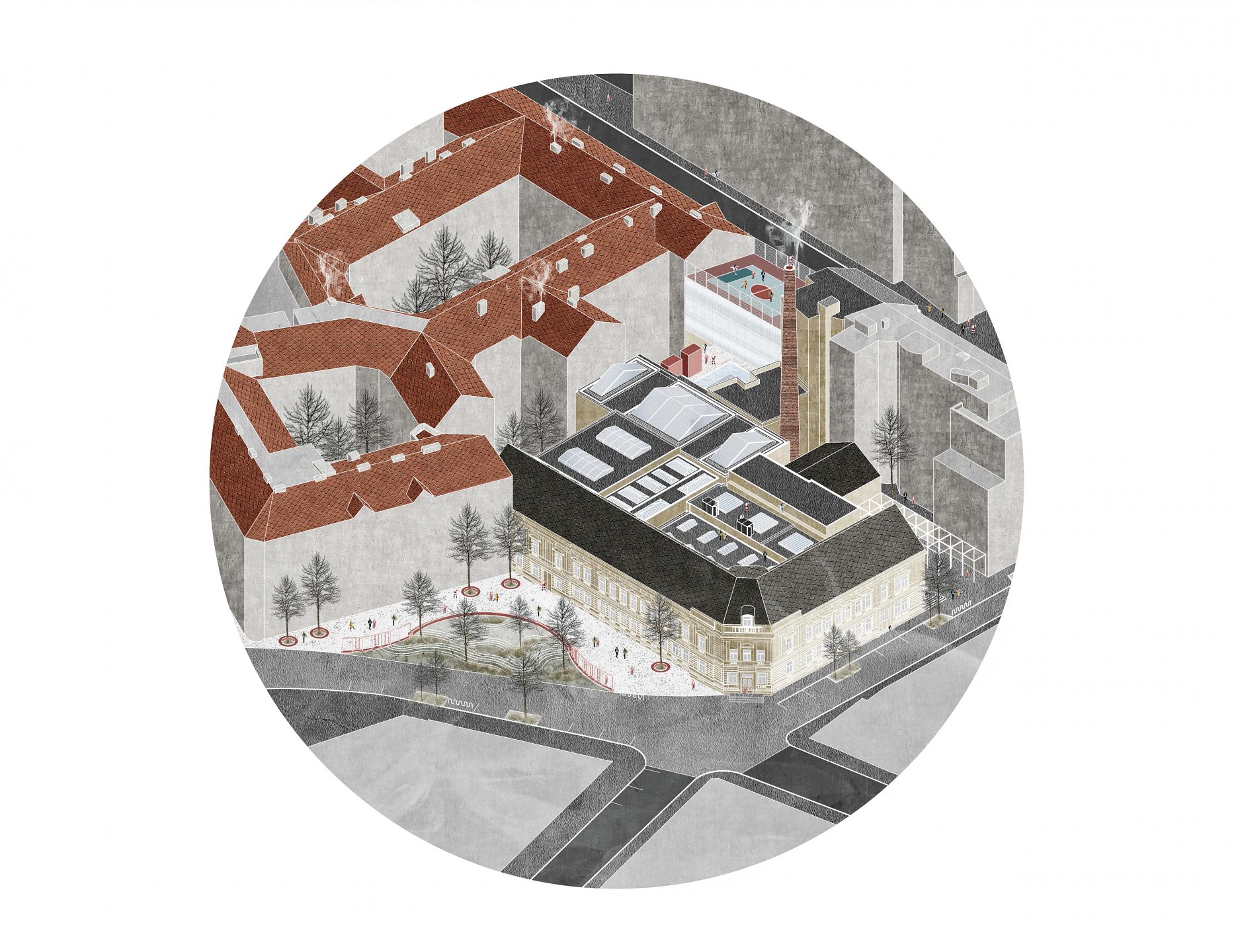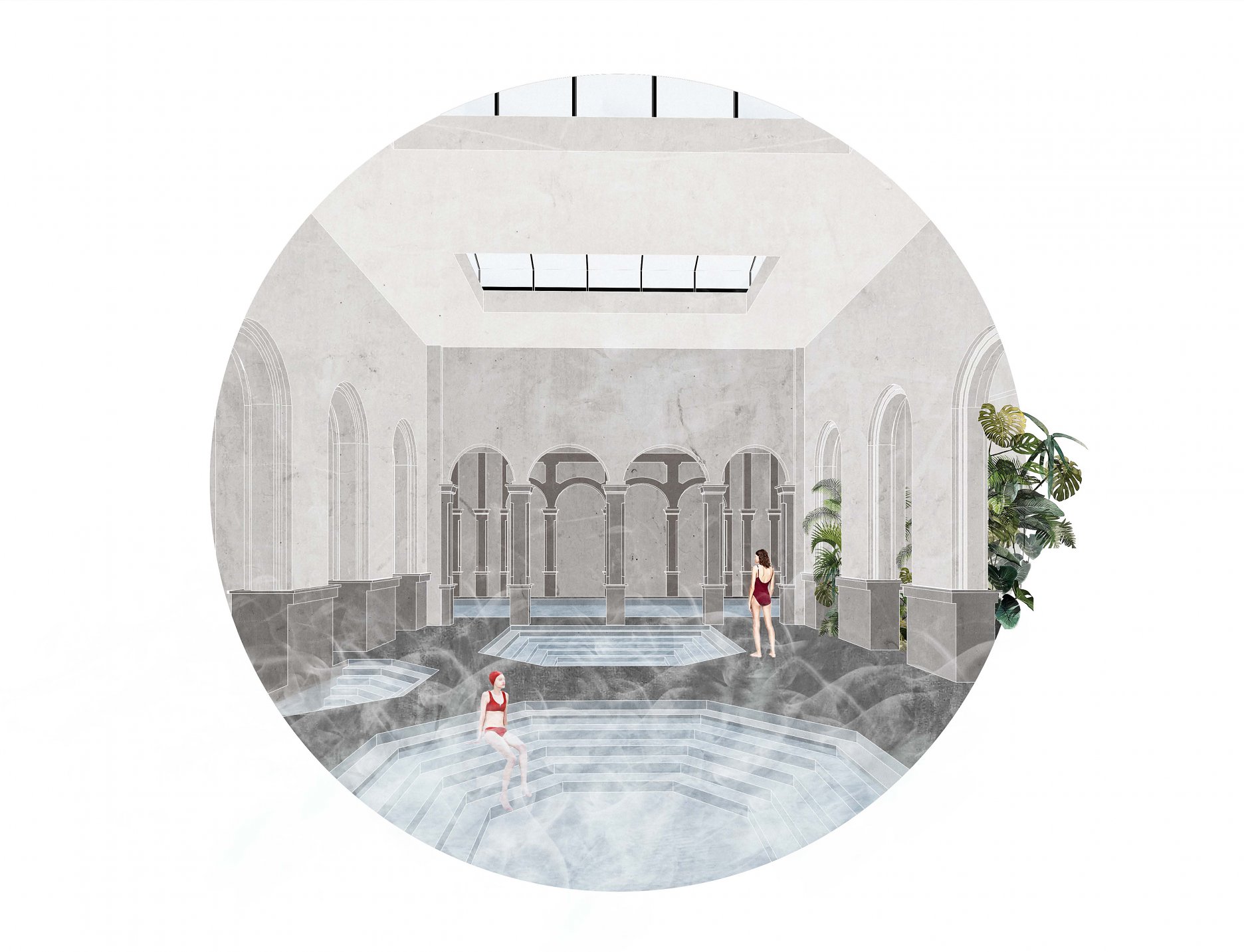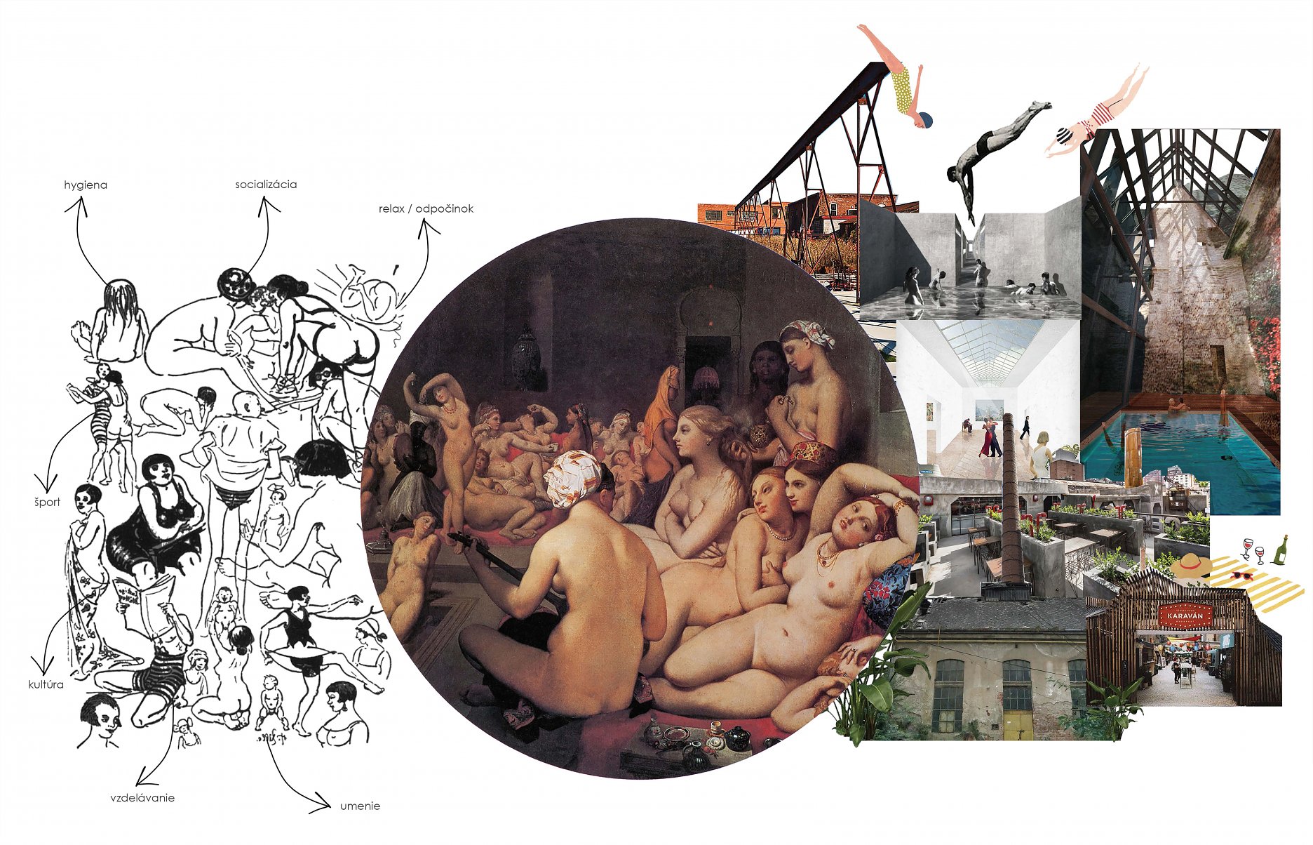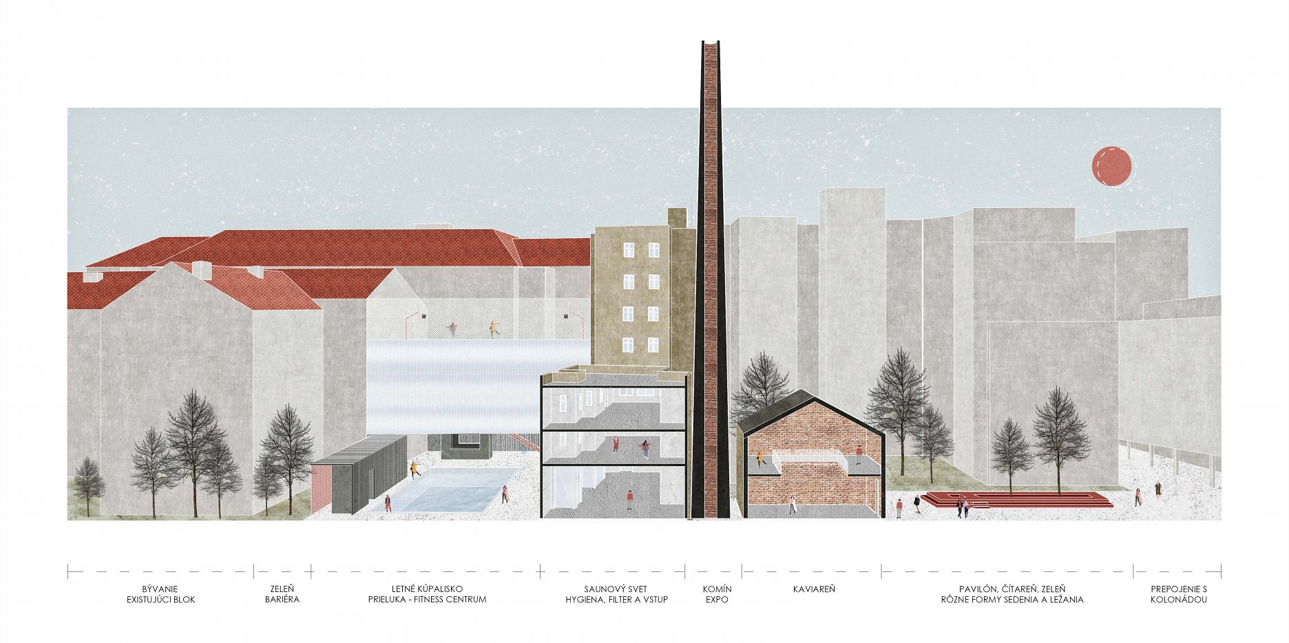 Priestor pred Národným múzeum bol vyčistený od parkovania a cestnej komunikácie, čím vznikol reprezentatívny voľný priestor umožňujúci rôzne podujatia. V tejto časti je navrhnutá i nová zástavka električky, ktorá odľahčí dopravnú situáciu v okolí. Prieluka s letným kúpaliskom na Vajanskom nábreží zachováva kontakt s Dunajom vďaka hmote, ktorá je odľahčená prvým podlažím, ktoré tvoria len jednoduché hmoty recepcie, jadra a šatní. Prioritnú funkciu budovy tvoria kúpele a pridružené funkcie v podobe zdravotných procedúr, saunového sveta, relaxu, pohybových aktivít. Pre stretávanie sa ľudí a tvorbe komunity napomáhajú kaviarne, gastro prevádzky, výstavné / kultúrne priestory a knižnica so svojimi sekundárnymi funkciami. Týmto miešaním funkcií a správnym dispozičným riešením vznikla oáza pokoja, relaxu a pohybu, pričom neprichádza k vzájomnému narúšaniu sa jednotlivých funkcií. Všetky verejné priestory boli navrhnuté aby boli v harmónií s prevádzkami vnútri objektu a navzájom sa podporovali.