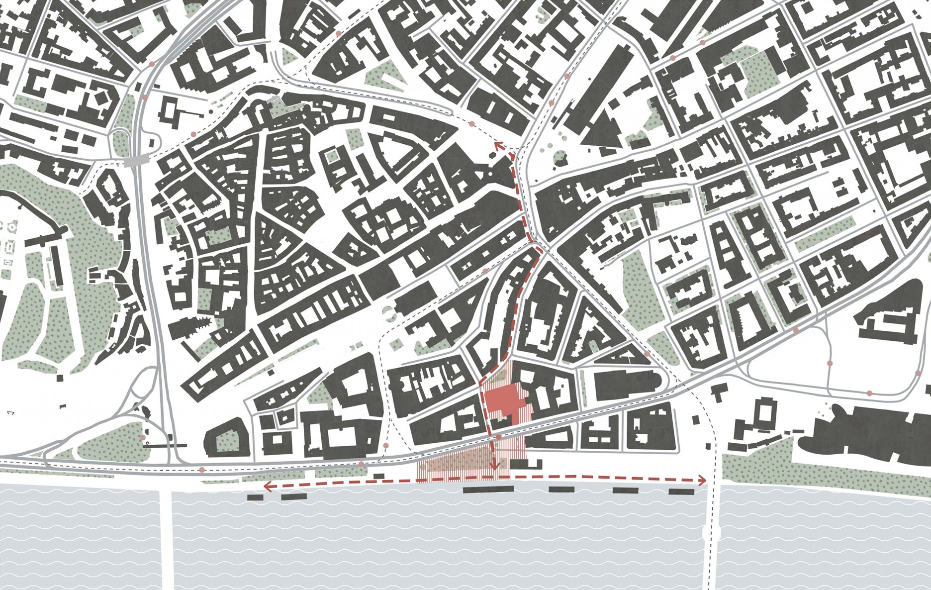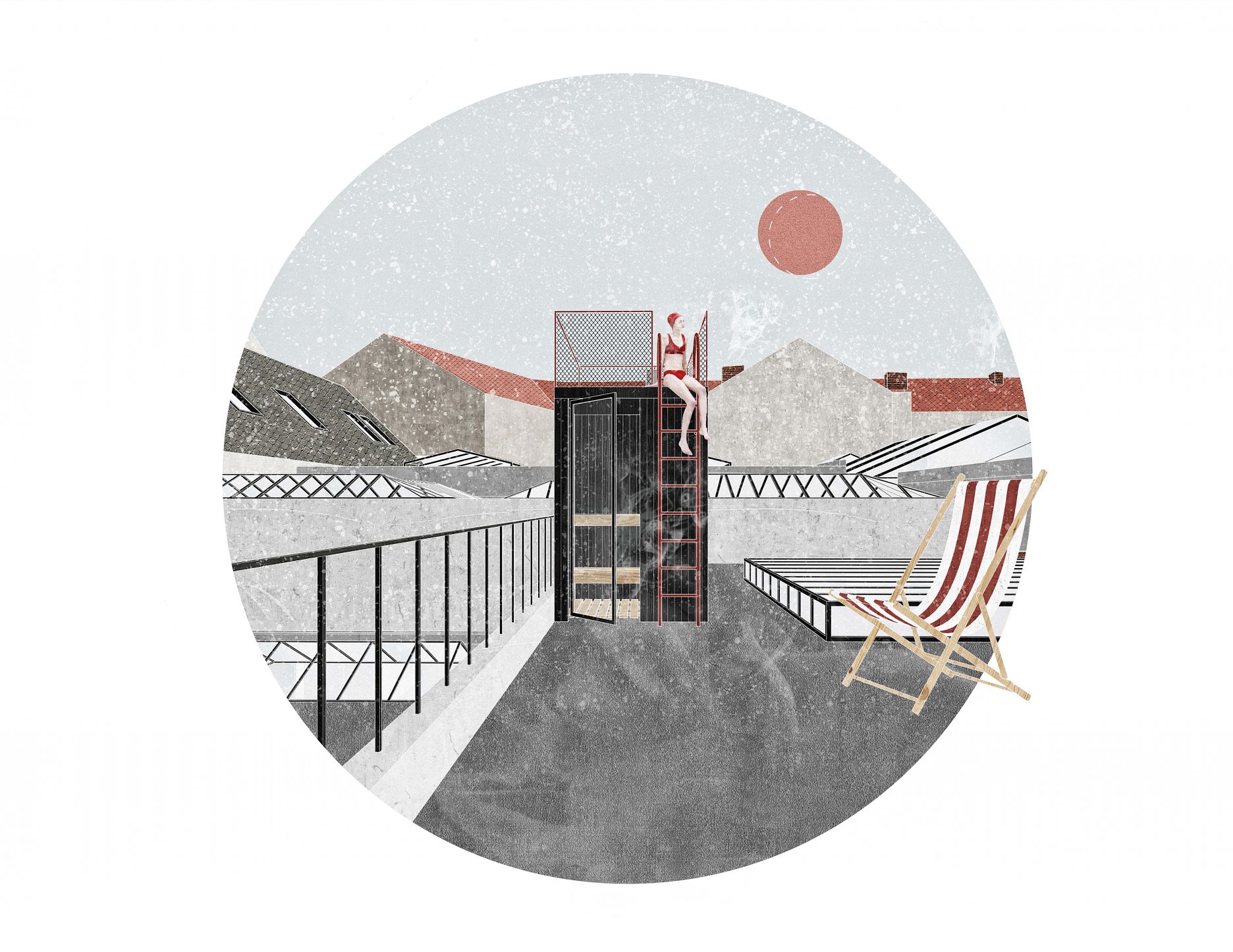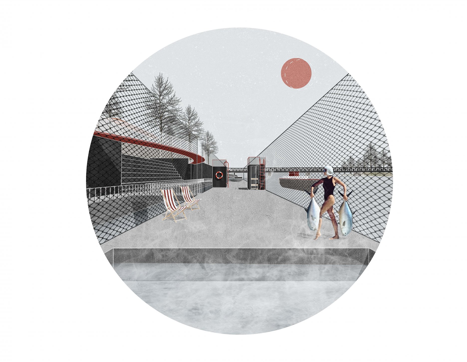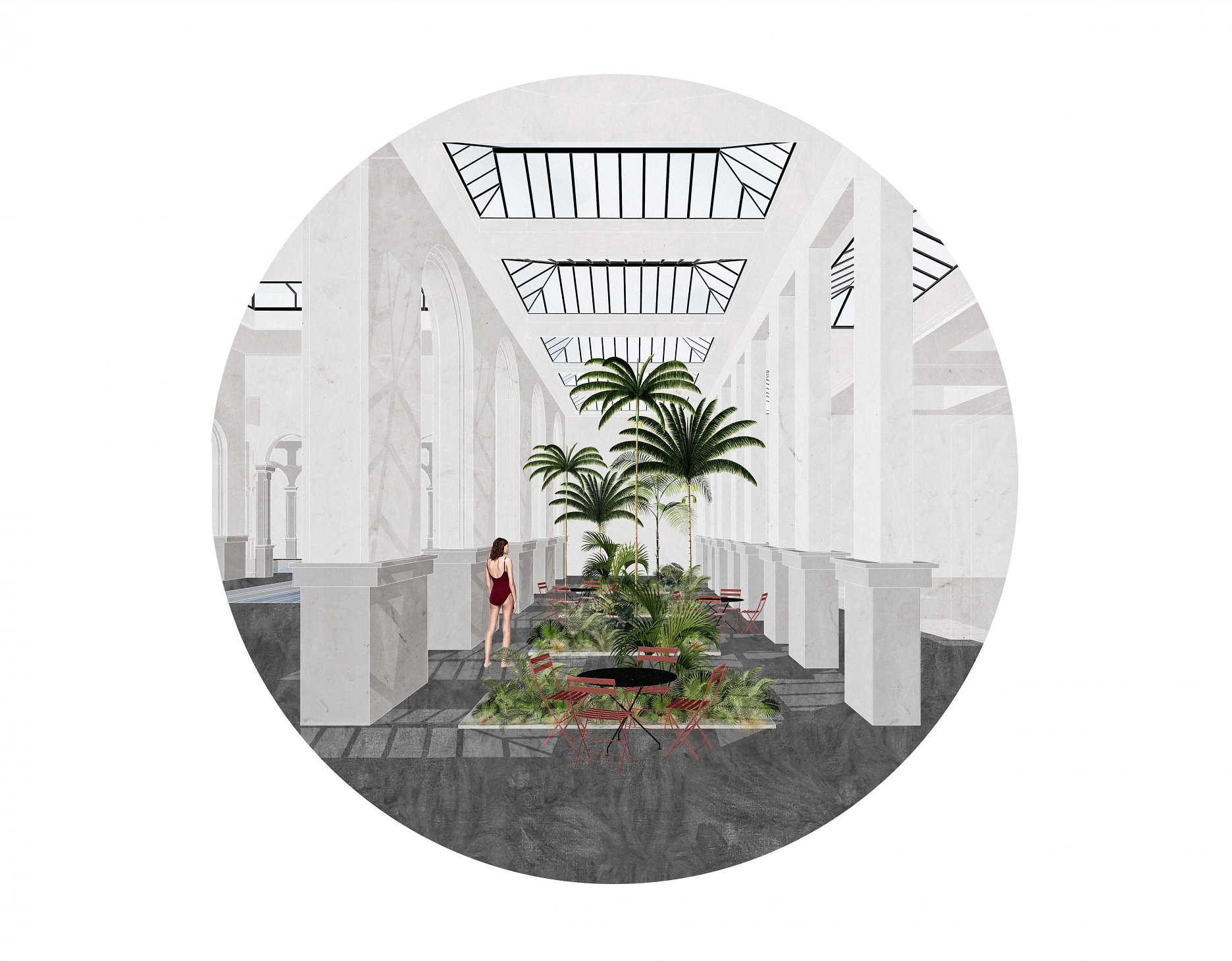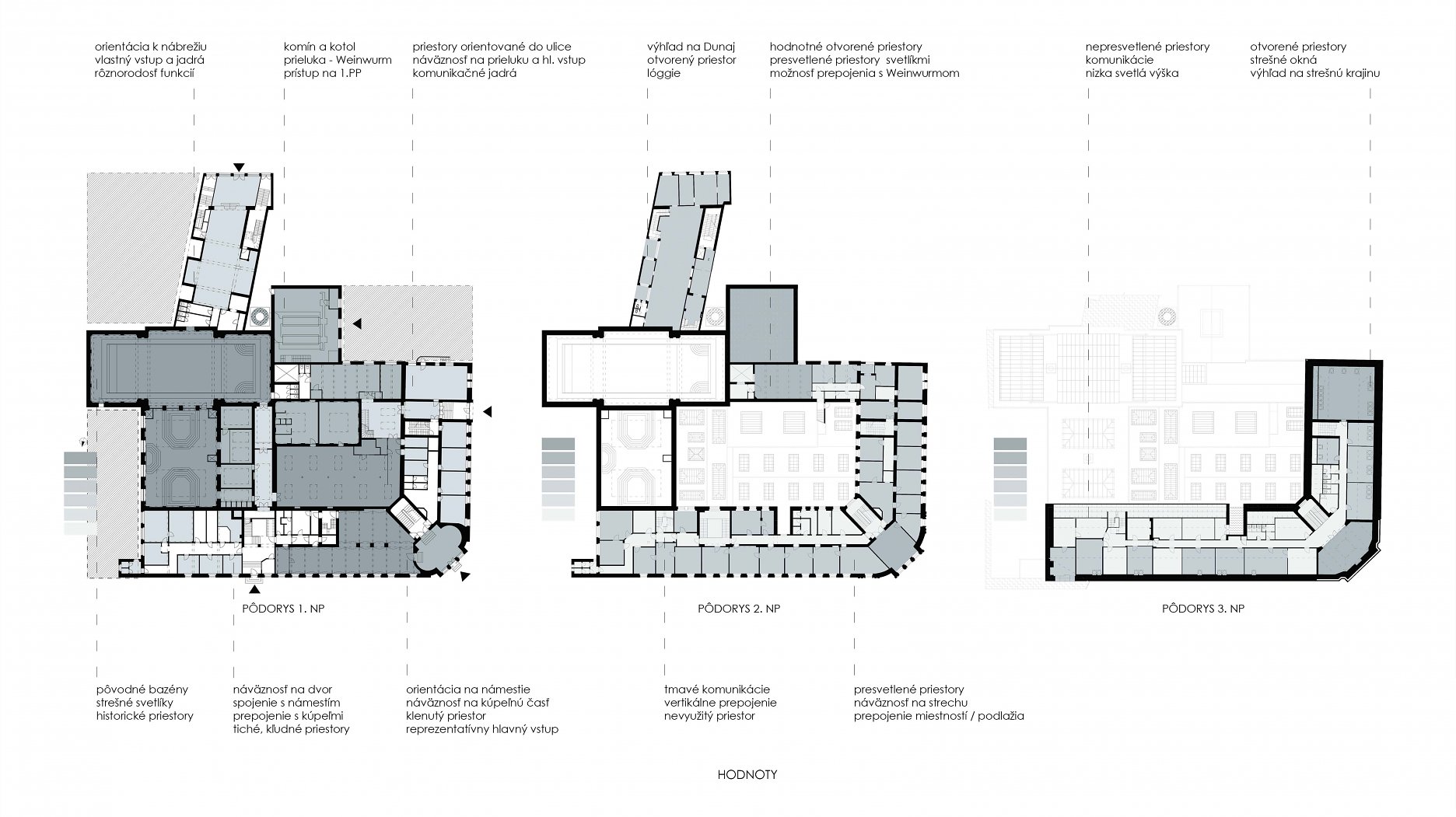 Priestor pred Národným múzeum bol vyčistený od parkovania a cestnej komunikácie, čím vznikol reprezentatívny voľný priestor umožňujúci rôzne podujatia. V tejto časti je navrhnutá i nová zástavka električky, ktorá odľahčí dopravnú situáciu v okolí. Prieluka s letným kúpaliskom na Vajanskom nábreží zachováva kontakt s Dunajom vďaka hmote, ktorá je odľahčená prvým podlažím, ktoré tvoria len jednoduché hmoty recepcie, jadra a šatní. Prioritnú funkciu budovy tvoria kúpele a pridružené funkcie v podobe zdravotných procedúr, saunového sveta, relaxu, pohybových aktivít. Pre stretávanie sa ľudí a tvorbe komunity napomáhajú kaviarne, gastro prevádzky, výstavné / kultúrne priestory a knižnica so svojimi sekundárnymi funkciami. Týmto miešaním funkcií a správnym dispozičným riešením vznikla oáza pokoja, relaxu a pohybu, pričom neprichádza k vzájomnému narúšaniu sa jednotlivých funkcií. Všetky verejné priestory boli navrhnuté aby boli v harmónií s prevádzkami vnútri objektu a navzájom sa podporovali.