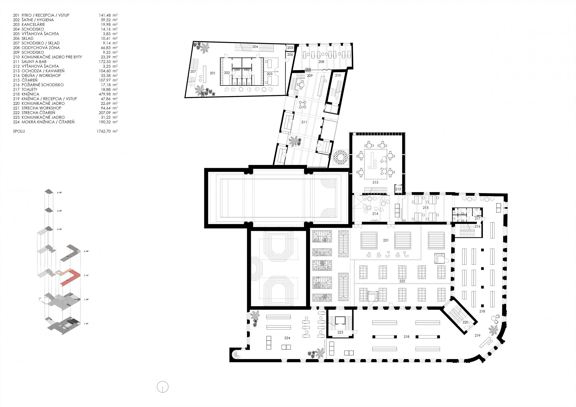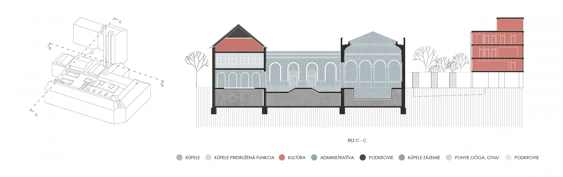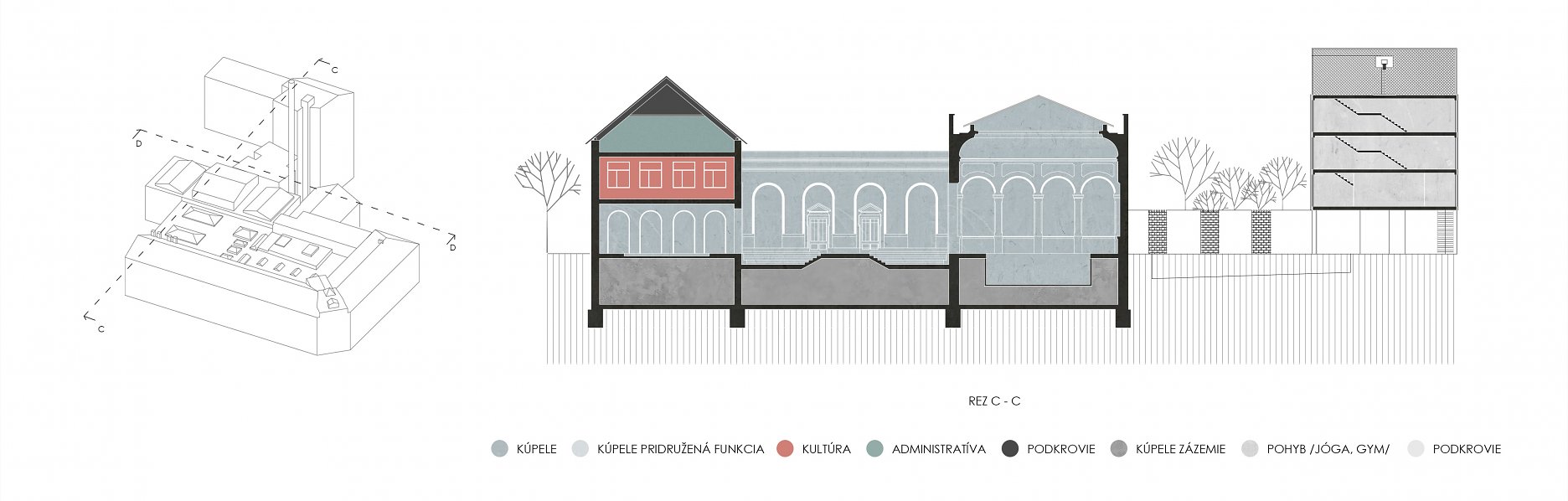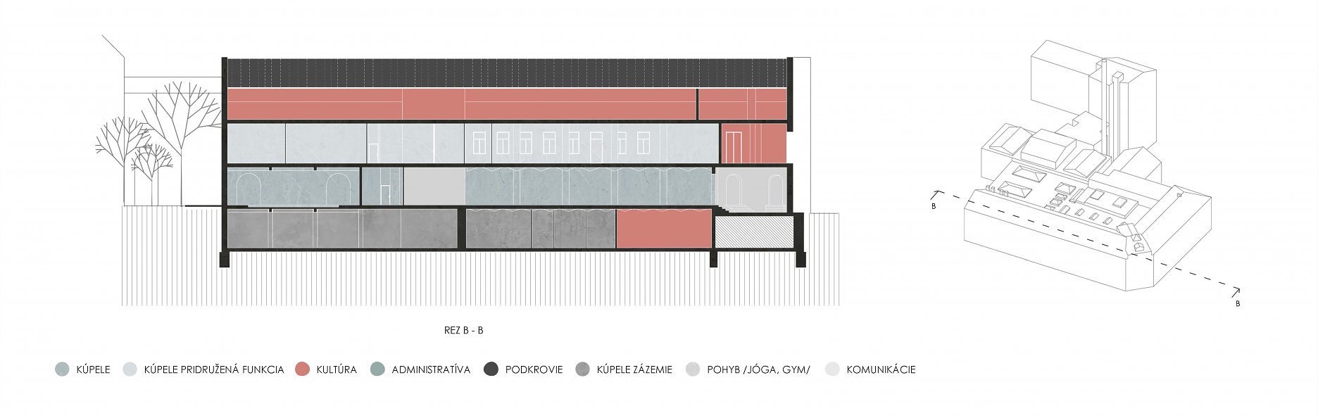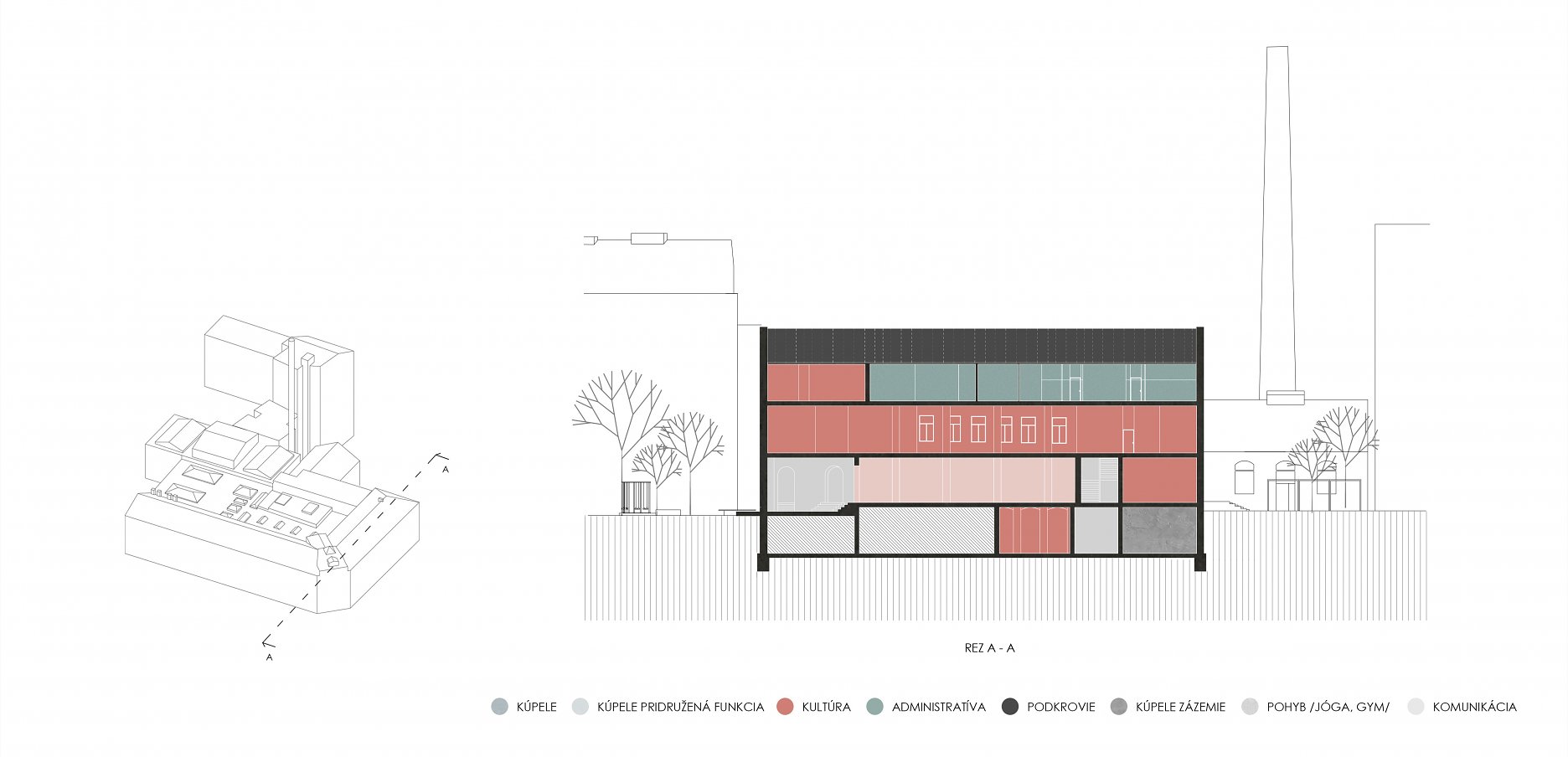 Pri recepcií kúpeľov od Kúpeľnej ulici je umiestnená multifunkčná sála pre pohybové aktivity a očistu tela a duše. V pôvodnej kotolni a priľahlých priestoroch je umiestnená kaviareň prepojená s kníhkupectvom a design store s náväznosťou na prieluku, ktorá môže slúžiť ako čítáreň, i iné kultúrne podujatia. Transformácia ulice poskytuje v oboch návrhoch jednoduchší pohyb peších, menej parkovacích miest a prepojenie s kolonádou bytového domu. Funkcia kultúry je podporená na 1. PP multifunkčnou sálou a výstavnými priestormi. Na 2. NP sa nachádza knižnica, dielne, workshopy a mokrá čítáreň pre návštevníkov kúpeľov. Knižnica pokračuje až na 3. NP, pričom priestor podkrovia v oboch návrhoch slúži aj pre administratívu.