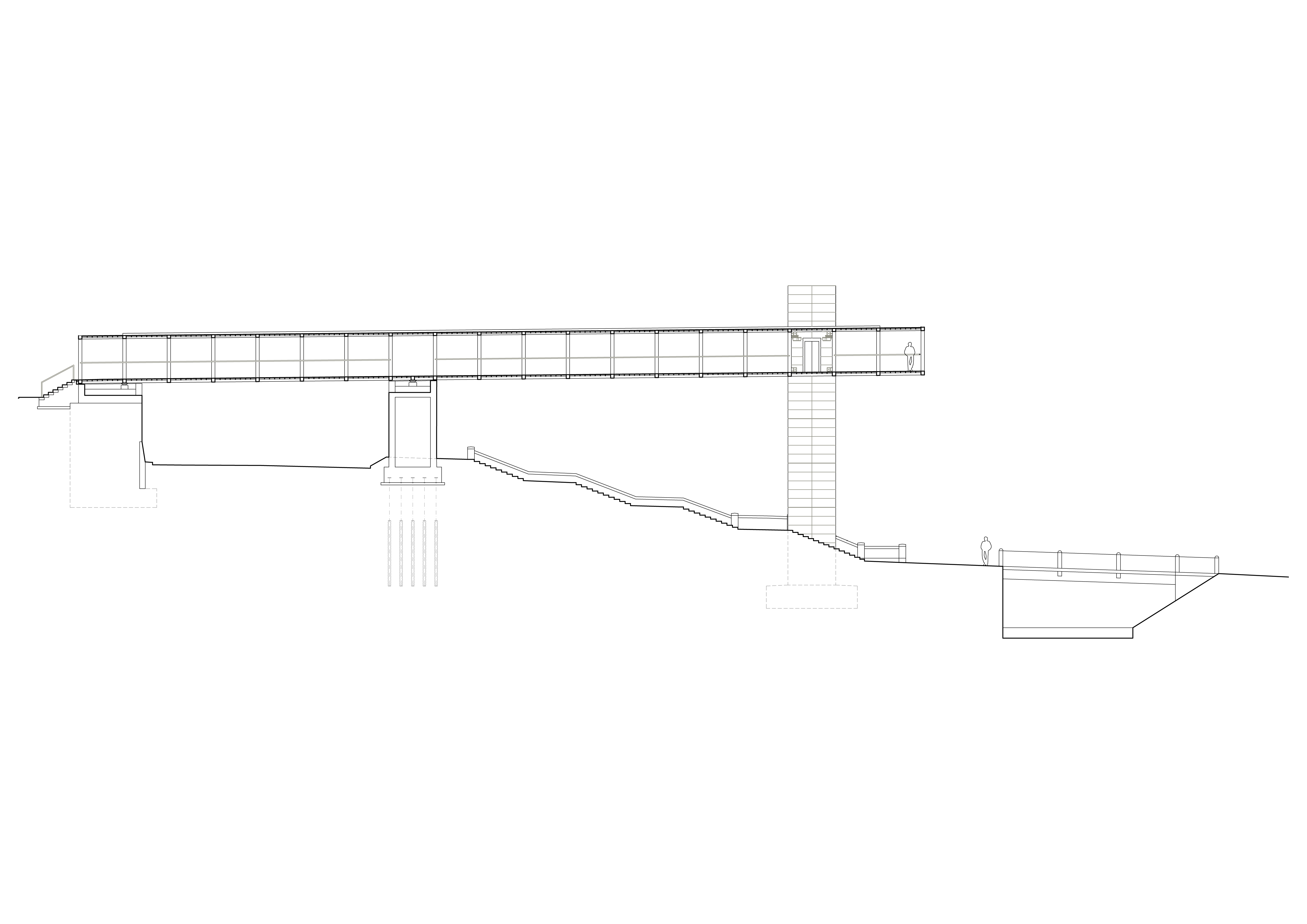 Stredný pilier prechádza do nového betónového schodiska, orientovaného v smere cesty k Smetanovmu domu. V západnom predpolí je most uložený na podpere, integrovanej v rámci existujúceho oporného múru.