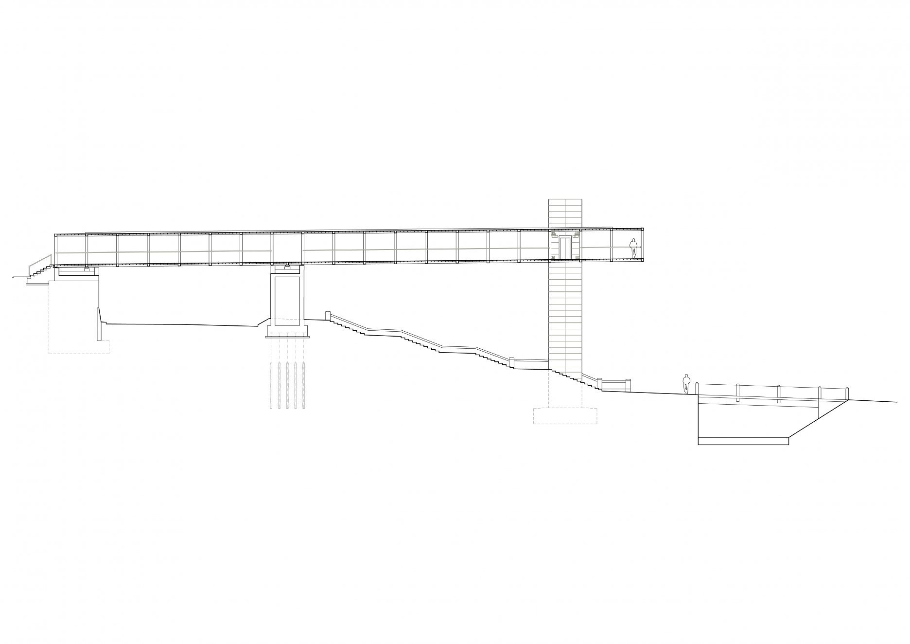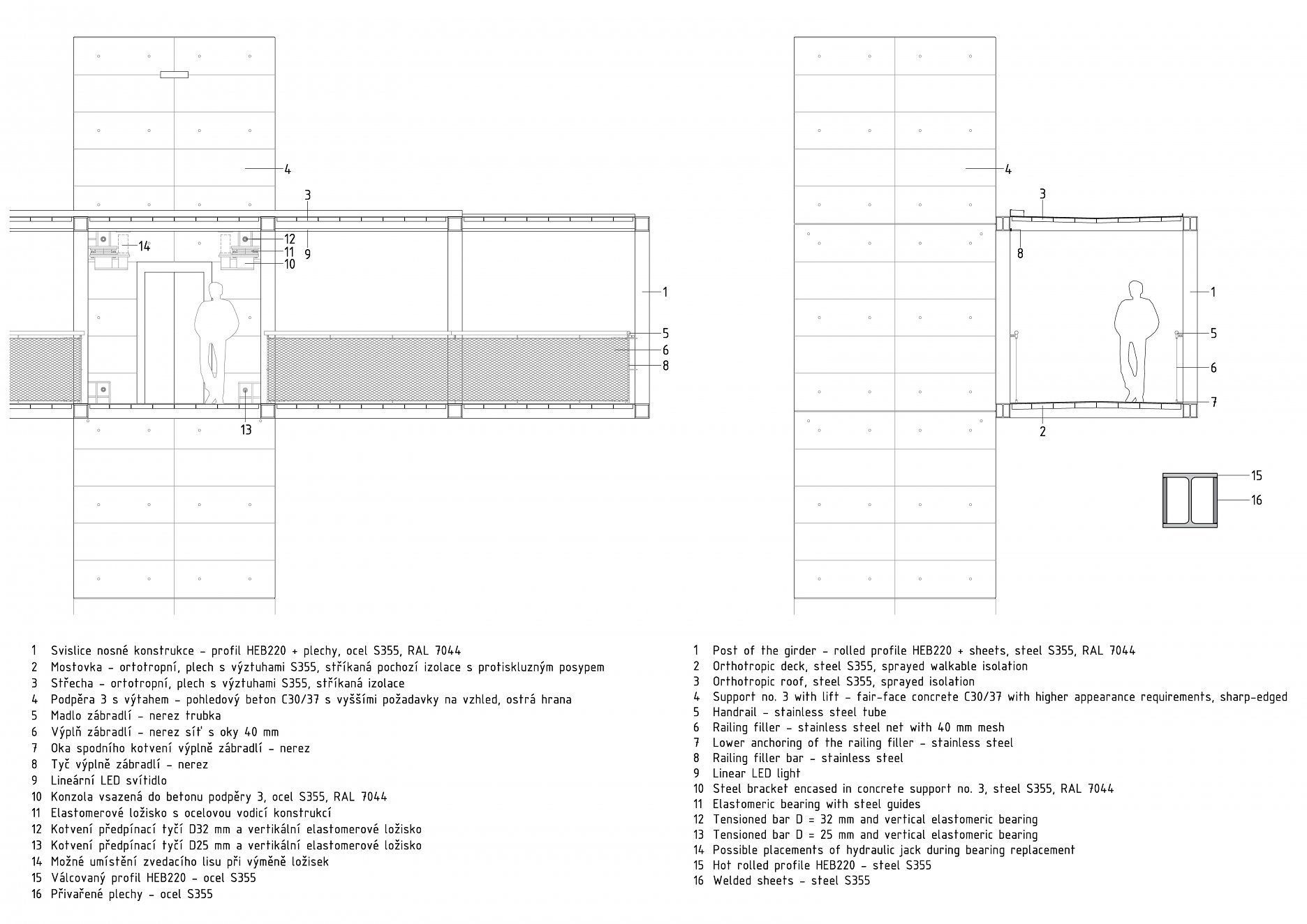 Konštrukčné riešenie využíva valcované HEB profily, doplnené o navarené platne štvorcového tvaru 220 x 220 mm. Oceľovú konštrukciu lávky dopĺňa zábradlie s nerezovým madlom a pletivom.