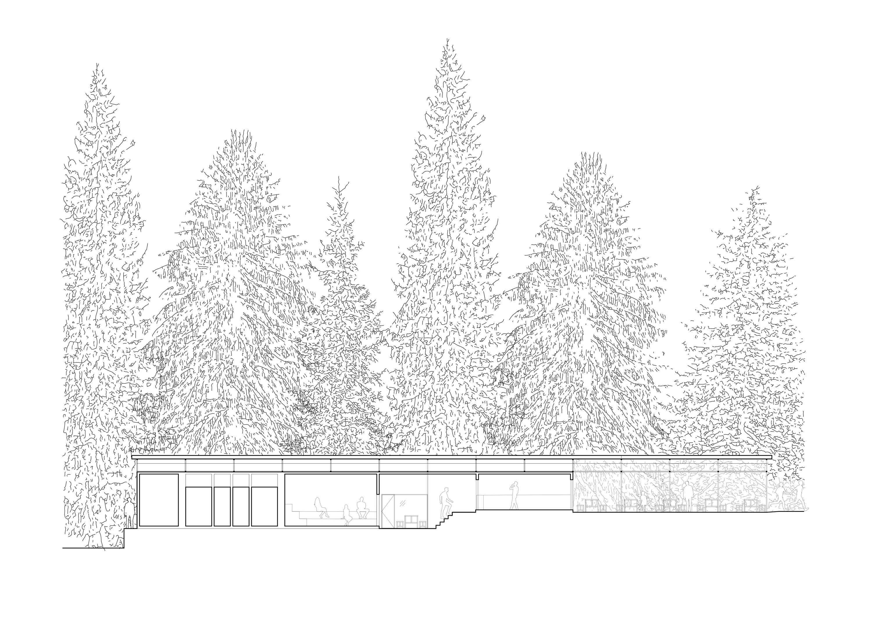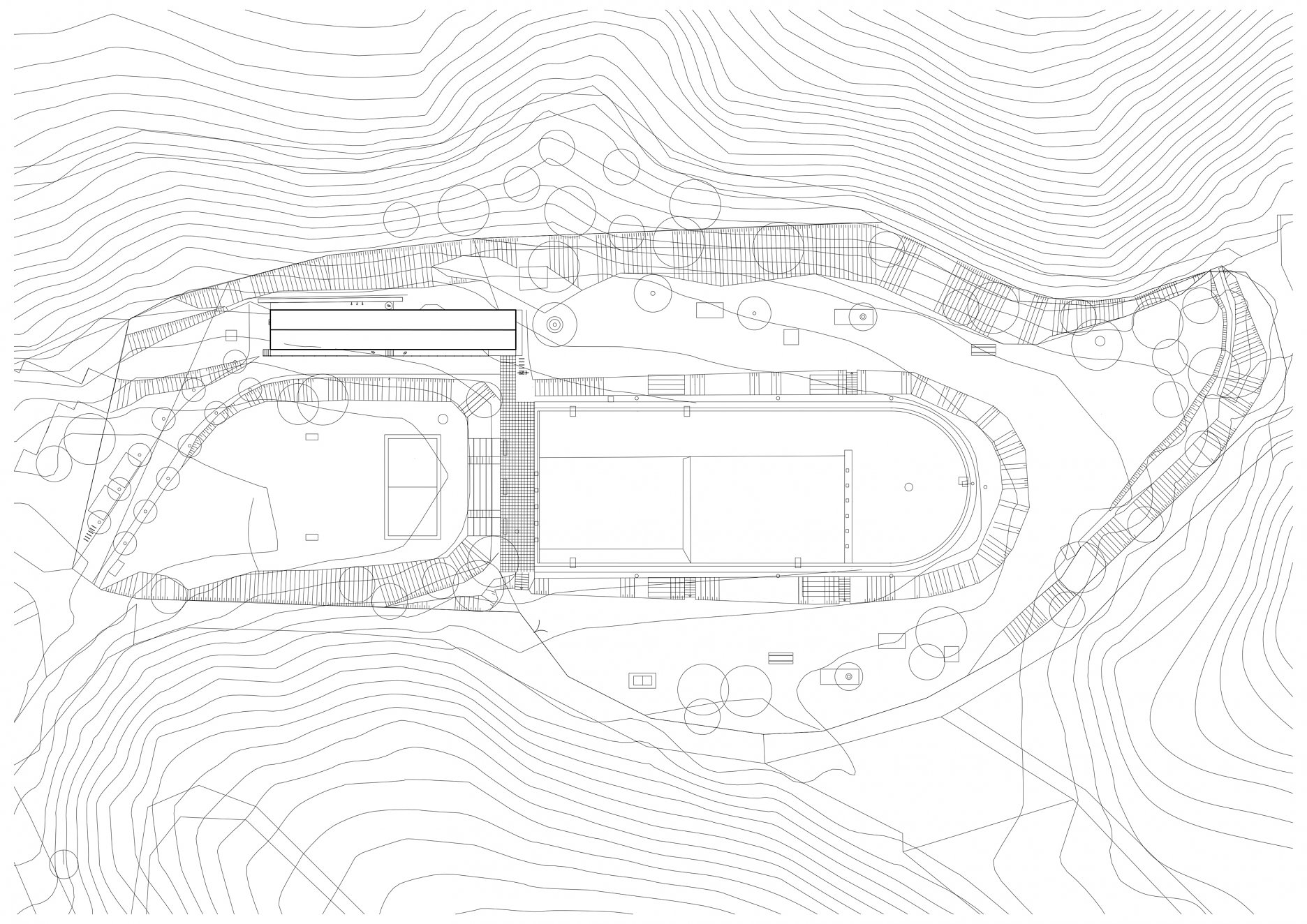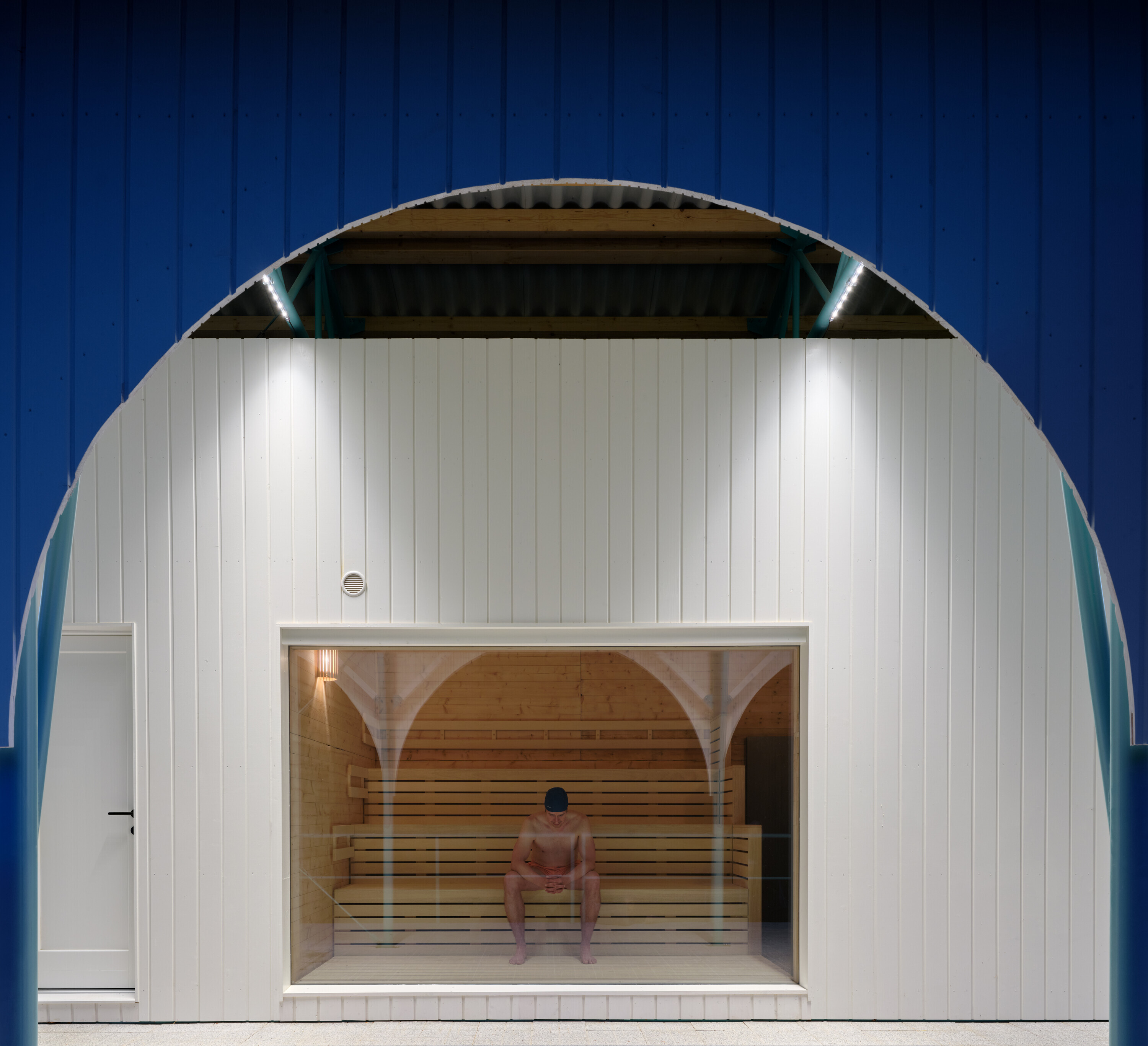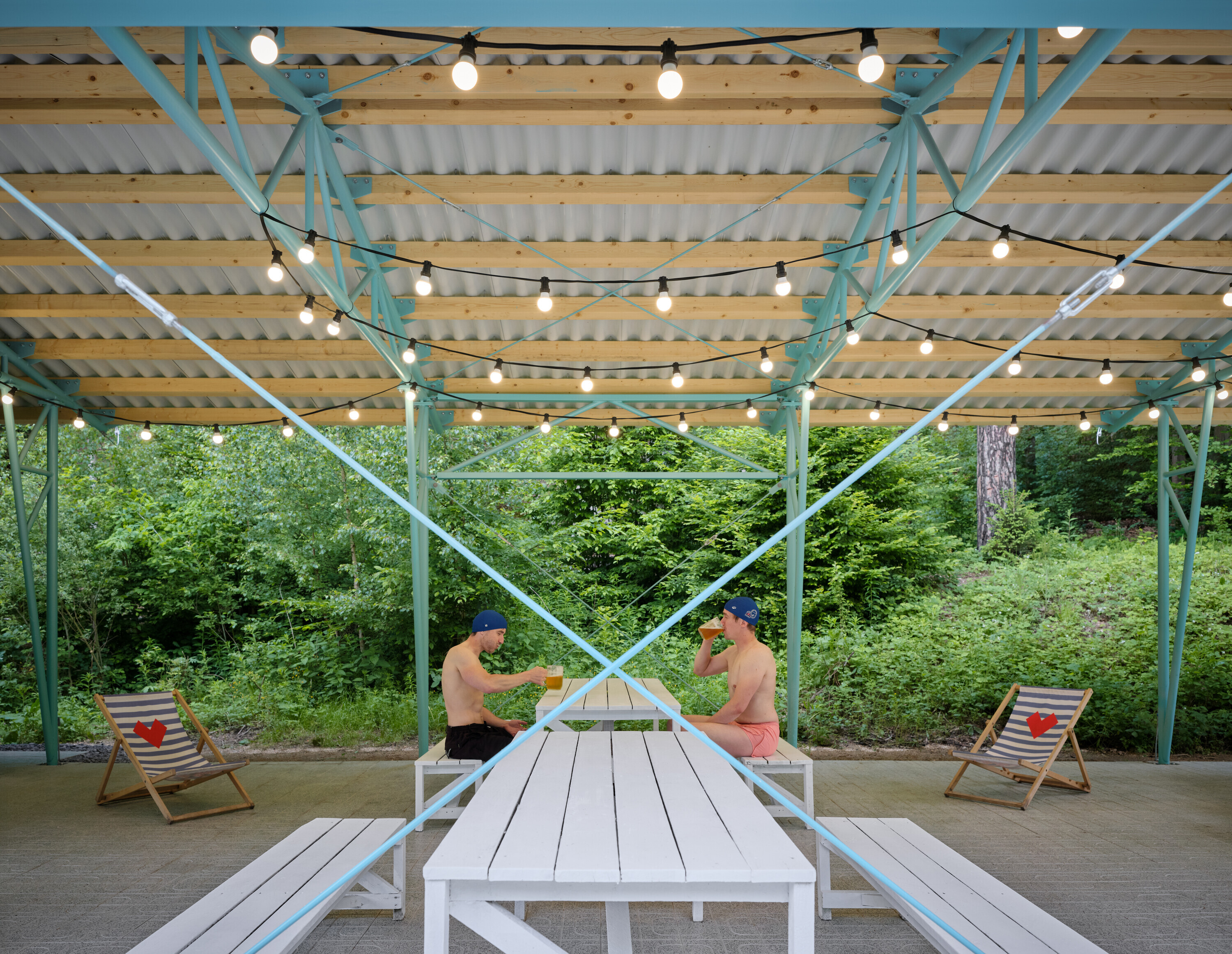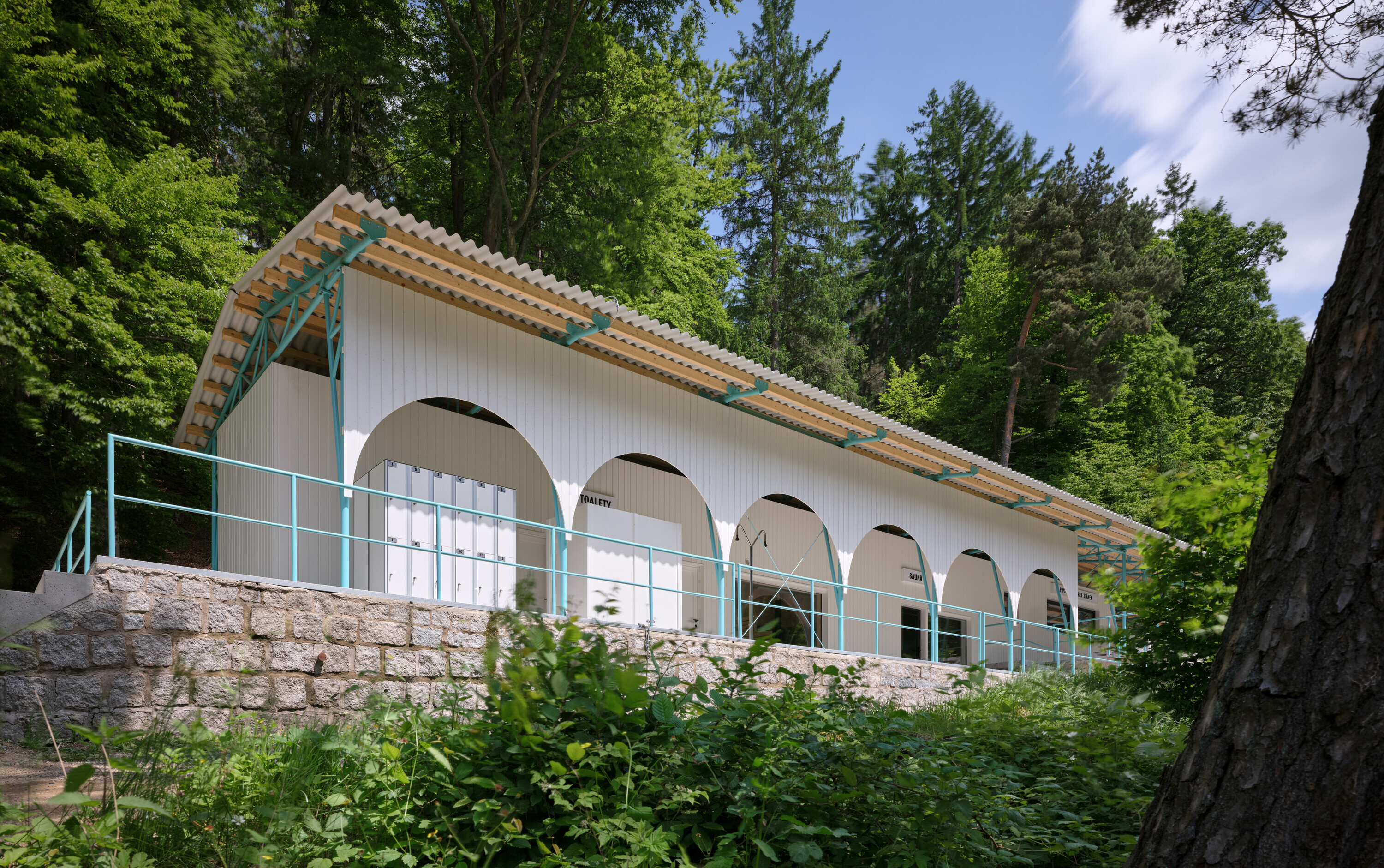 Úsporná drevostavba z CLT panelov a trámovej konštrukcie elegantne kopíruje pôvodnú betónovú dosku. Tyrkysová oceľová konštrukcia zastrešuje šatne, sprchy, saunu i bistro a otvára priestor celoročnému využitiu. Projekt, financovaný kombináciou participatívneho rozpočtu mesta a súkromných darov, ukazuje, že kvalitná verejná stavba môže vzniknúť aj s minimom prostriedkov, pokiaľ za ňou stojí silná občianska iniciatíva.