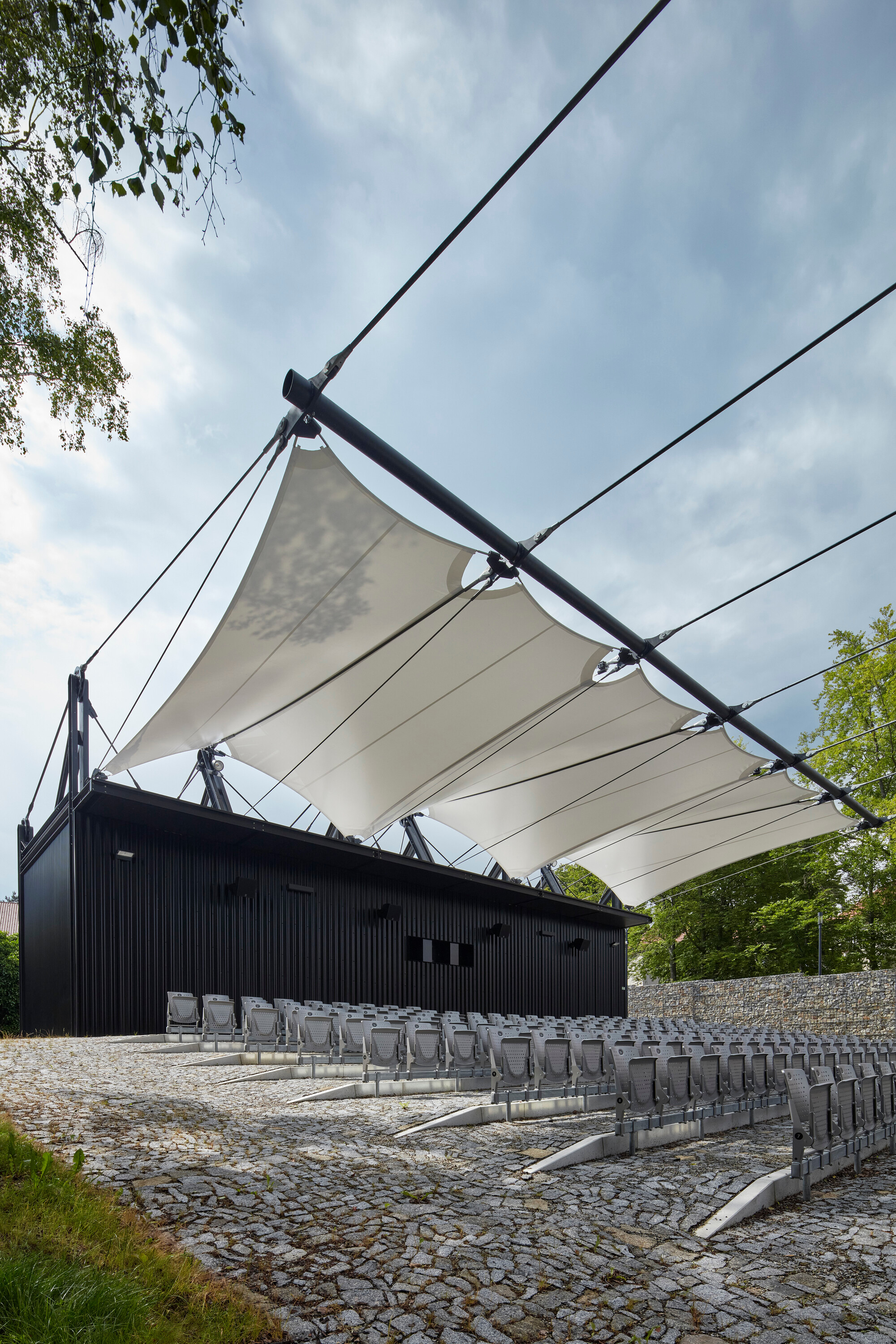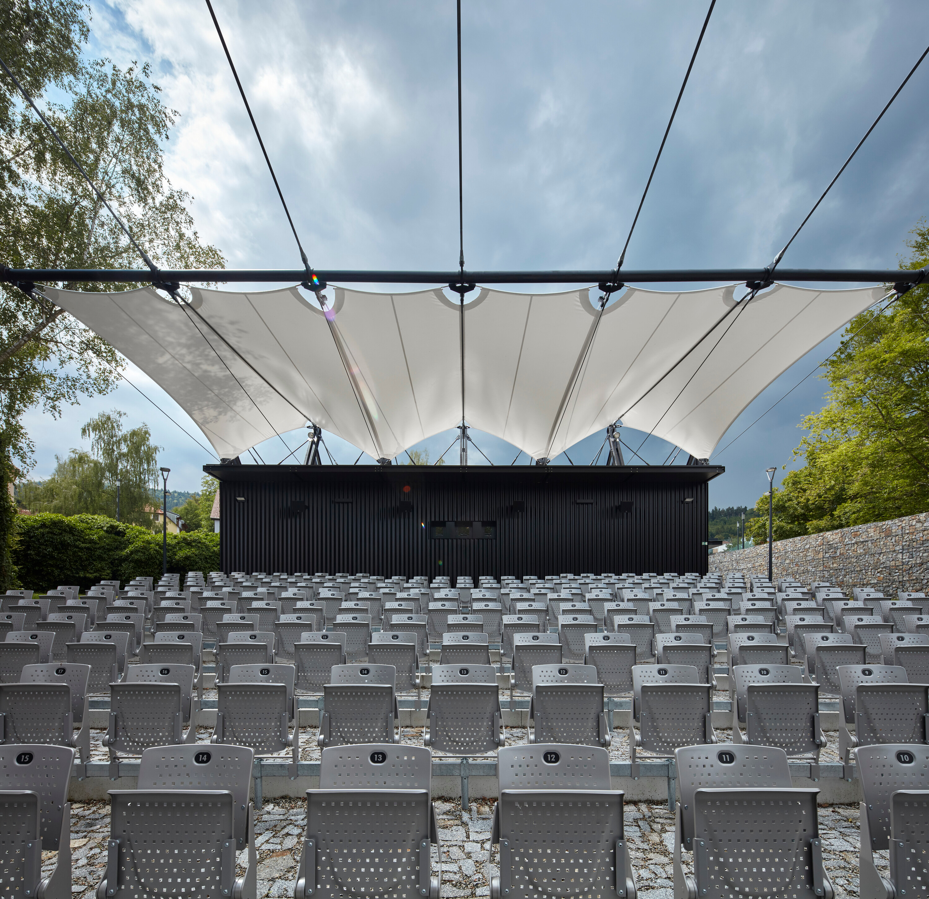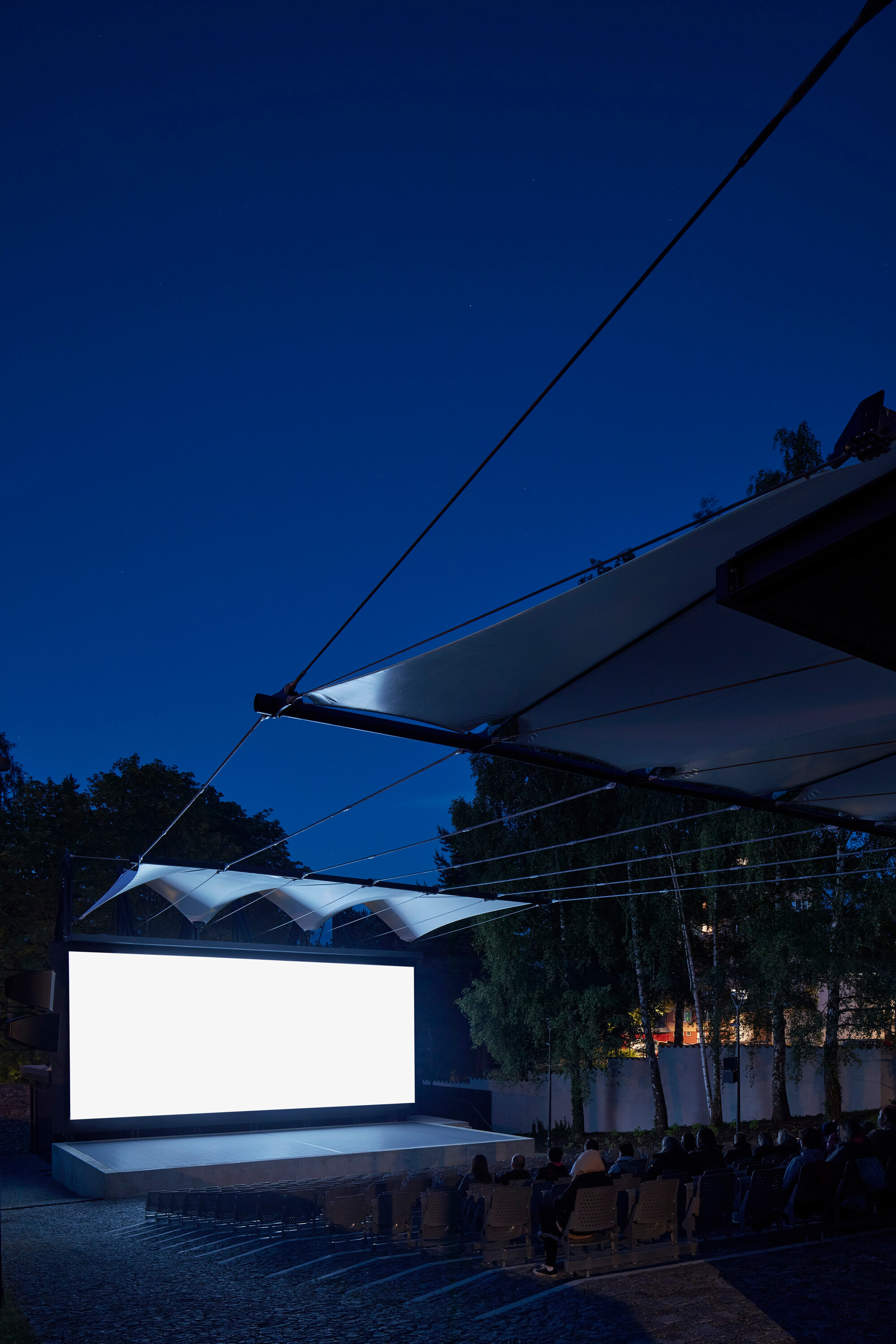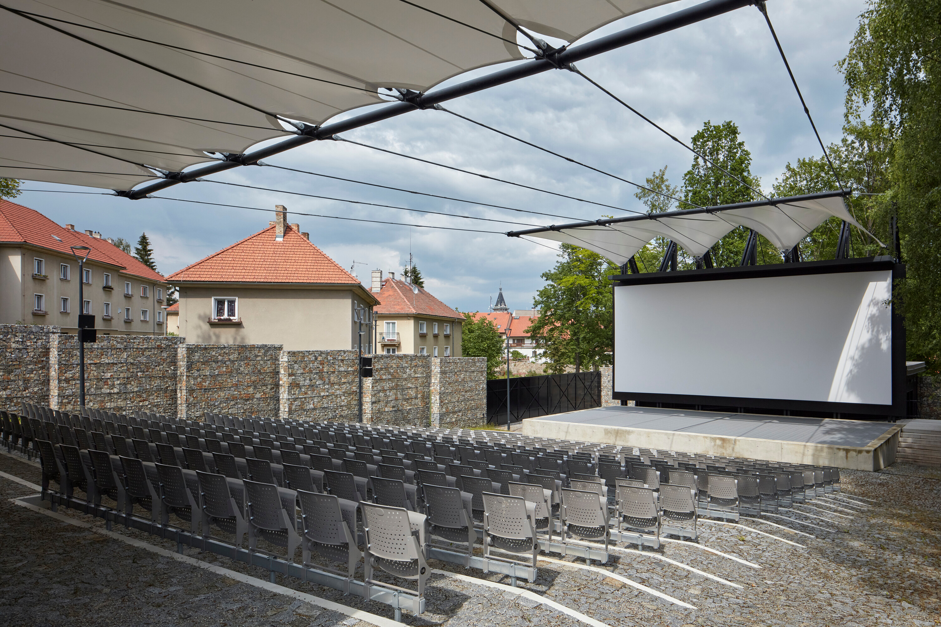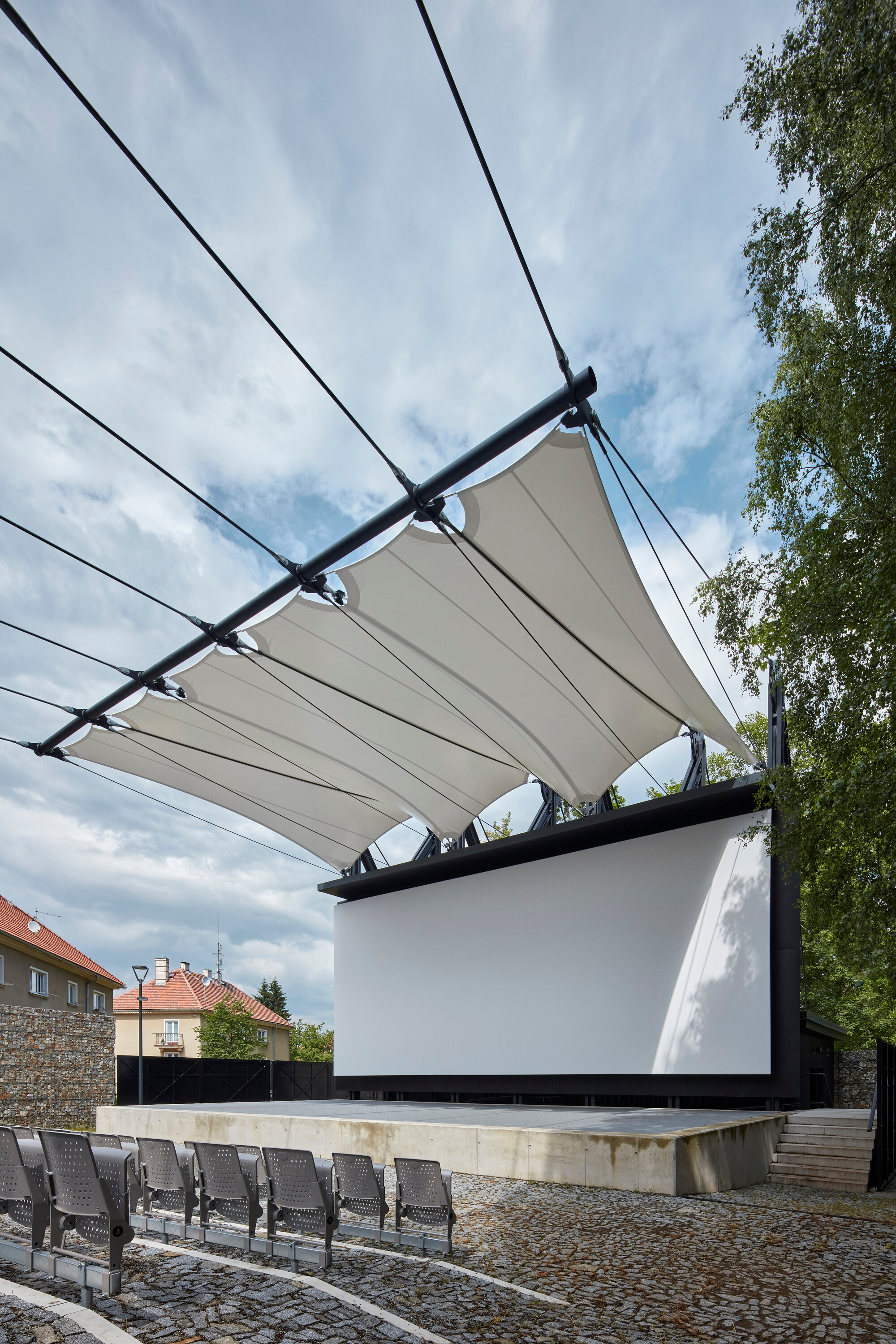 Textilné zastrešenie pódia a časti hľadiska zvyšuje nielen komfort divákov počas slnečných popoludní, alebo daždivých večerov, ale tiež pozitívne prispieva k akustickým parametrom areálu. “Volné nebe na hlavami diváků zůstalo zachováno nad většinou hlediště. Cílem zvoleného systému zastřešení byla maximální lehkost konstrukce s idejí pouhé ´plachty´napnuté mezi objekty kina. Vzhledem k vysoké míře volnosti konstrukce lan a membrány zavěšené v prostoru byly v průběhu projektu a realizace v nezbytně nutné míře doplněny další nosné prvky,” objasňujú architekti.