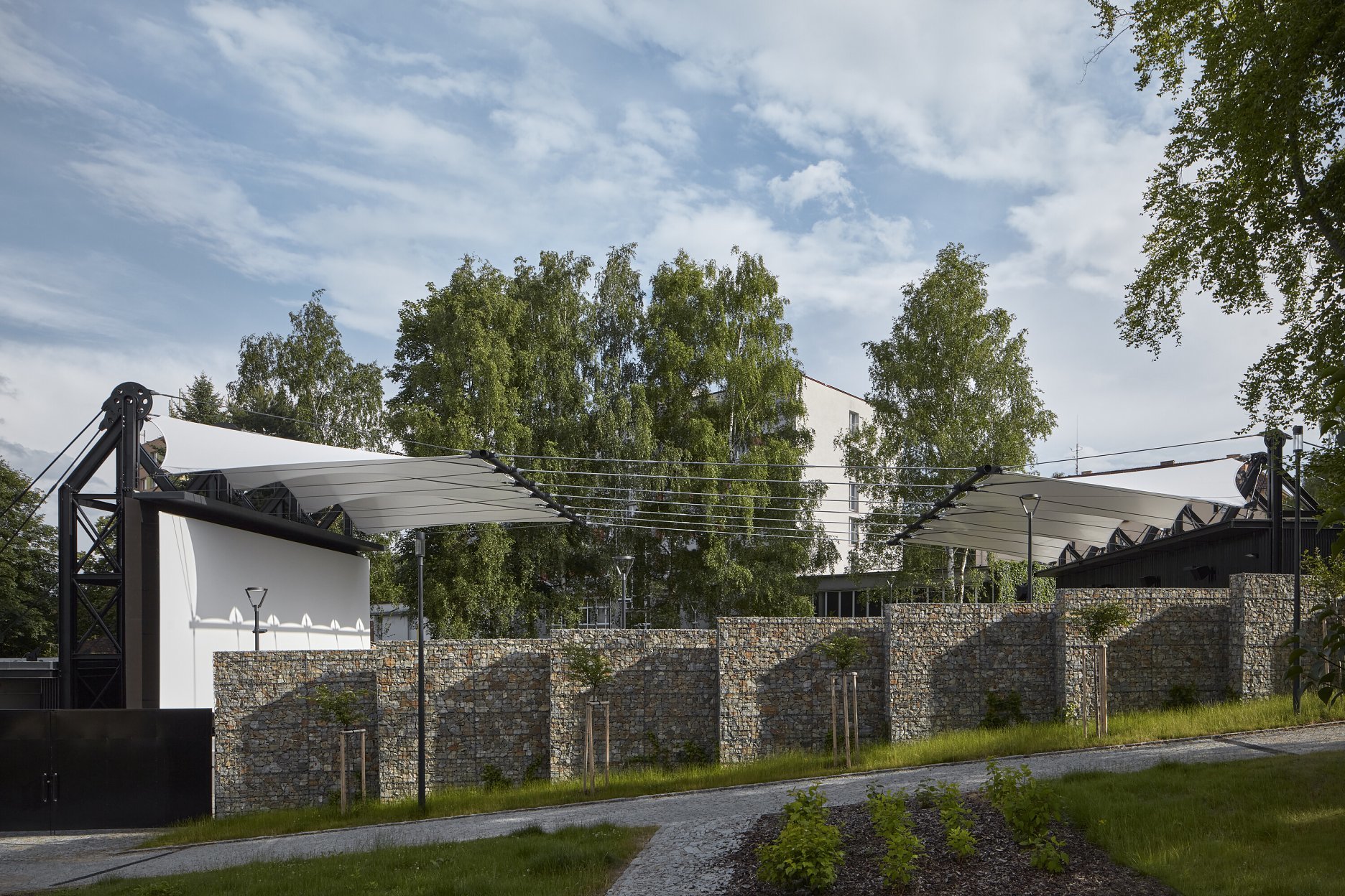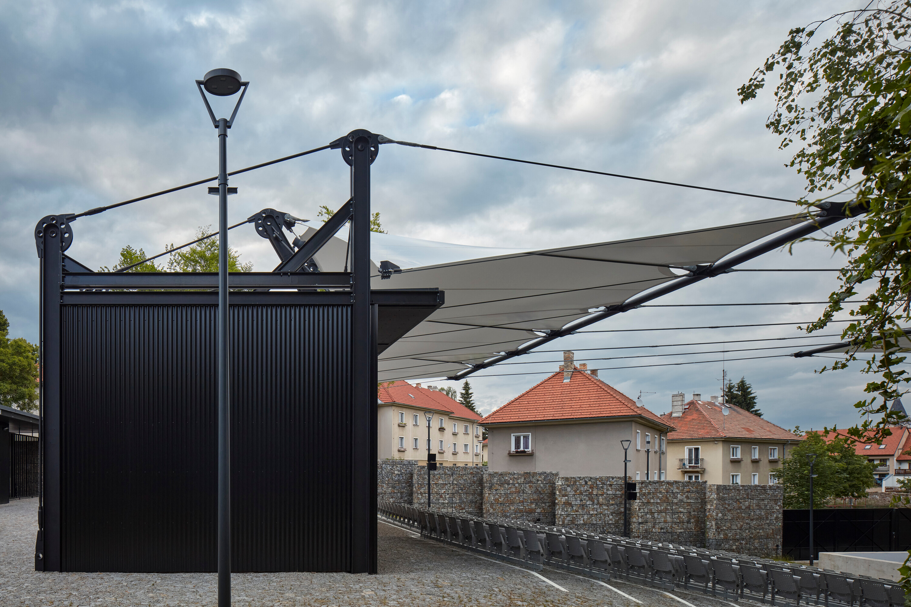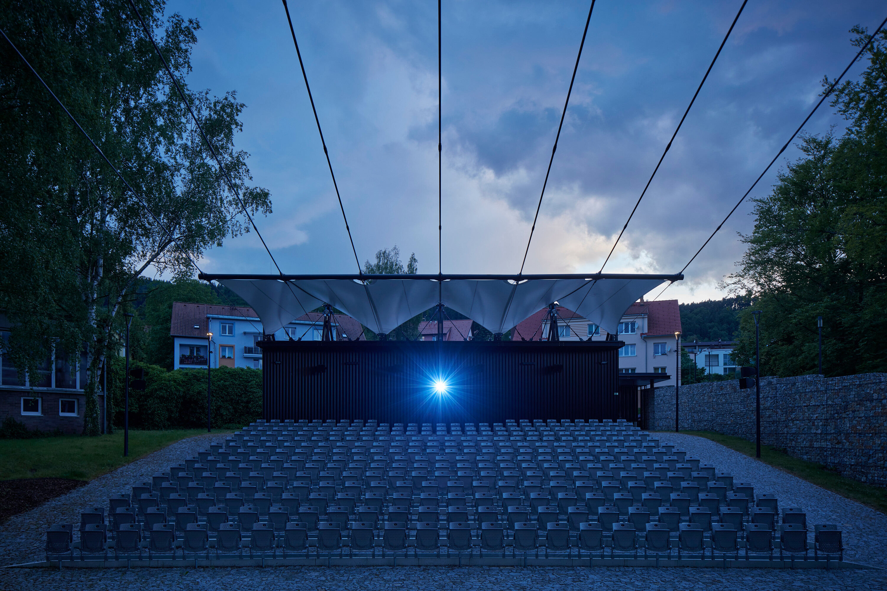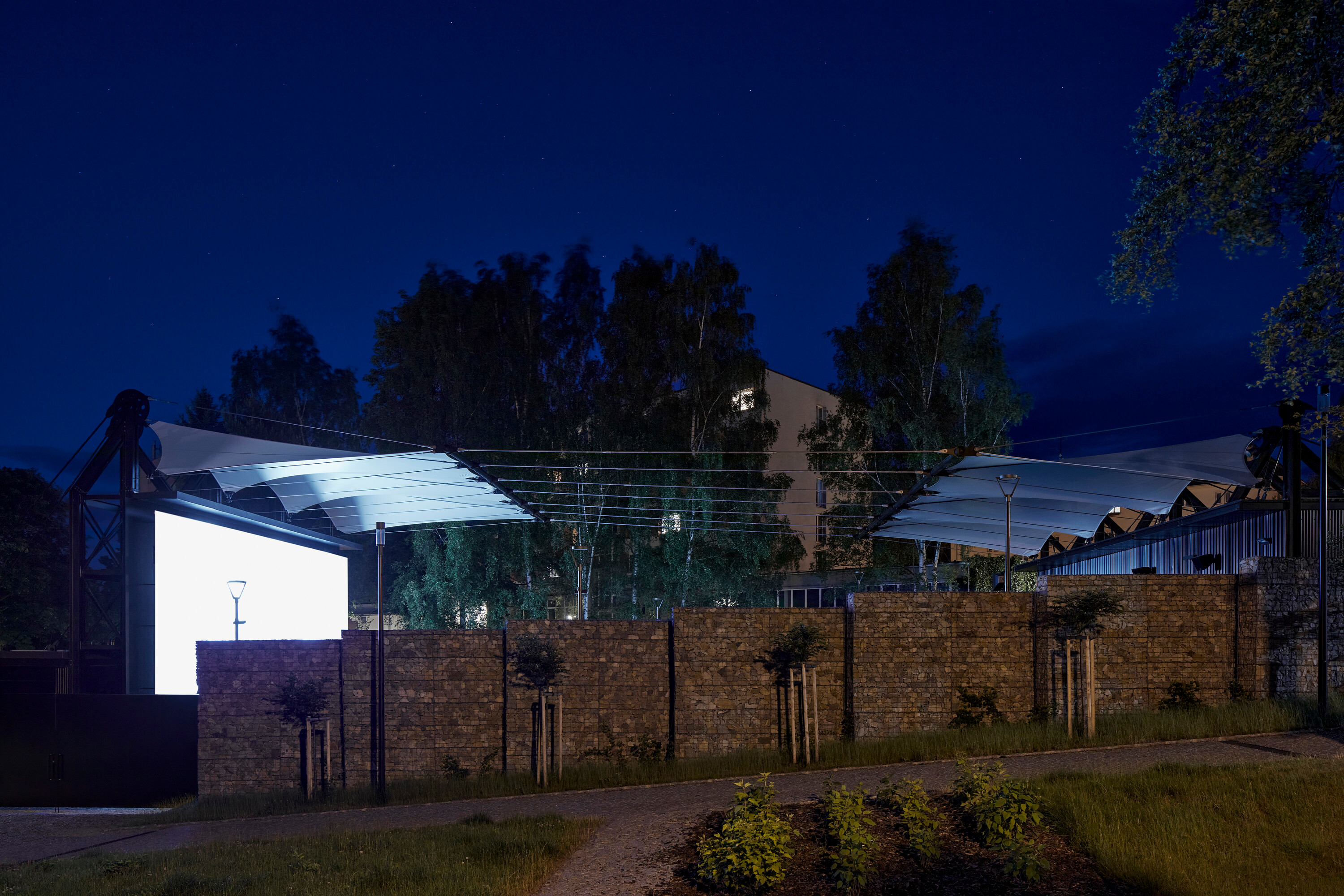 Textilné zastrešenie pódia a časti hľadiska zvyšuje nielen komfort divákov počas slnečných popoludní, alebo daždivých večerov, ale tiež pozitívne prispieva k akustickým parametrom areálu. “Volné nebe na hlavami diváků zůstalo zachováno nad většinou hlediště. Cílem zvoleného systému zastřešení byla maximální lehkost konstrukce s idejí pouhé ´plachty´napnuté mezi objekty kina. Vzhledem k vysoké míře volnosti konstrukce lan a membrány zavěšené v prostoru byly v průběhu projektu a realizace v nezbytně nutné míře doplněny další nosné prvky,” objasňujú architekti.