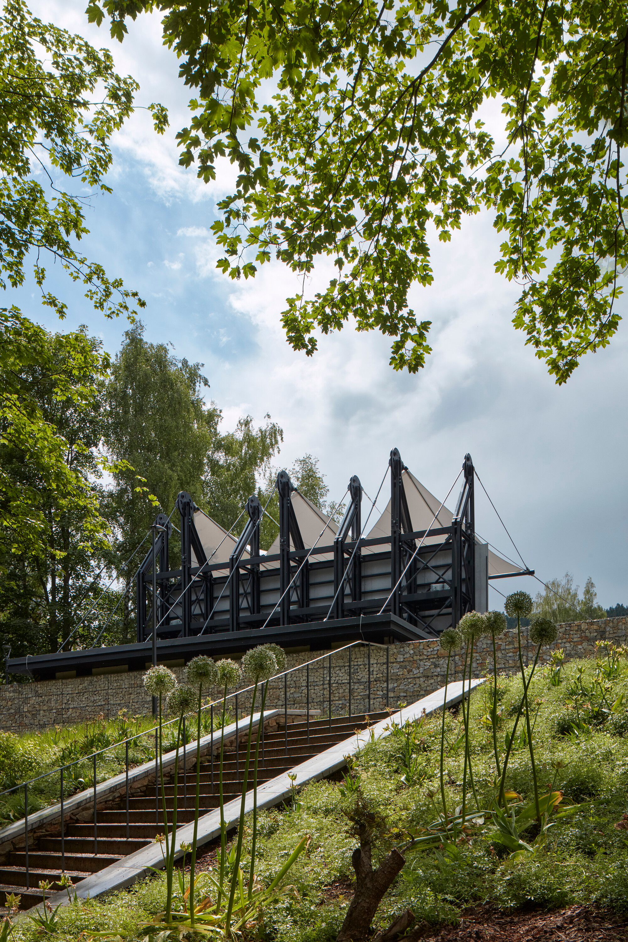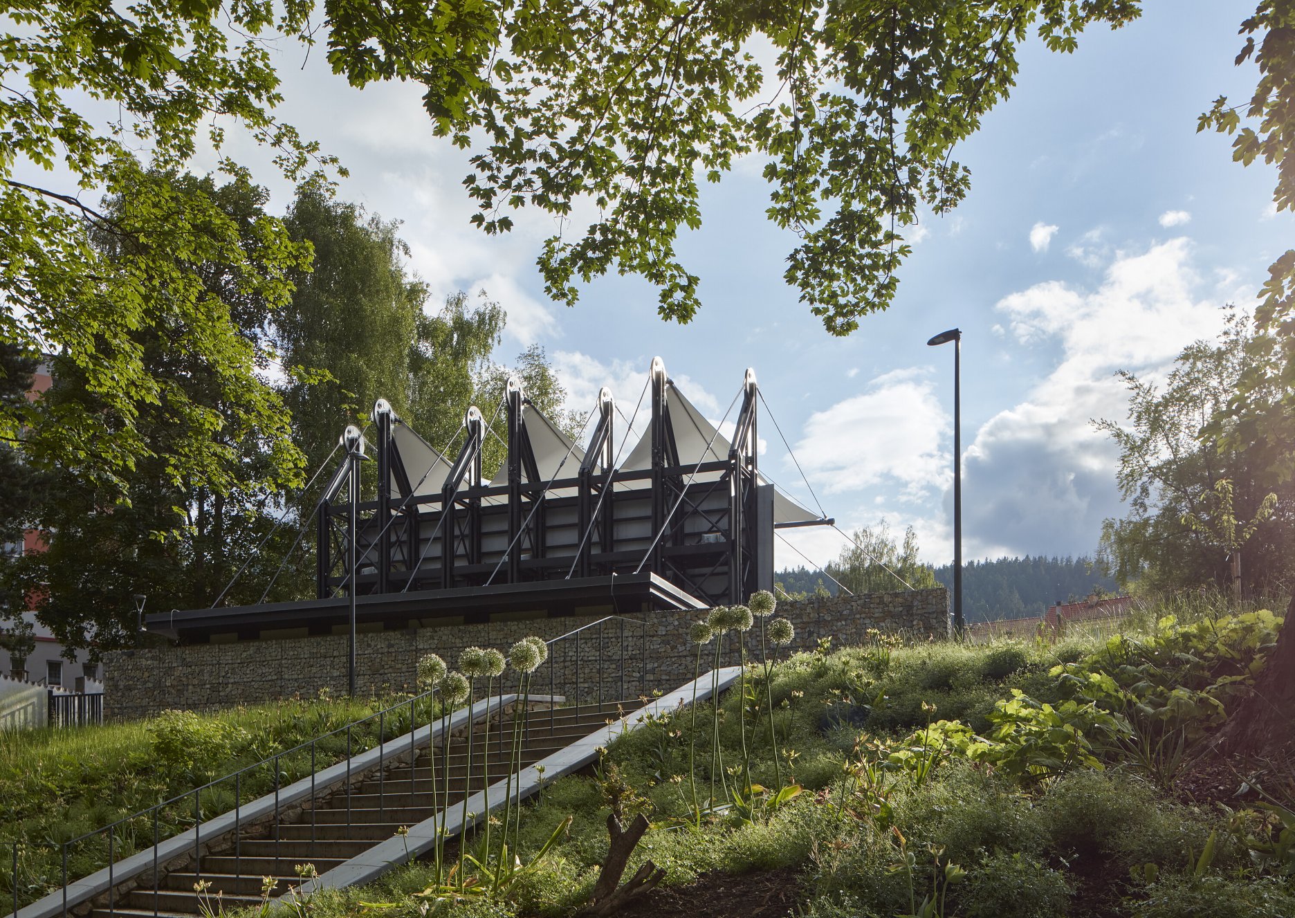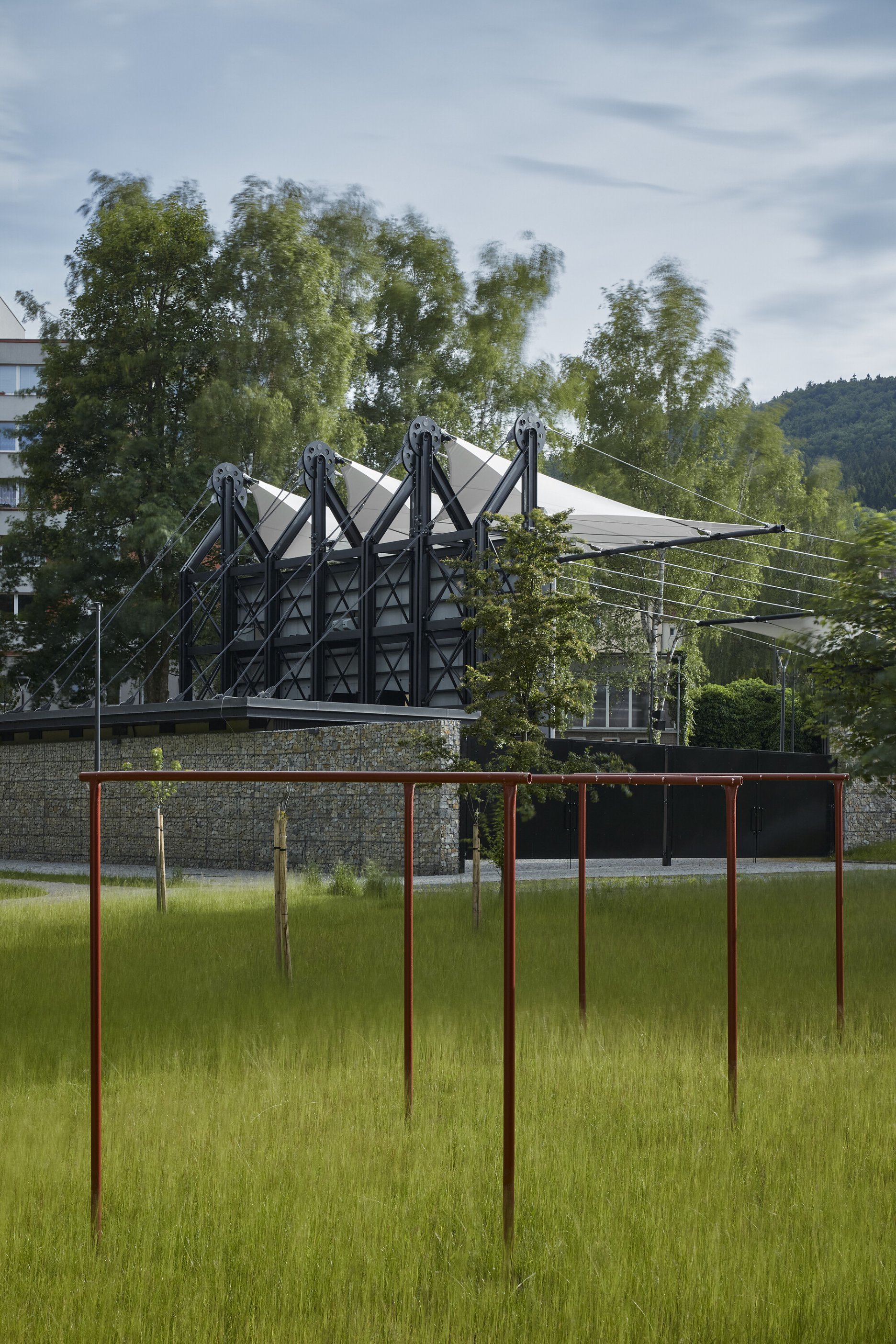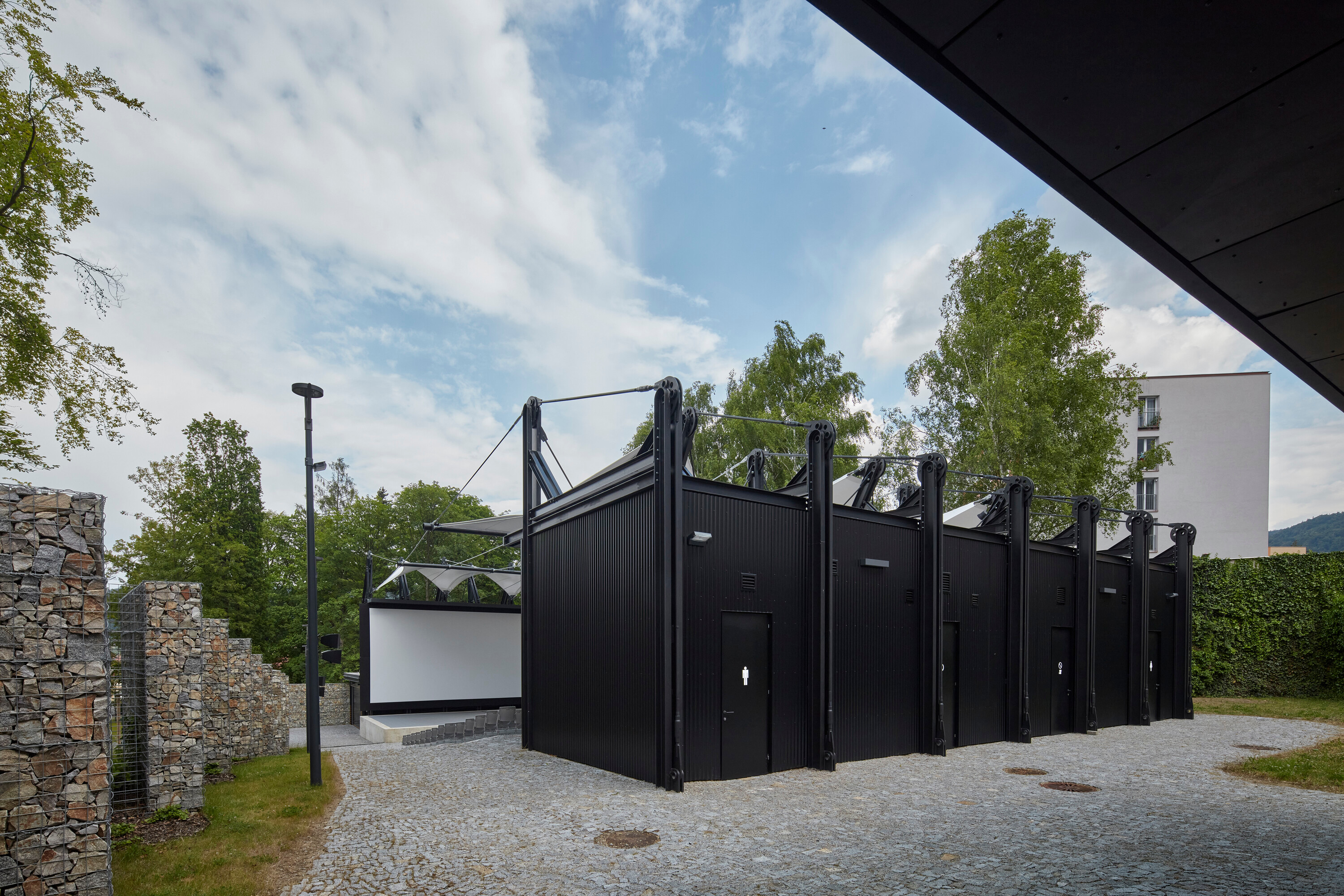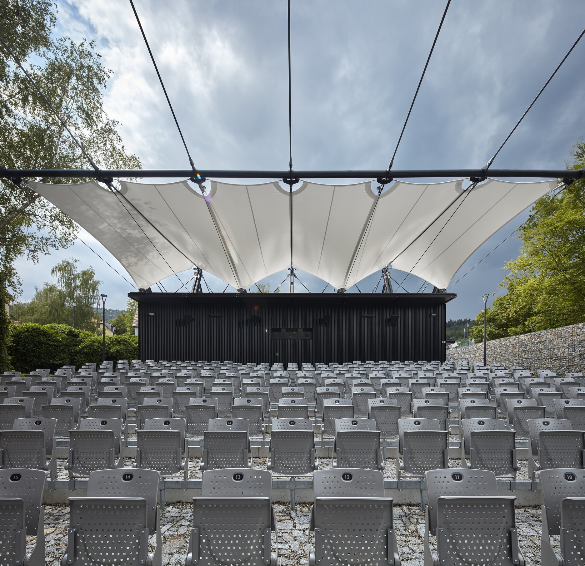 Textilné zastrešenie pódia a časti hľadiska zvyšuje nielen komfort divákov počas slnečných popoludní, alebo daždivých večerov, ale tiež pozitívne prispieva k akustickým parametrom areálu. “Volné nebe na hlavami diváků zůstalo zachováno nad většinou hlediště. Cílem zvoleného systému zastřešení byla maximální lehkost konstrukce s idejí pouhé ´plachty´napnuté mezi objekty kina. Vzhledem k vysoké míře volnosti konstrukce lan a membrány zavěšené v prostoru byly v průběhu projektu a realizace v nezbytně nutné míře doplněny další nosné prvky,” objasňujú architekti.