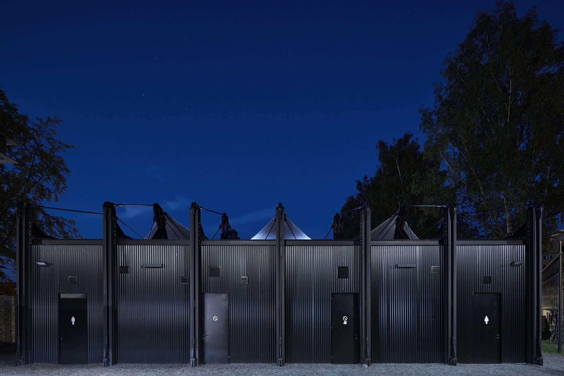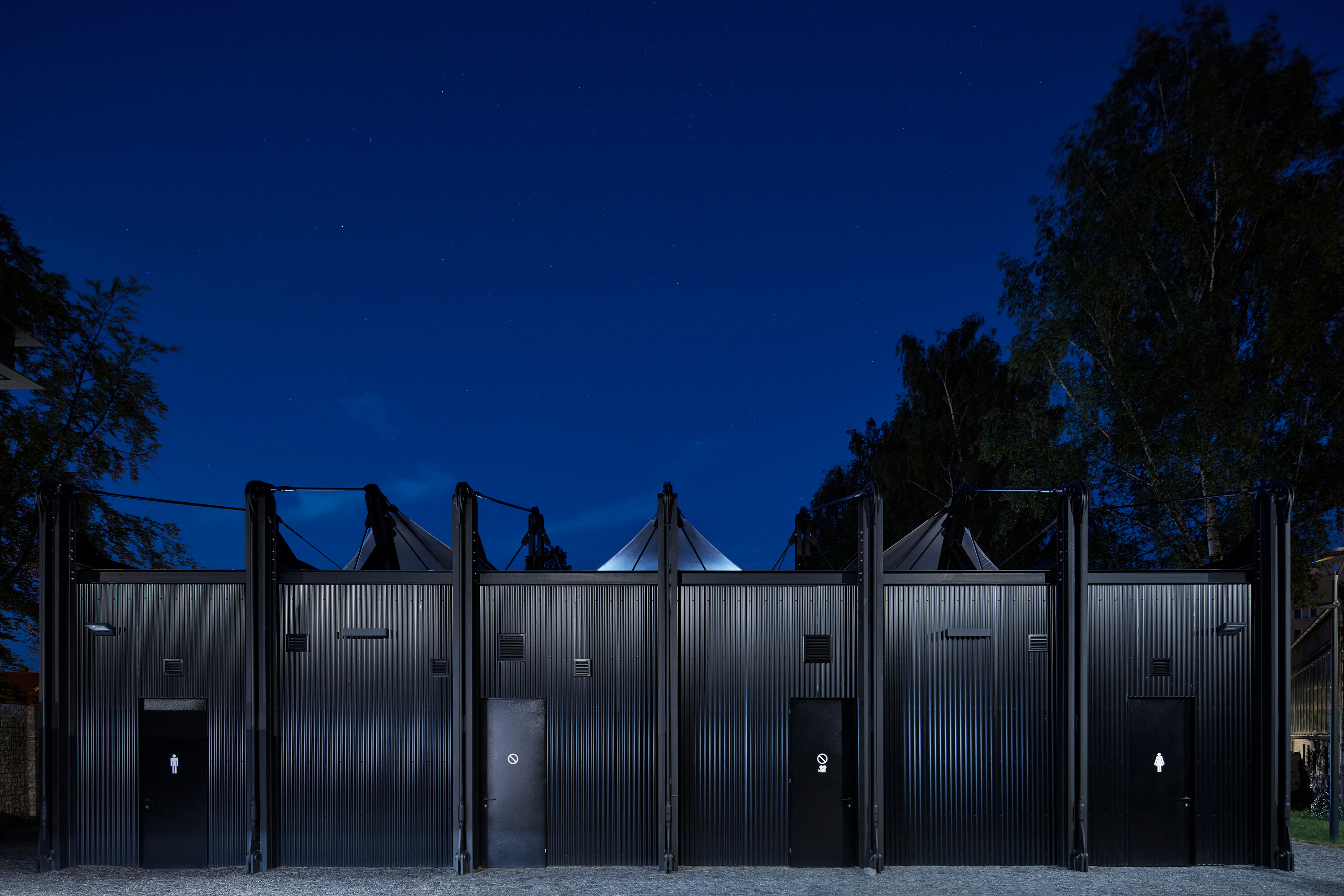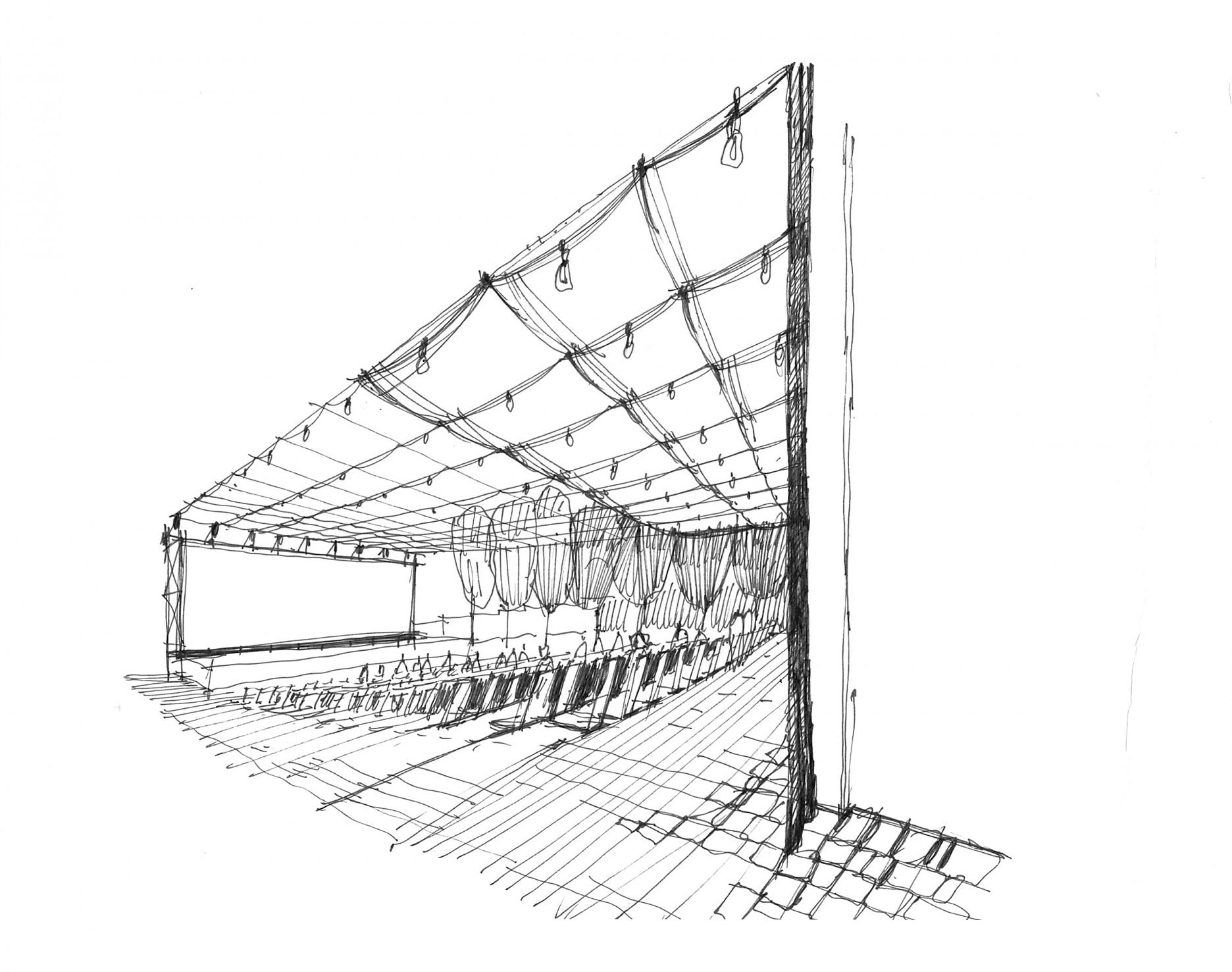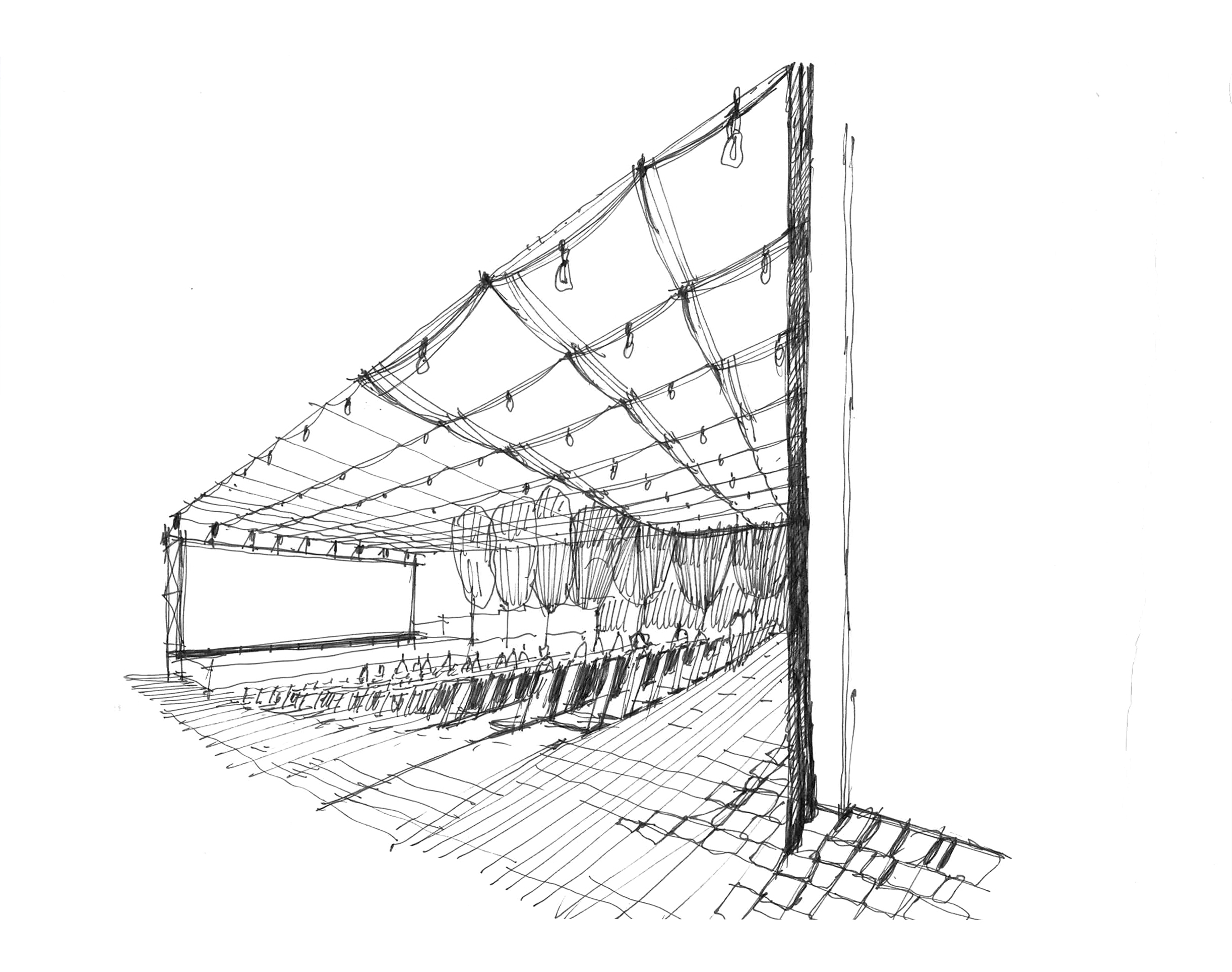 Textilné zastrešenie pódia a časti hľadiska zvyšuje nielen komfort divákov počas slnečných popoludní, alebo daždivých večerov, ale tiež pozitívne prispieva k akustickým parametrom areálu. “Volné nebe na hlavami diváků zůstalo zachováno nad většinou hlediště. Cílem zvoleného systému zastřešení byla maximální lehkost konstrukce s idejí pouhé ´plachty´napnuté mezi objekty kina. Vzhledem k vysoké míře volnosti konstrukce lan a membrány zavěšené v prostoru byly v průběhu projektu a realizace v nezbytně nutné míře doplněny další nosné prvky,” objasňujú architekti.