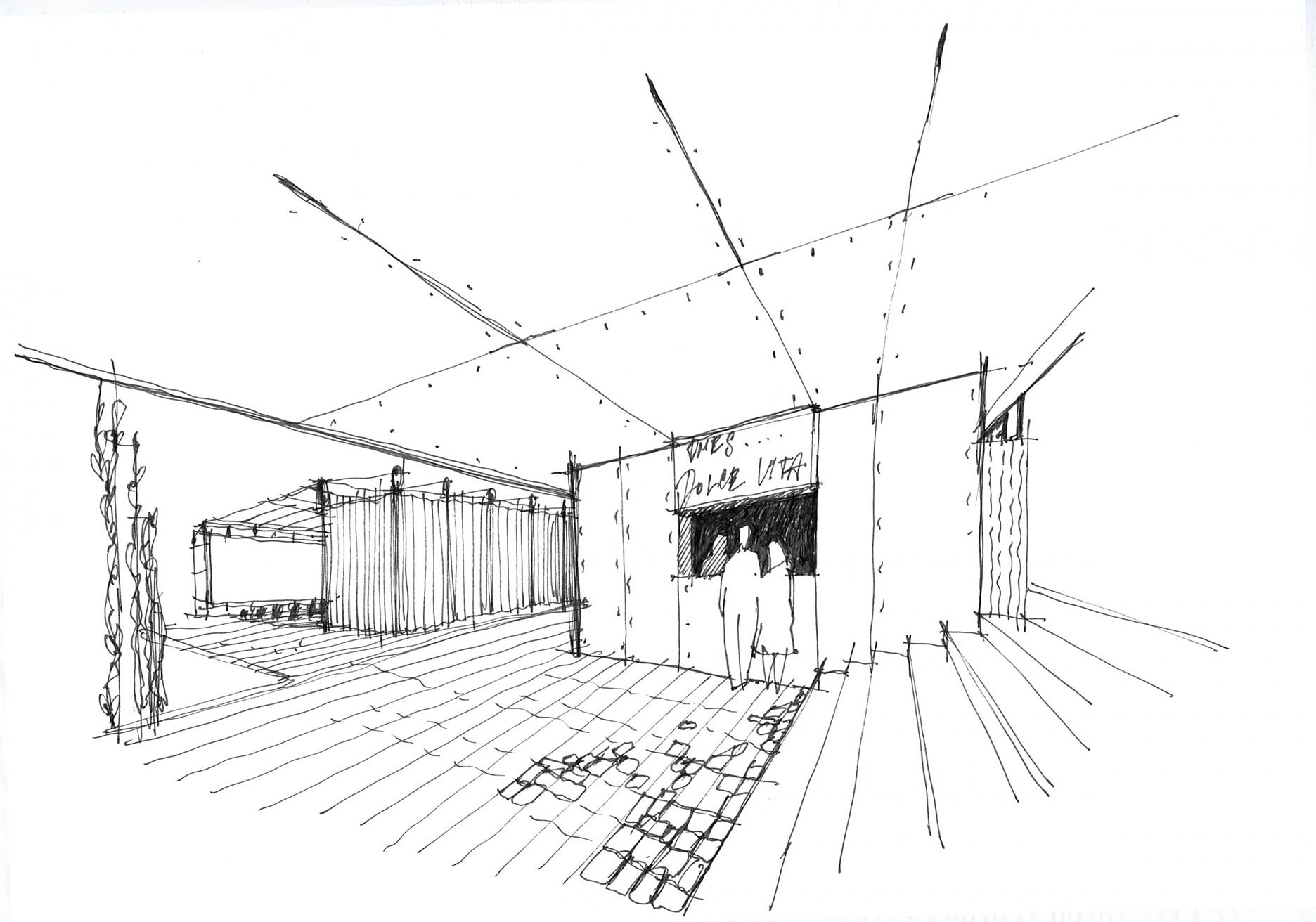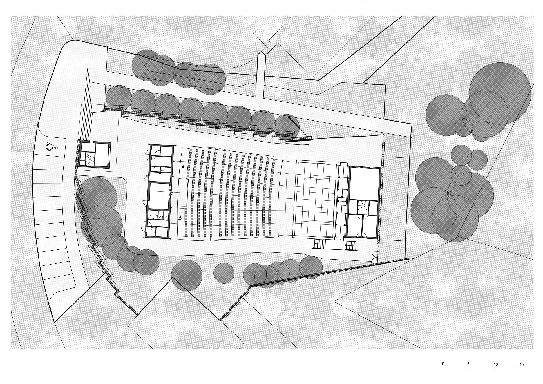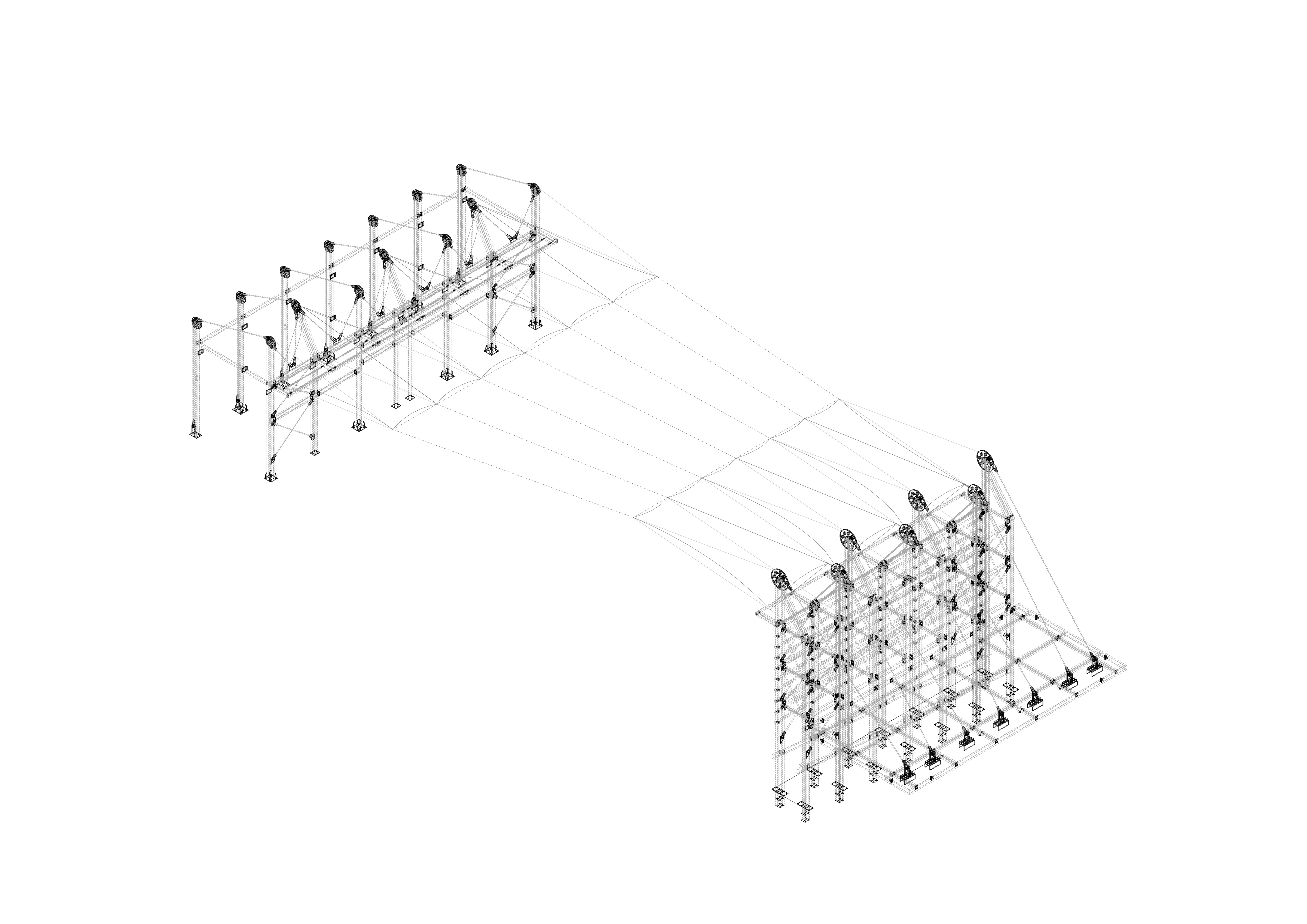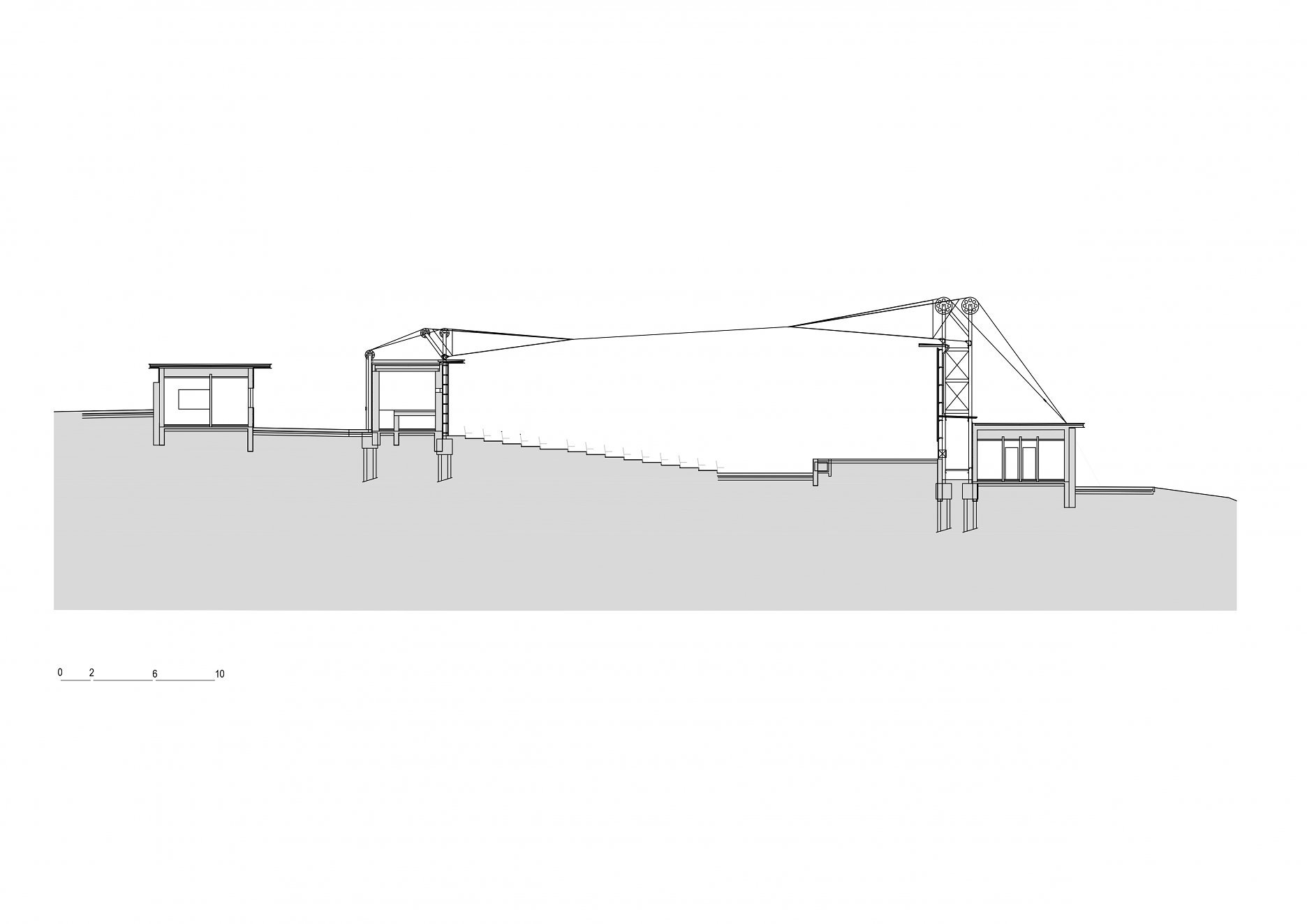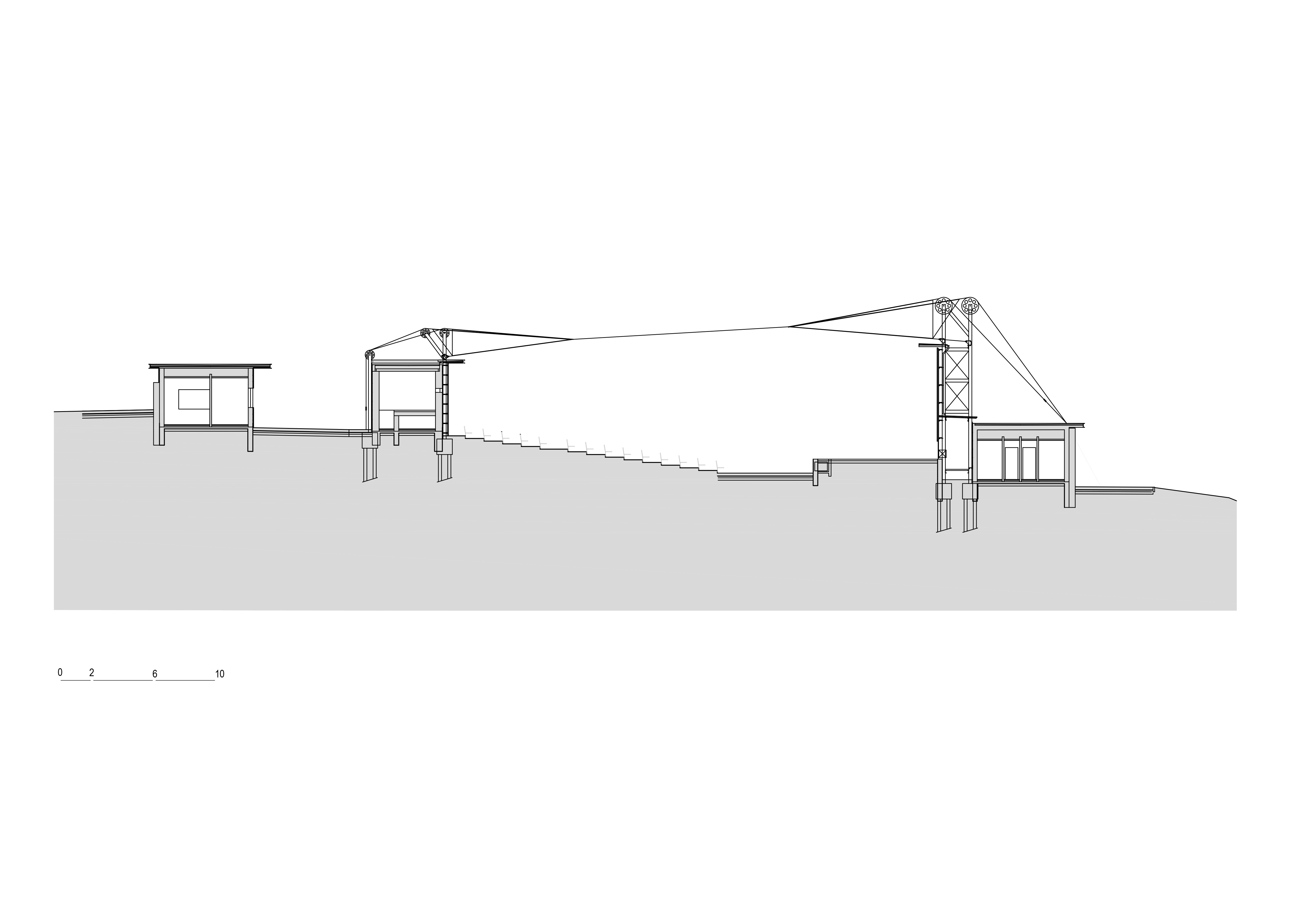 Textilné zastrešenie pódia a časti hľadiska zvyšuje nielen komfort divákov počas slnečných popoludní, alebo daždivých večerov, ale tiež pozitívne prispieva k akustickým parametrom areálu. “Volné nebe na hlavami diváků zůstalo zachováno nad většinou hlediště. Cílem zvoleného systému zastřešení byla maximální lehkost konstrukce s idejí pouhé ´plachty´napnuté mezi objekty kina. Vzhledem k vysoké míře volnosti konstrukce lan a membrány zavěšené v prostoru byly v průběhu projektu a realizace v nezbytně nutné míře doplněny další nosné prvky,” objasňujú architekti.
