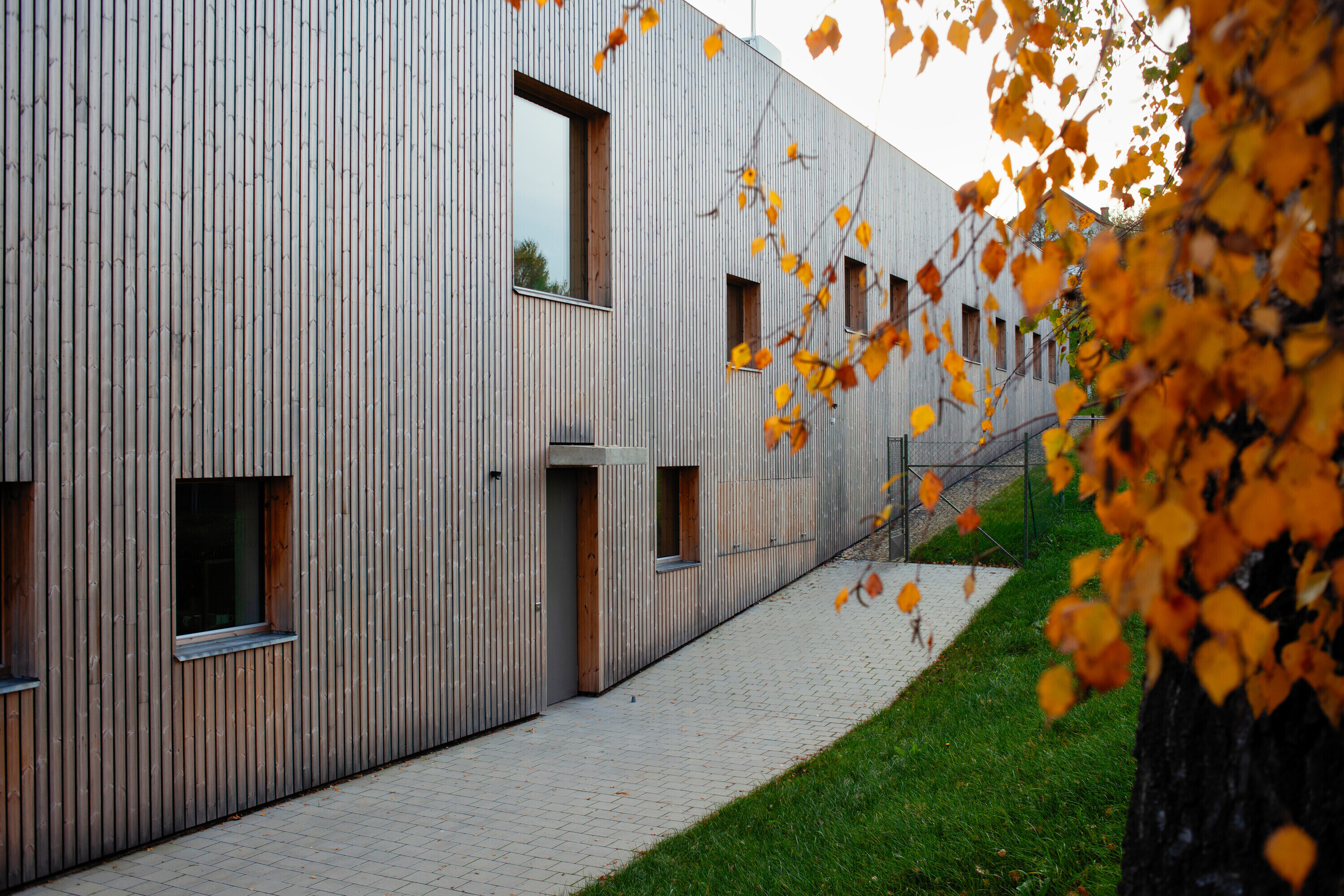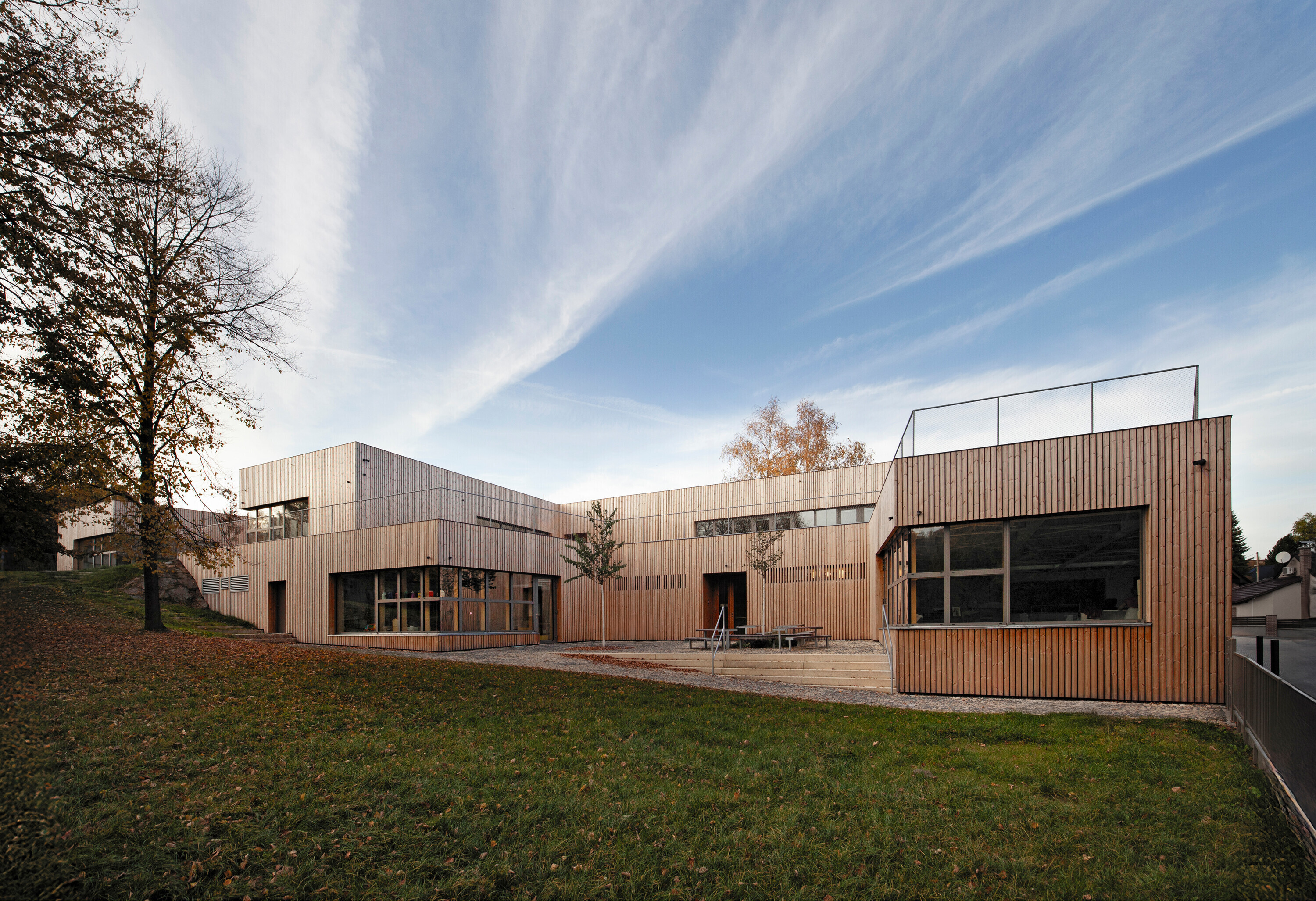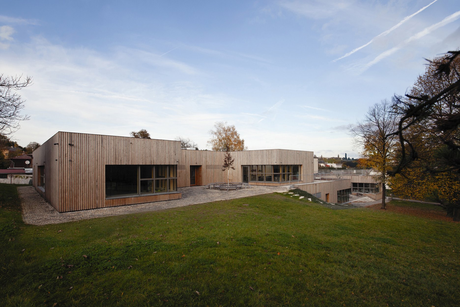 Budova v mestskej pamiatkovej zóne zapadá do miestnej prírodnej scenérie. Rešpektuje terén a necháva divokú a prirodzenú záhradu prehľadne pred sebou. K splynutiu stavby s okolím prispieva fasádny obklad z tepelne upraveného borovicového dreva. Do kompaktnej hmoty z južnej strany vstupujú dve átriá, ktoré vo svojej polohe kopírujú terén. Dvojpodlažné riešenie umožňuje priamy kontakt každej triedy so zeleňou.