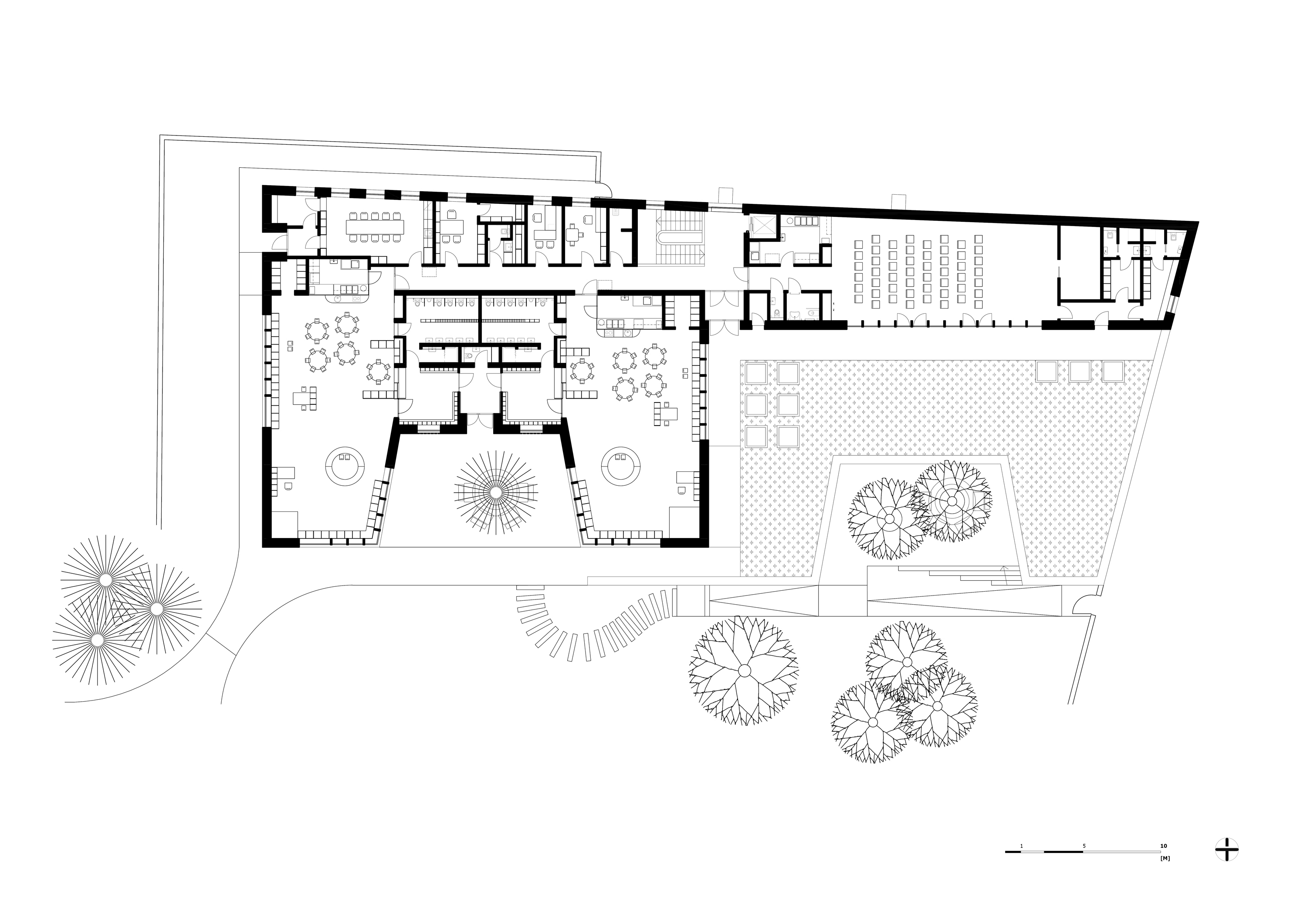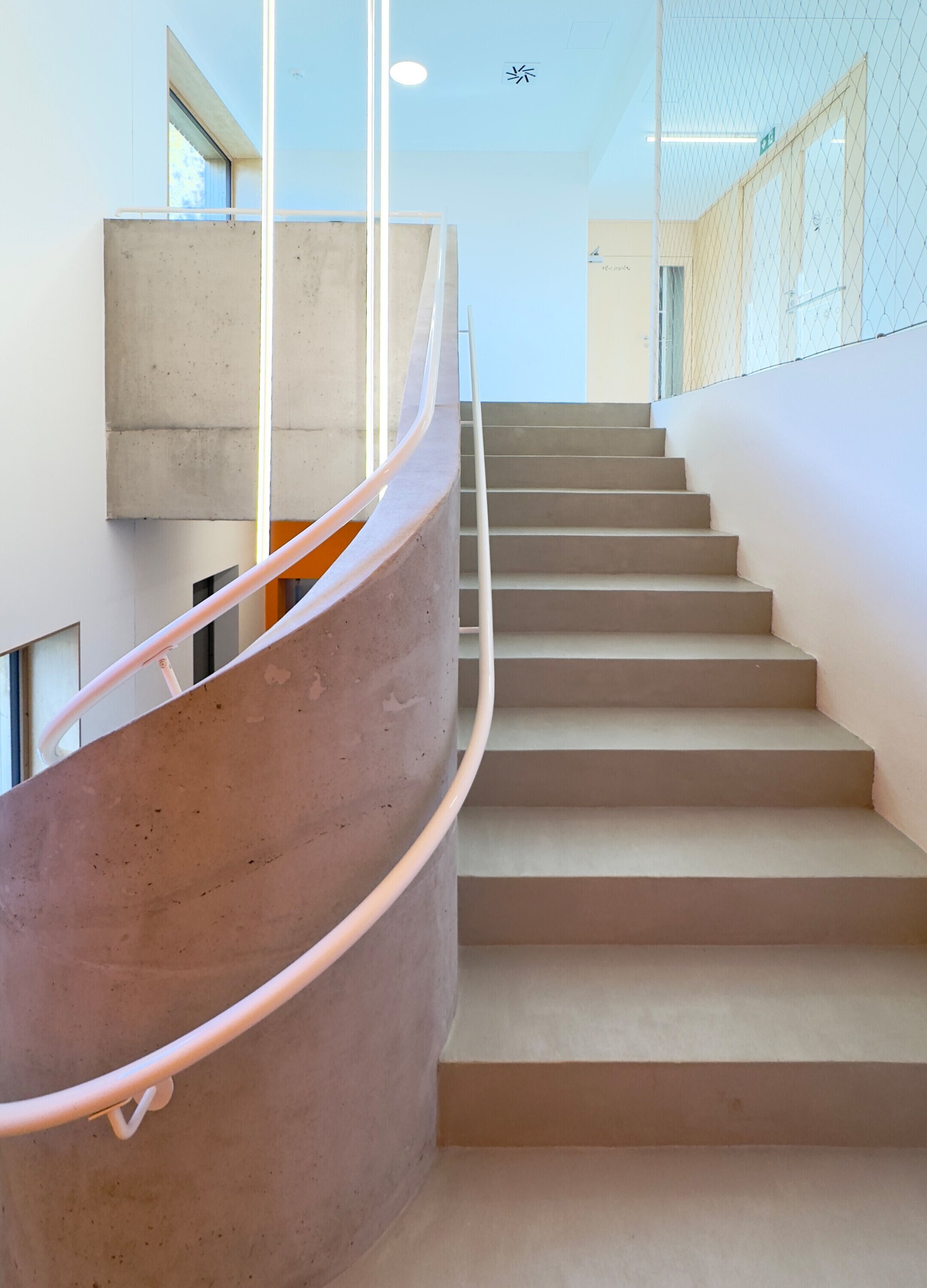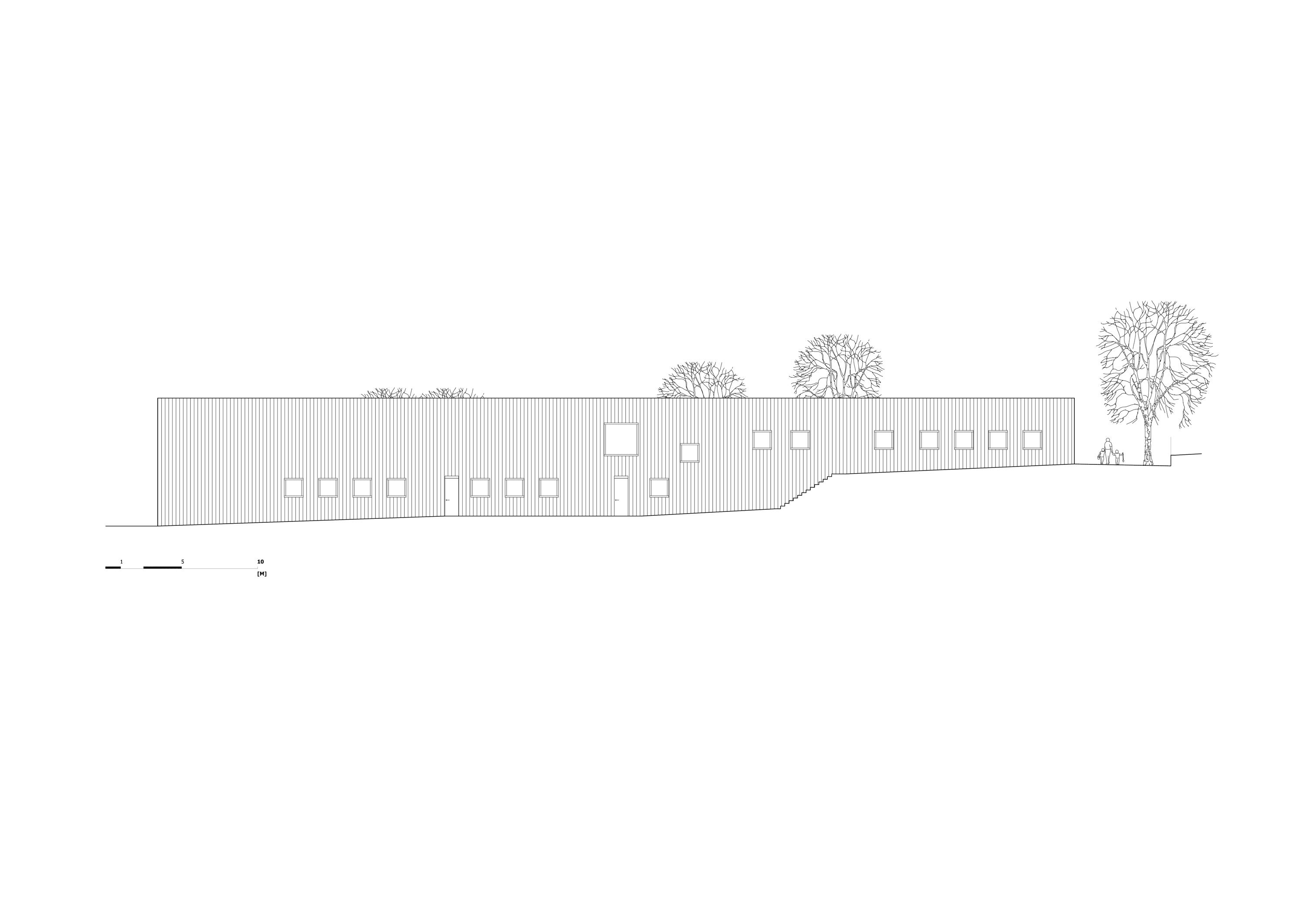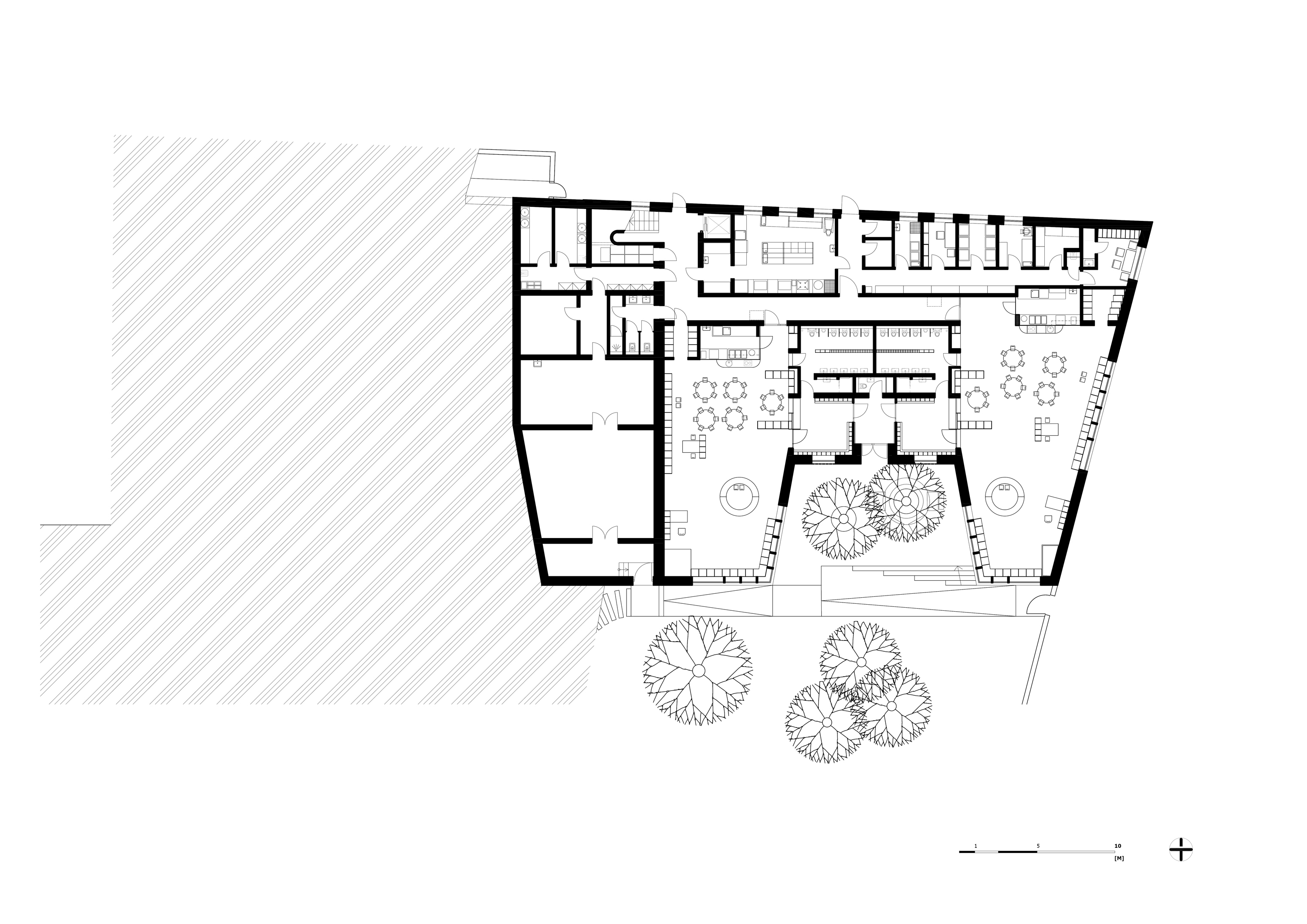 Budova v mestskej pamiatkovej zóne zapadá do miestnej prírodnej scenérie. Rešpektuje terén a necháva divokú a prirodzenú záhradu prehľadne pred sebou. K splynutiu stavby s okolím prispieva fasádny obklad z tepelne upraveného borovicového dreva. Do kompaktnej hmoty z južnej strany vstupujú dve átriá, ktoré vo svojej polohe kopírujú terén. Dvojpodlažné riešenie umožňuje priamy kontakt každej triedy so zeleňou.