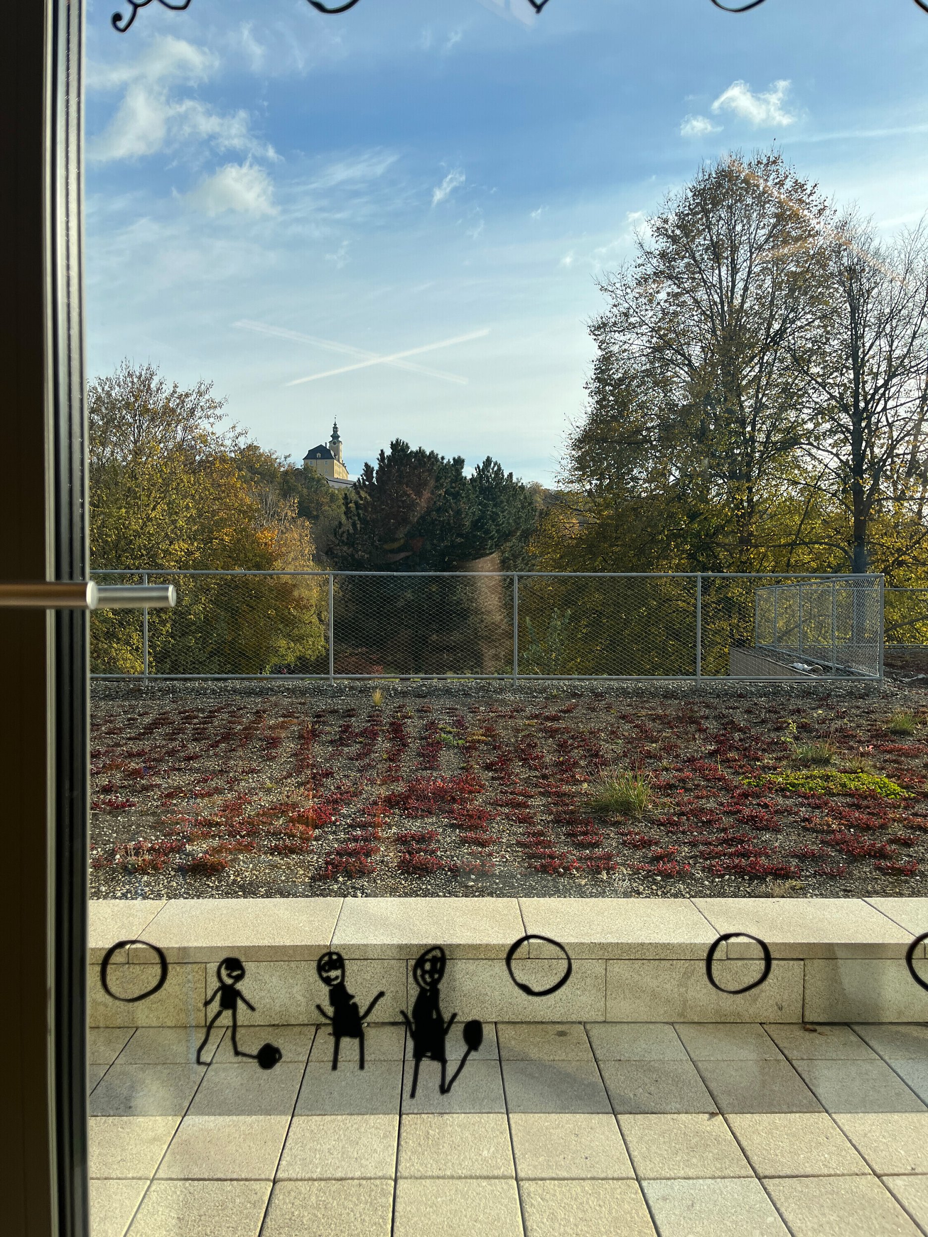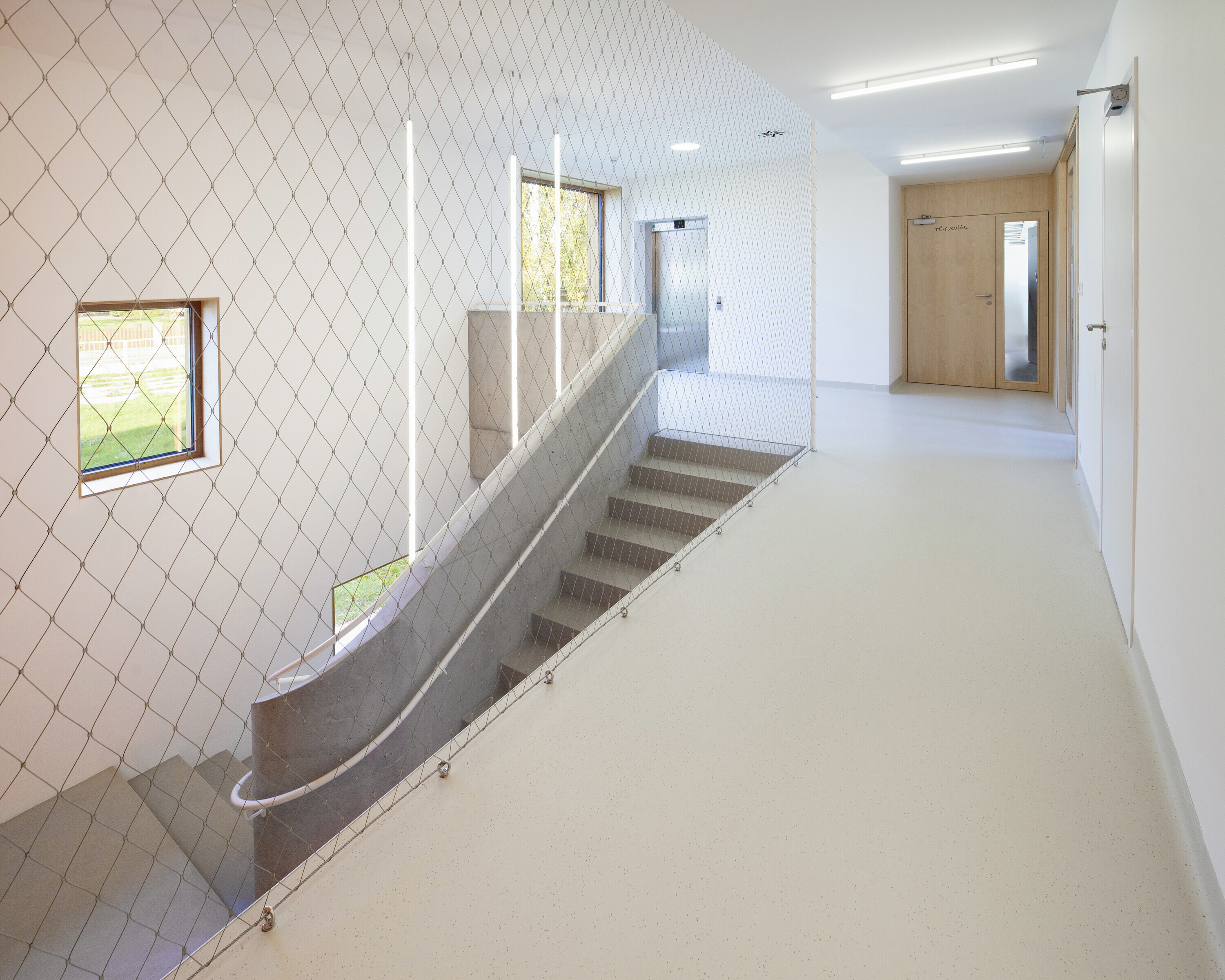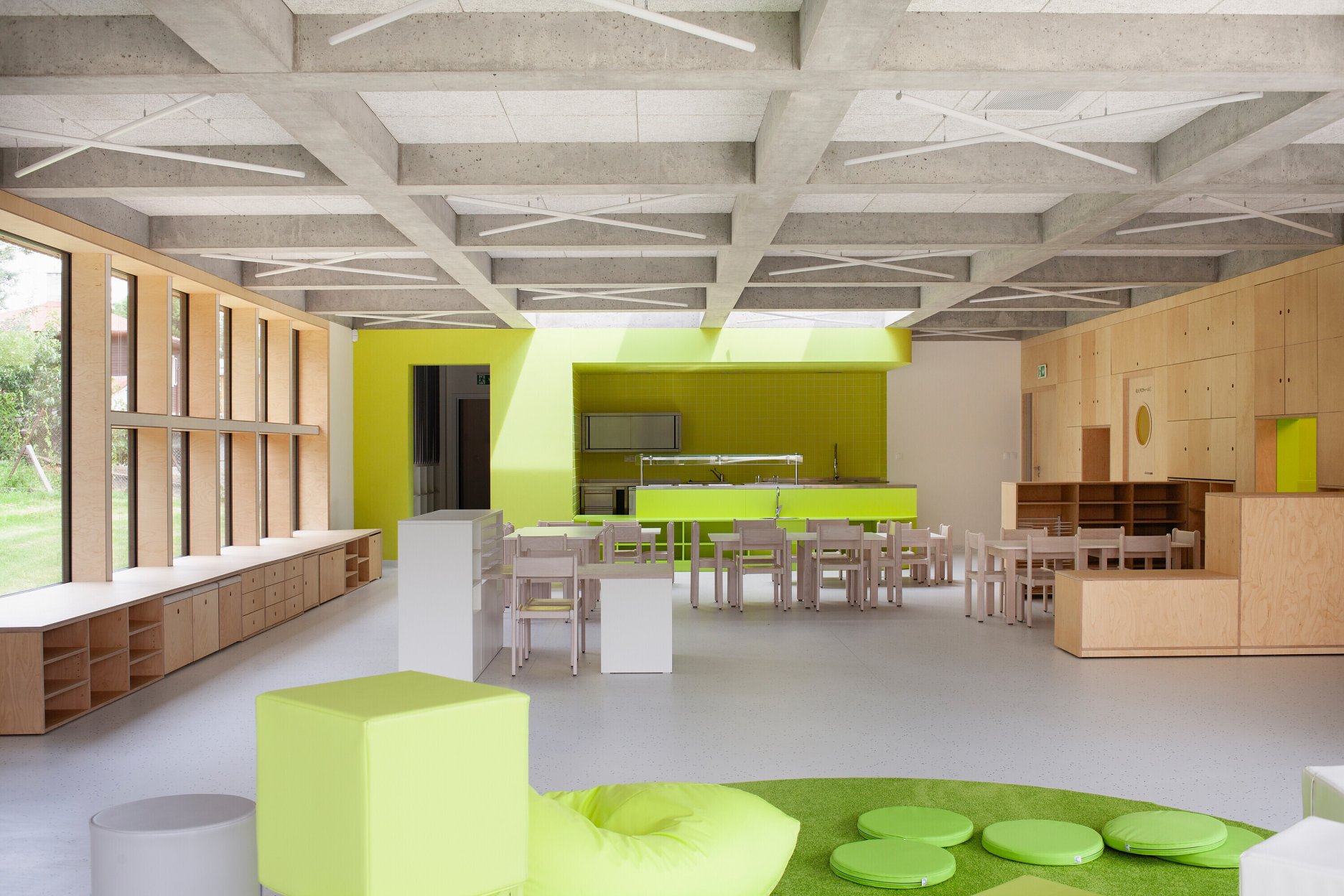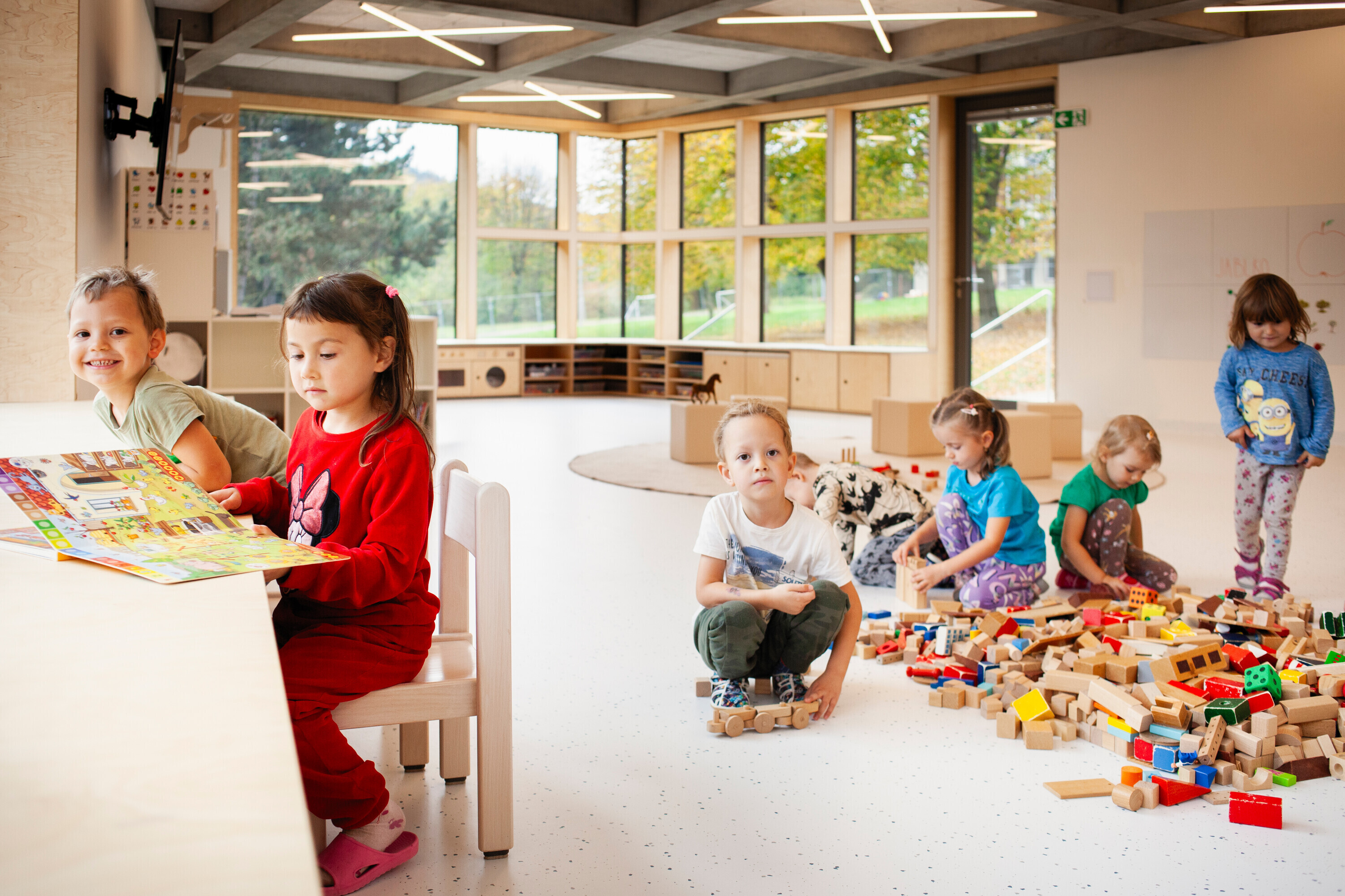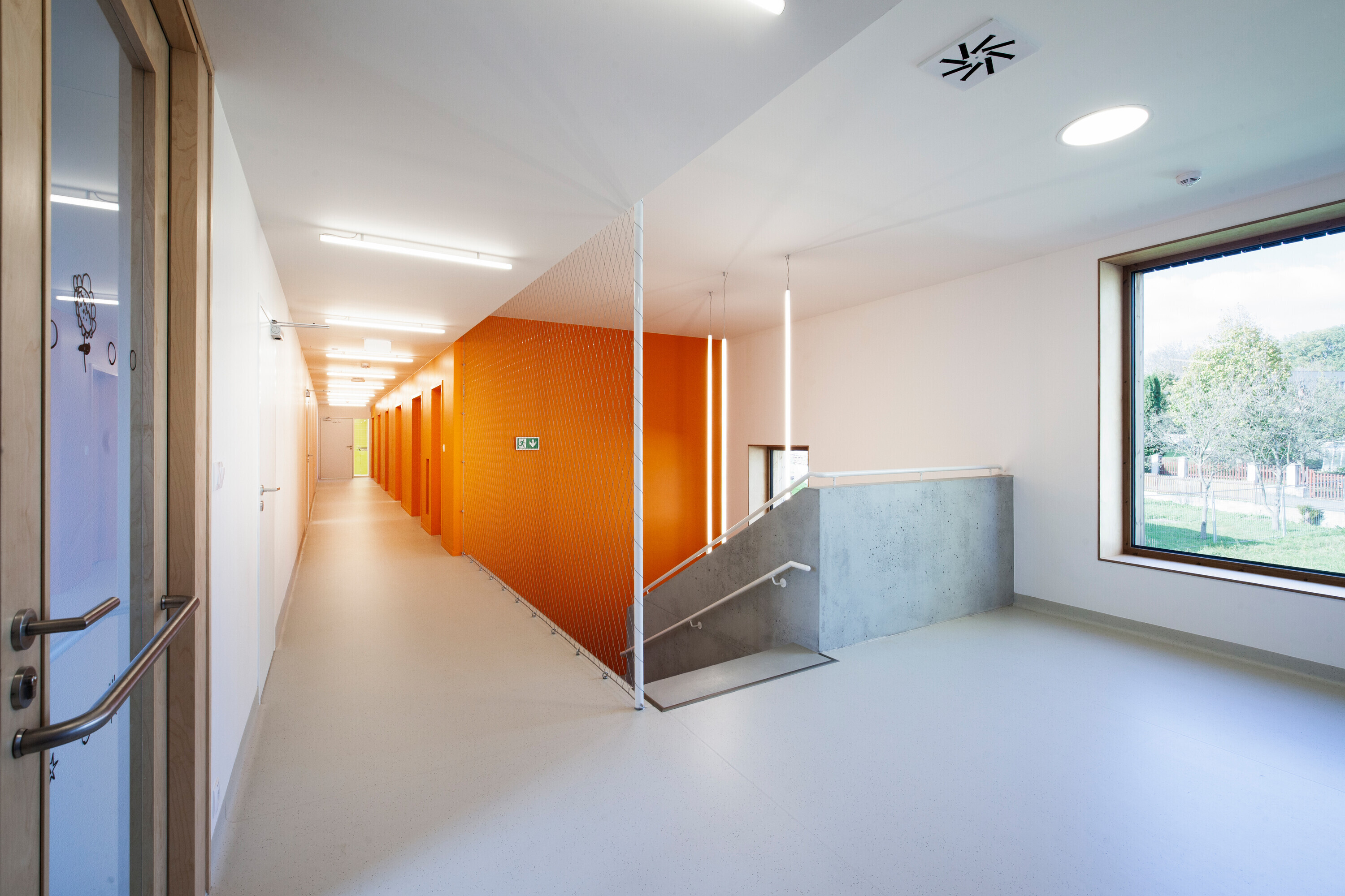 Prevádzka je v pozdĺžnom smere členená na priestor pre deti a obslužné funkcie. Priestory škôlky vzájomne spája chodba a centrálna schodisková hala. Štvorica tried na prízemí je radená do párov so spoločnými átriami – vonkajšími triedami, ktoré zároveň tvoria vstupné predpolie týchto buniek. Cez spoločné zádverie, vizuálne prepojené s triedami, smerujú kroky detí do „svojej“ šatne. Rozmerná miestnosť na poschodí slúži deťom na cvičenie a besiedky. Krásny výhľad na historické centrum a zámok možno umocniť otvorením dverí a vstupom na terasu s extenzívnou zelenou strechou.