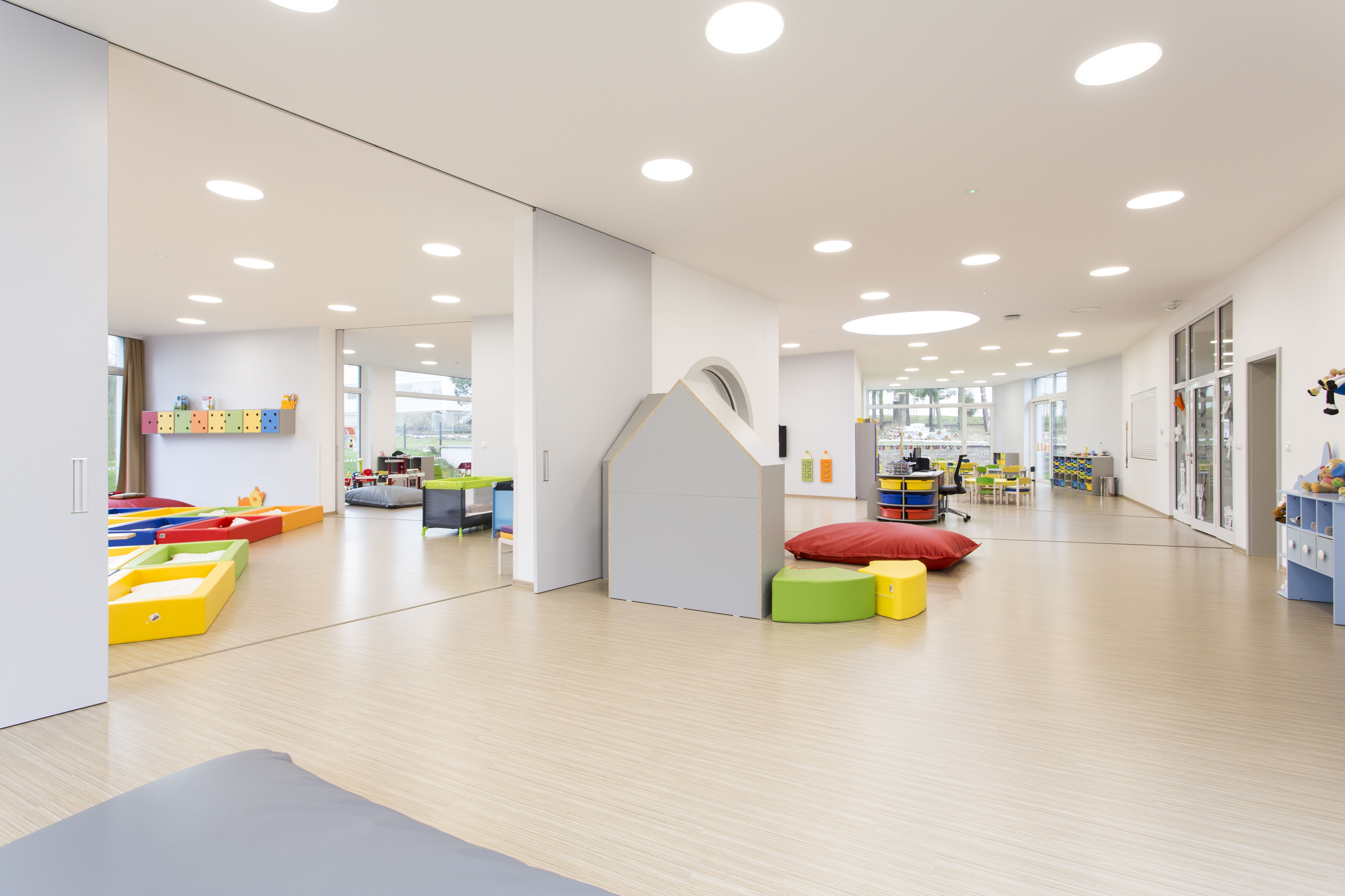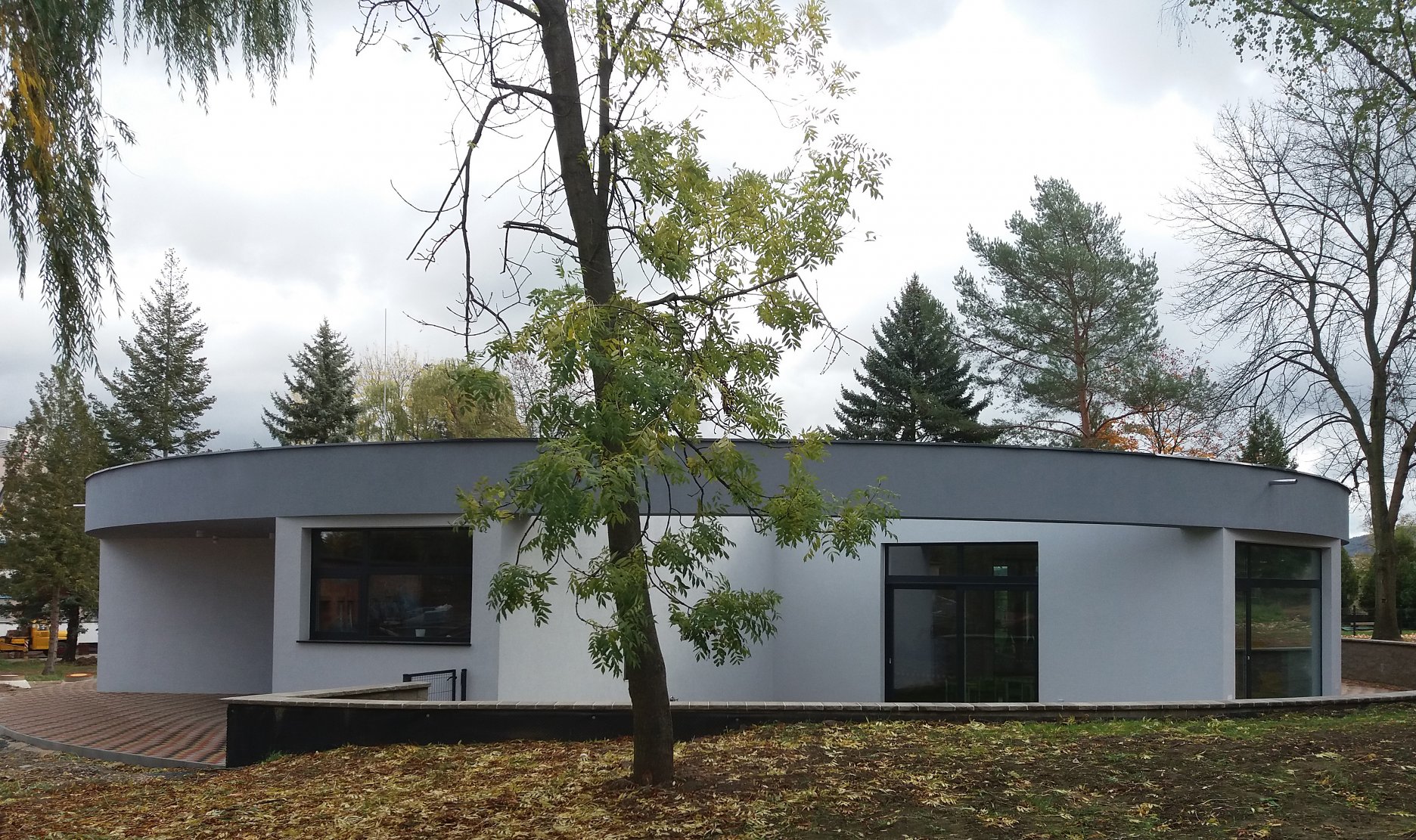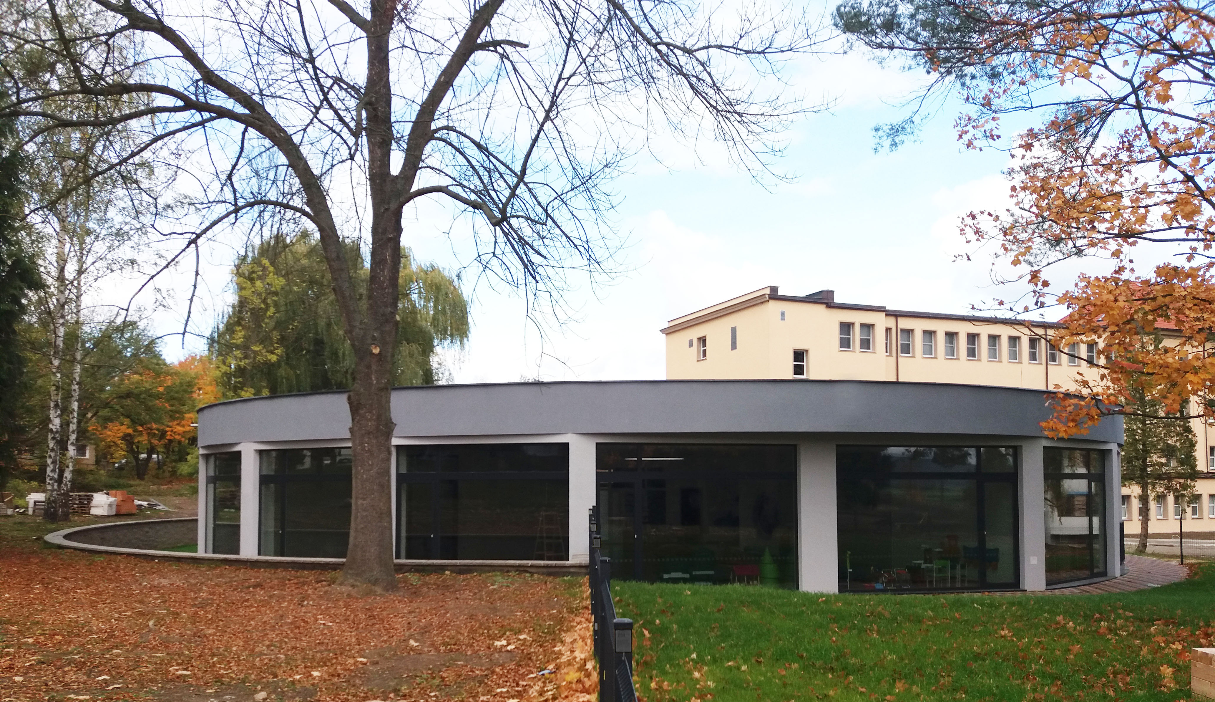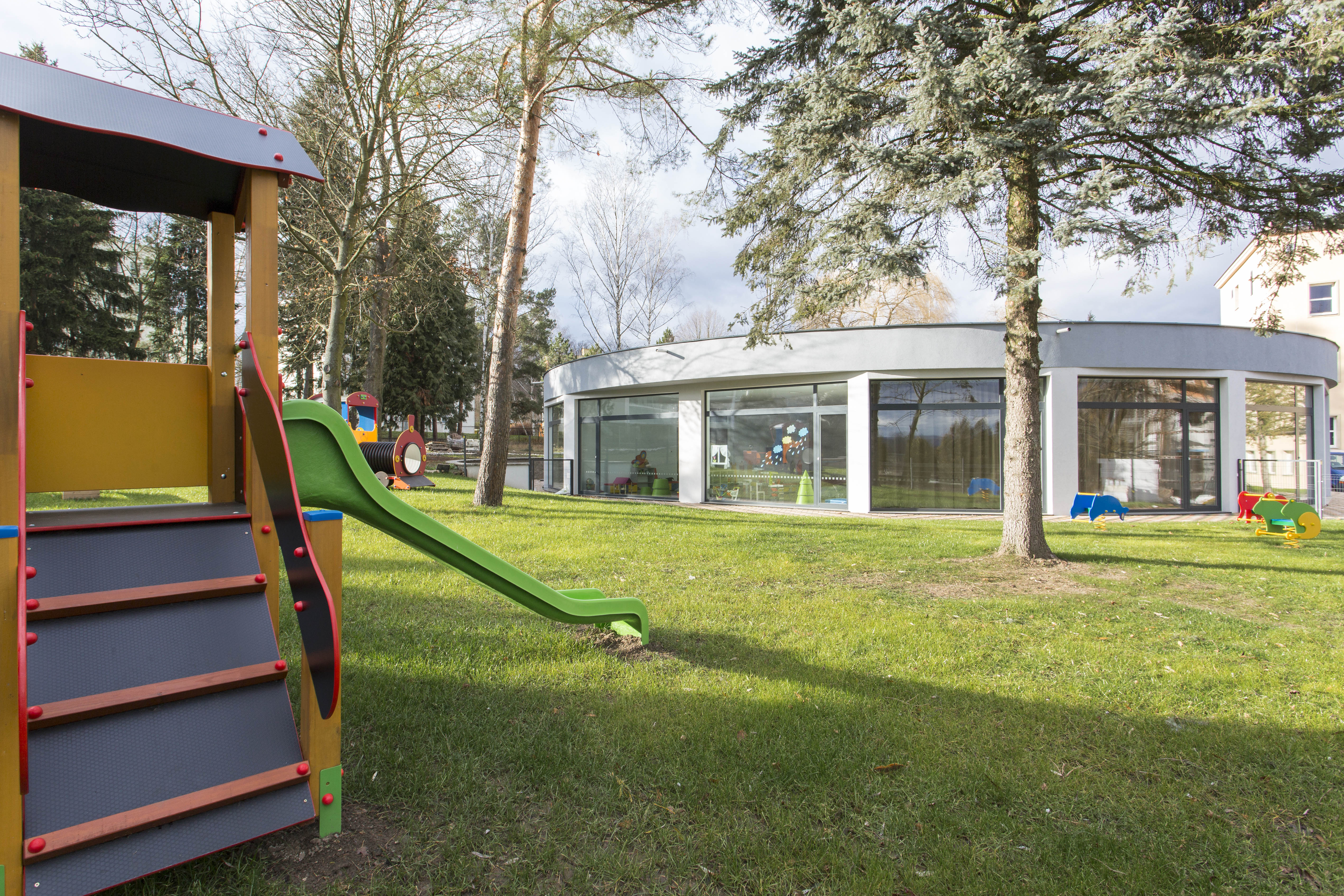 Investor požadoval oddelené časti herne, jedálne a spálne. Výsledkom je “hviezda” vpísaná do kruhového pôdorysu. Celopresklené steny tried smerujú do parku, “vynechané” kruhové segmenty medzi stenami tried slúžia ako kryté exteriérové terasy alebo závetrie pred vstupom.