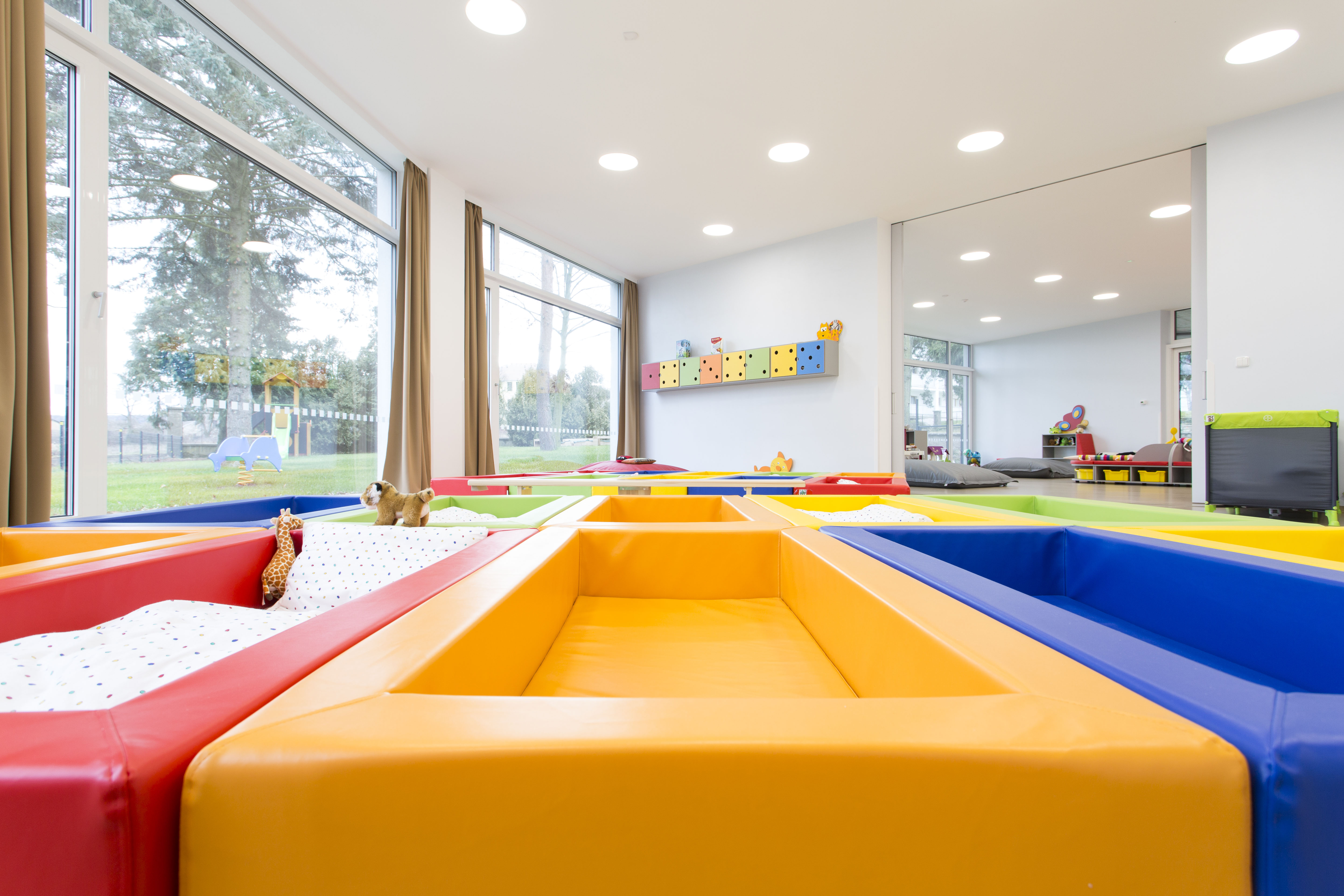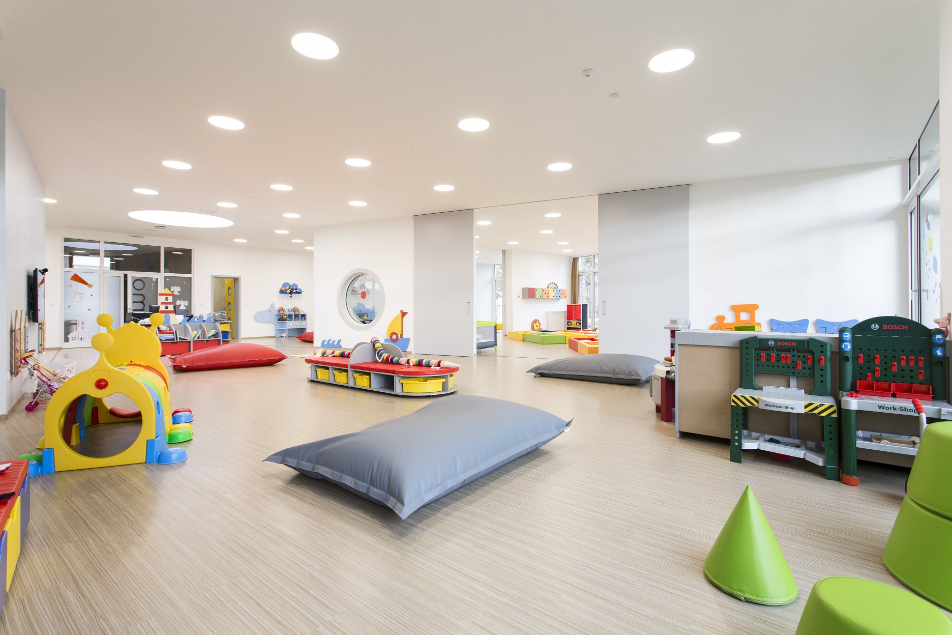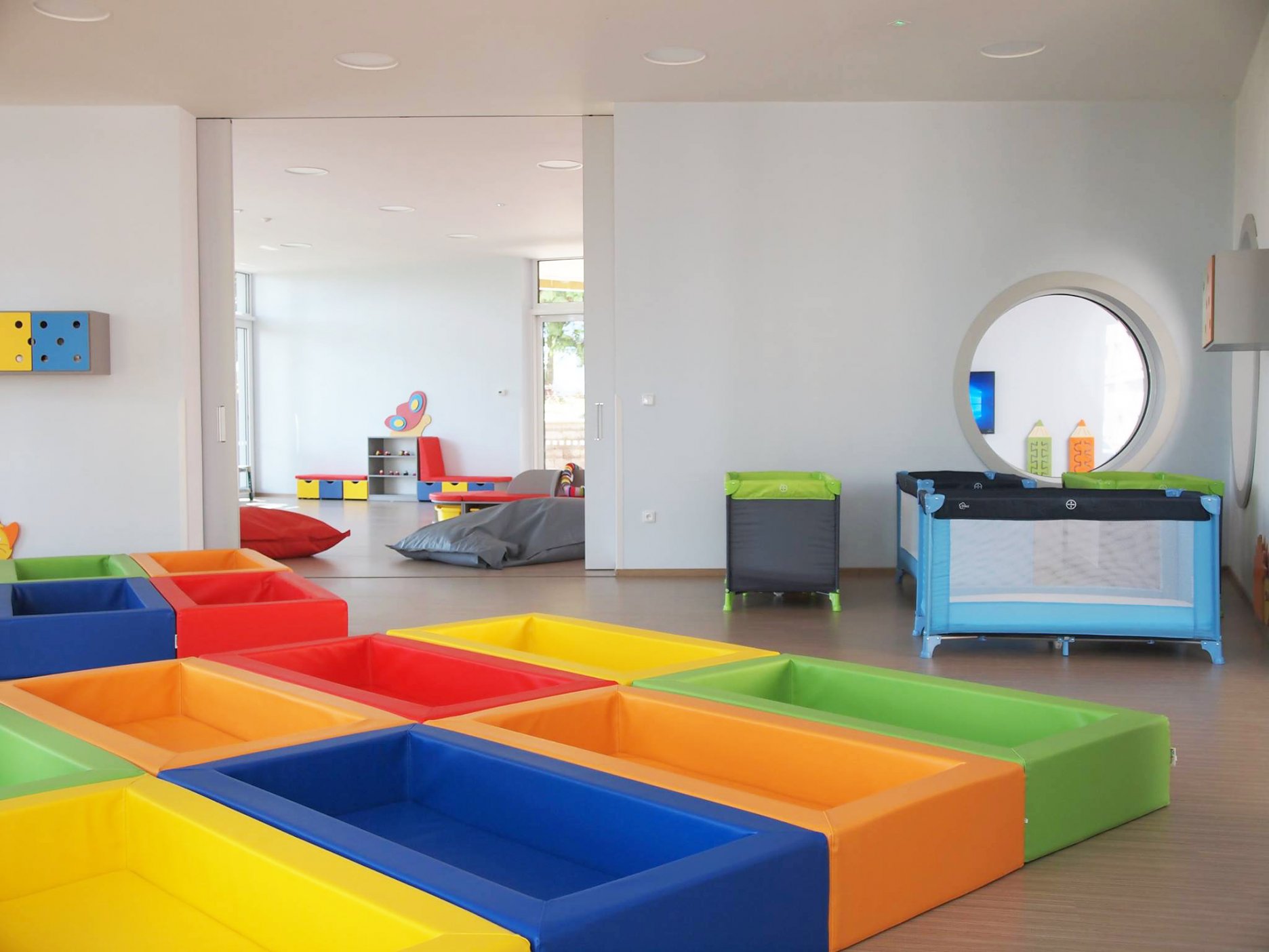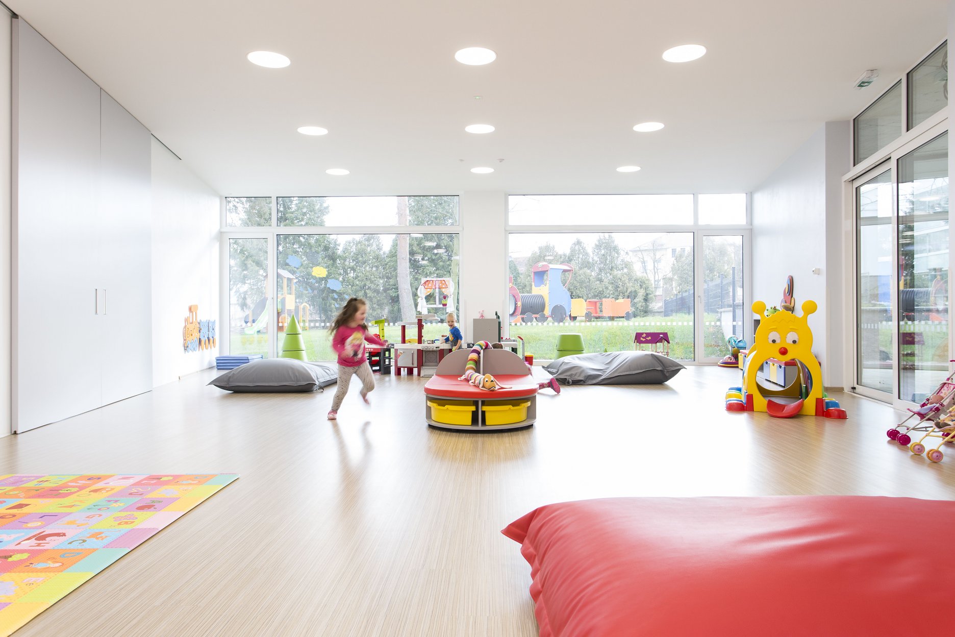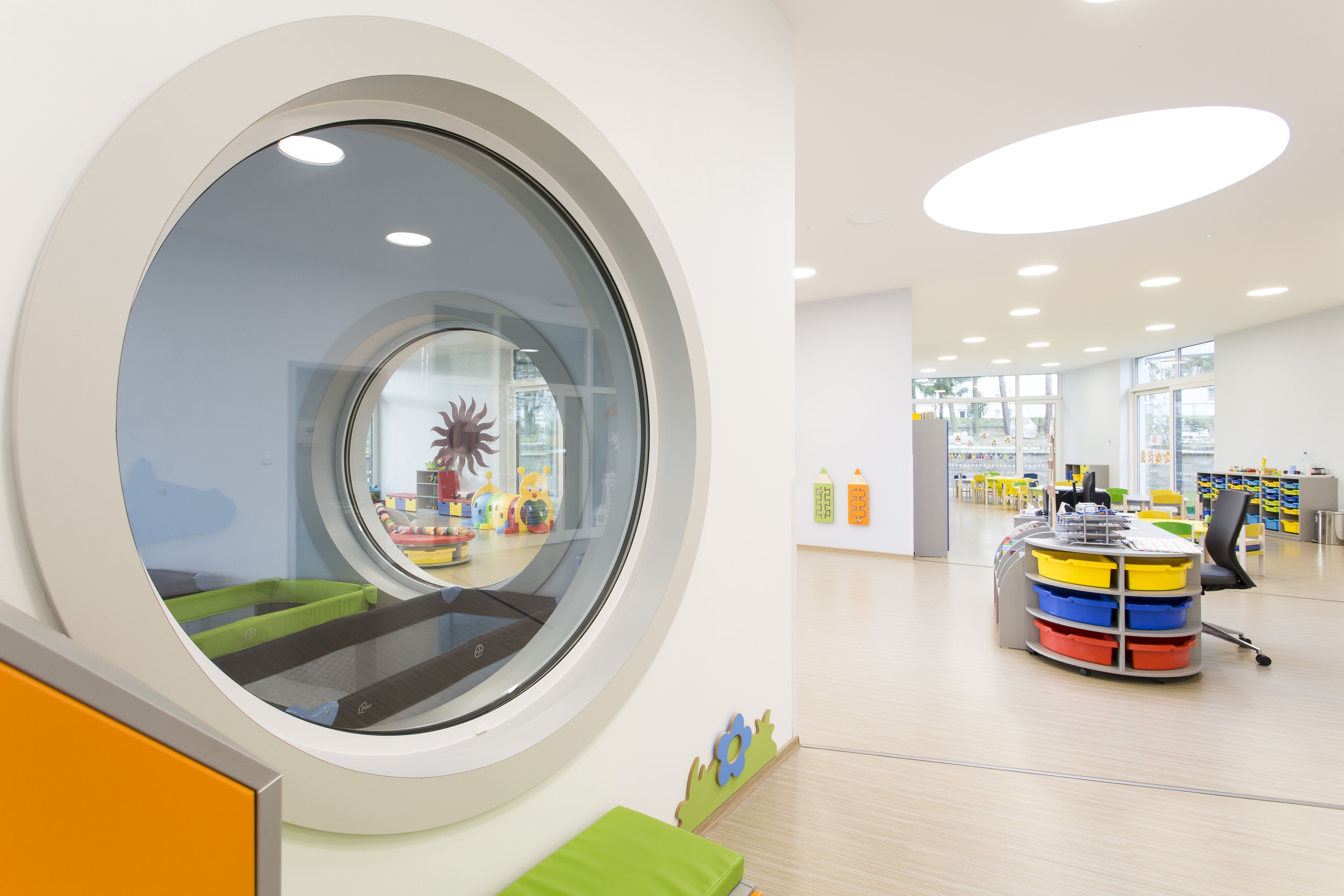 Vďaka prepojenej a otvorenej dispozícii tak v interiéri chýbajú rohy, kde by mohla pani učiteľka nechať deti za trest stáť. Na presklených dverách vo vstupnej hale je fólia, ktorá umožňuje pohľad do herne, ale v opačnom smere je nepriehľadná. Rodič tak od vstupu môže skontrolovať svoju ratolesť, či je dieťa v poriadku a neplače. Dieťa však už rodiča neuvidí.
