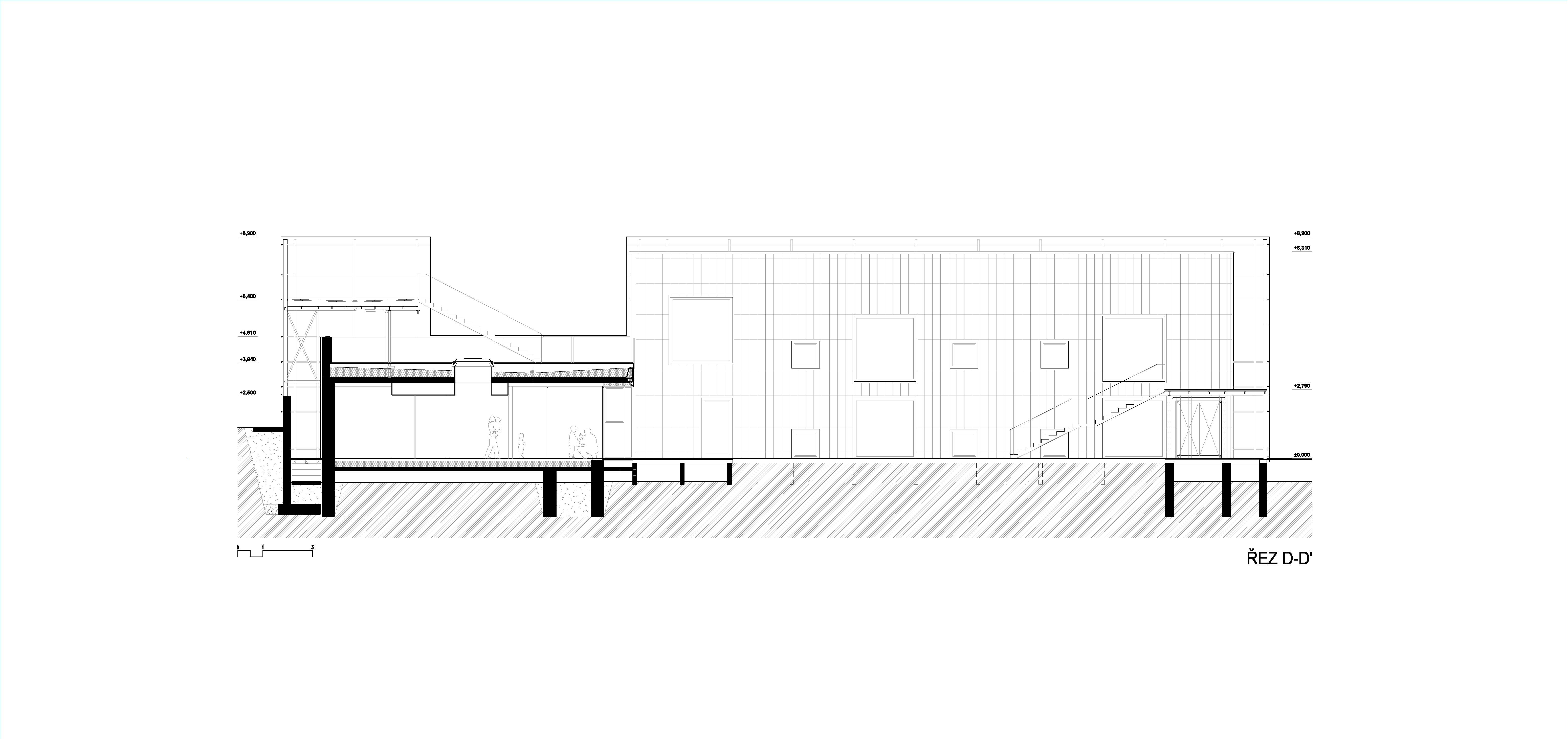 Jednoduchá murovaná stavba je obopnutá fasádou zo sklolaminátu kotvenom na drevenom podpornom rošte. Celý objekt obkolesuje oceľová konštrukcia s pochôdznymi roštami, ktorá vynáša druhú vrstvu trapézového sklolaminátu.