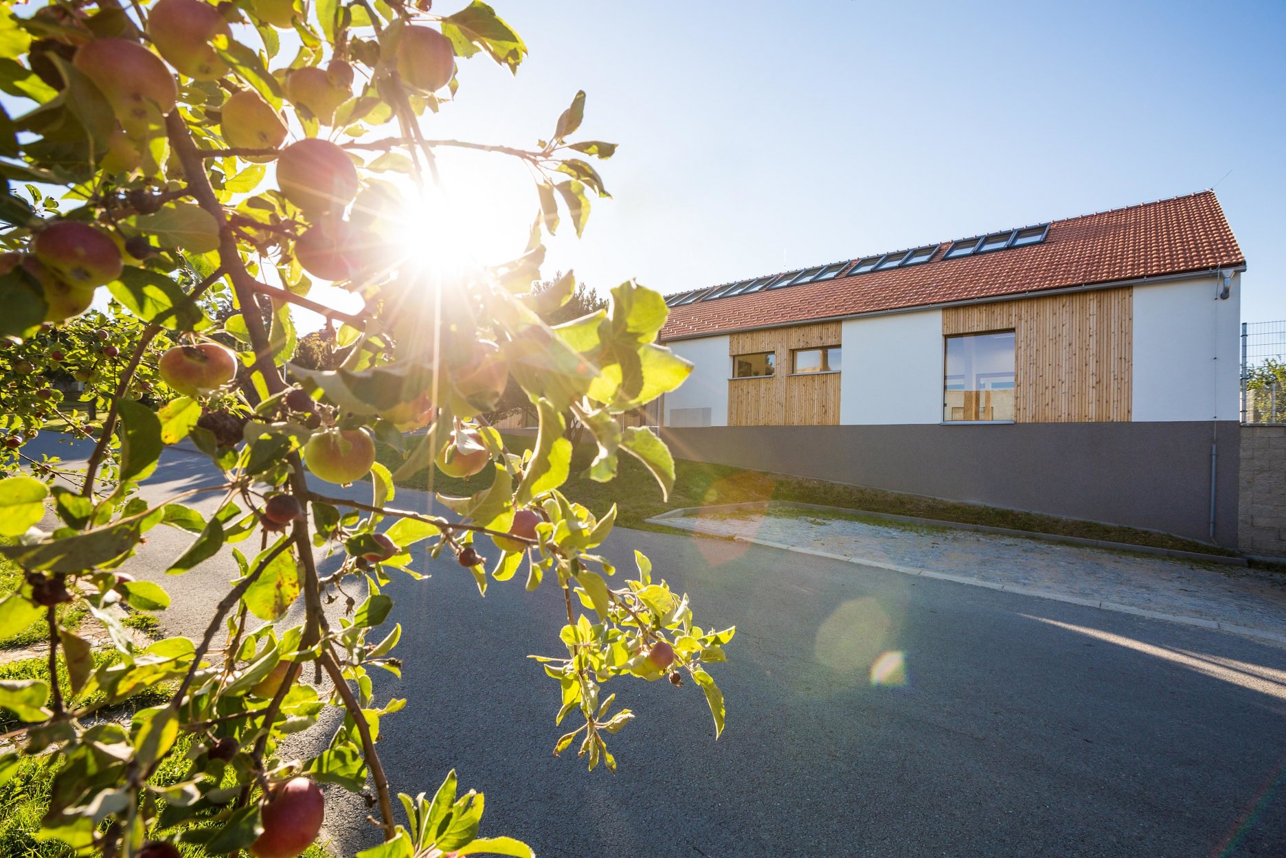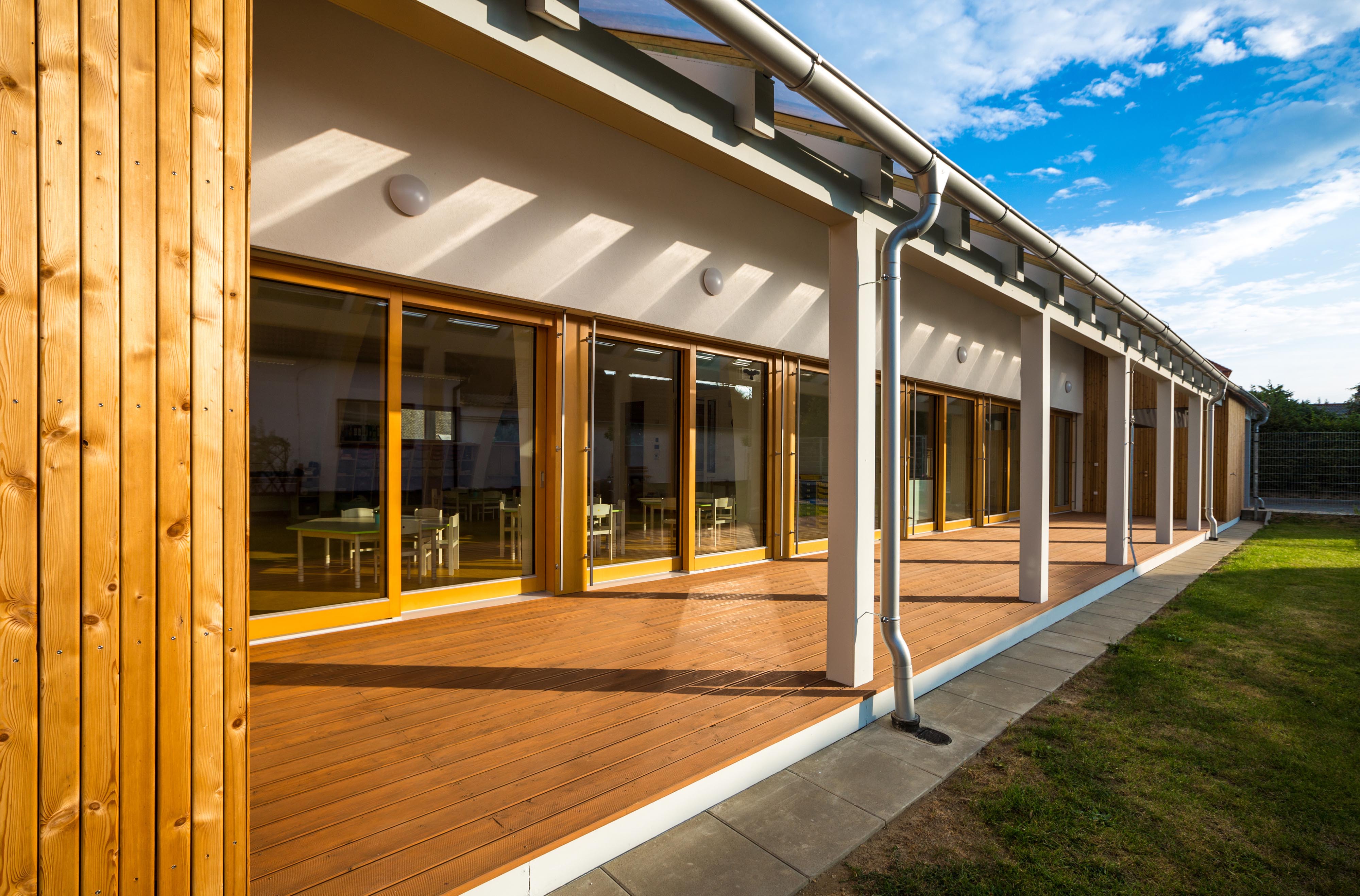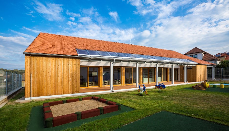Z herne a jedálne sa deti cez posuvné zasklenie dostanú na krytú drevenú terasu a ďalej do záhrady. Pre výhľad na rínok, rybník a na prichádzajúceho rodiča je v herni umiestnené rozmerné fixné zasklenie, siahajúce až po podlahu. Svetlo vchádzajúce do interiéru je možné regulovať prostredníctvom žalúzií. Použité materiály - biele murivo, drevené podbitie, alebo režná keramická škridla boli zvolené vzhľadom na okolitý kontext.