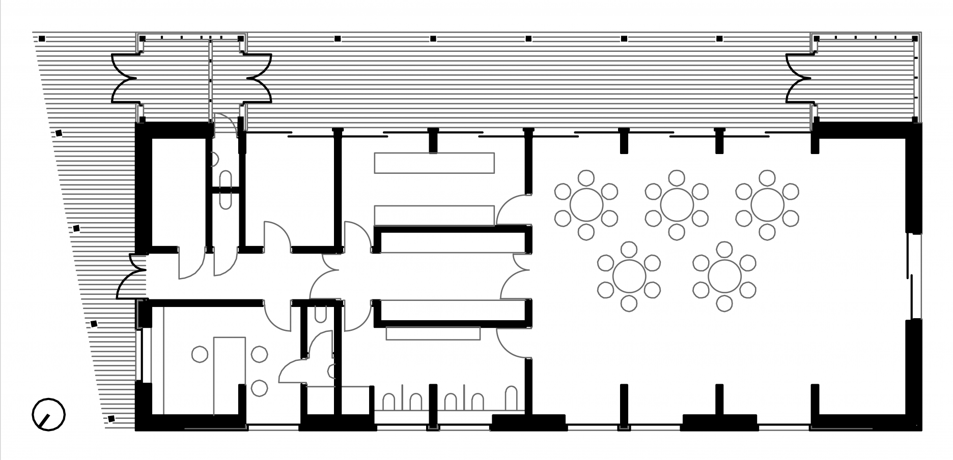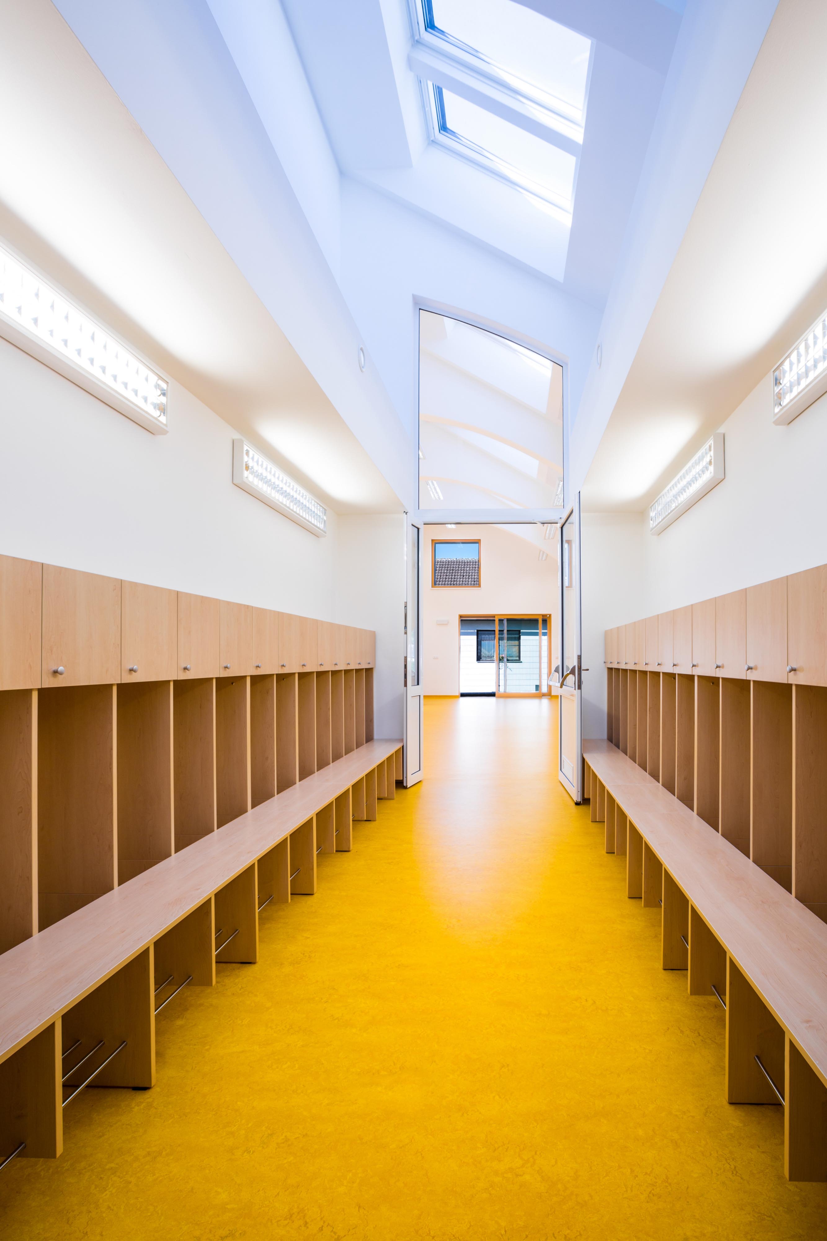 “Dispozícia je členená na tri časti. Prvá časť od vstupu má prevádzkový charakter so zázemím pre zamestnancov, druhá časť je vyhradená výdaju jedál, šatniam a sociálnemu zázemiu pre deti a tretia je samotnou herňou pre deti. Spoločným výtvarným prvkom priestorov sú viditeľné rámy konštrukcie zastrešenia ako skeletu - kostry stavovca, s horným prisvetlením pásom strešných okien,” vysvetľujú autori.