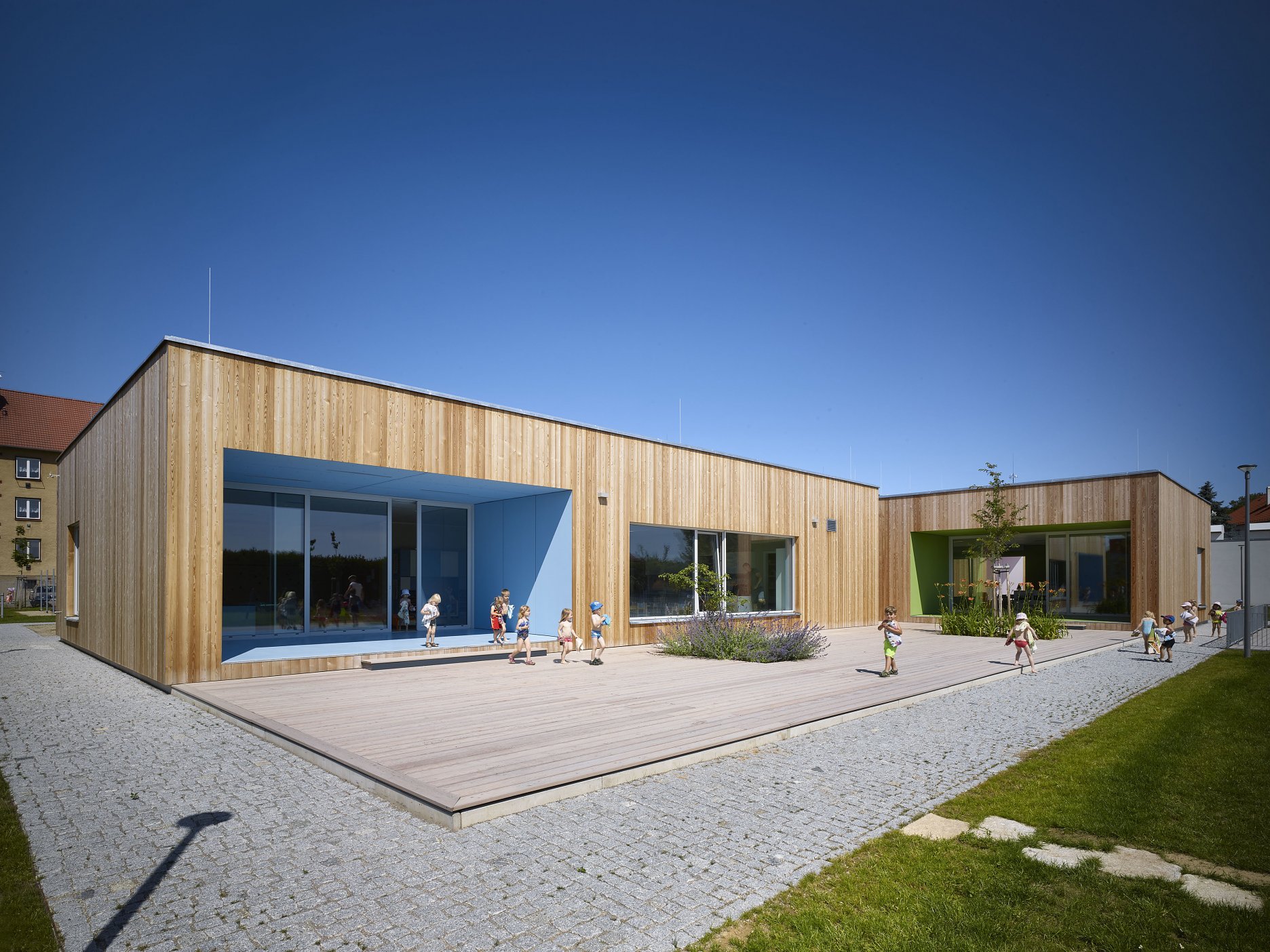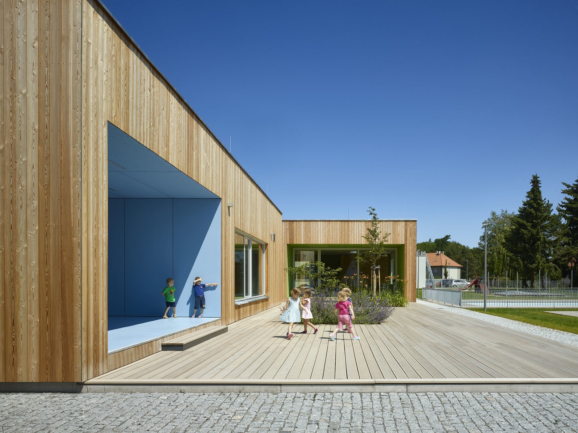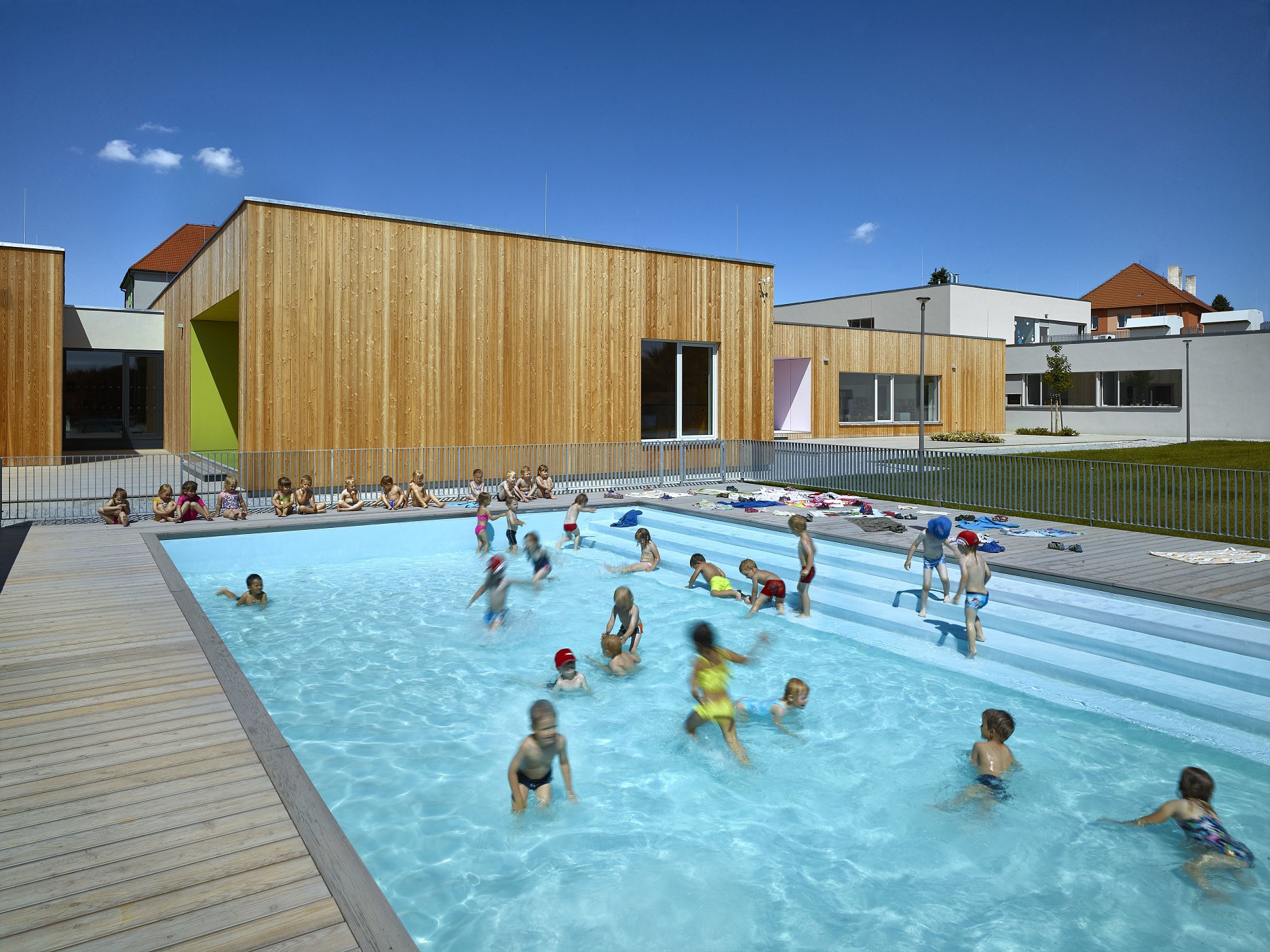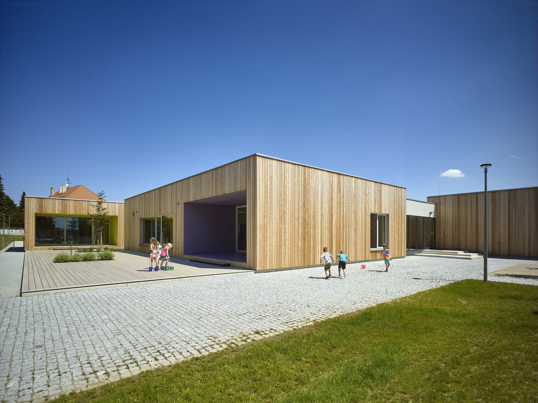 Investícia z verejných zdrojov, s požiadavkou na rozumné náklady a nenáročnú realizáciu. Zadanie, ktorého výsledkom sú často realizácie spadajúce prinajlepšom do sivého priemeru. Pritom u nás, aj u našich západných susedov vznikli viaceré stavby, ktoré dokazujú, že priestory v ktorých trávia polovicu svojho bdelého času si zaslúžia vyzerať inak. Patrí medzi ne aj škôlka v českom meste Pacov. Pridaná hodnota autorského vkladu ateliéru VYŠEHRAD spočíva najmä v dobre zvládnutom priestorovom koncepte otvorenej pavilónovej stavby, úzko prepojenej s rozľahlou záhradou.