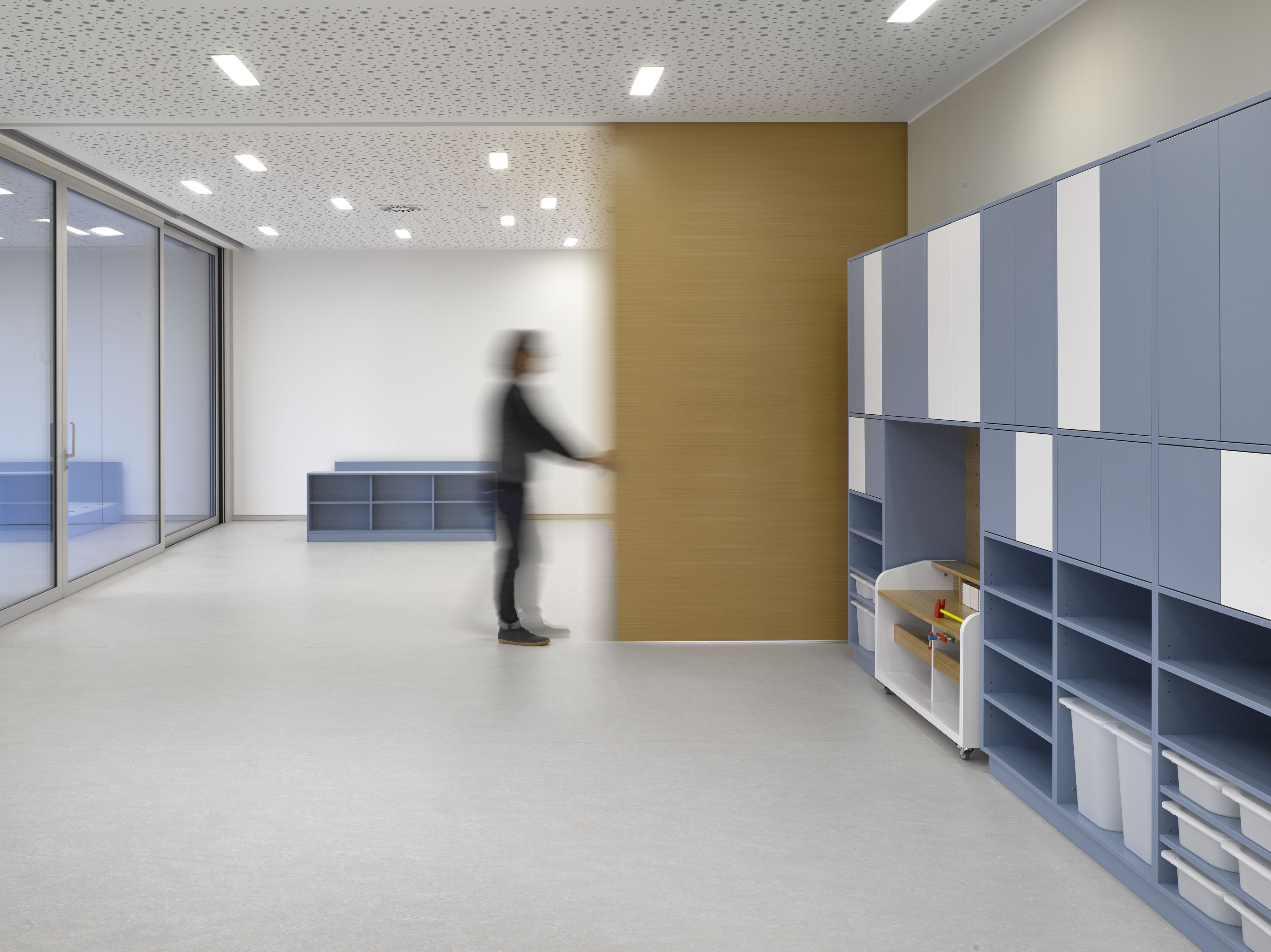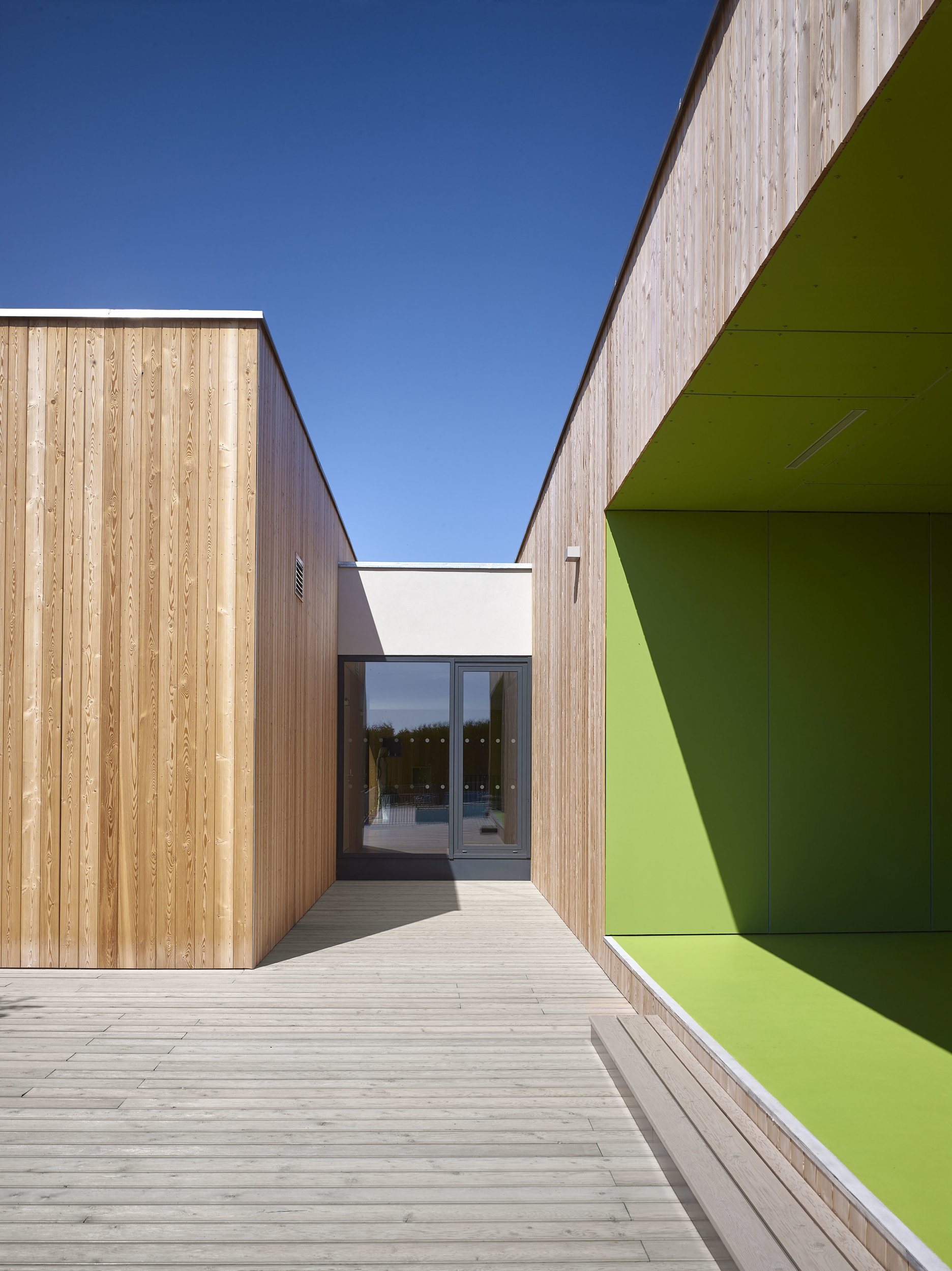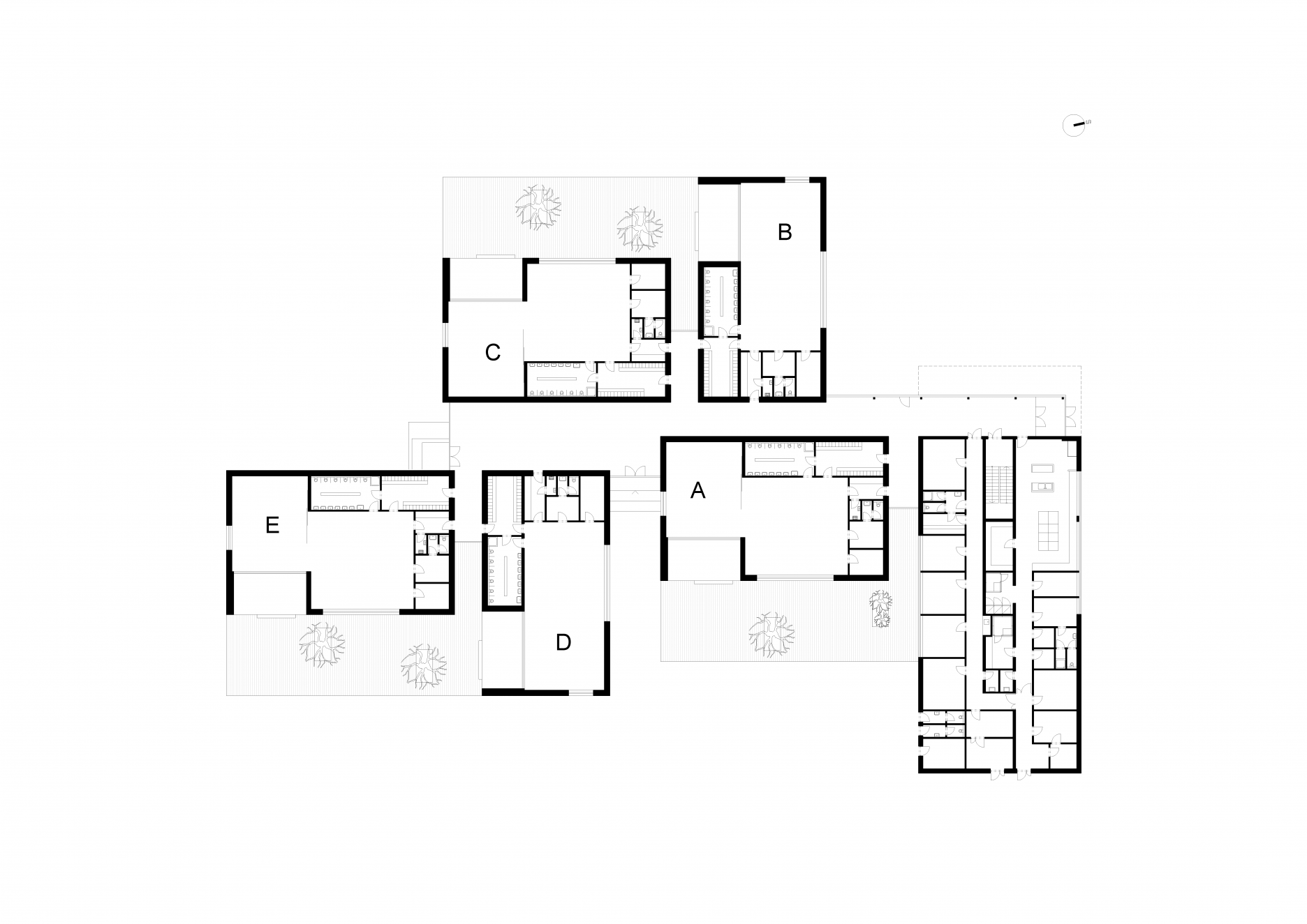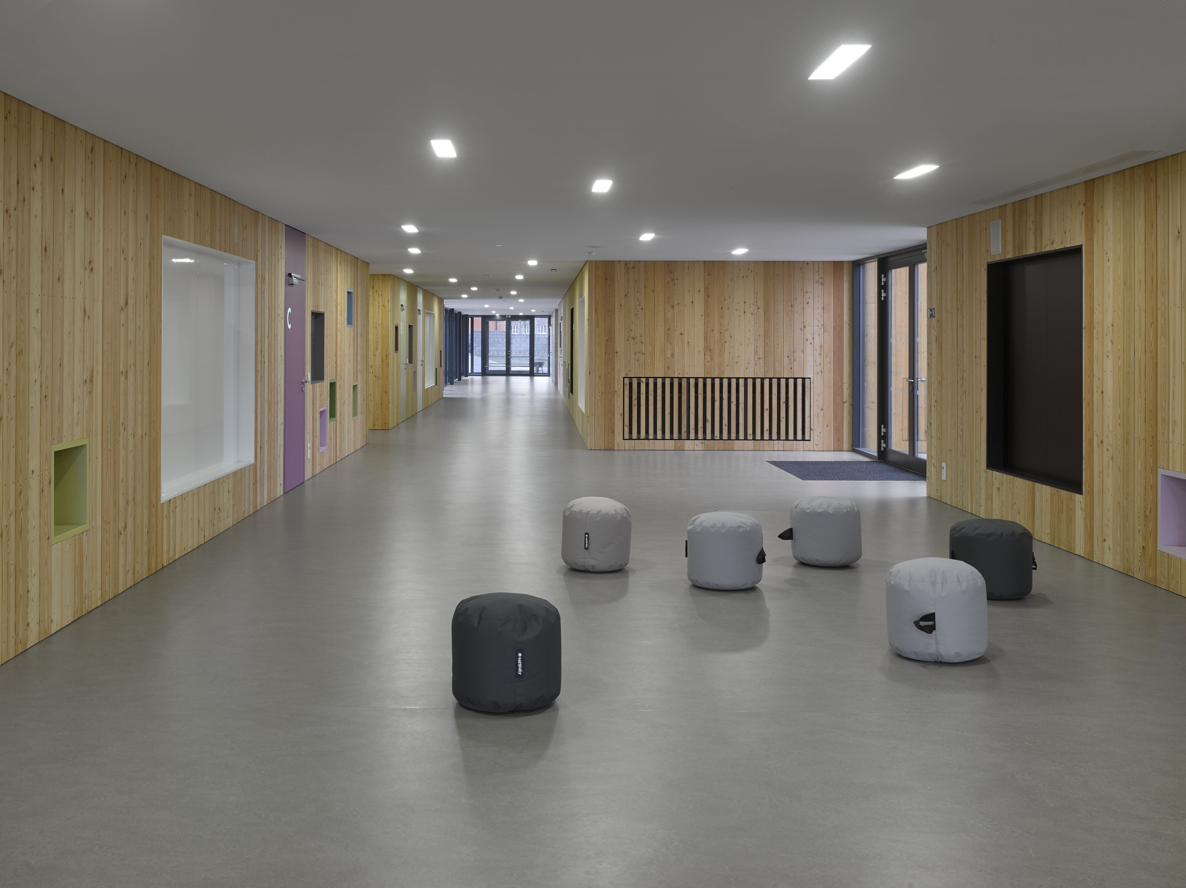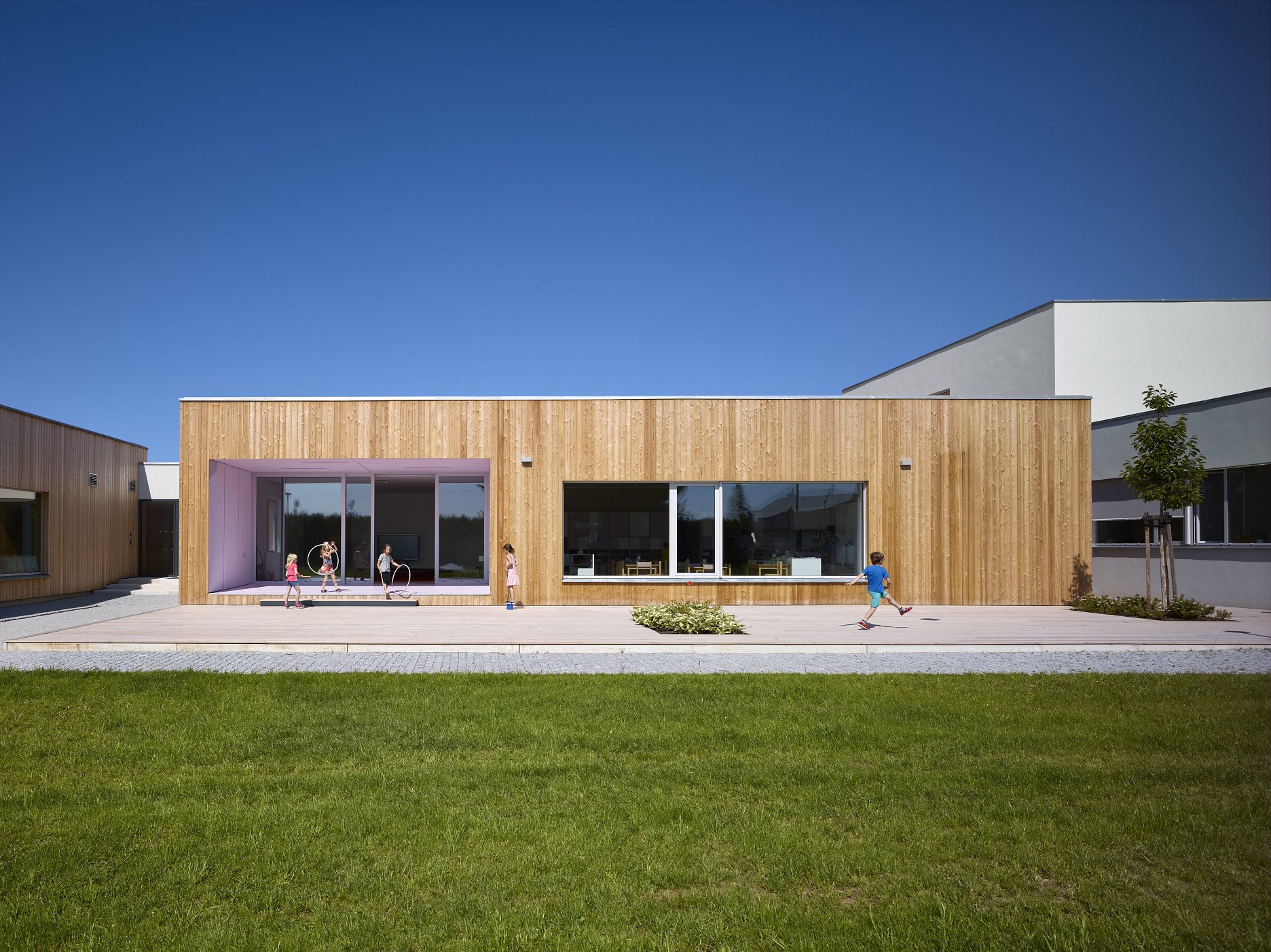 Päticu prízemných pavilónov, s priamym prístupom do záhrady prepája spoločná chodba. Hlavnú komunikačnú os uzatvára dvojpodlažný vstupný blok. Priestor každej z učební rozširuje priestranná drevená terasa.