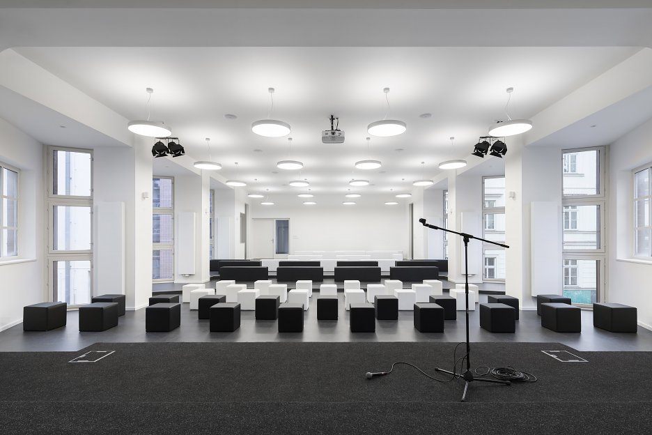Medzinárodná evanjelická cirkev Faith Community oslovila architektov s prosbou o konzultácie už vo fáze hľadania nájomných priestorov. Zadaním bol minimálny rozpočet a maximálny komunitný úžitok. “Po sérii nezdařených jednání a hromadě obtížně přizpůsobitelných pronájmů se v jednom z vnitrobloků na pražské Letné objevil nečekaný klenot. Působivý, leč dožilý sál o půdorysu trilobita, zbudovaný pro ÚV KSČ těsně před pádem režimu. Tržní potřeby 90. let sál postupně pobořily dodatečnými okny a proměnily v garáže a kanceláře, aby nakonec zcela morálně dožil. Z této výchozí podoby vyšla naše konverze,” približujú genézu projektu architekti.