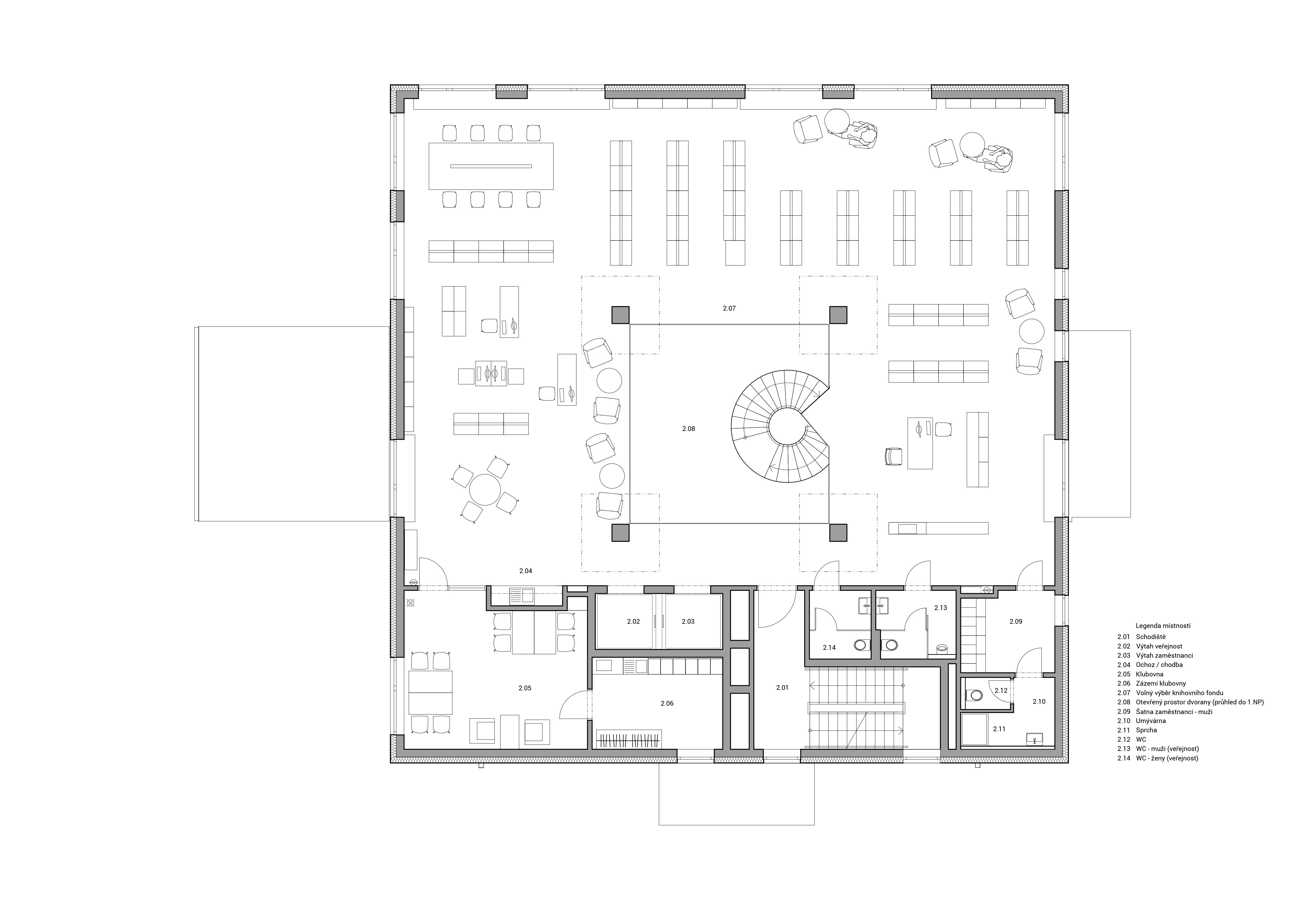 Návrh reaguje na neustály vývoj typológie knižníc. Budova už neslúži iba ako sklad kníh, jej funkcia sa ďalej posúva ku komunitným aktivitám. Vzniká lokálne centrum pre širokú škálu užívateľov - “otevřený, přívětivý a inkluzivní dům”.
