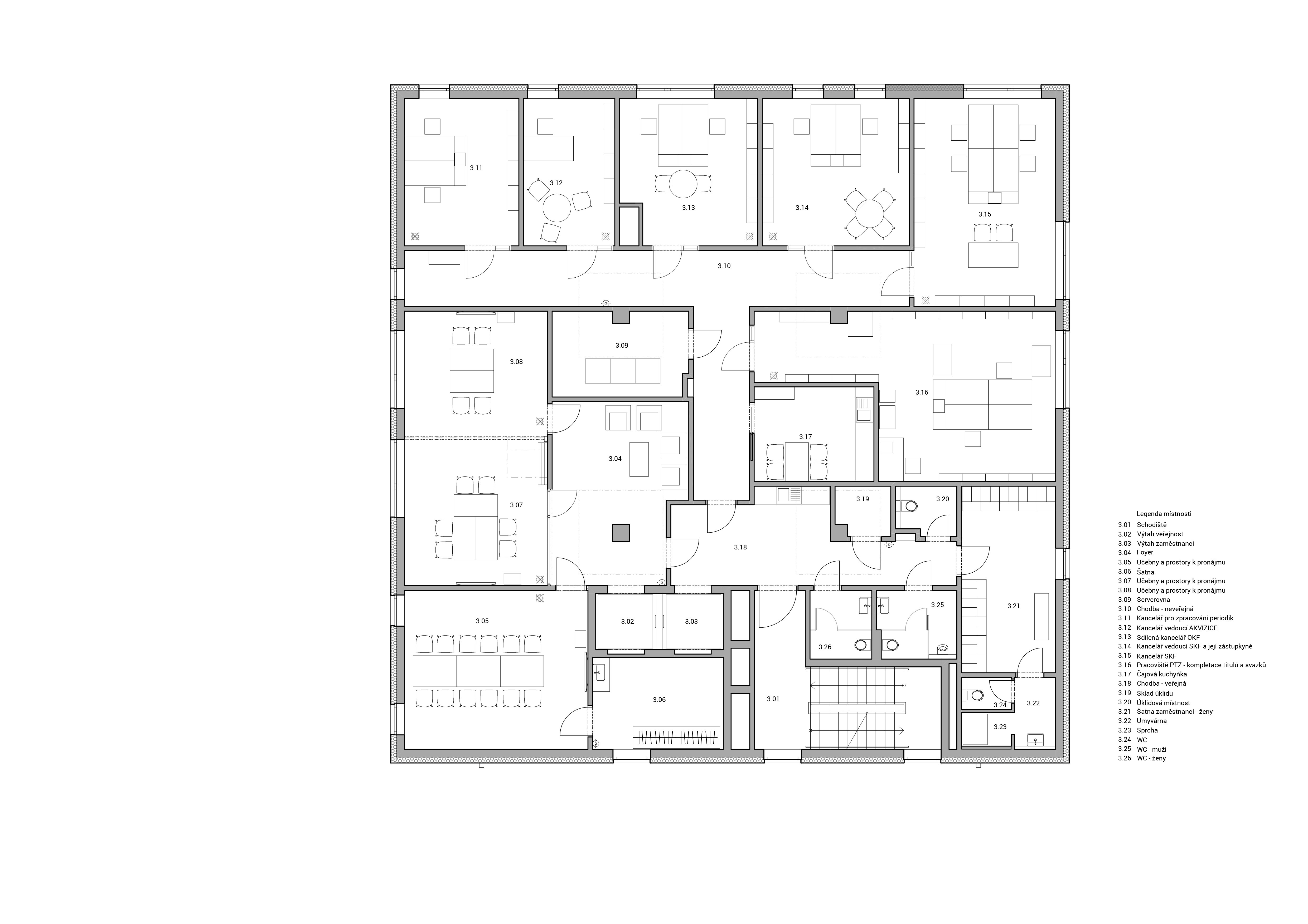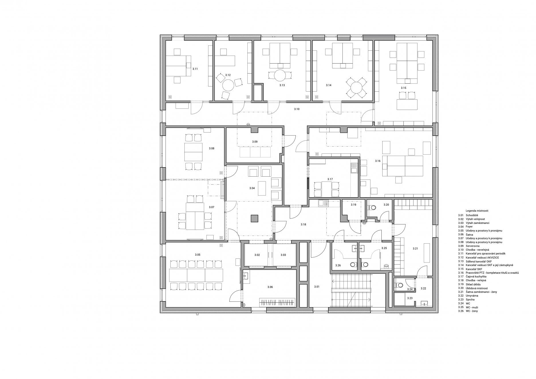 Posledný celok tvorí neverejné administratívne a technické zázemie. Najvyššie podlažie zastrešuje triediareň kníh a dielne na opravy knižného fondu patriaceho Mestskej knižnici. Každá publikácia z fondu knižnice sa tak skôr či neskôr dostane do novej budovy na sídlisku Petřiny.
