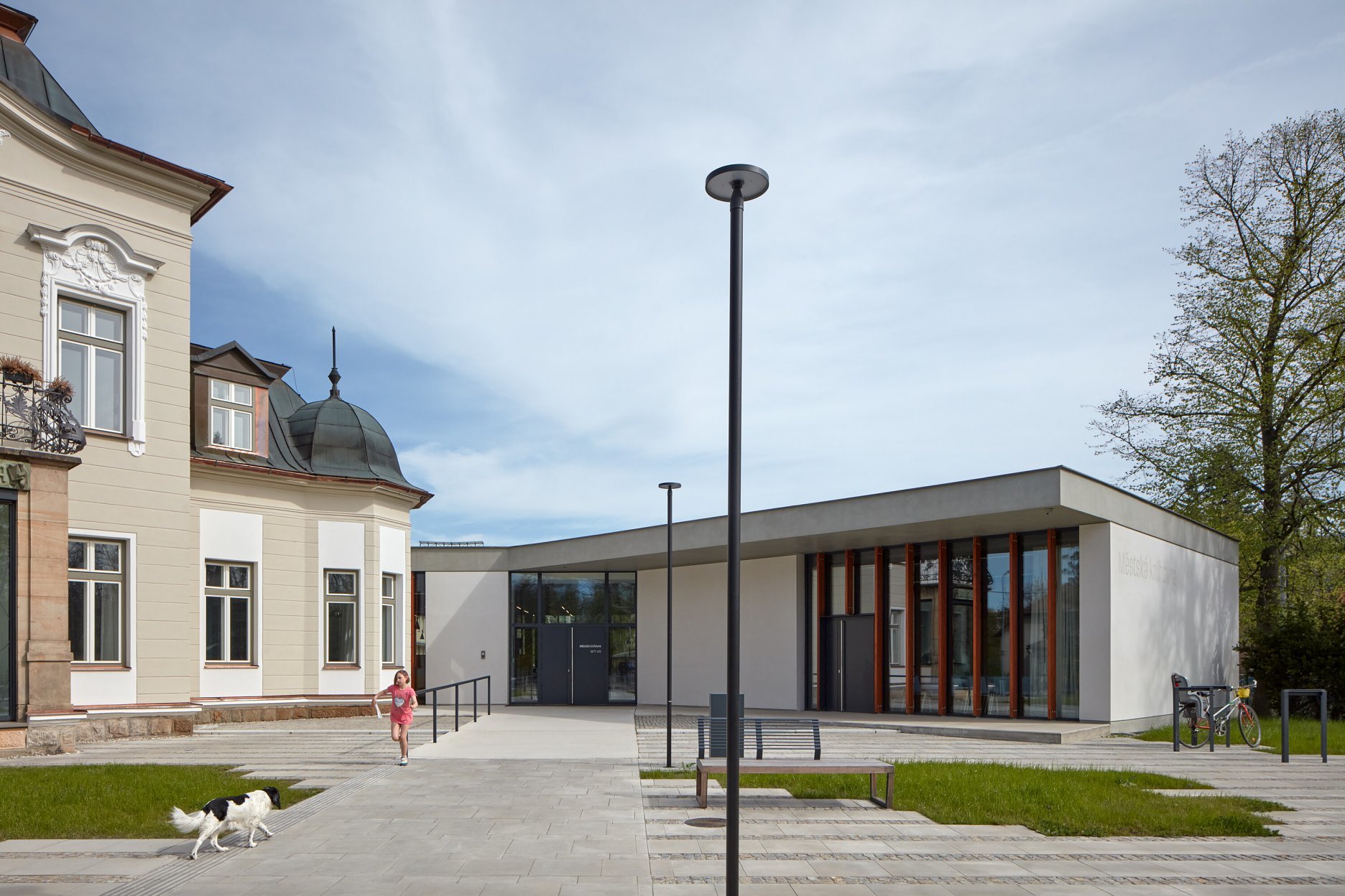 Přístavba vytváří předěl mezi úplně novým veřejným prostorem na nároží ulic a zahradou a funguje jako nový vstup do knihovny. Role přístavby a vily se tím otáčejí. Přístavba je novým hlavním prostorem, který splňuje požadavky na moderní knihovnu s kavárnou a přednáškovými prostory. Vila teď funguje především pro dospělé čtenáře - jako čítárna, studovna a zázemí pro administrativu knihovny. Přístavba a stará vila mají proto výrazně odlišný charakter interiéru.
