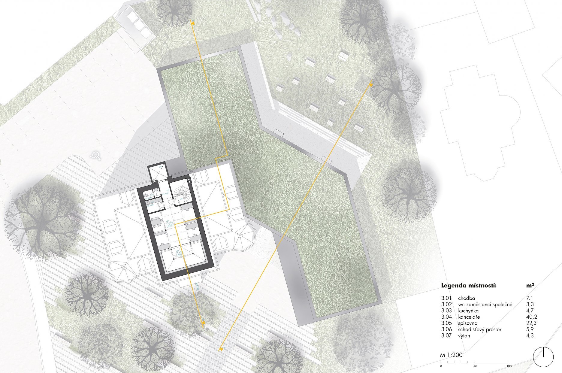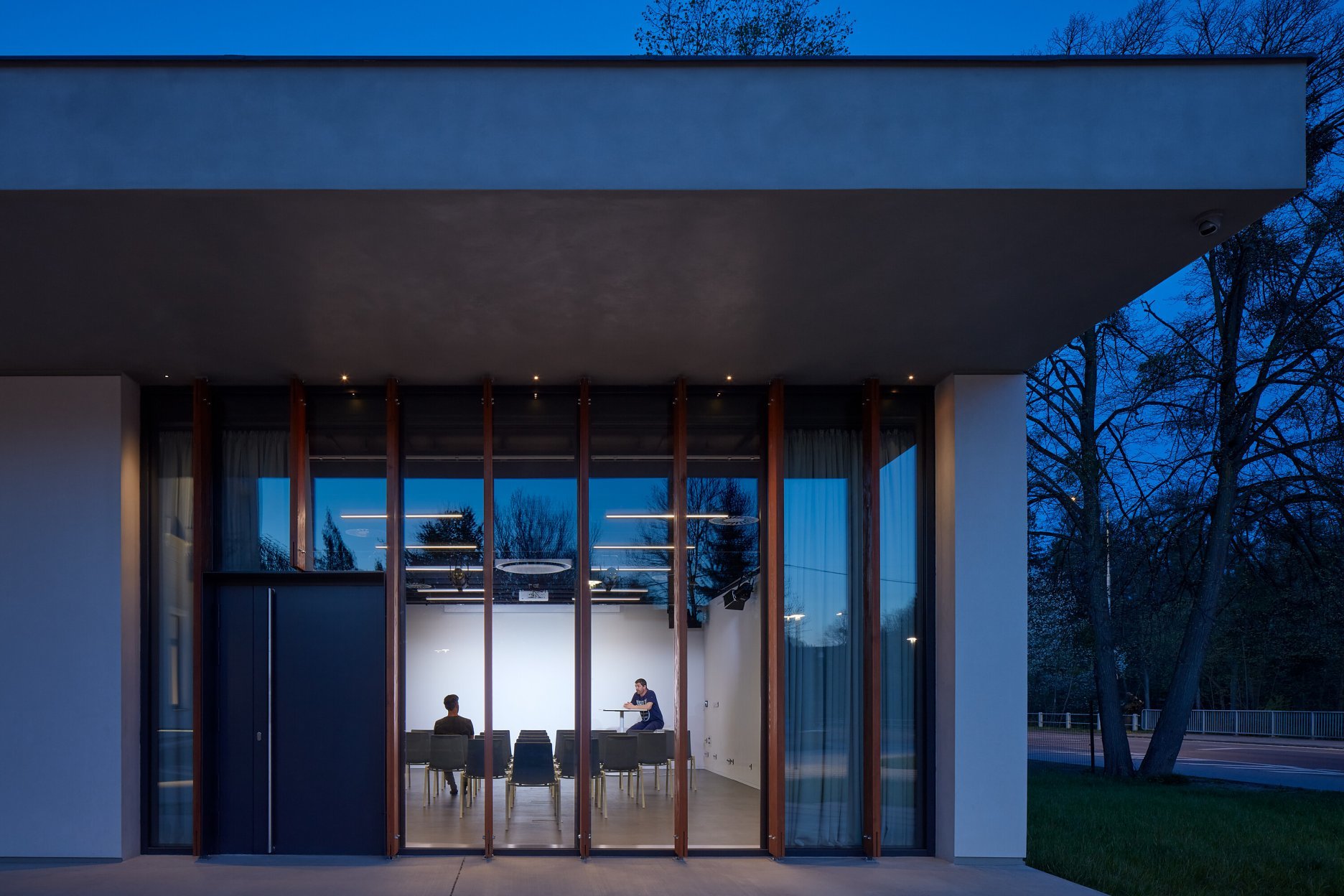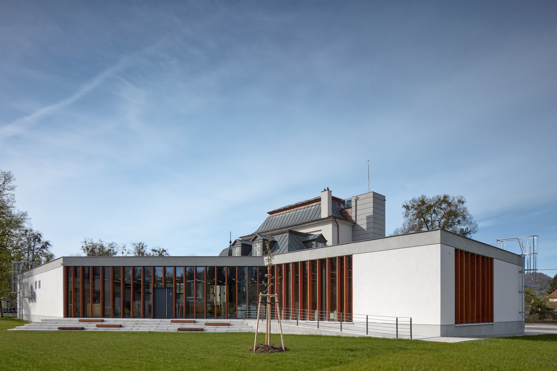 Důležitým parametrem, který ovlivňuje podobu přístavby je velmi nízká energetická náročnost stavby. Z ní vychází kombinace stavebních a technologických prvků, které jsme při návrhu použili. Zelená střecha omezuje přehřívání a zlepšuje zadržení dešťové vody na pozemku. Přesah střechy pasivně stíní prosklenou fasádu na západě a samotná prosklená fasáda je z velmi kvalitního trojitého zasklení plněného argonem. Vytápění i chlazení zajišťuje tepelné čerpadlo země-voda se třemi zemními vrty pod budovou. Abychom mohli budovu tepelným čerpadlem chladit v letních měsících, je topné a chladící potrubí rozvedené ve stropě. Na jednu stranu to umožnilo naprostou variabilitu uspořádání nábytku v přístavbě, na druhé straně si to vyžádalo technicistní pojetí nezakrytého stropu a použití svislých stropních akustických prvků - bafflí. Interiéru to dodává určitý pravidelný rytmus, který se opakuje ve svislých fasádních trámech i v pravidelném členění regálů podél stěn.