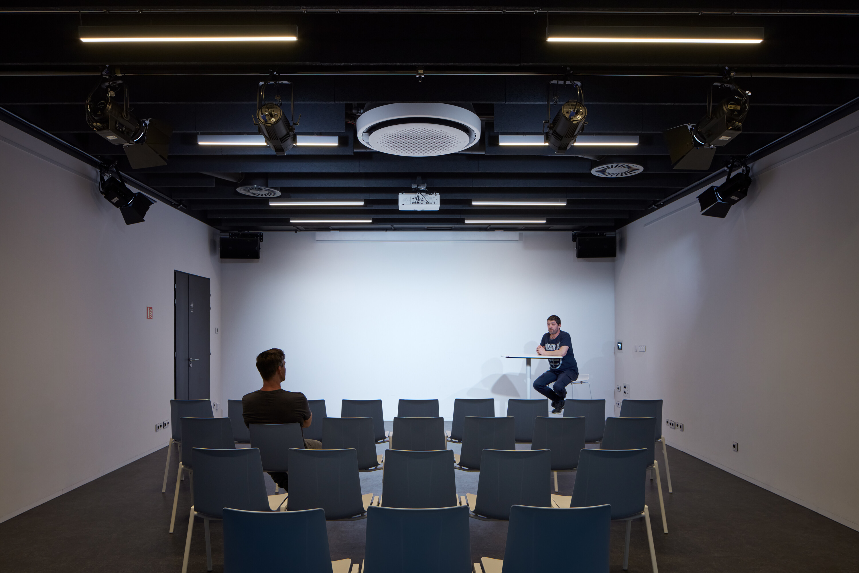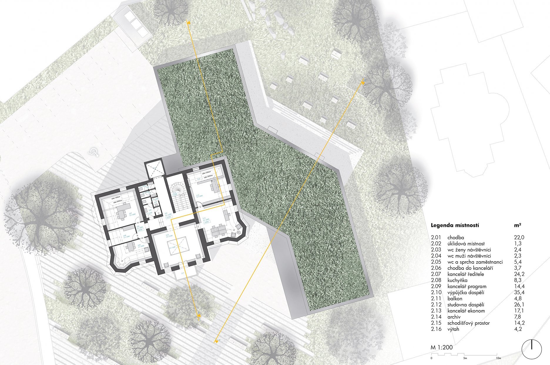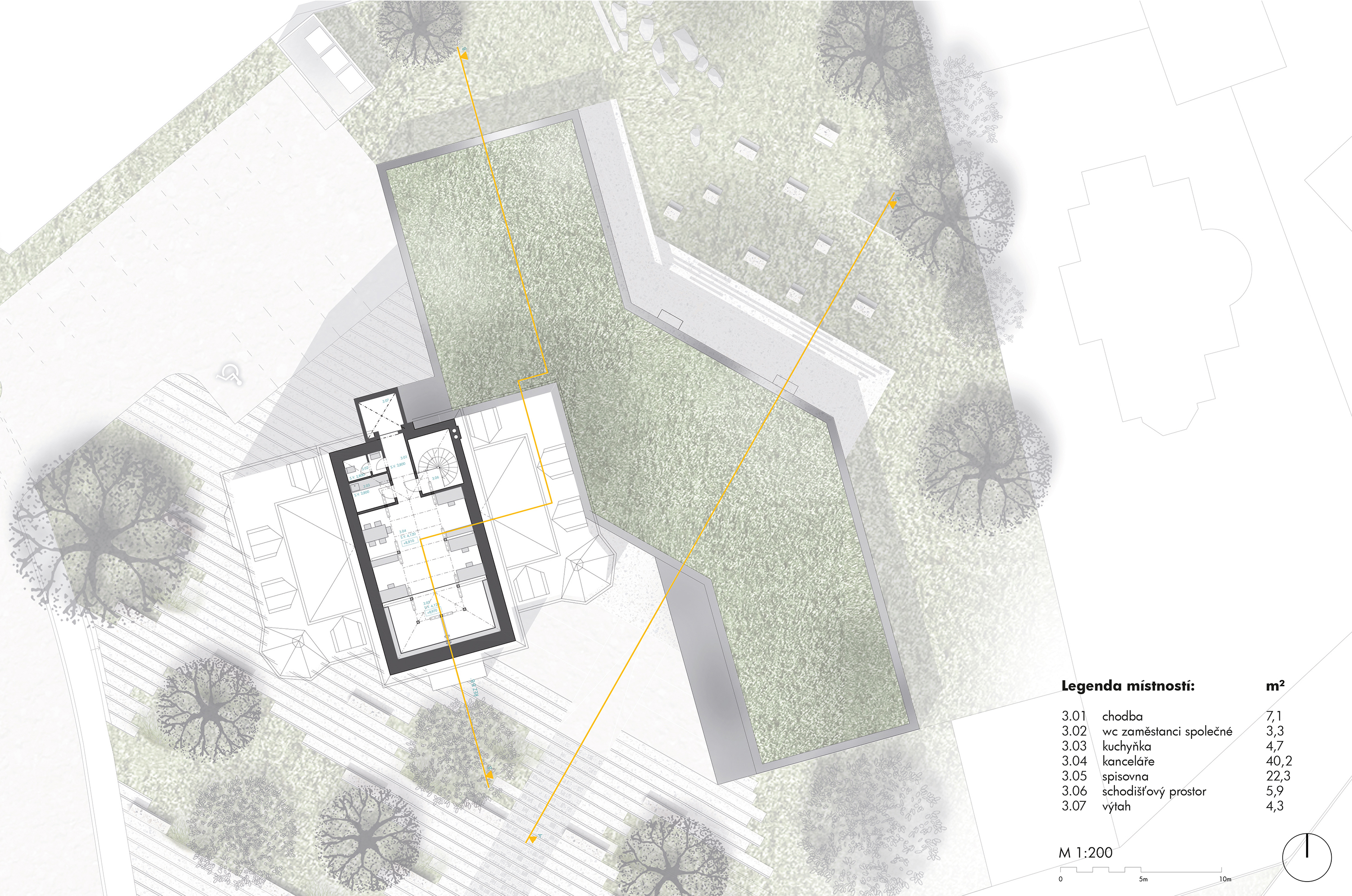 Důležitým parametrem, který ovlivňuje podobu přístavby je velmi nízká energetická náročnost stavby. Z ní vychází kombinace stavebních a technologických prvků, které jsme při návrhu použili. Zelená střecha omezuje přehřívání a zlepšuje zadržení dešťové vody na pozemku. Přesah střechy pasivně stíní prosklenou fasádu na západě a samotná prosklená fasáda je z velmi kvalitního trojitého zasklení plněného argonem. Vytápění i chlazení zajišťuje tepelné čerpadlo země-voda se třemi zemními vrty pod budovou. Abychom mohli budovu tepelným čerpadlem chladit v letních měsících, je topné a chladící potrubí rozvedené ve stropě. Na jednu stranu to umožnilo naprostou variabilitu uspořádání nábytku v přístavbě, na druhé straně si to vyžádalo technicistní pojetí nezakrytého stropu a použití svislých stropních akustických prvků - bafflí. Interiéru to dodává určitý pravidelný rytmus, který se opakuje ve svislých fasádních trámech i v pravidelném členění regálů podél stěn.