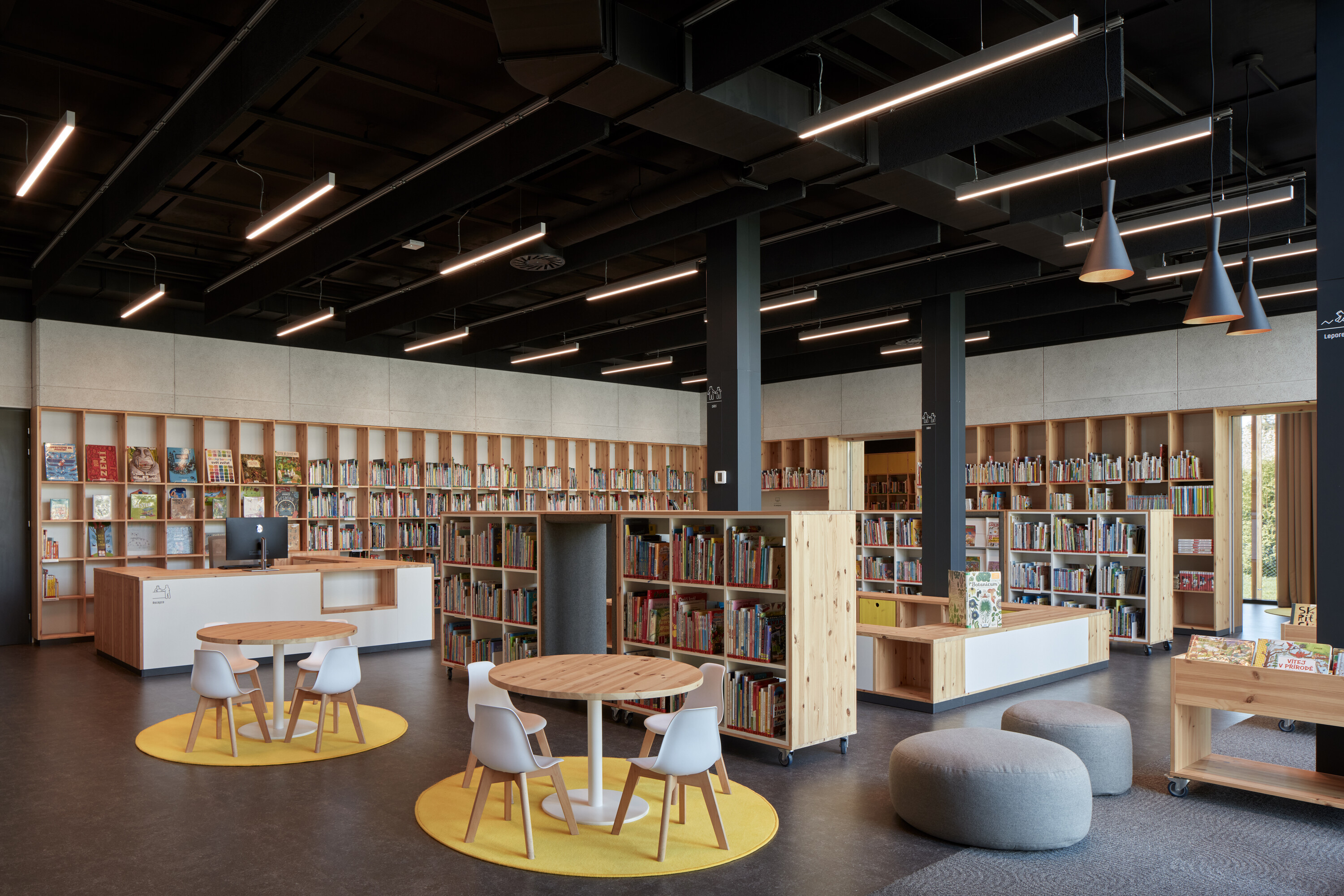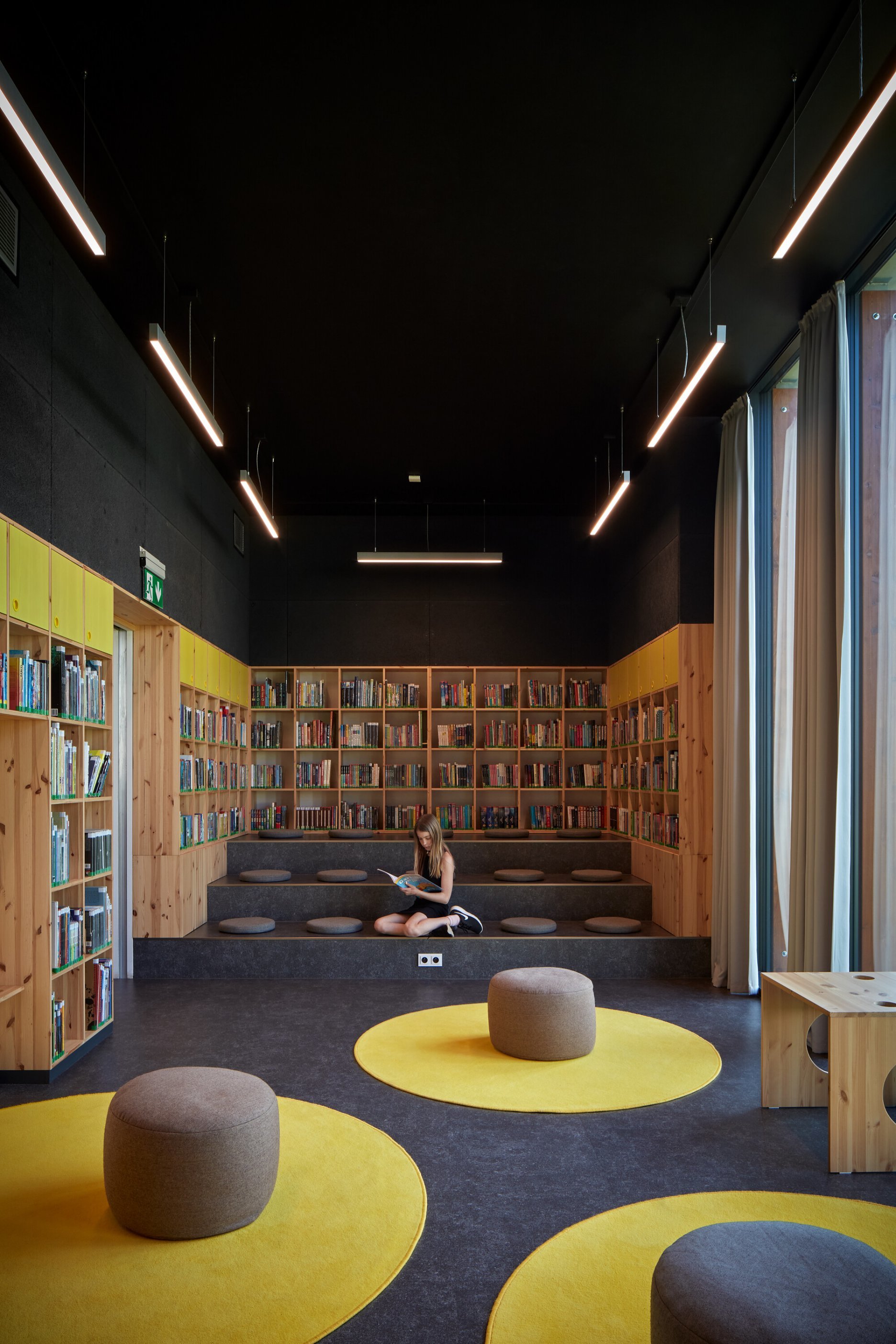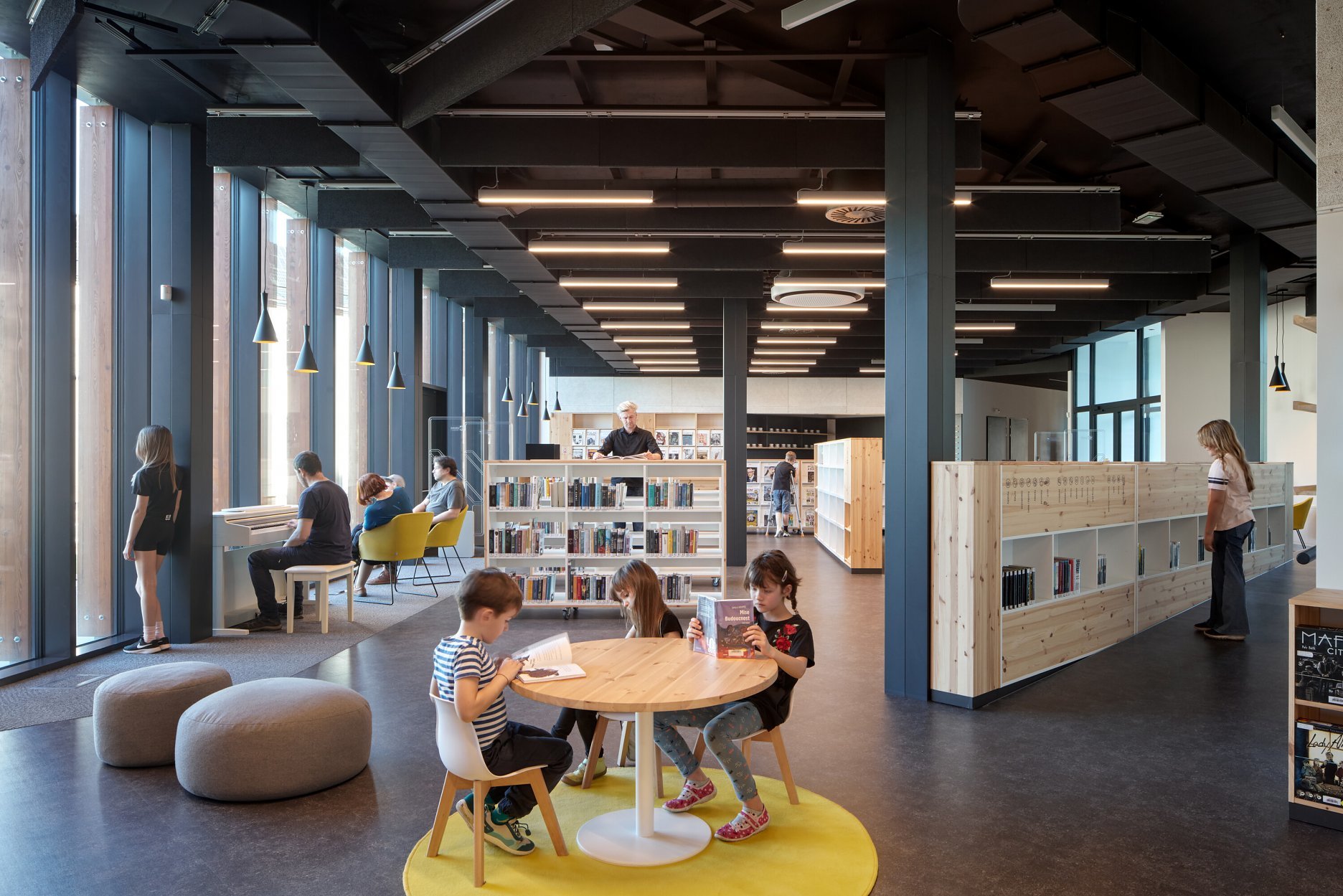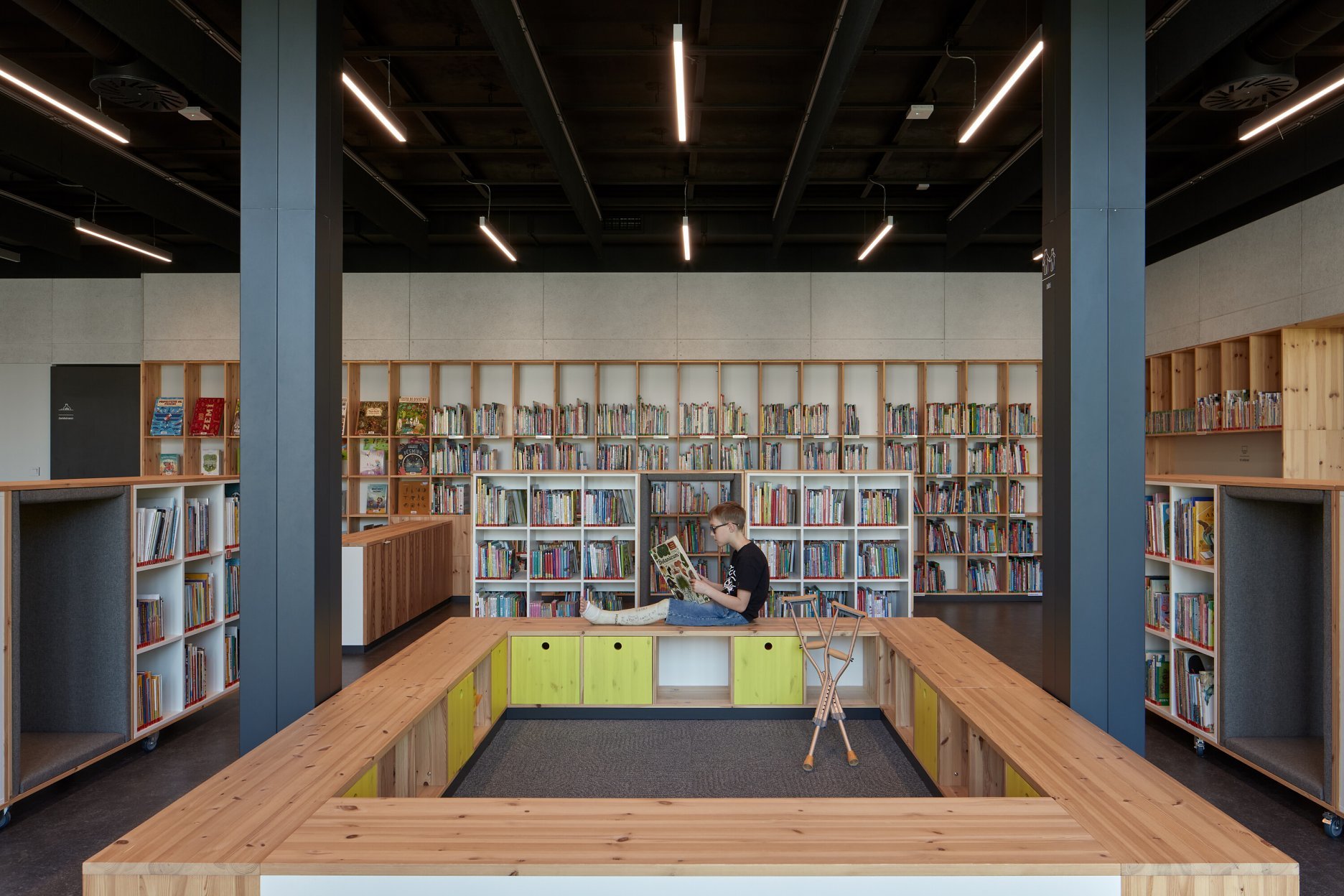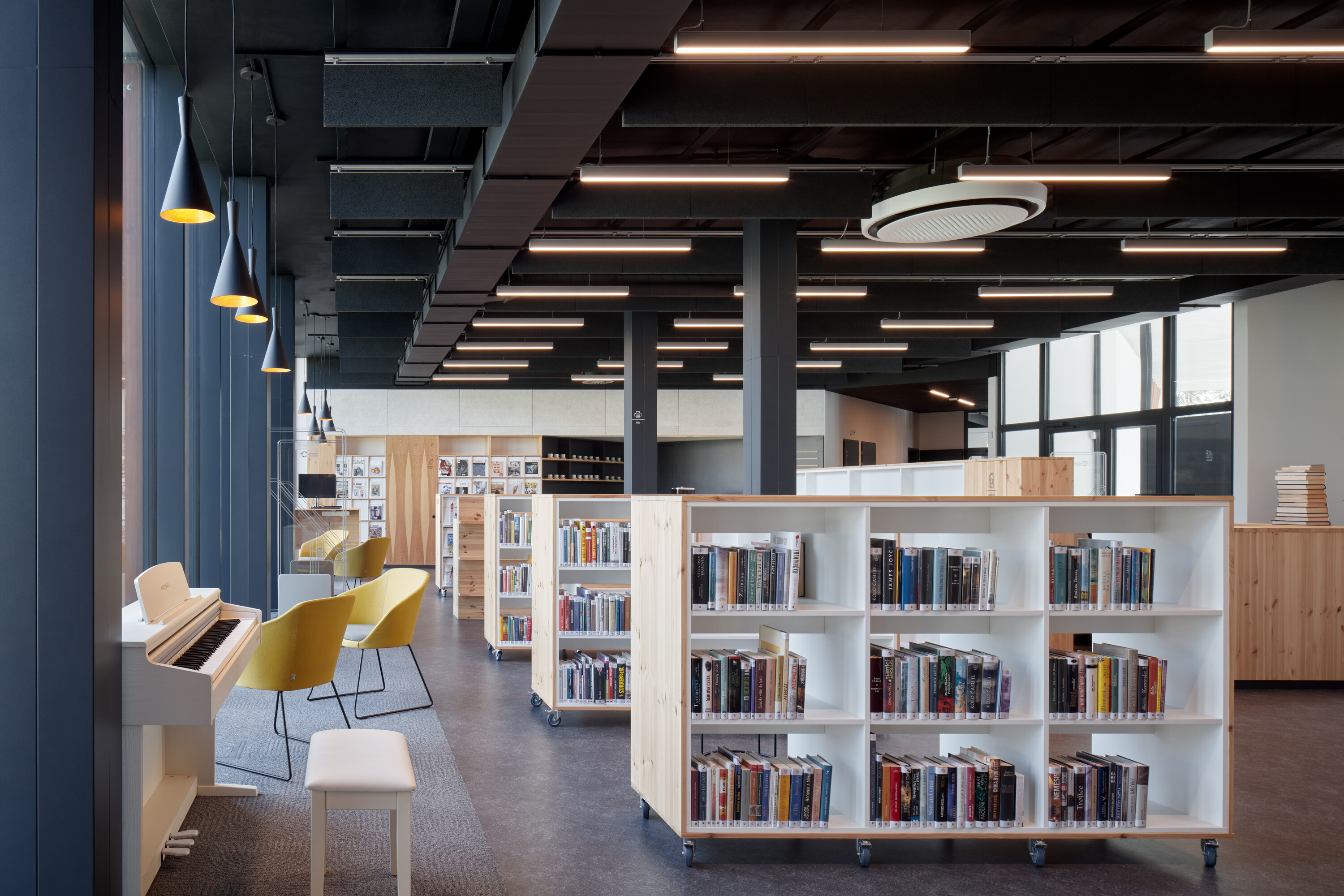 Nová budova je moderní a vzdušná, otevřená do zahrady svou skleněnou fasádou. Je věnovaná novinkám, dětským knihám, kavárně, přednáškám a workshopům. Vysoké dřevěné regály jsou zakomponované do stěn, police v prostoru jsou nízké a pojízdné, aby byl interiér přehledný a uměl se přizpůsobovat aktuálním potřebám. Podél prosklené fasády jsou čtecí místa s křesly pro dospělé, děti se schovávají s knihami do zákoutí v policích a batolata lezou v ohrazeném pískovišti. Díky různým výškám polic, stolů i sedacích prvků si každá věková skupina najde svoje místo.