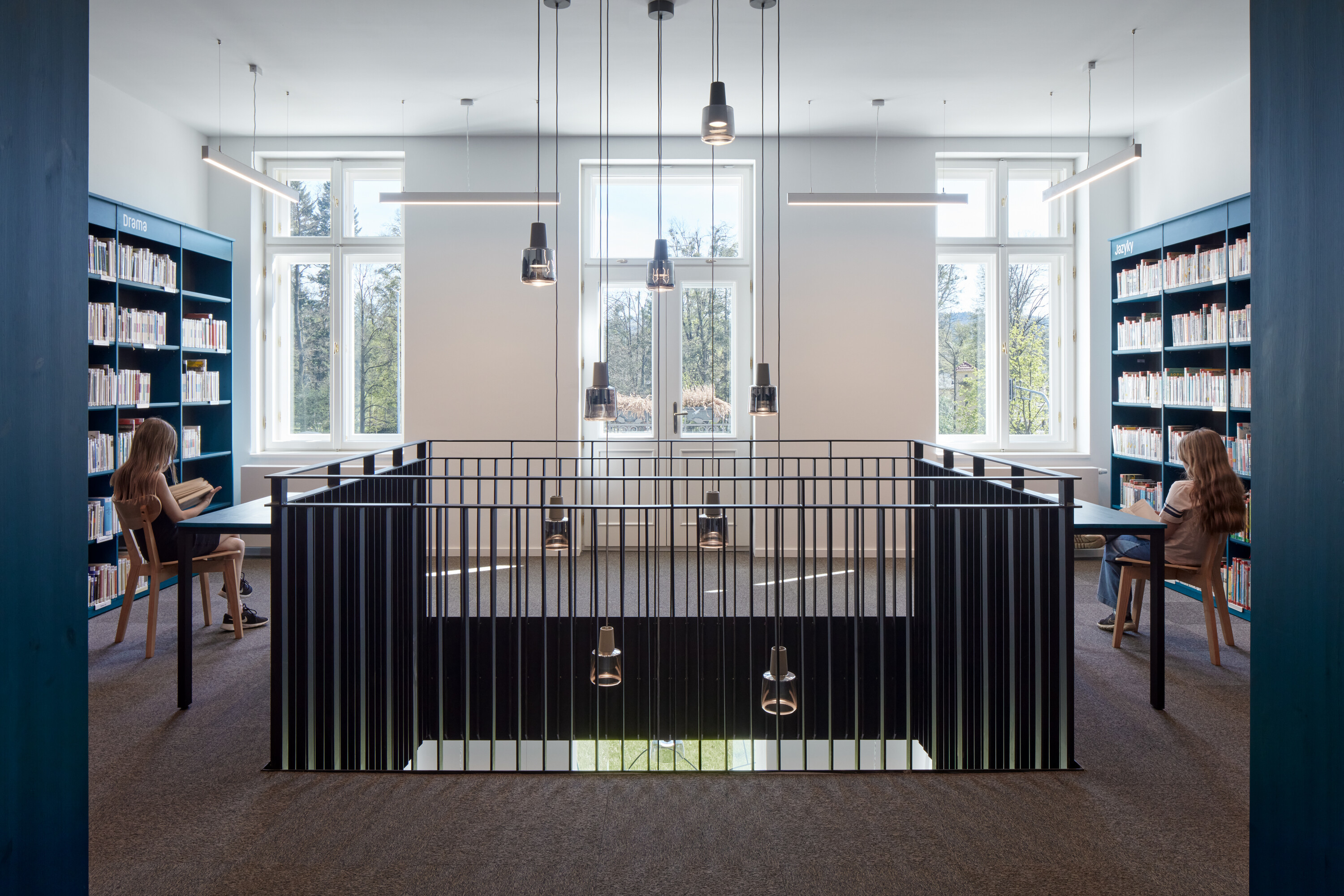 Interiér vily je naopak tradiční. Má komornější charakterem s vysokými regály v modrozelené barvě se čtecími zákoutími v arkýřích. Je to takové bludiště s atmosférou starých knihkupectví. Ve střední části je nový otvor ve stropě se zavěšeným lustrem, který velkoryse propojuje podlaží, přináší světlo dovnitř půdorysu a zve návštěvníky do patra. V místě původního vstupu vznikl nový prosklený arkýř s výhledem do prostranství před knihovnou. Díky těmto zásahům dostává dům úplně novou kvalitu prostoru - z obytné vily se stala opravdová veřejná stavba.