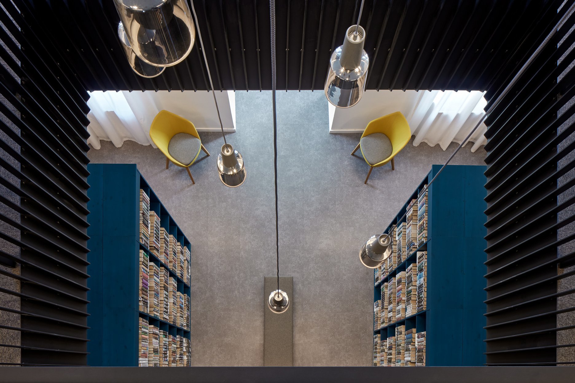 Hlavním materiálem použitým v interiéru je borovicová spárovka, která evokuje tradiční stavby v podhorské oblasti. V nové části je dřevěný materiál přírodní, s bílými a žlutými doplňky, ve staré vile je lakovaný na výraznou modrozelenou barvu. Barevná paleta nábytku a podlah je jednoduchá, barvy do interiéru dodávají samotné knihy a výrazné akcenty křesel.