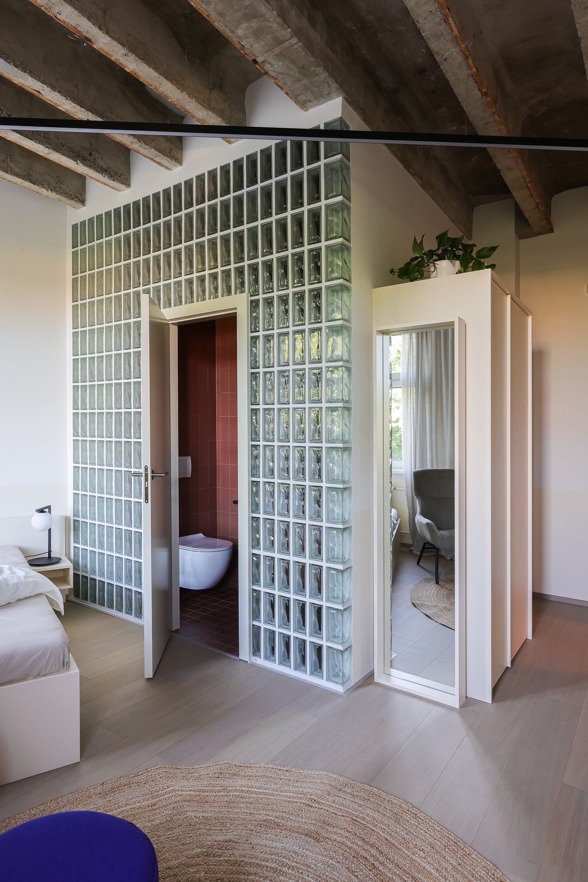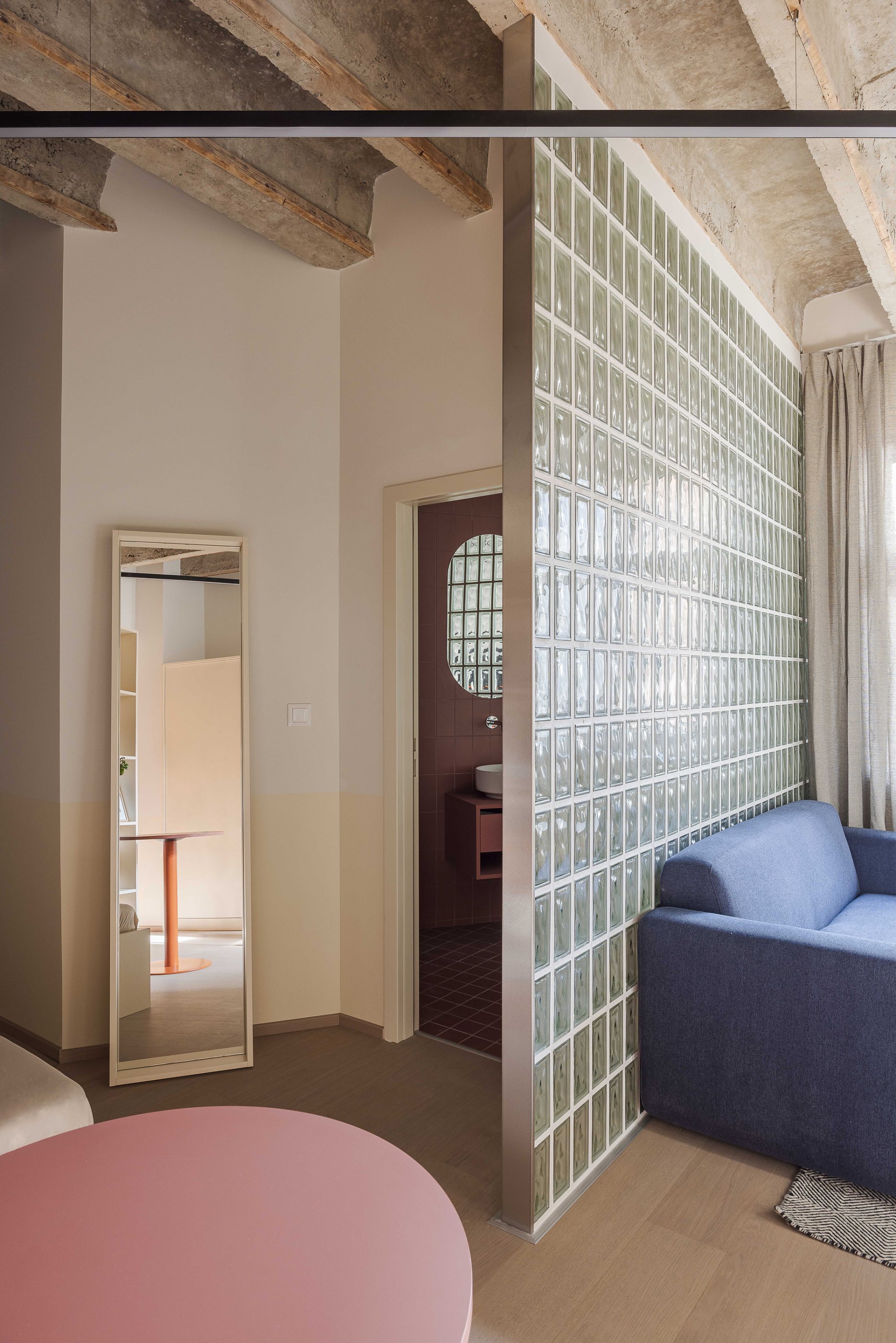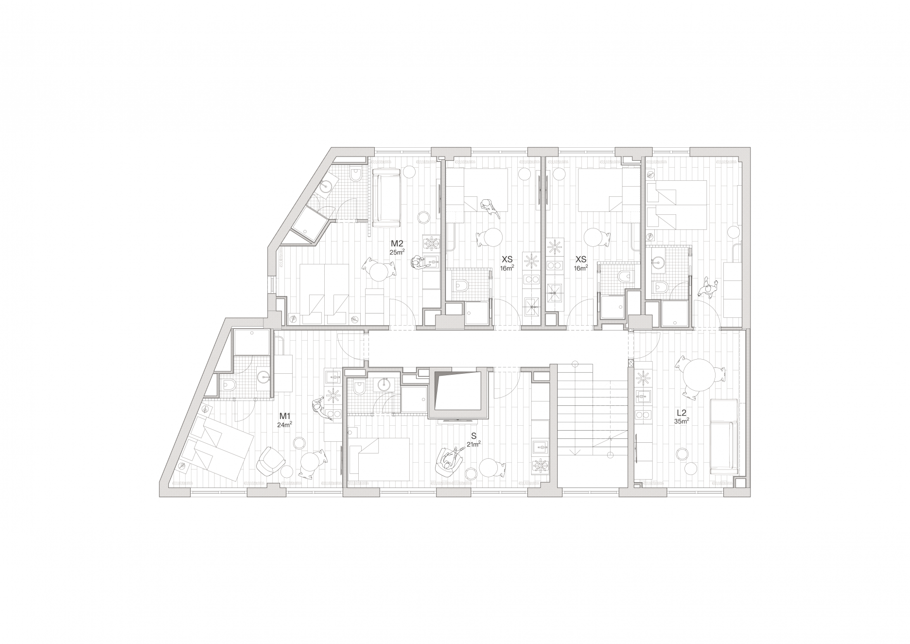 Vnútorná dispozícia domu reflektuje potreby obyvateľov apartmánov s ohľadom na komfort a funkčnosť. Apartmány sa preto líšia najmä veľkosťou. Jednotlivé bytové jednotky sú funkčne členené tak, aby umožňovali rôzne formy bývania - od malých bytov pre jednotlivcov až po väčšie byty s vyšším komfortom. Flexibilita apartmánov umožňuje prispôsobiť sa rôznym typom bývania, čo je kľúčové v čase, keď sa rodinné štruktúry a spôsoby bývania menia. Otvorený koncept bytových jednotiek stavia na prepojení jednotlivých zón bývania. Vzdušnosť podporuje i sklobetón použitý v kúpelniach, ktorý do priestoru vnáša sekundárne presvetlenie.