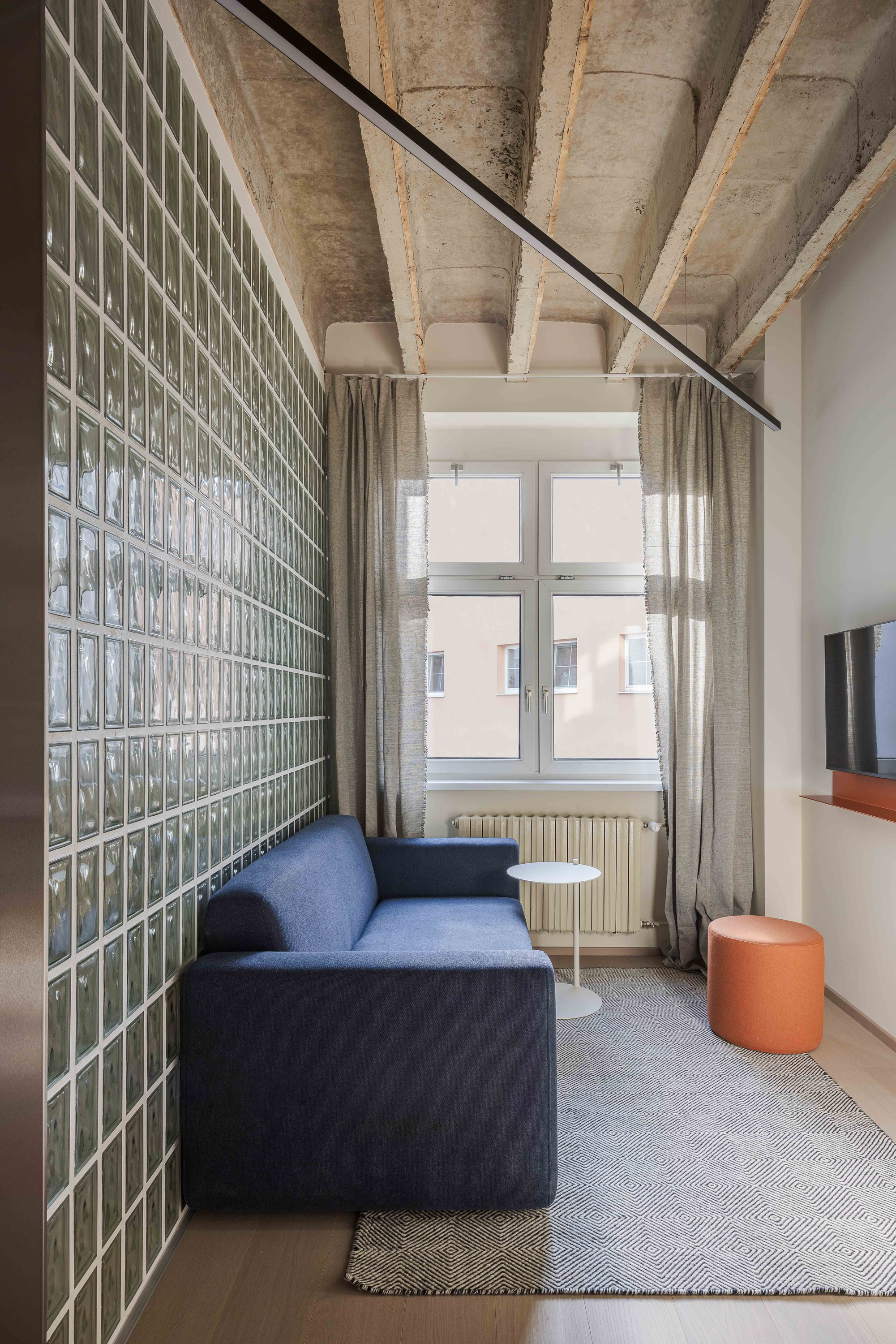 Návrh interiéru rešpektuje pôvodný charakter budovy Metropolu, pričom zachováva a vyzdvihuje jej autentické prvky a atmosféru. Rebierkový strop, ktorý bol odkrytý a povrchovo upravený, dodáva apartmánom autenticitu. Medzi zachované prvky patria aj typické modré okná.