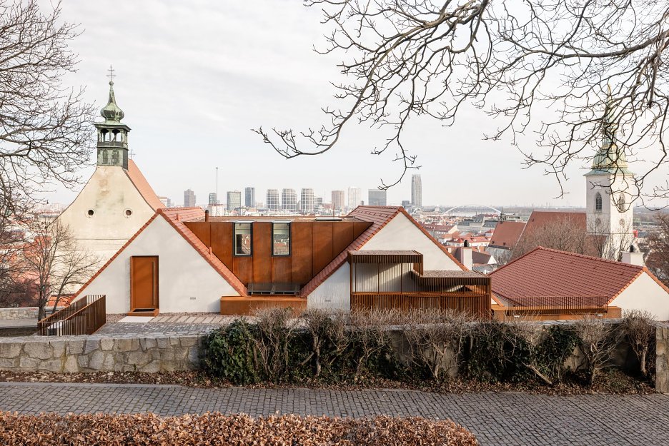 Pôvodný návrh kládol na novotvar ešte väčší dôraz – „prepichoval“ krovy po stranách a bol viditeľný aj z bočných pohľadov. Po viacerých rokovaniach s pamiatkovými komisiami sme však pristúpili k jemnejšiemu riešeniu. Novotvar je dnes viditeľný len medzi pôvodnými objektmi a v dizajne jednotlivých korténových prvkov.“