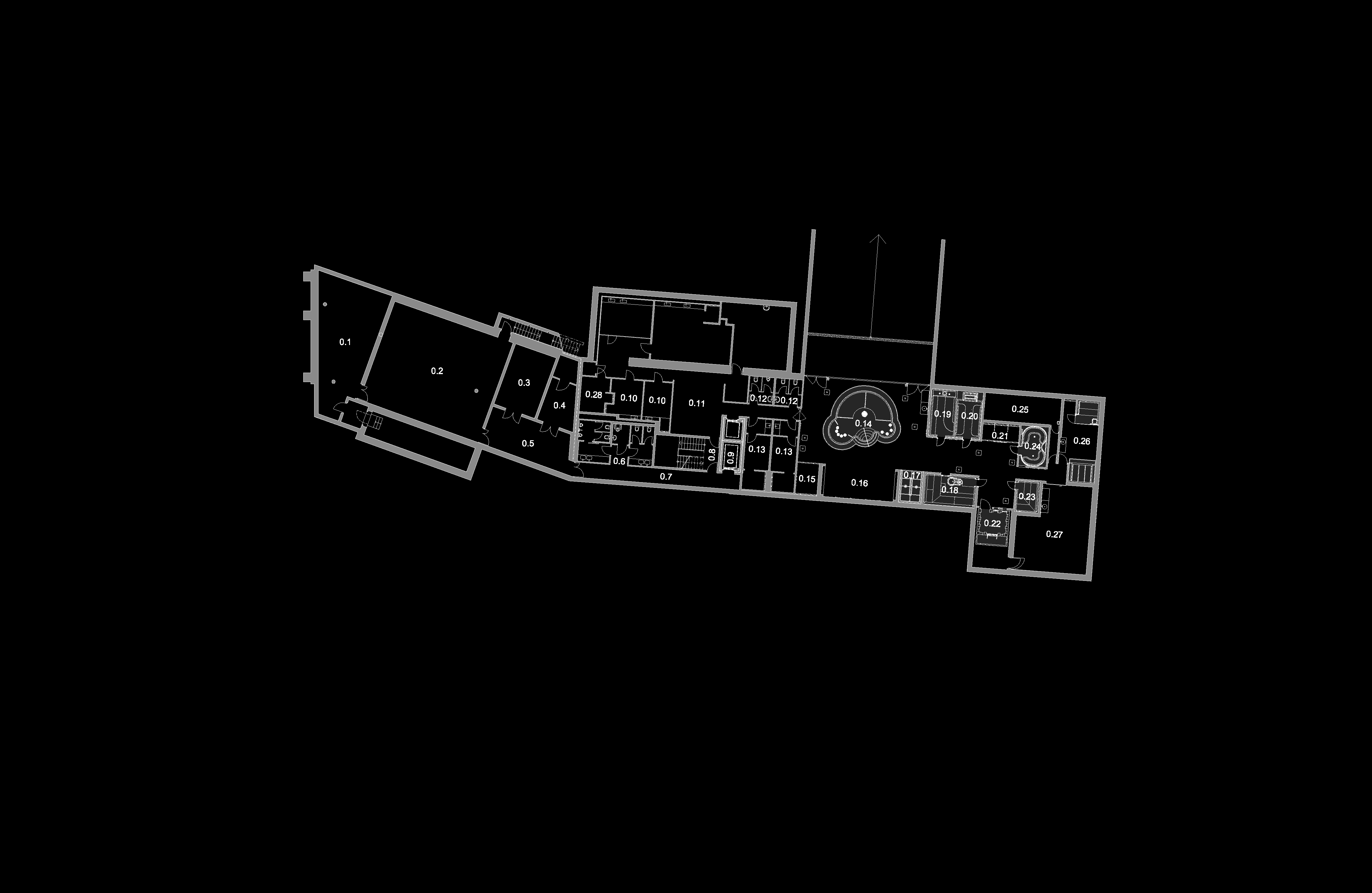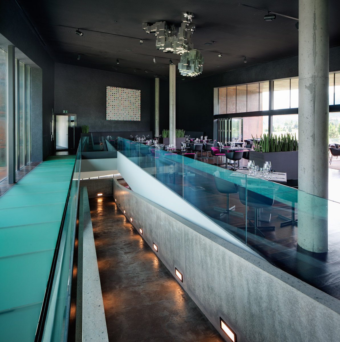V suterénu objektu jsou umístěny konferenční prostory a areál wellness/spa. Areál spa je přirozeně osvětlen skleněnou stěnou umístěnou v terénním zářezu do terénu. Z venkovní terasy a centrálního prostoru spa s vířivou vanou se tak otevírá zajímavý výhled přímo na horský masiv. Zároveň je však zachována potřebná intimita těchto prostor.