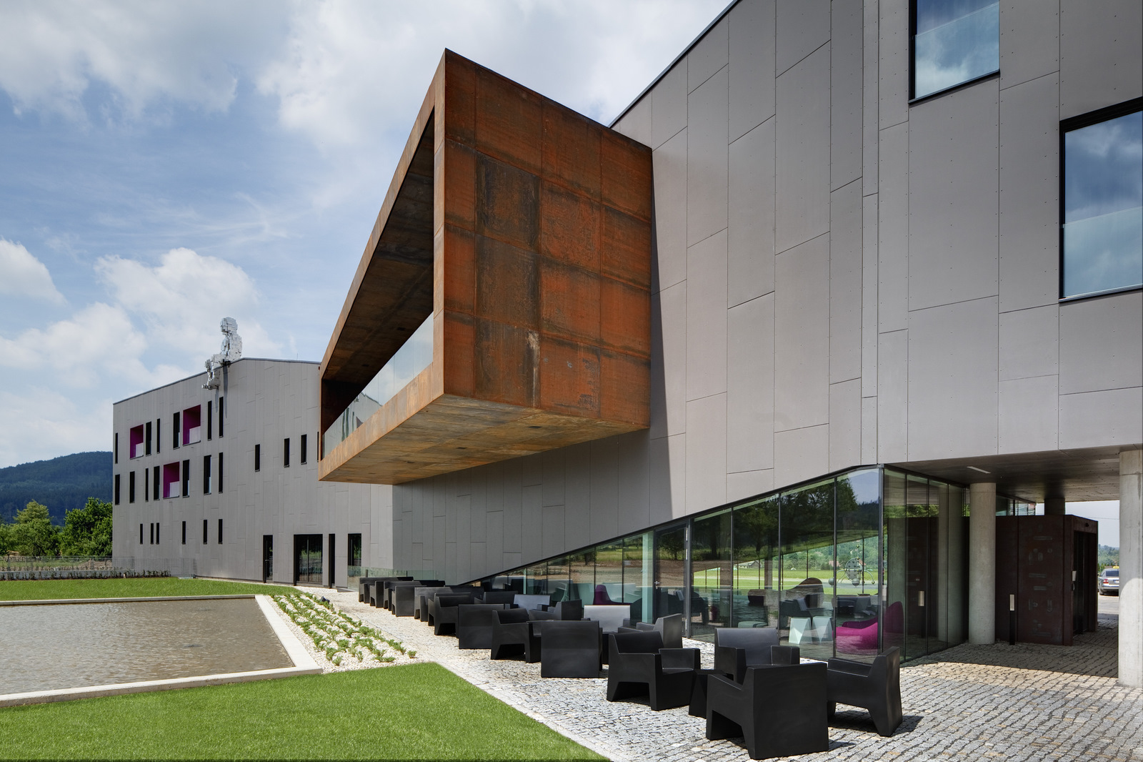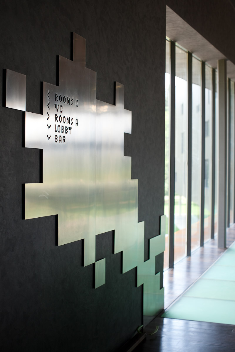 Barevnost hotelu je minimalistická – odstíny šedé, černé, bílé jsou akcentovány jen kontrastní barvou fuchsie/magenta, která oživuje jinak neutrální výraz. Použité materiály jsou převážně přírodní – beton, sklo, kámen, ocelový plech. Fasáda je obložena přírodními probarvenými cembonitovými deskami.