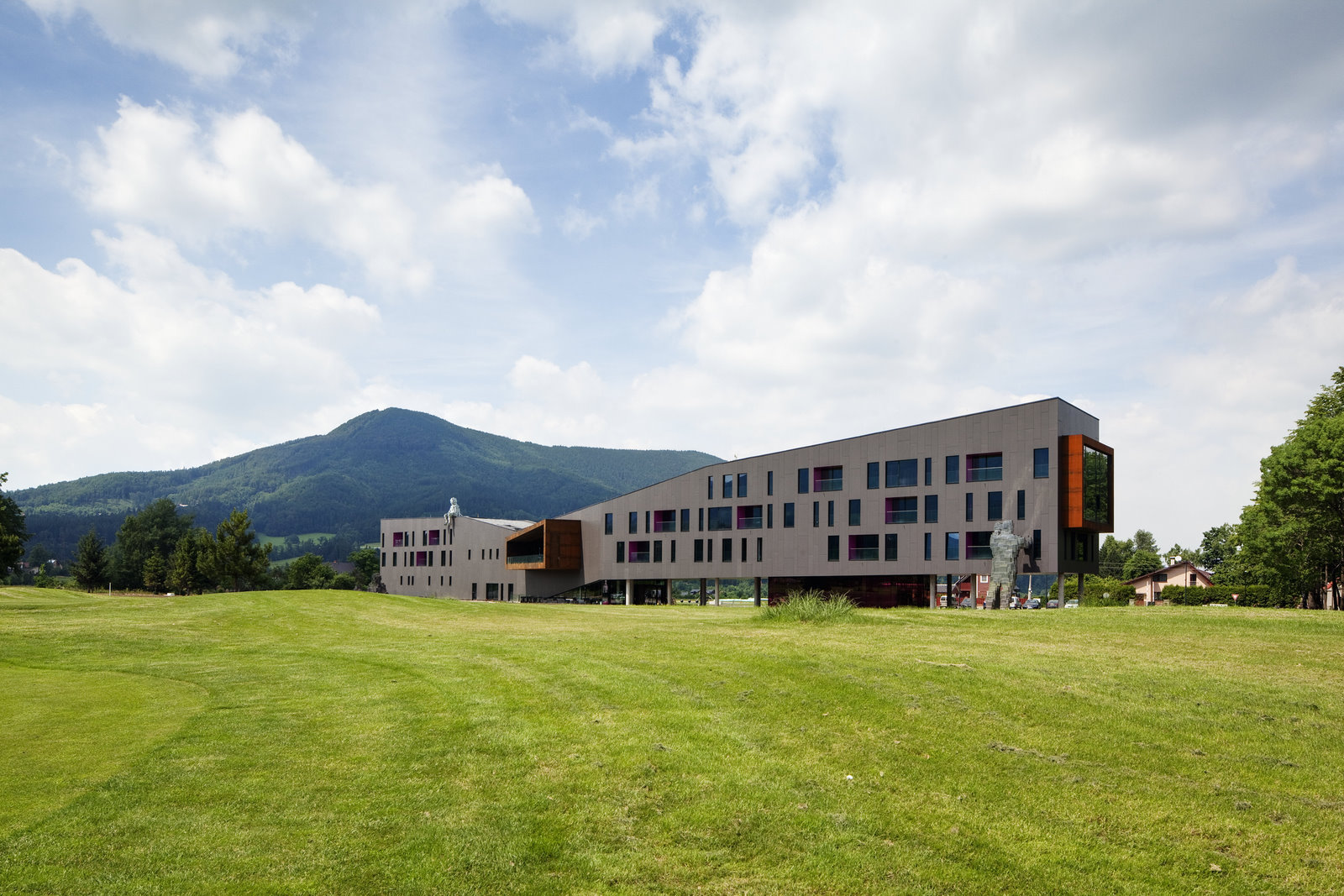 Dynamická prolamovaná hmota hotelu je navržena tak, aby netvořila bariéru v krajině. Tento záměr je podpořen i zvednutím větší části přízemí na sloupy, nad terén. Tím je, v pohledové rovině parteru, umožněn průhledu skrz hotel a celková hmota stavby je takto odlehčena. Jižní fasáda objektu má ucelený výraz s nepravidelným rytmem vertikálních oken jednotlivých pokojů. Řady oken jsou oživeny zapuštěnými lodžiemi zdůrazněnými výraznou barevností. Severní fasáda hotelu je členěna různě velkými okenními otvory záměrně porušující dělení na patra.