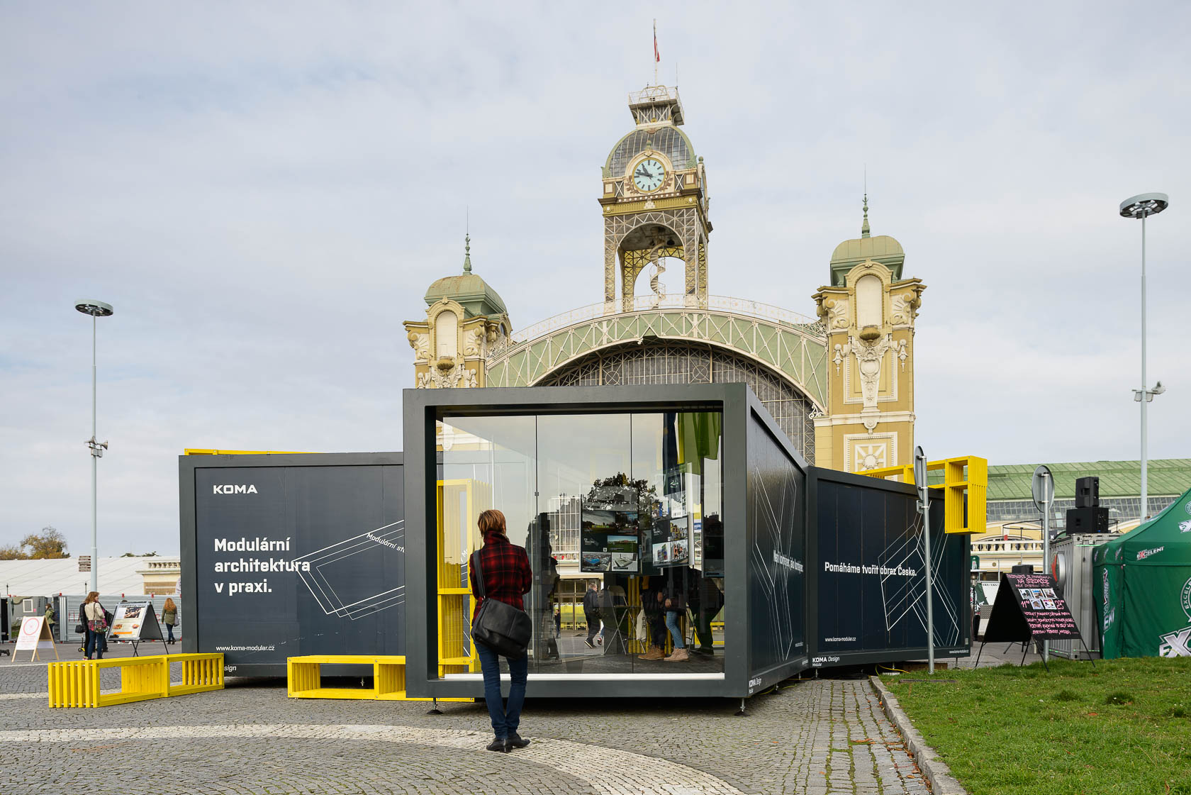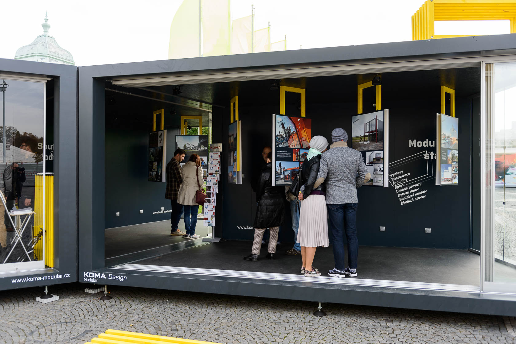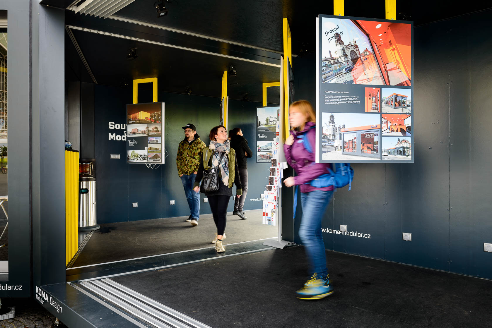 Boli tu inštalované tri čierne moduly doplnené drevenými prvkami, ktoré ladili s farbami tohtoročného Designbloku. V interiéri bola inštalovaná expozícia venovaná architektúre. V prvom module boli na výstavných paneloch prezentované realizácie modulárnych stavieb podľa využitia - reštaurácie, školské budovy, kancelárie, bytové domy, aj český modulárny pavilón EXPO 2015 v Miláne. V druhom module boli prezentované rôzne ideové návrhy mladých architektov. Zrejme najzaujímavejšie boli ideové návrhy na výstavbu modulárnej Jihočeskej filharmónie, bývanie pre seniorov či modulárne materské školy. V treťom module bola expozícia, ktorá prezentovala širokú škálu využitia modulov, vrátane úspešného pavilónu Lighthouse, ktorý sa stal stredobodom tohtoročného festivalu dokumentárnych filmov v Jihlave.