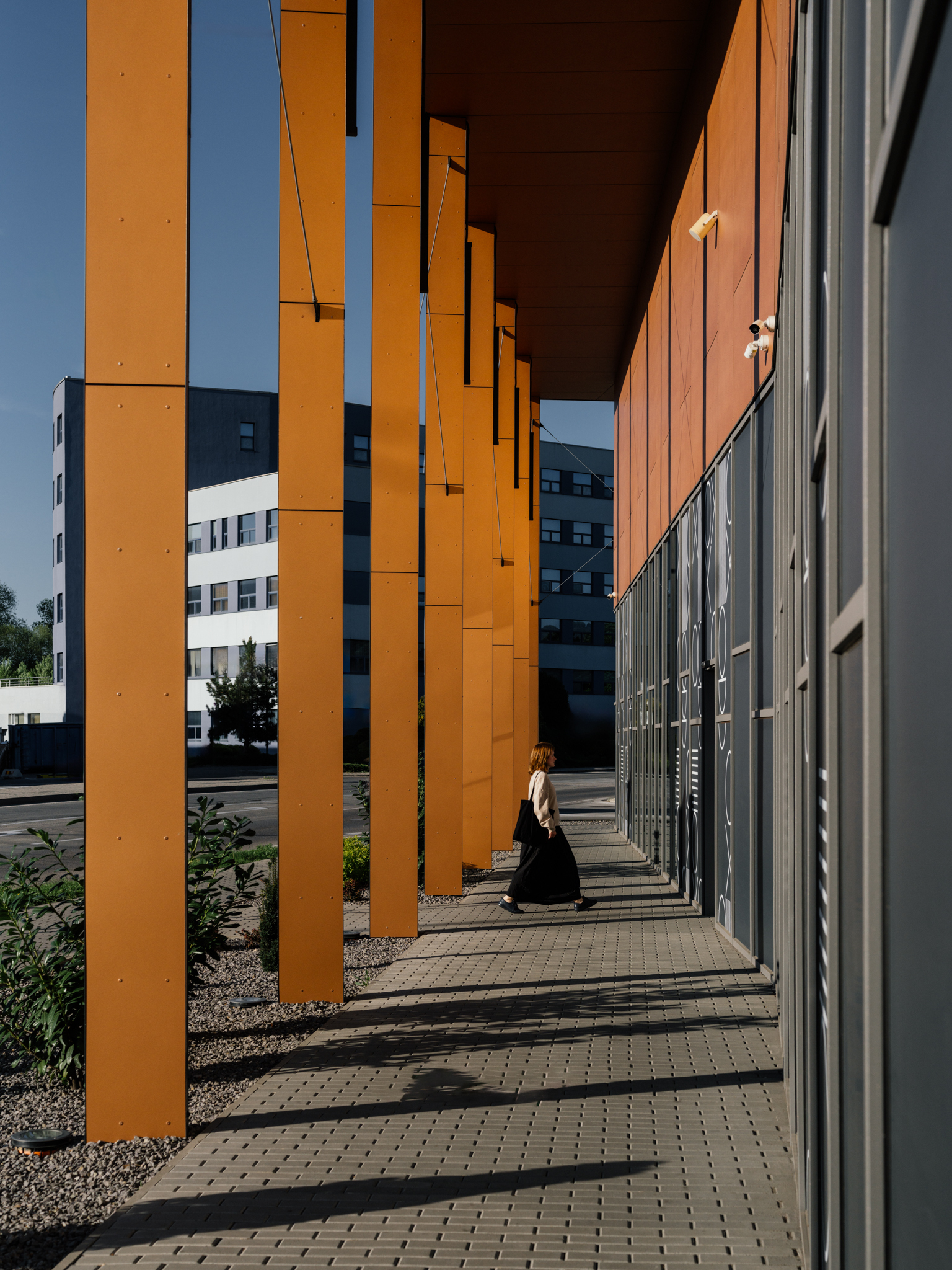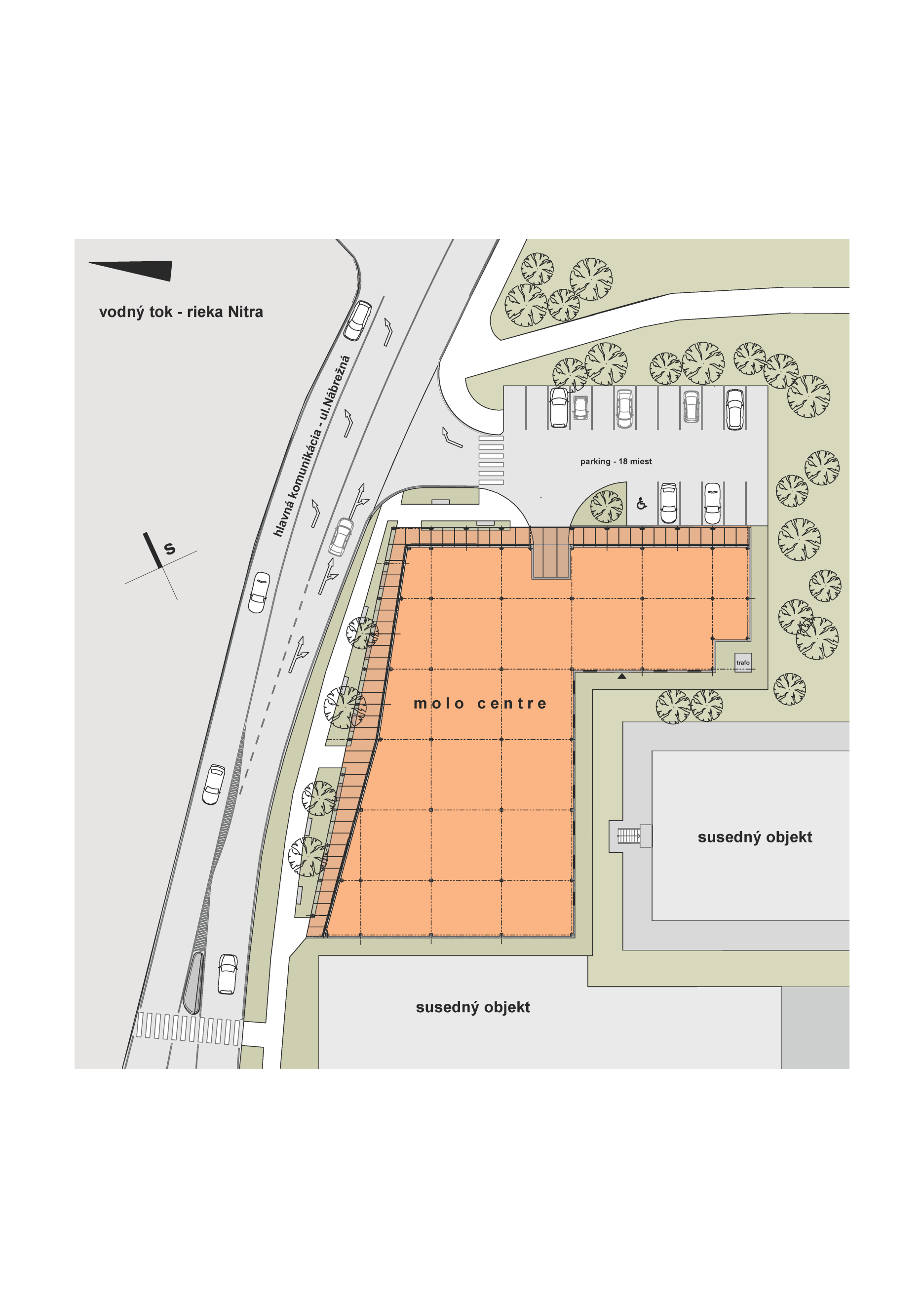 Objekt leží na vonkajšej strane bulváru, kopírujúceho rieku a jej nábrežie. Kolonáda vysunutých stĺpov reaguje na blízkosť rieky a vytvára obrátené kryté „mólo“, ktoré rámuje siluetu celej budovy. Zvolené riešenie zabezpečuje kryté predpolie retailových priestorov, pričom zelený pás pod líniou stĺporadia zároveň bariéru od ulice.