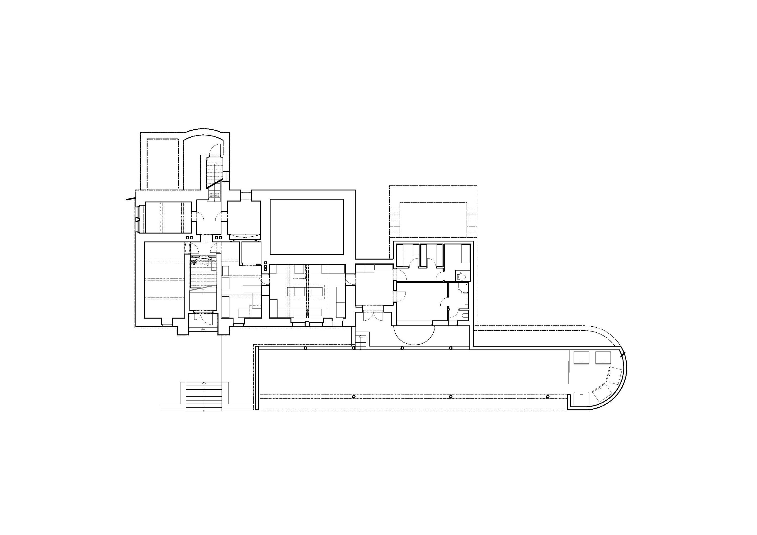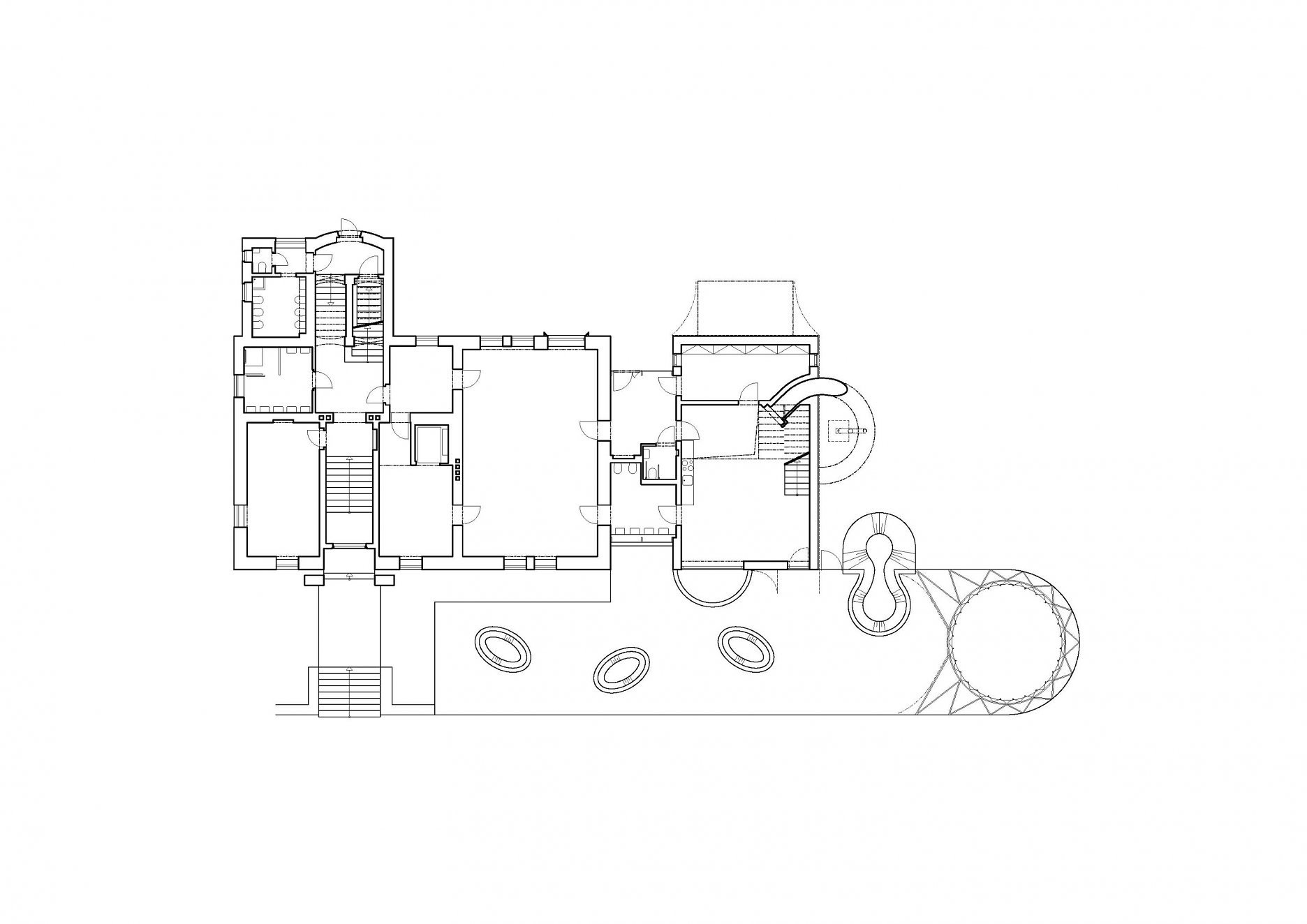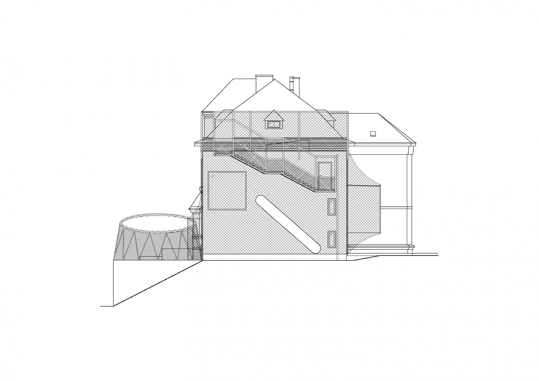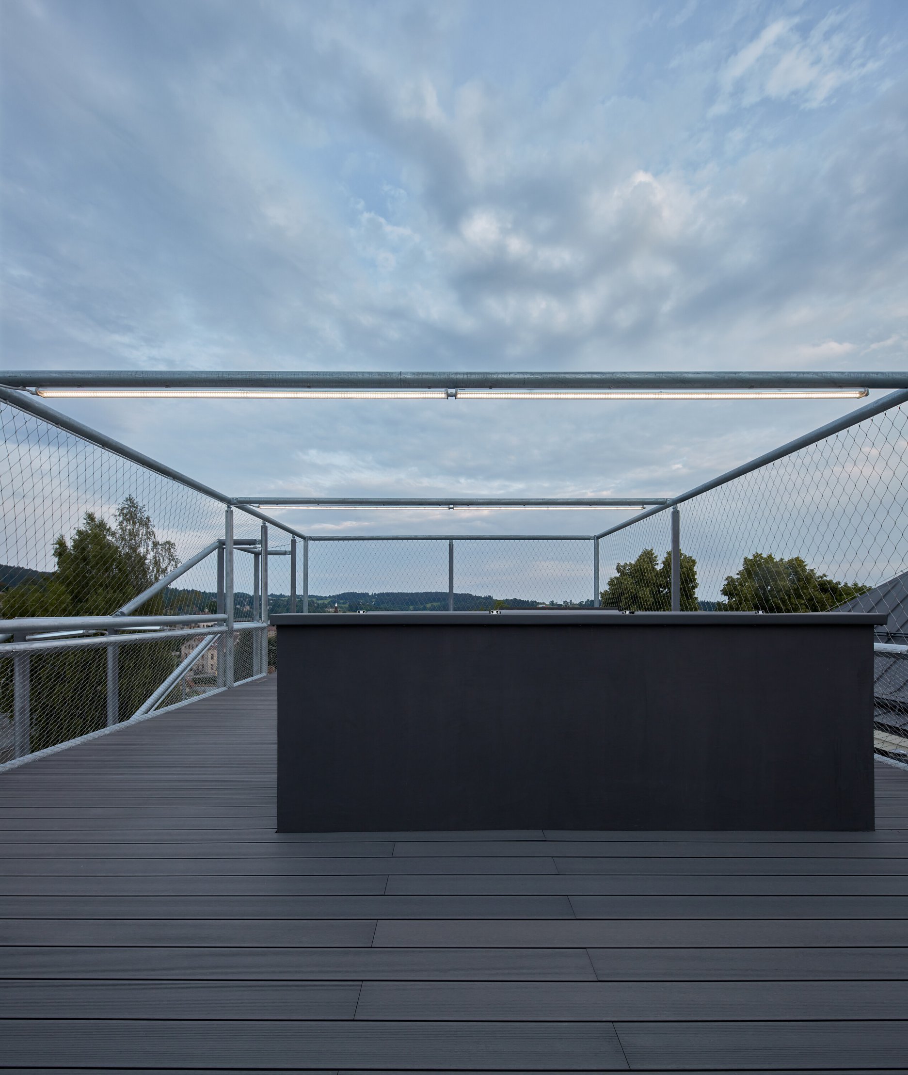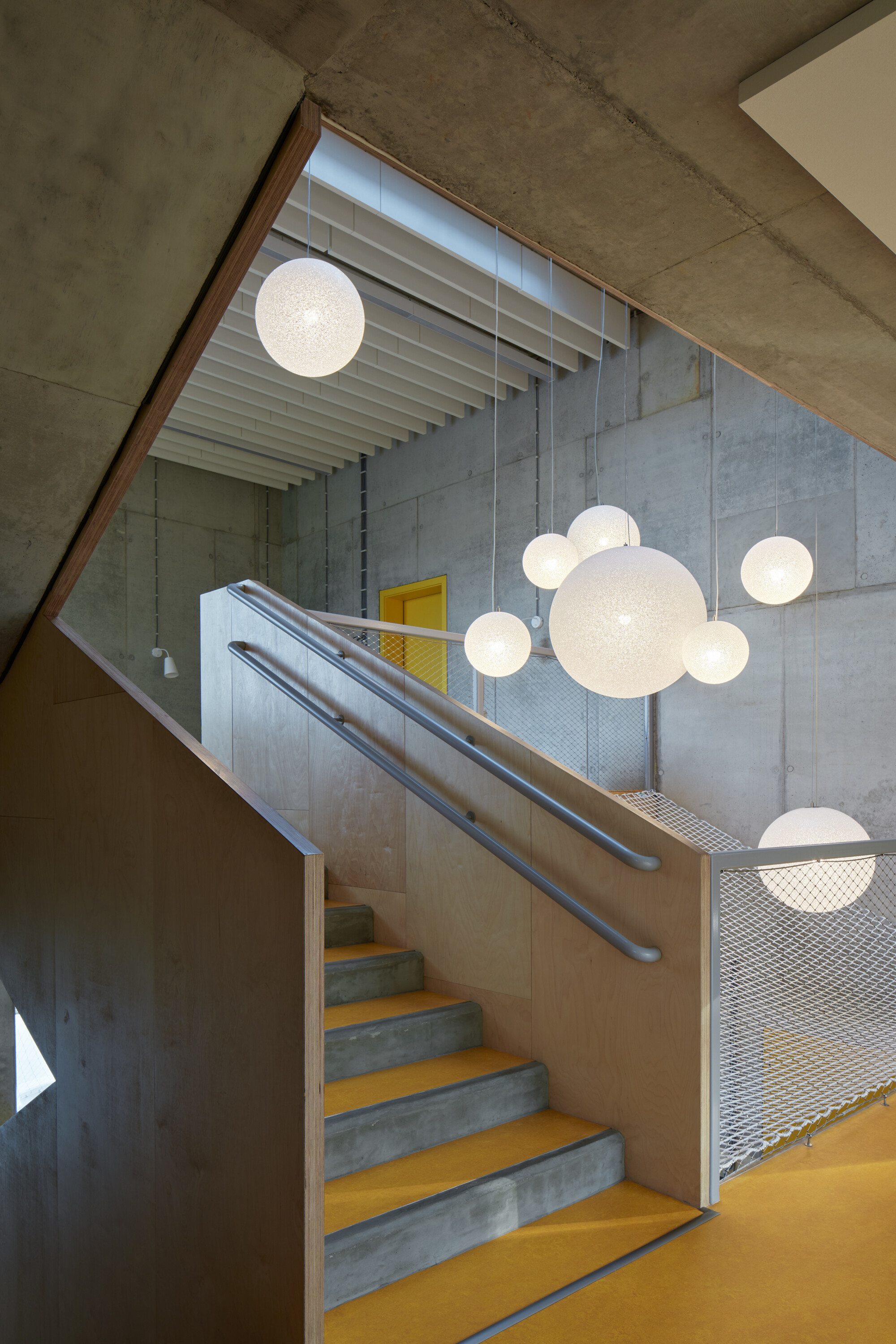 Představovali jsme si, jaká sranda bude probíhání dokola mezi starou a novou částí školy přes záchody. Chtěli jsme, aby se z přístavby dalo vylézt ven na velkou betonovou terasu, kde jsou děti v bezpečí a zároveň mají co nejvíce svobody. Na střechu jsme umístili další herní terasu, protože je odtud nádherný výhled. Patra uvnitř školky jsme propojili tobogánem, kterým dítě na okamžik bez ptaní budovu opouští a vzápětí se do ní rozesmáté vrací. Vnitřní prostor je vlastně jedna velká místnost rozčleněná vertikálně do čtyř mezipater. Děti tu na sebe vždy mohou vidět, ale také se můžou na mnoha místech zašít, když chtějí soukromí pro svoji neplechu.